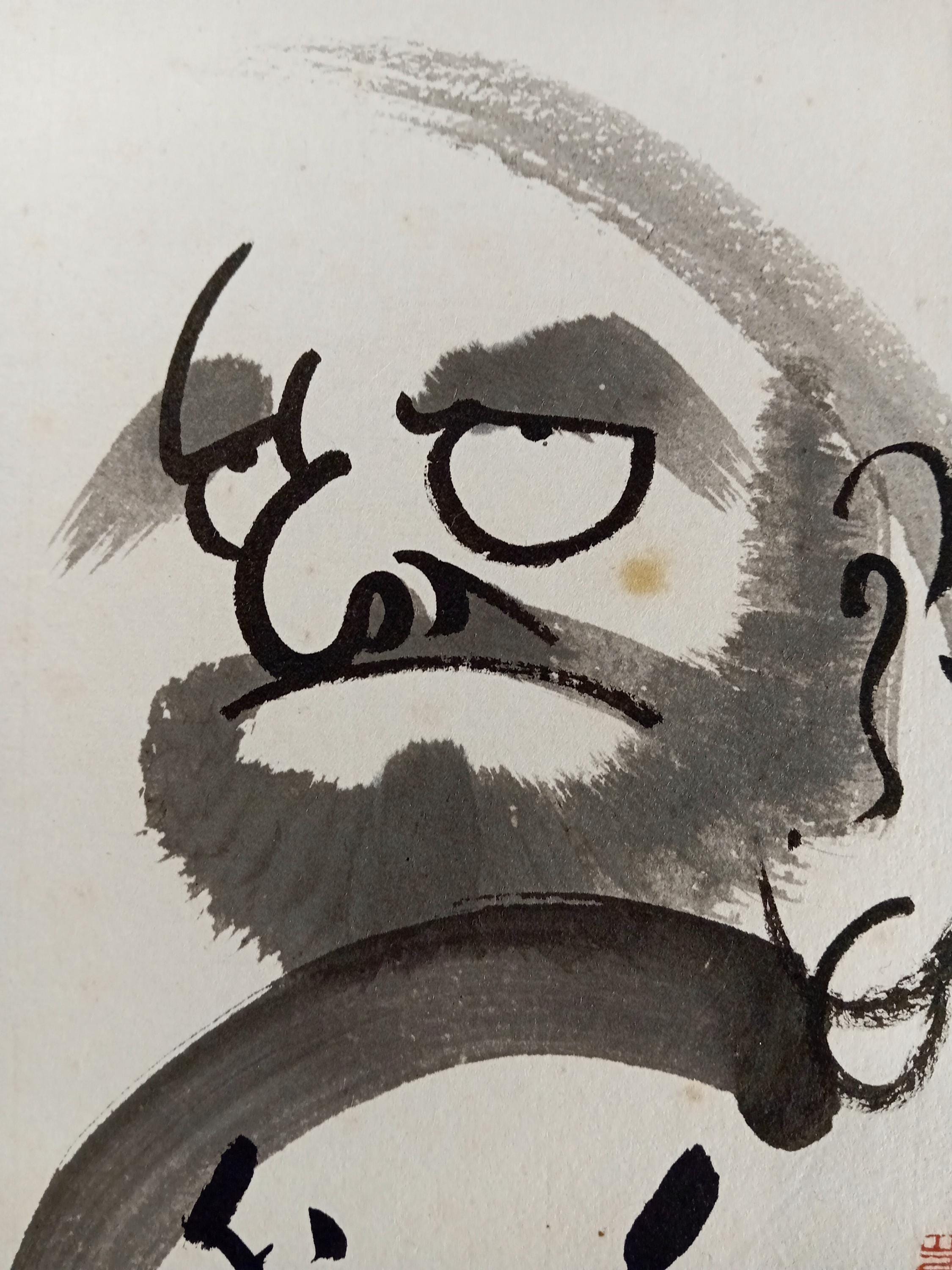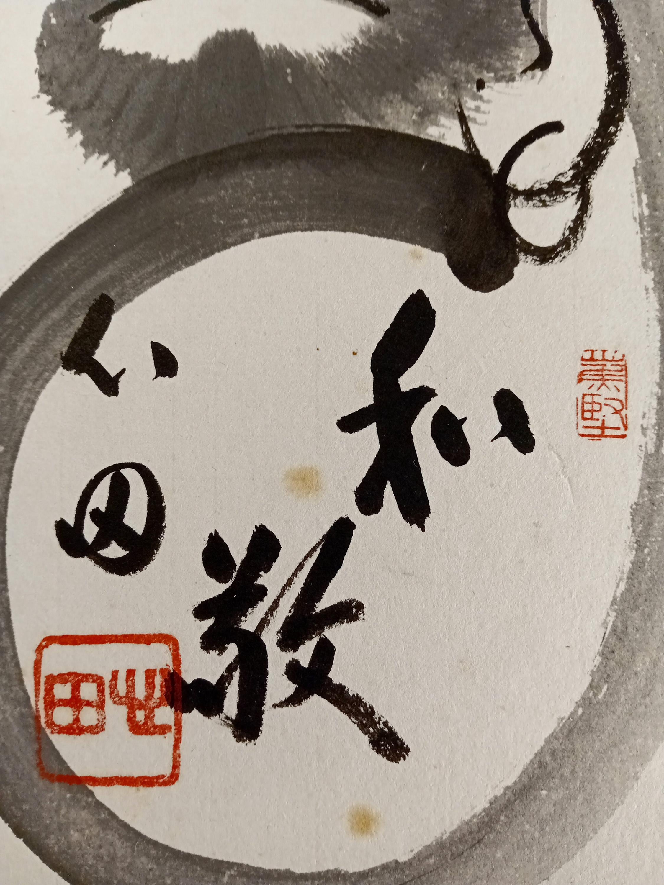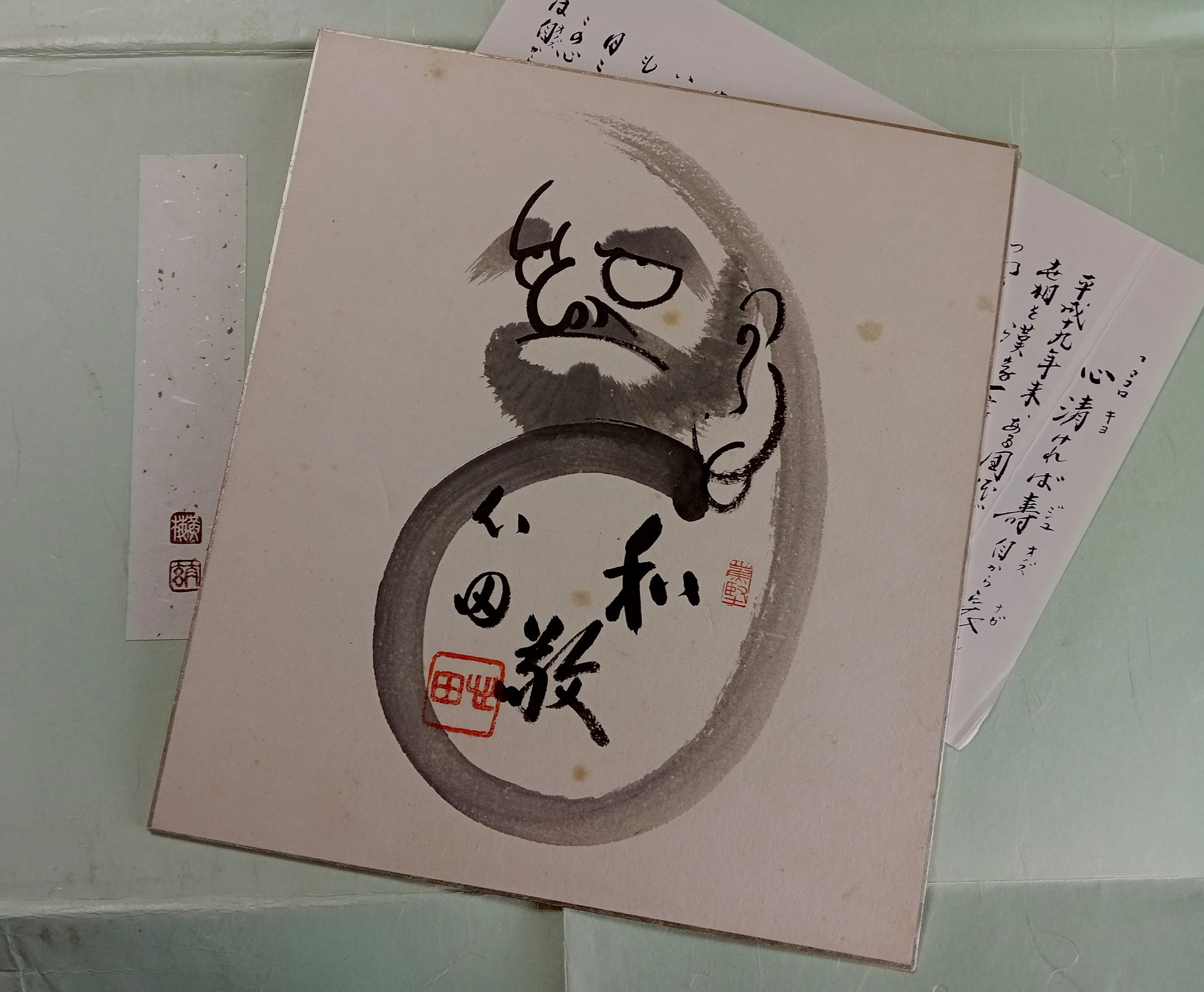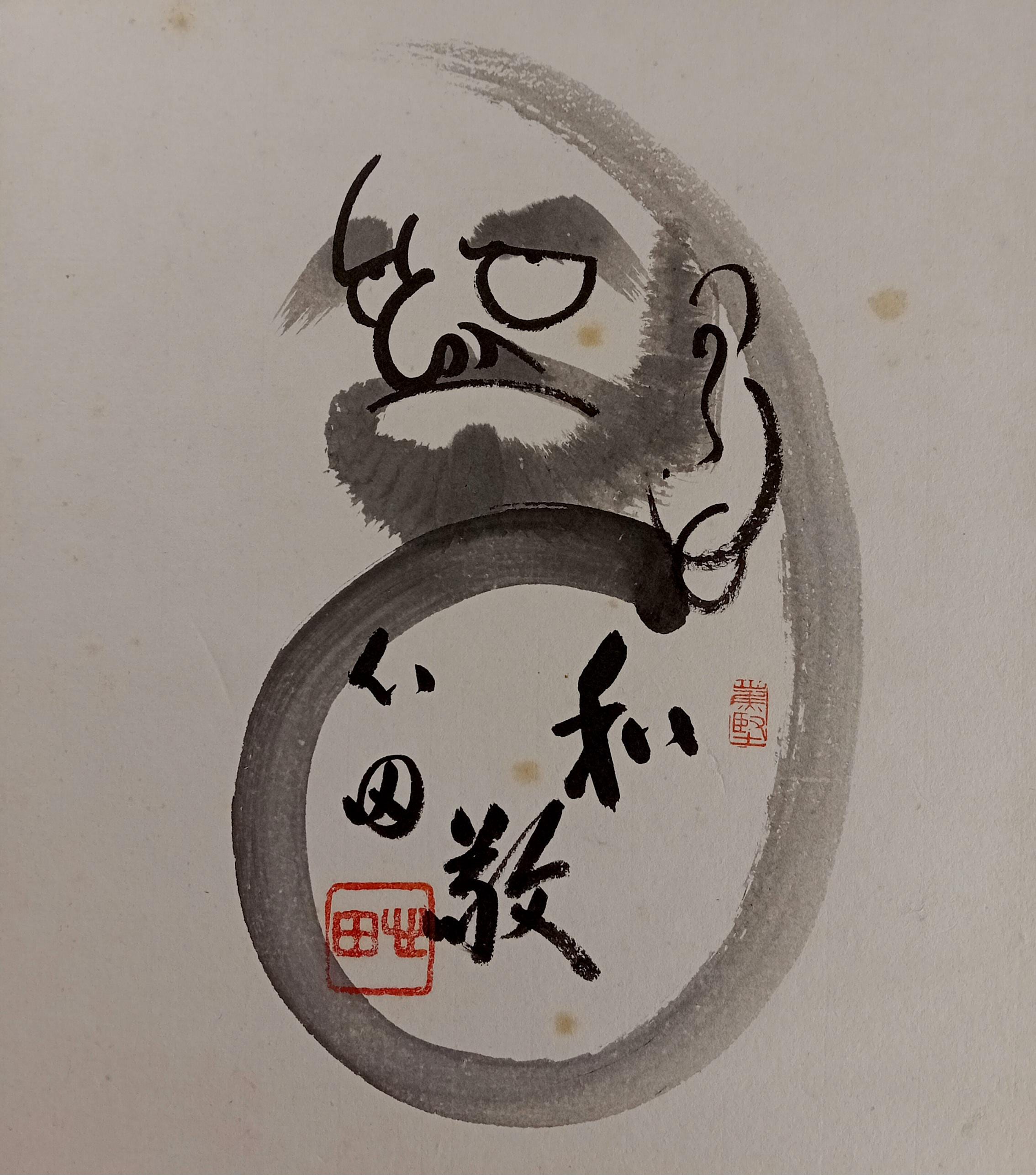 The front shows a brush-painted image of Daruma, executed with free and expressive ink strokes. Inside the circular brush line is a short Zen phrase conveying the idea of inner harmony and respectful presence. This type of composition is characteristic of mid–late Shōwa era Zen calligraphy.