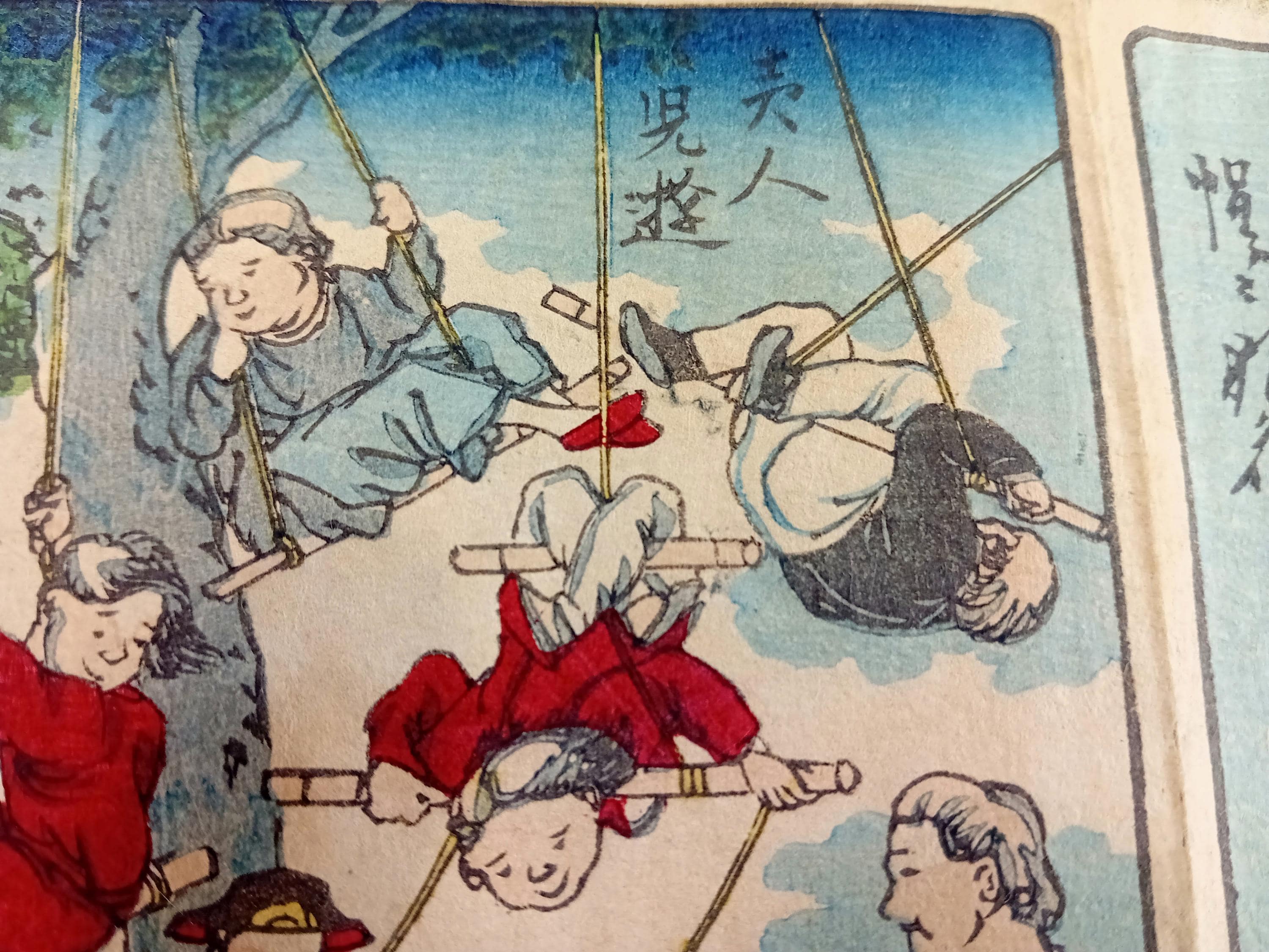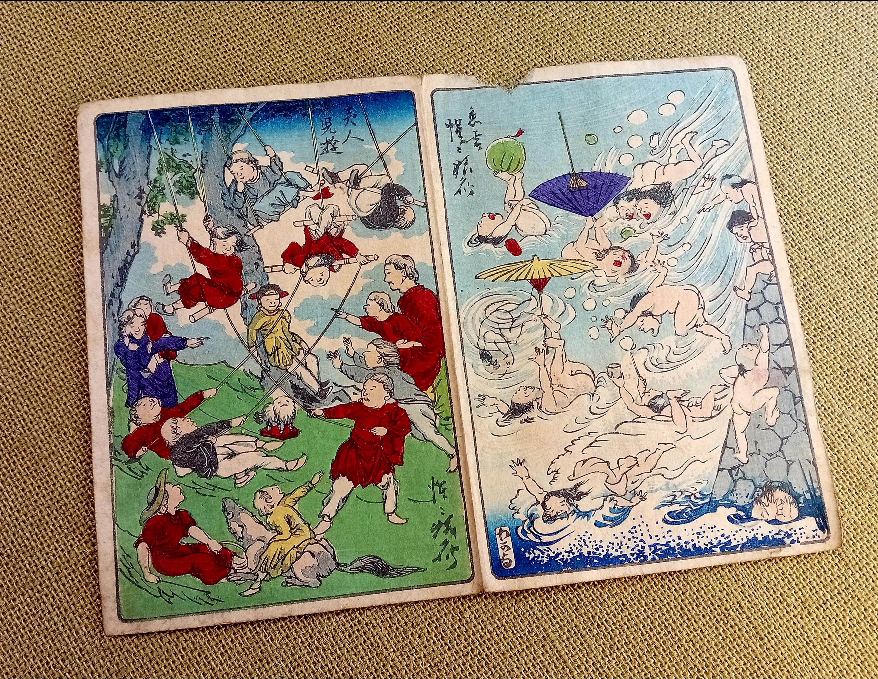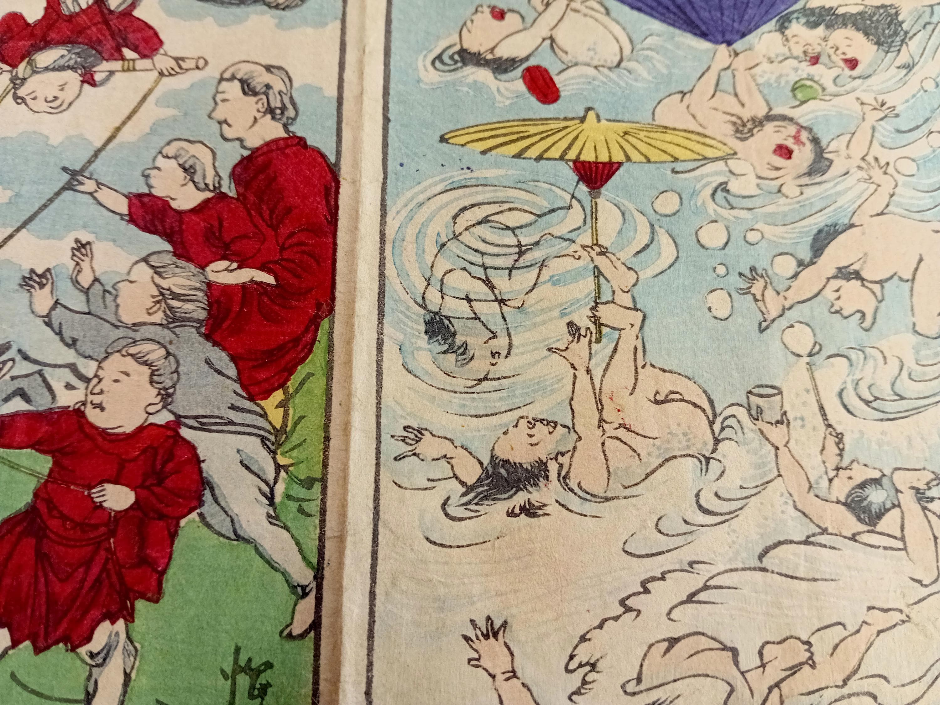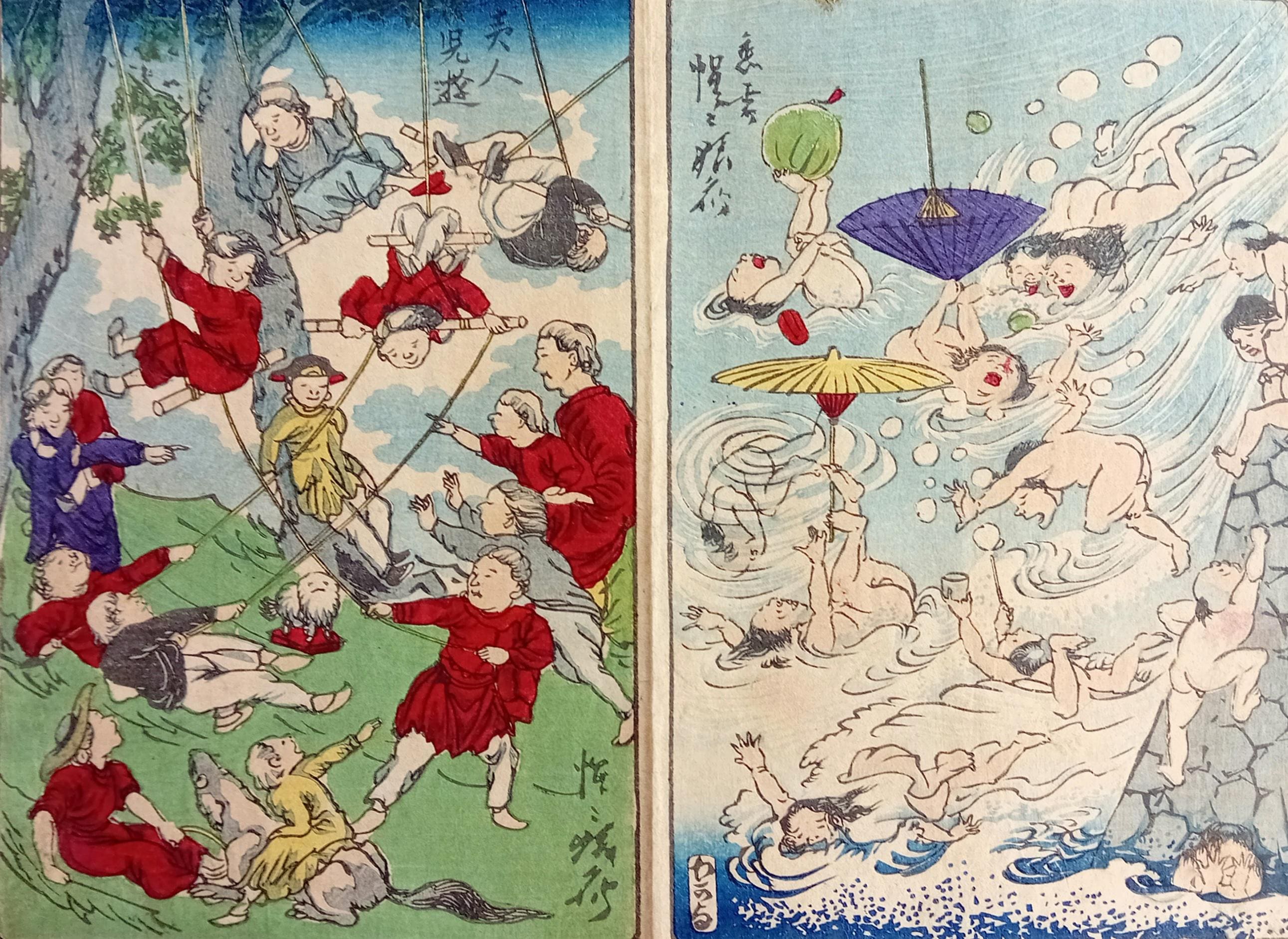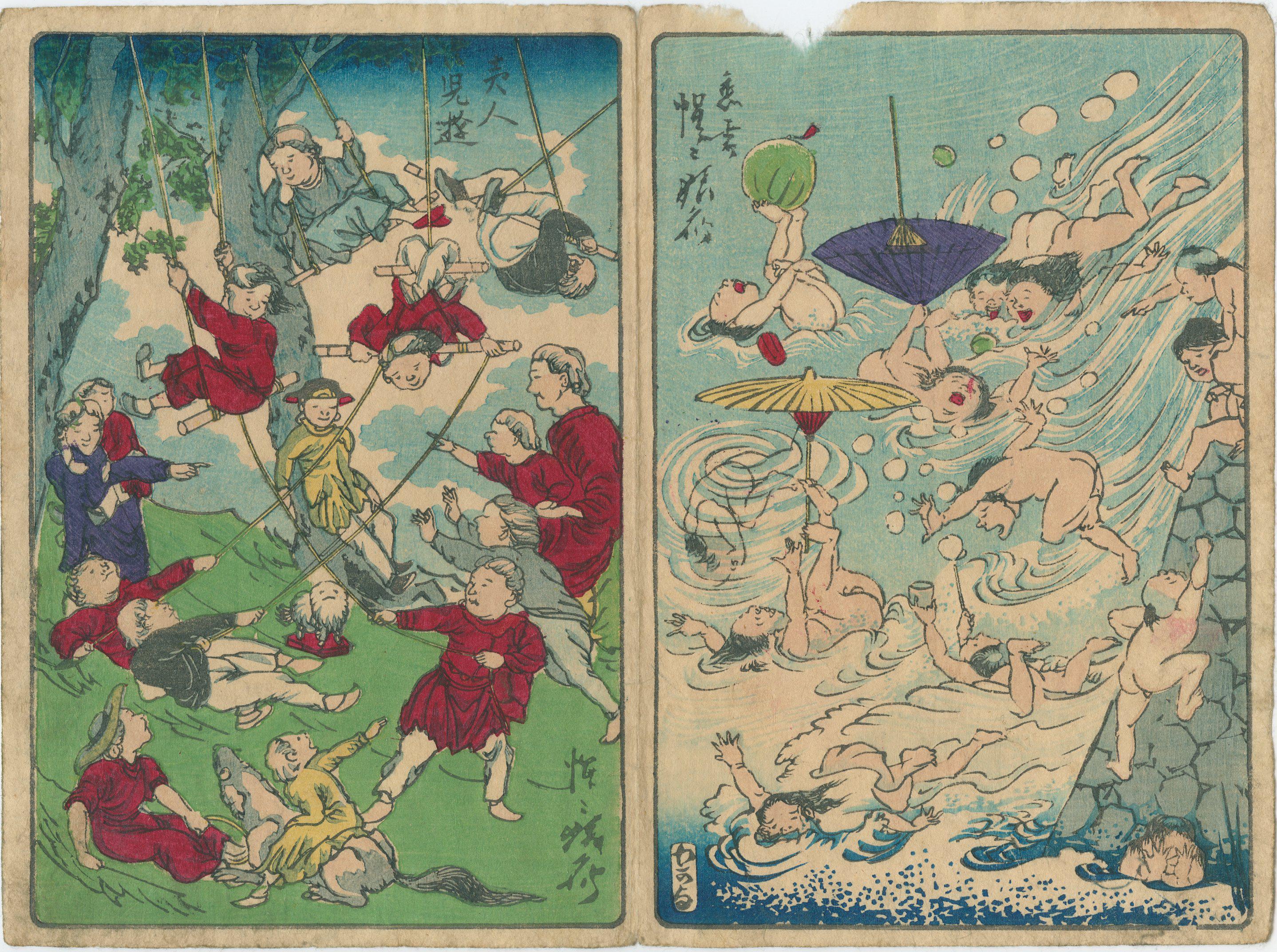 The left scene corresponds to “Foreign Children at Play”, a known motif showing a group of children in animated, humorous movement. The right scene presents “Water Play”, an energetic depiction of children interacting with flowing water, typical of Kyosai’s expressive child-themed imagery within “Hyakuzu”.