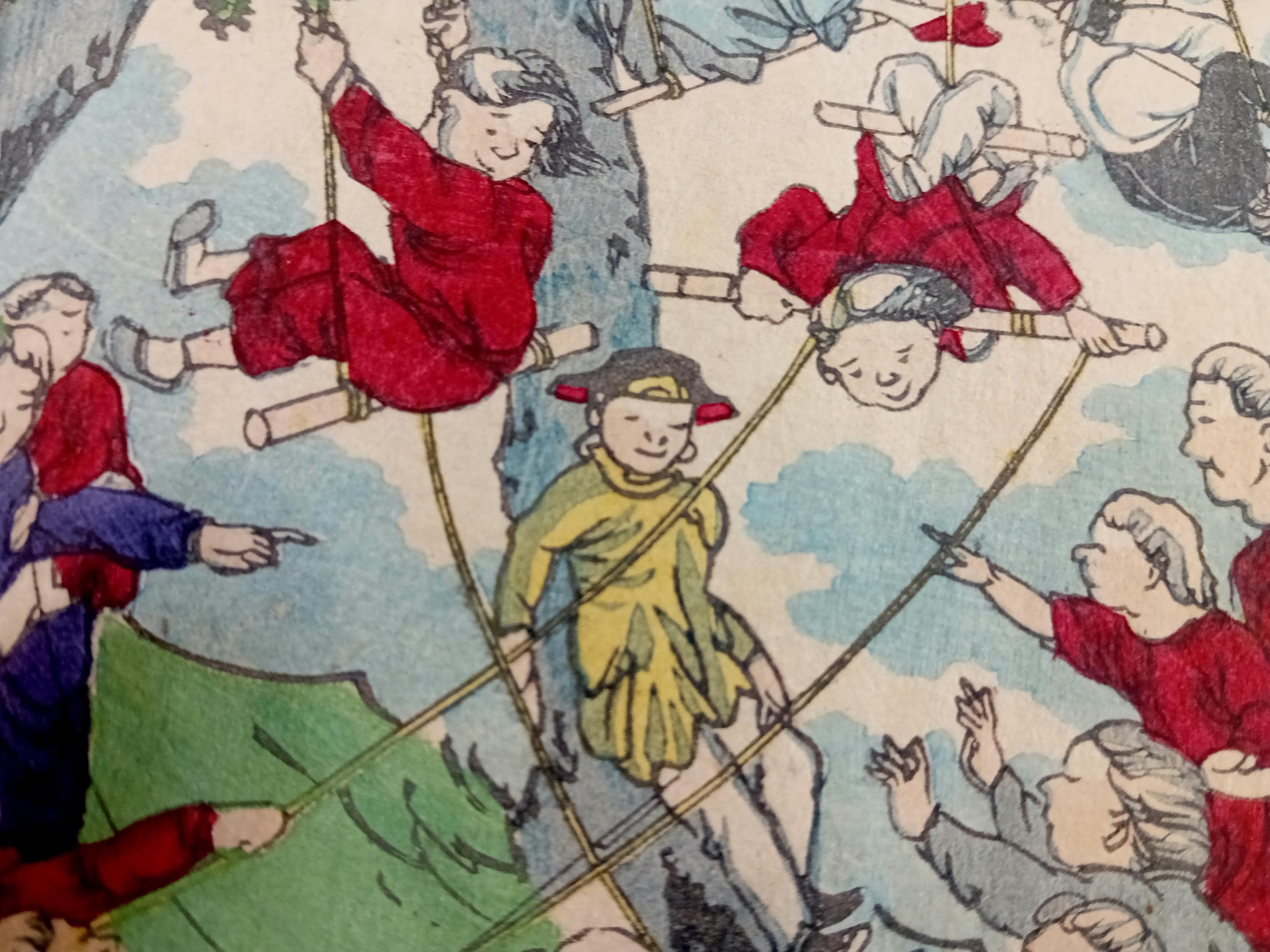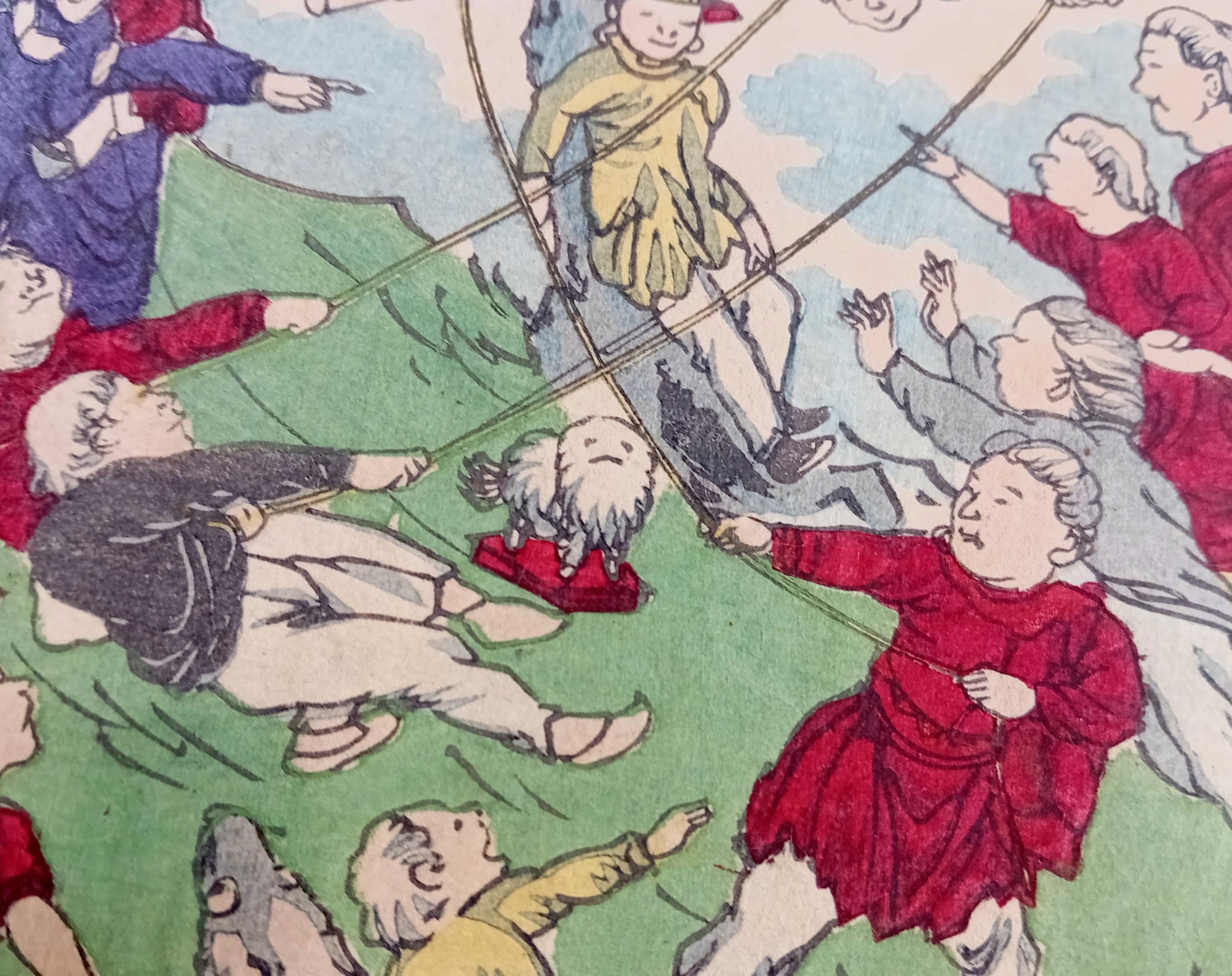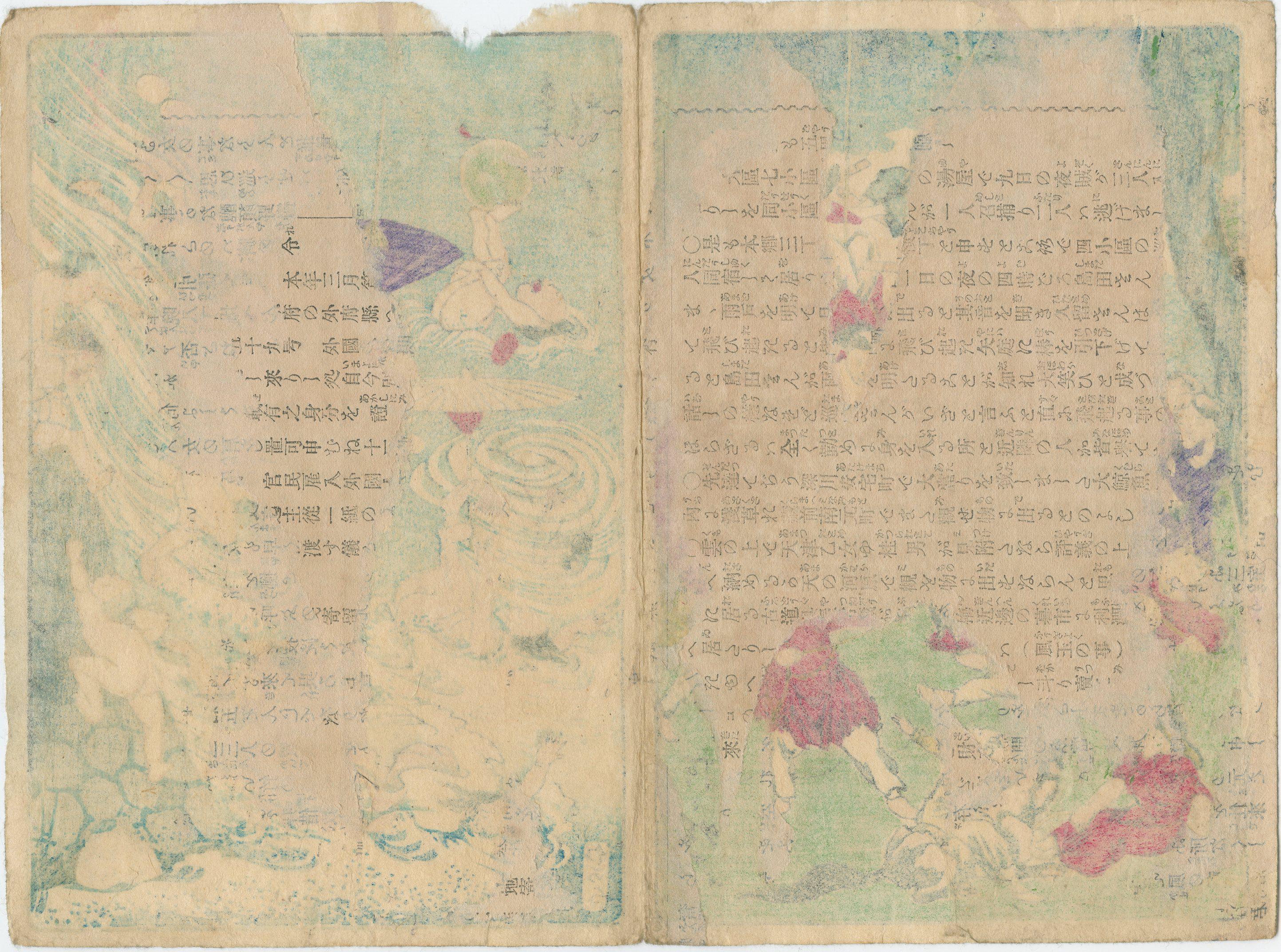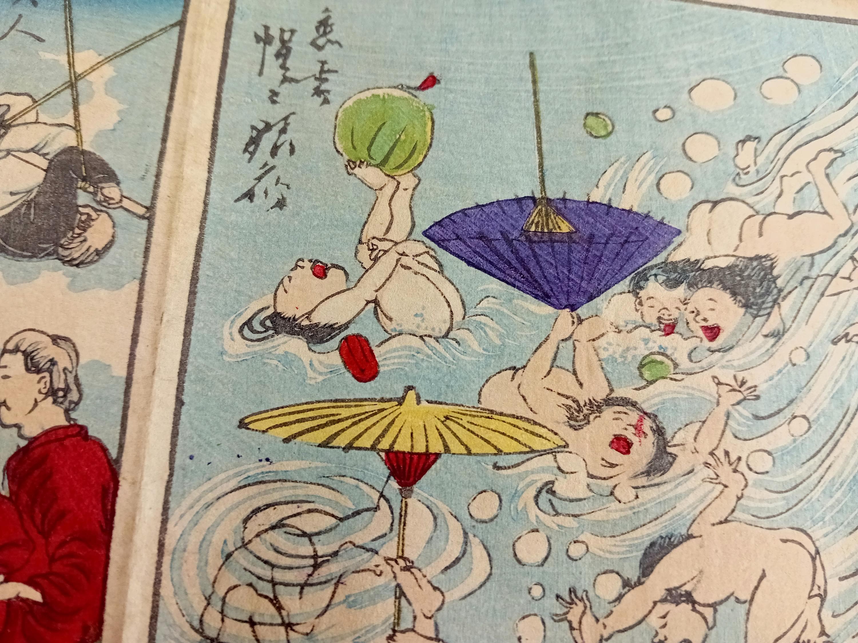 Multi-color late Edo / early Meiji woodblock printing in Kyosai’s satirical figurative style.