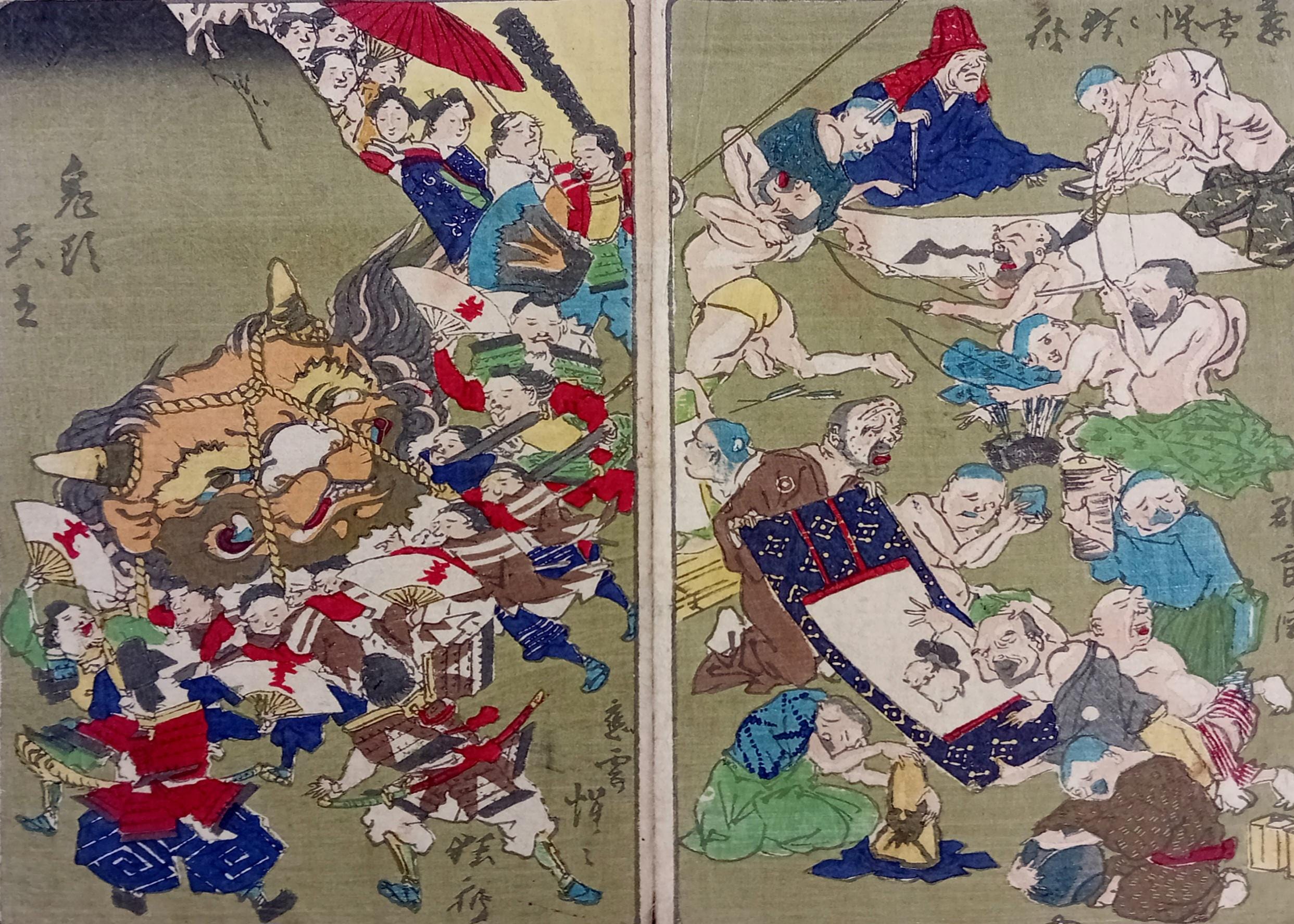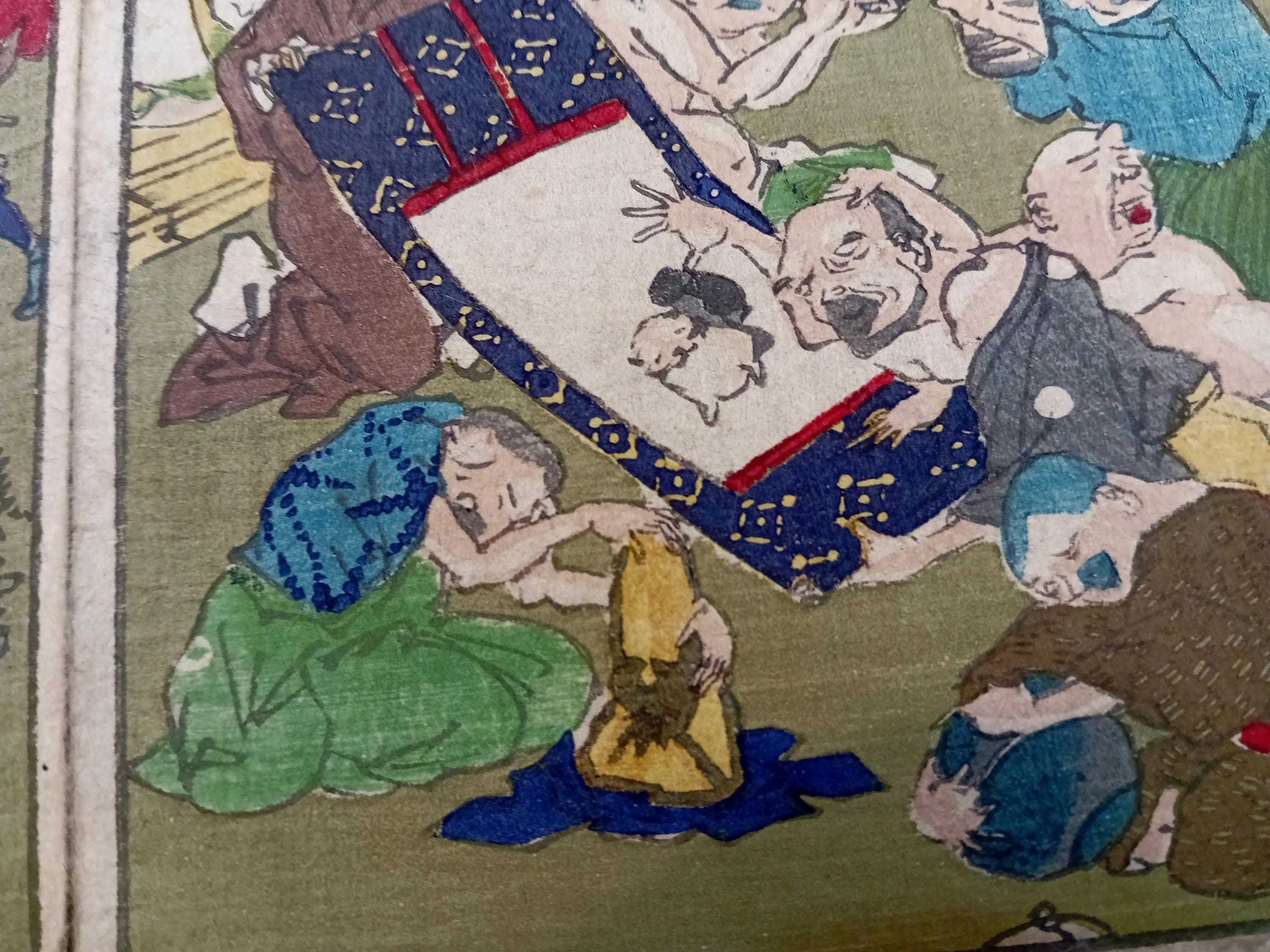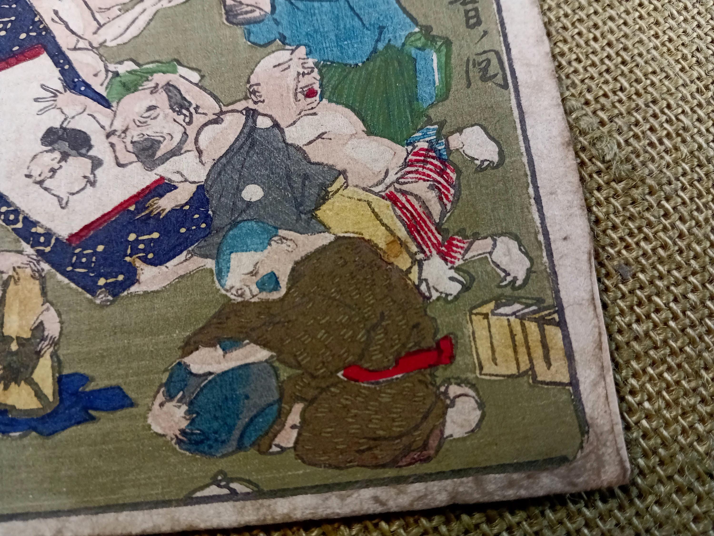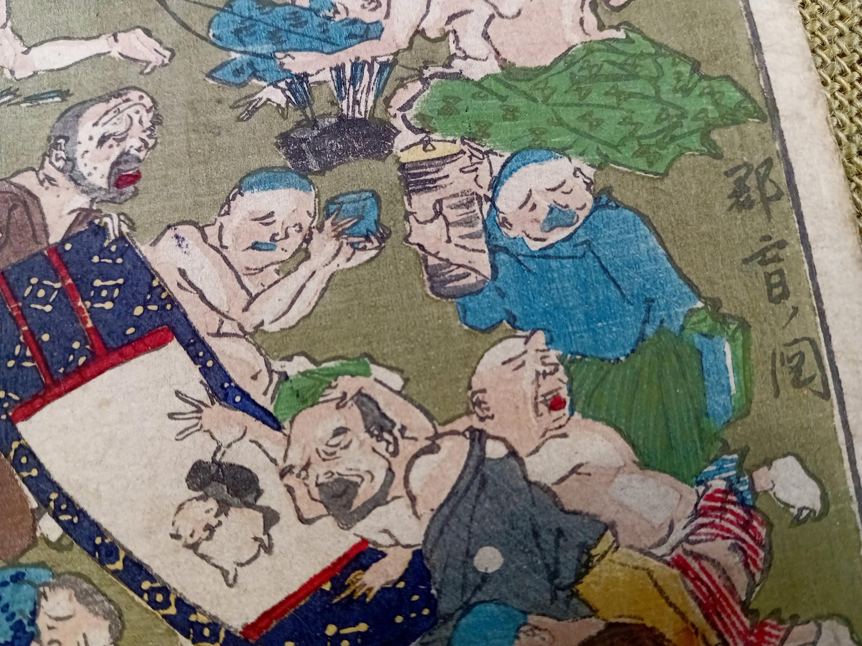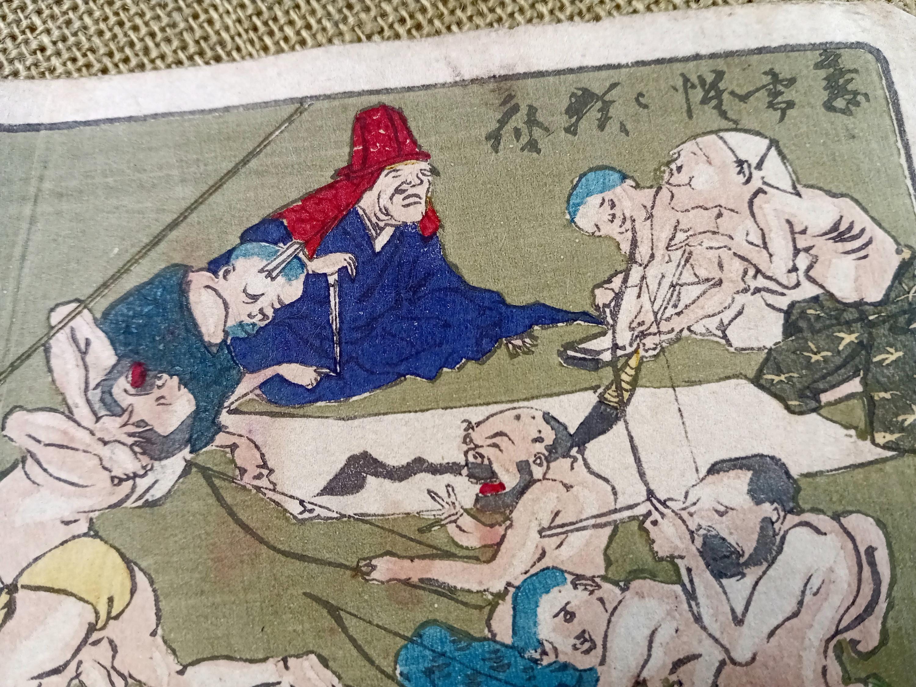 Late-Edo to early-Meiji nishiki-e with characteristic satirical linework of the Kyosai Hyakuzu series.