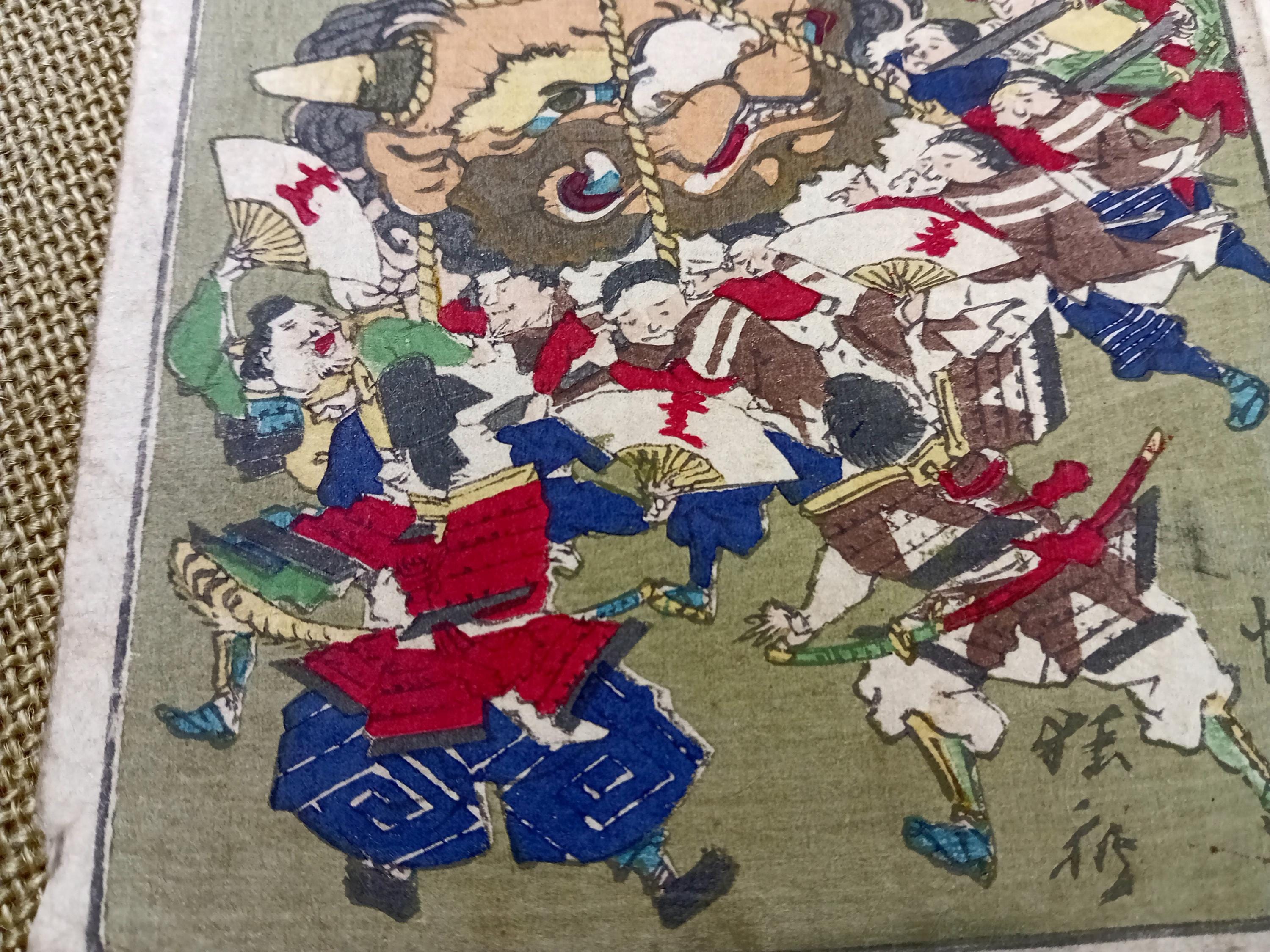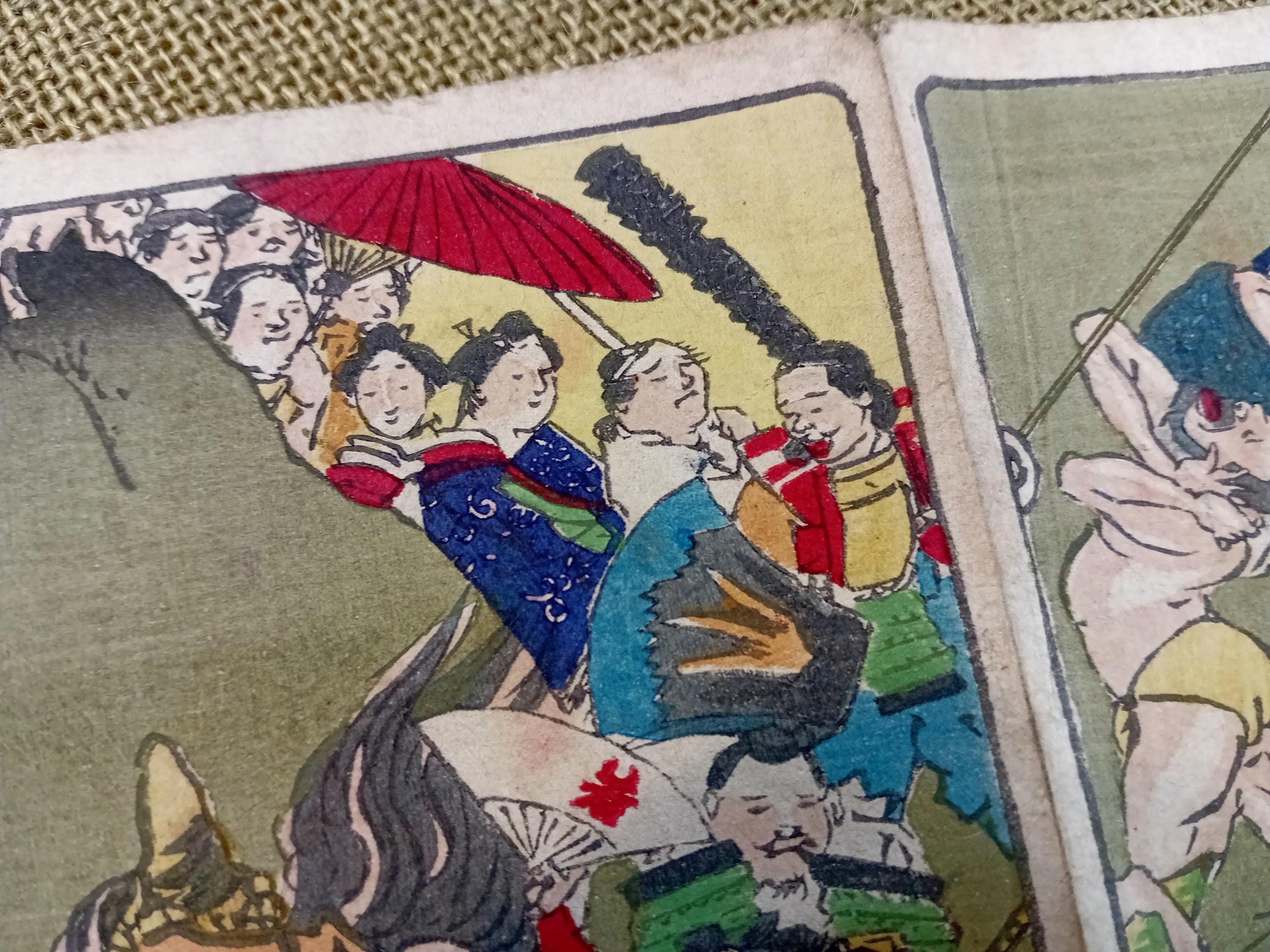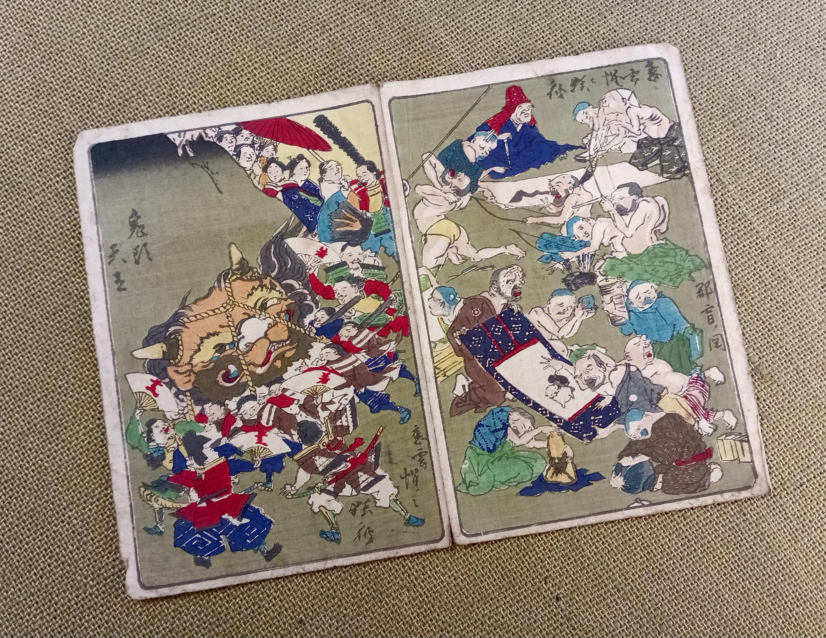 Original Japanese woodblock print from the late Edo to early Meiji period, from the series Kyosai Hyakuzu by Kawanabe Kyosai. The sheet includes two independent composition blocks, printed in nishiki-e technique on traditional washi paper. This example belongs to authentic nineteenth-century impressions of the series.
