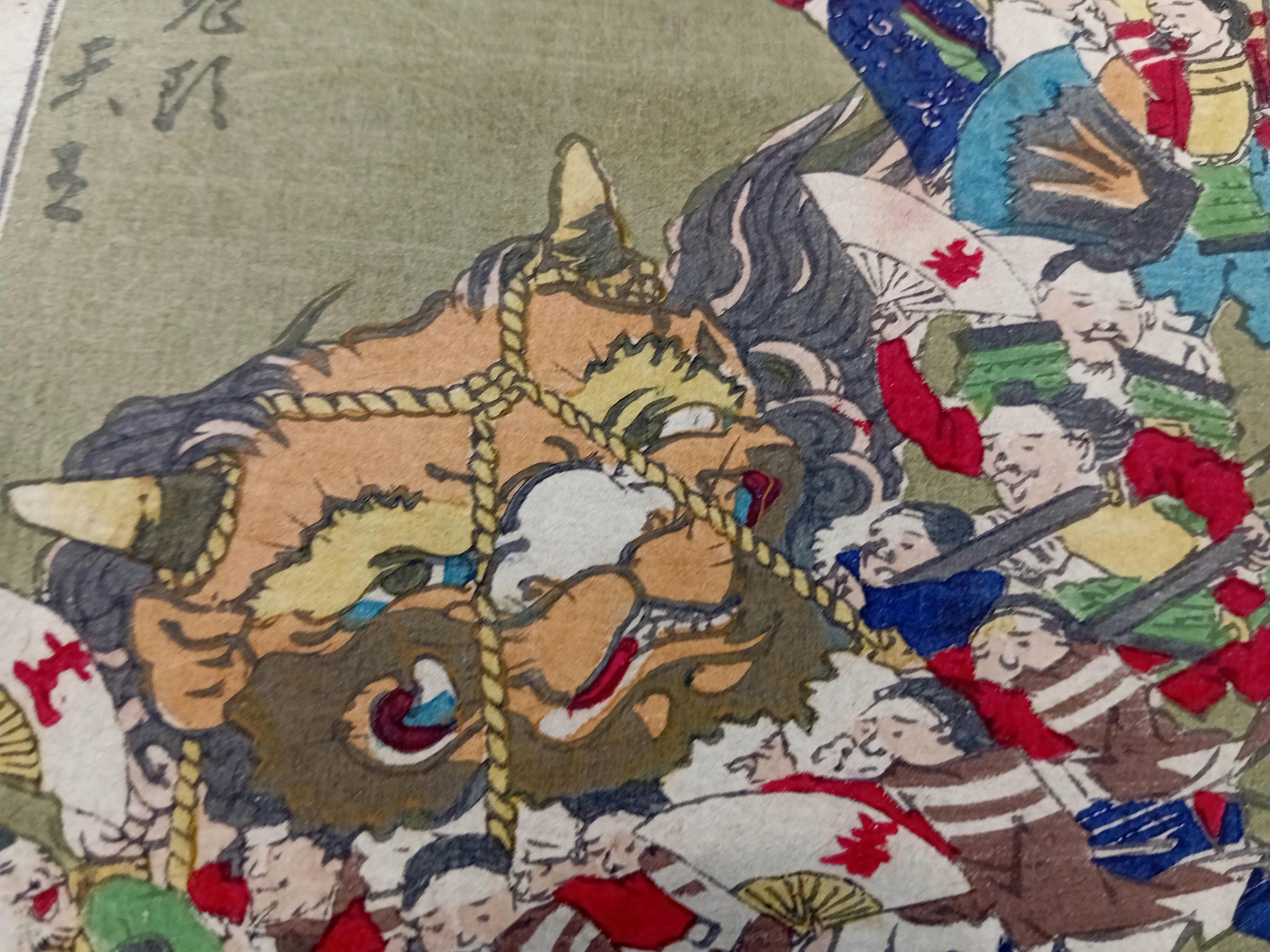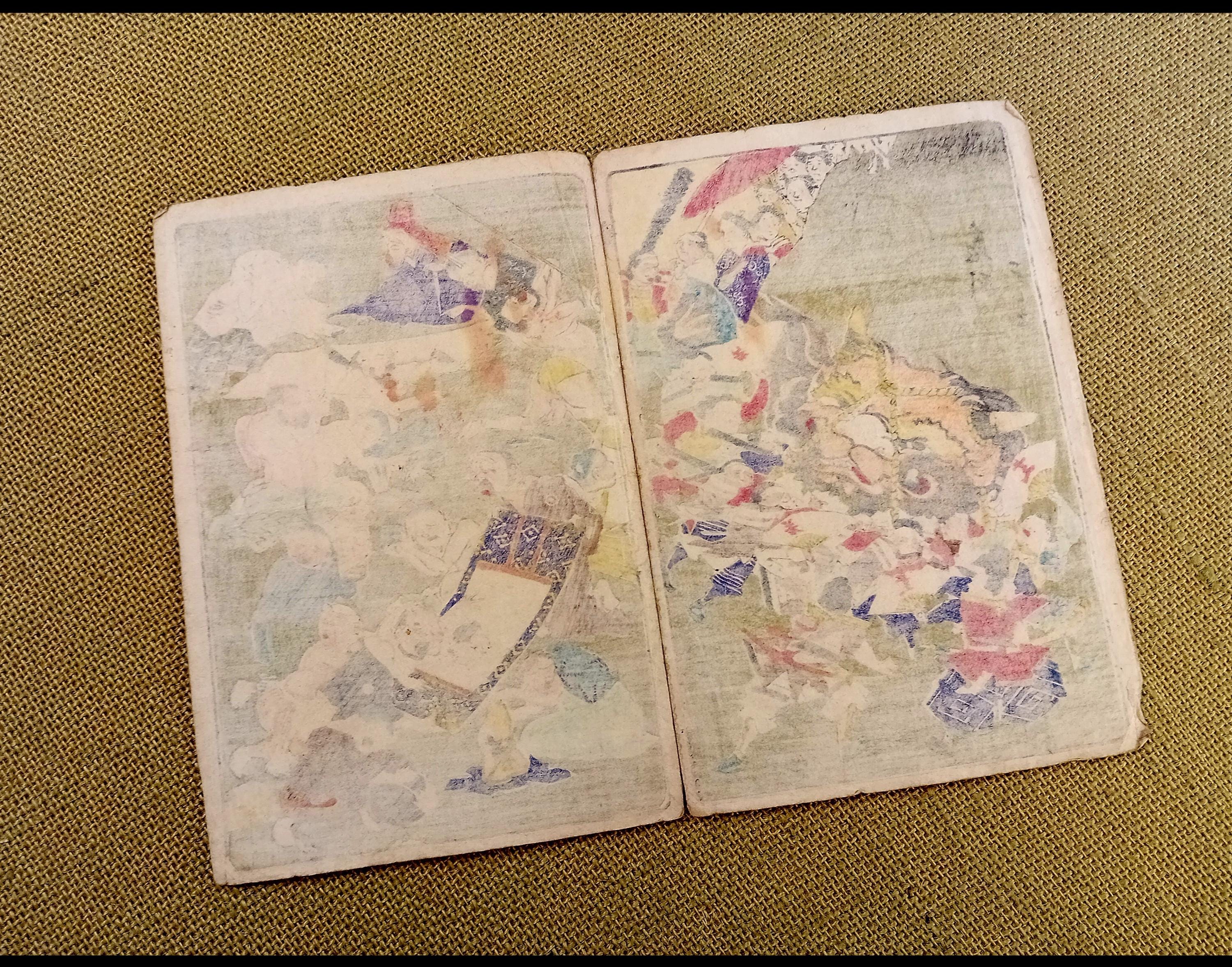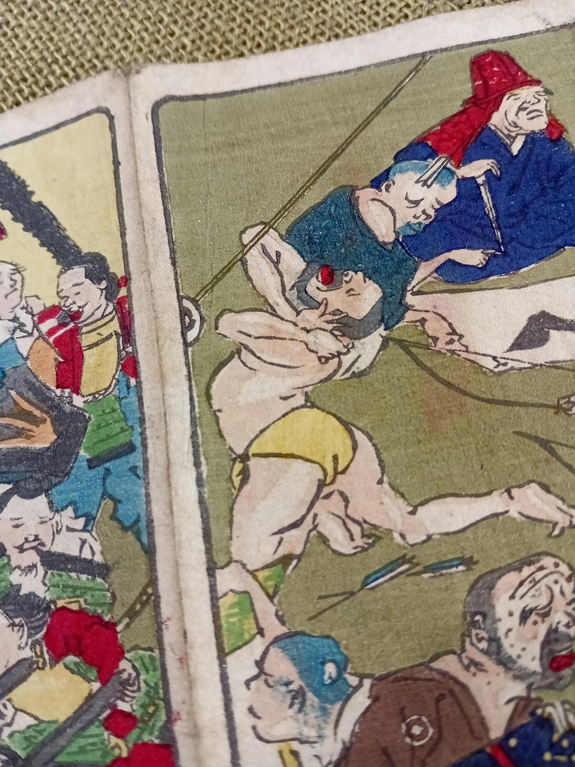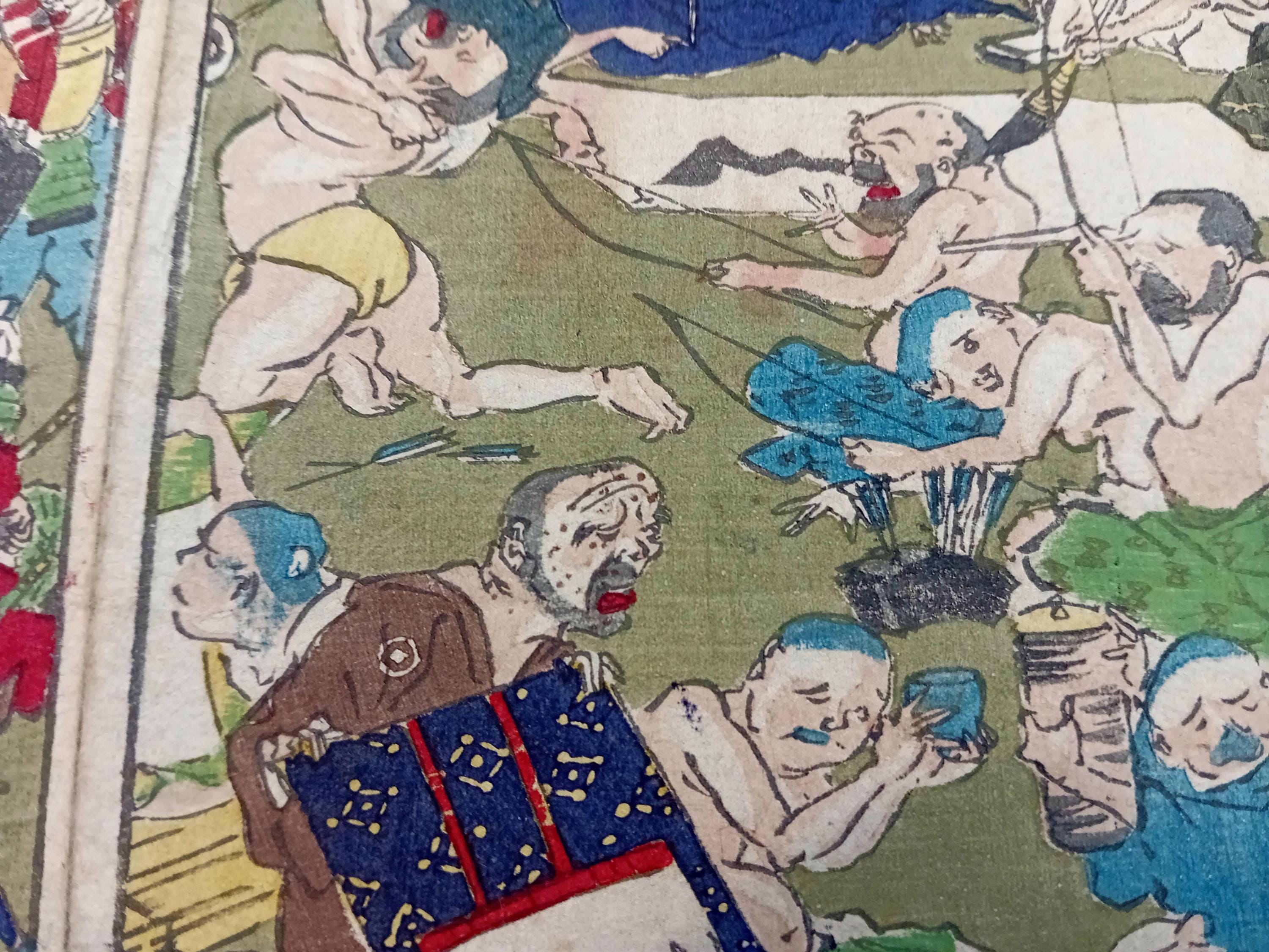 Original Japanese woodblock print from the late Edo to early Meiji period, from the series Kyosai Hyakuzu by Kawanabe Kyosai. The sheet includes two independent composition blocks, printed in nishiki-e technique on traditional washi paper. This example belongs to authentic nineteenth-century impressions of the series.