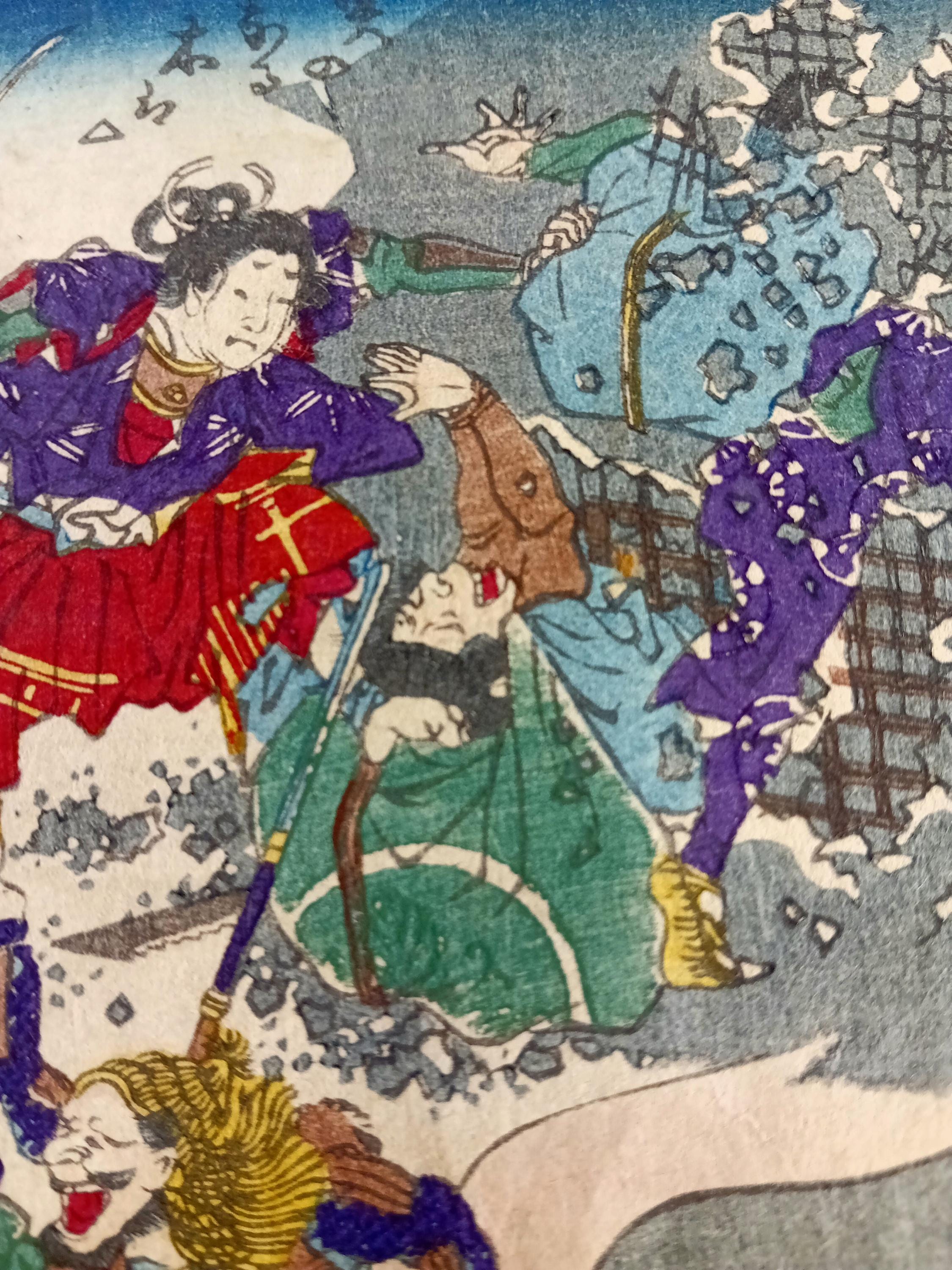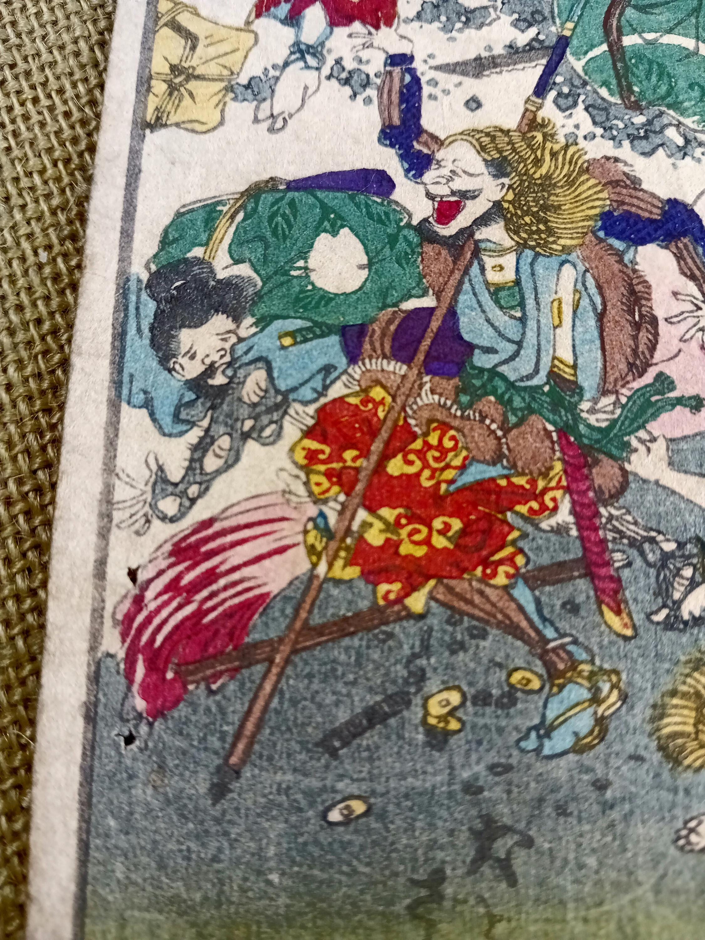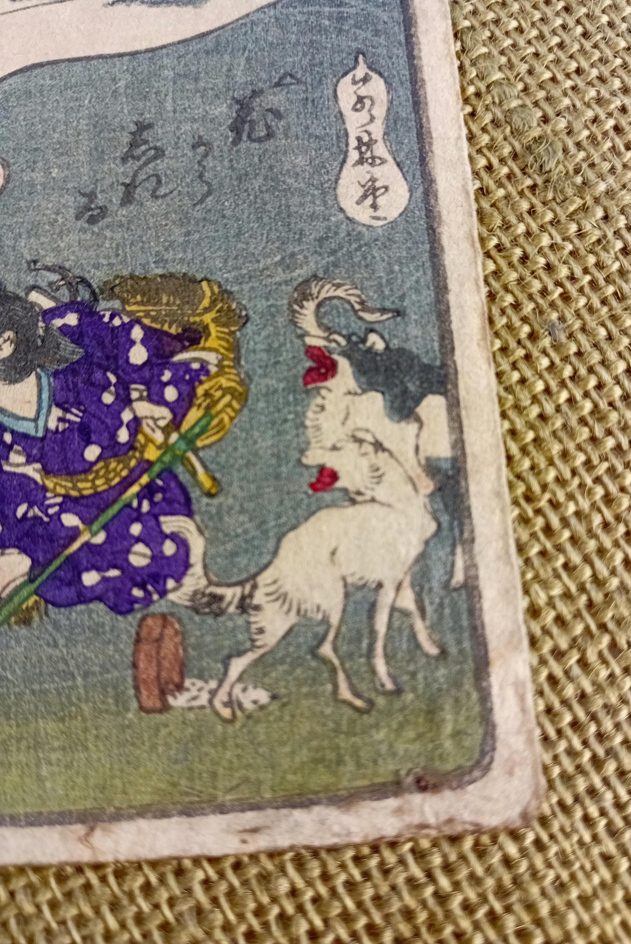 Original Japanese woodblock print from the late Edo to early Meiji period, from the series One Hundred Pictures by Kyosai (Kyosai Hyakuzu) by Kawanabe Kyosai. Printed in nishiki-e technique on traditional washi paper. This sheet comes from authentic nineteenth-century impressions of the series.