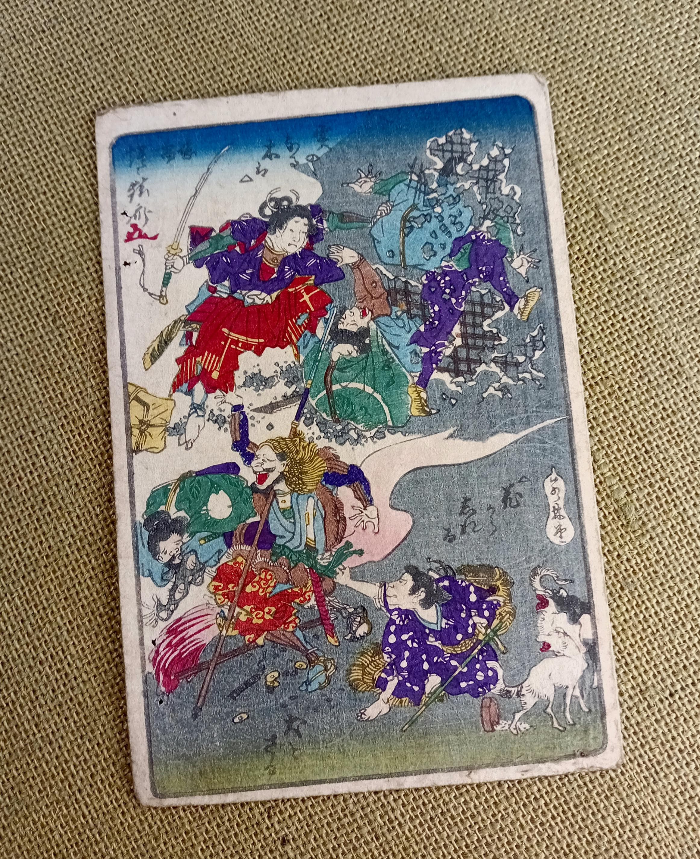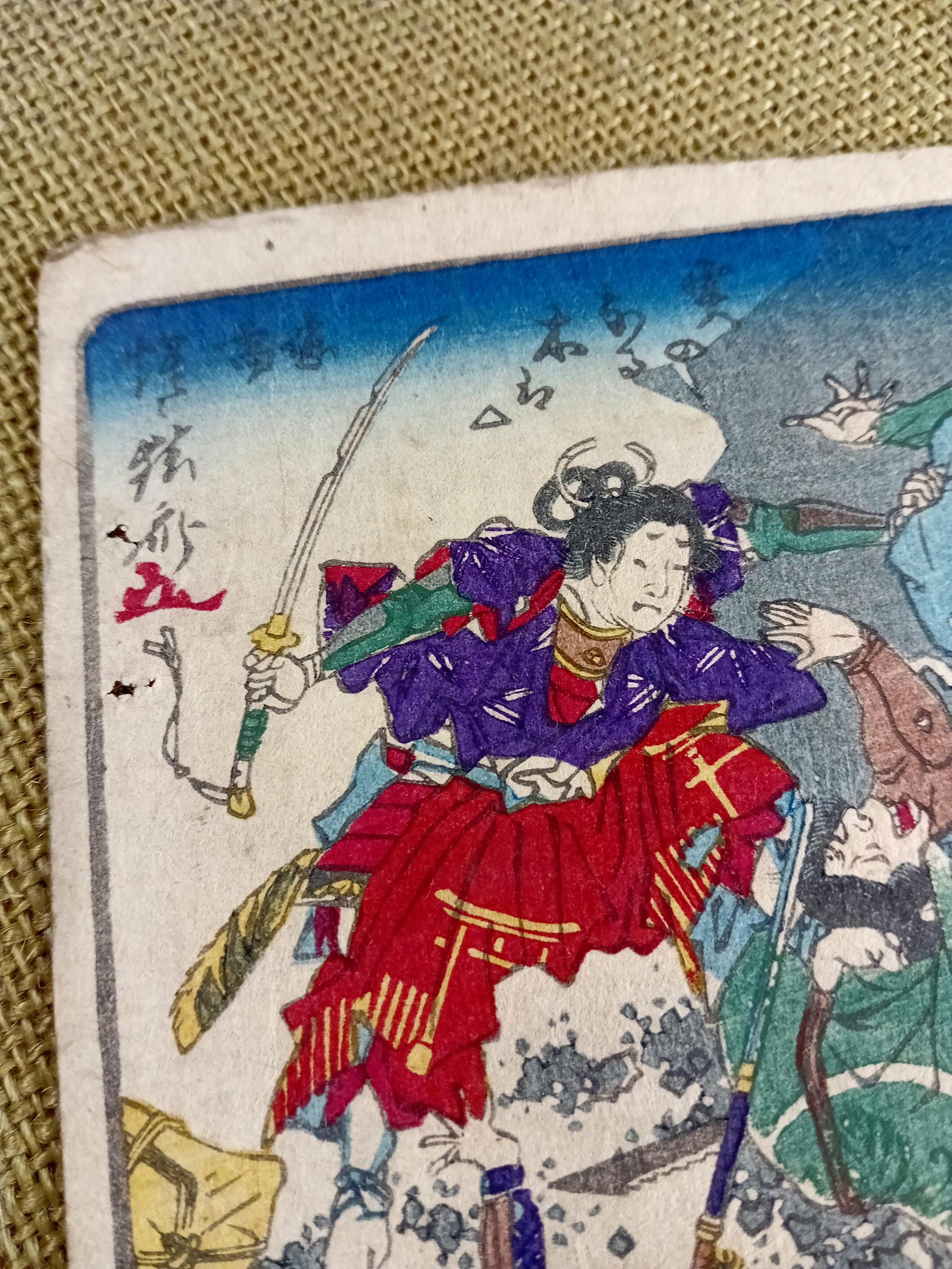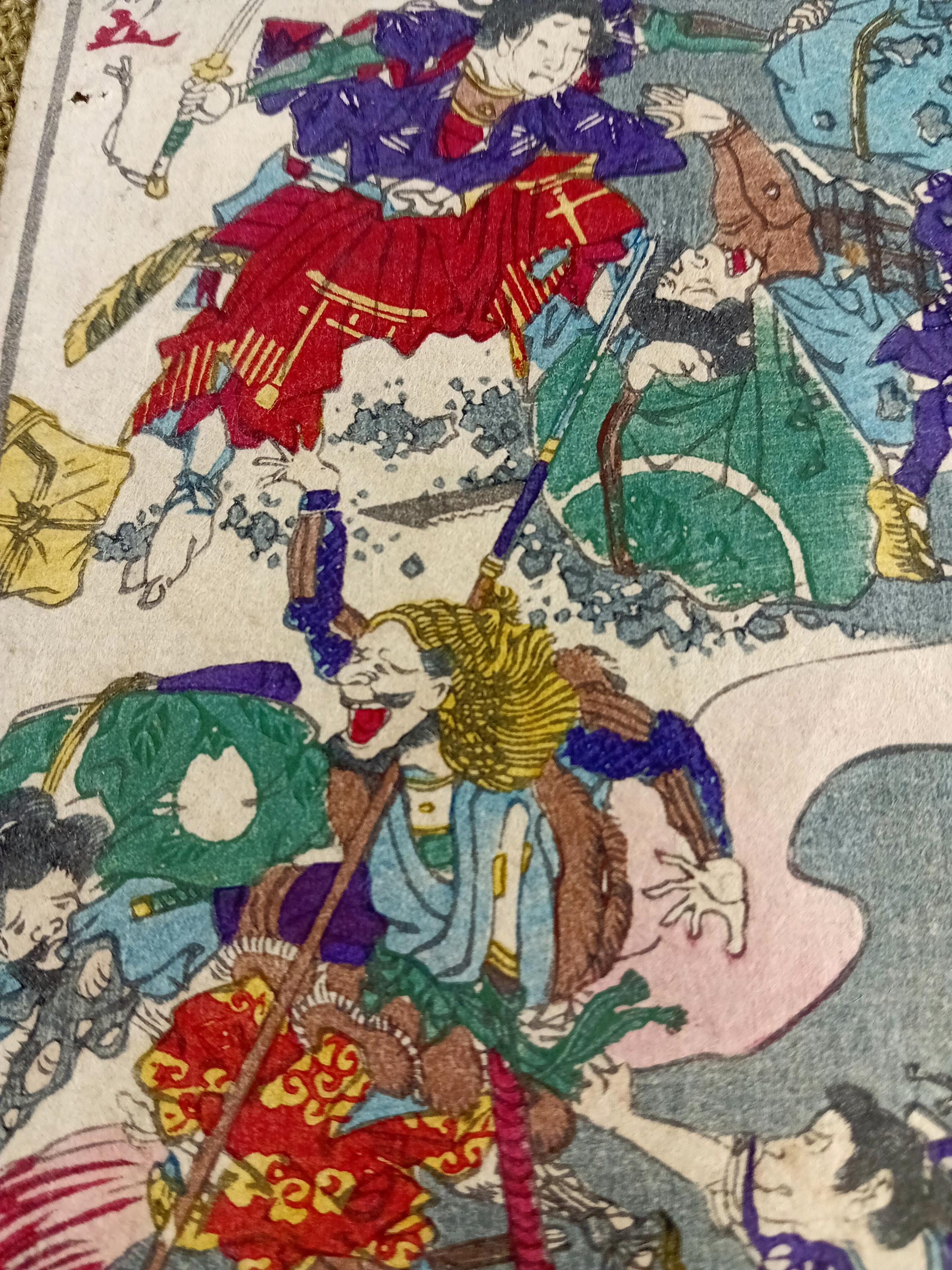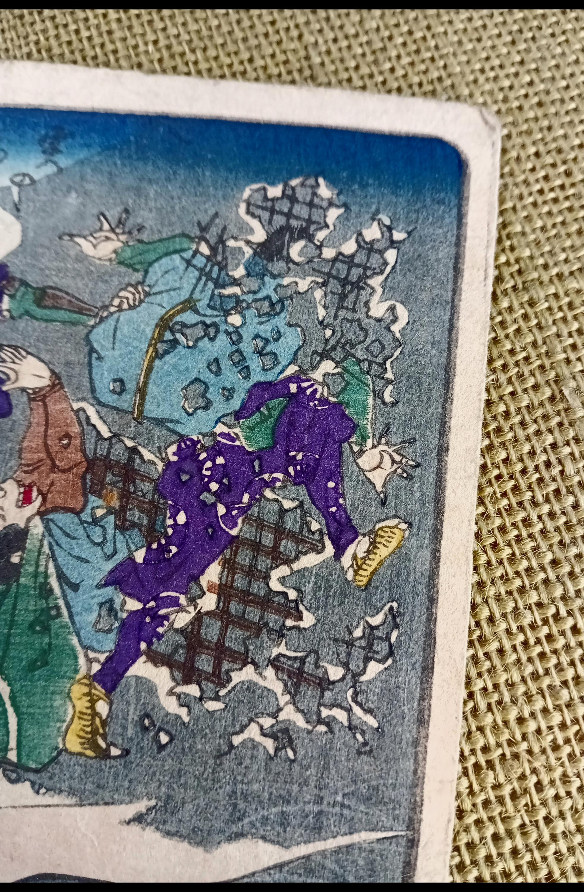 Original Japanese woodblock print from the late Edo to early Meiji period, from the series One Hundred Pictures by Kyosai (Kyosai Hyakuzu) by Kawanabe Kyosai. Printed in nishiki-e technique on traditional washi paper. This sheet comes from authentic nineteenth-century impressions of the series.