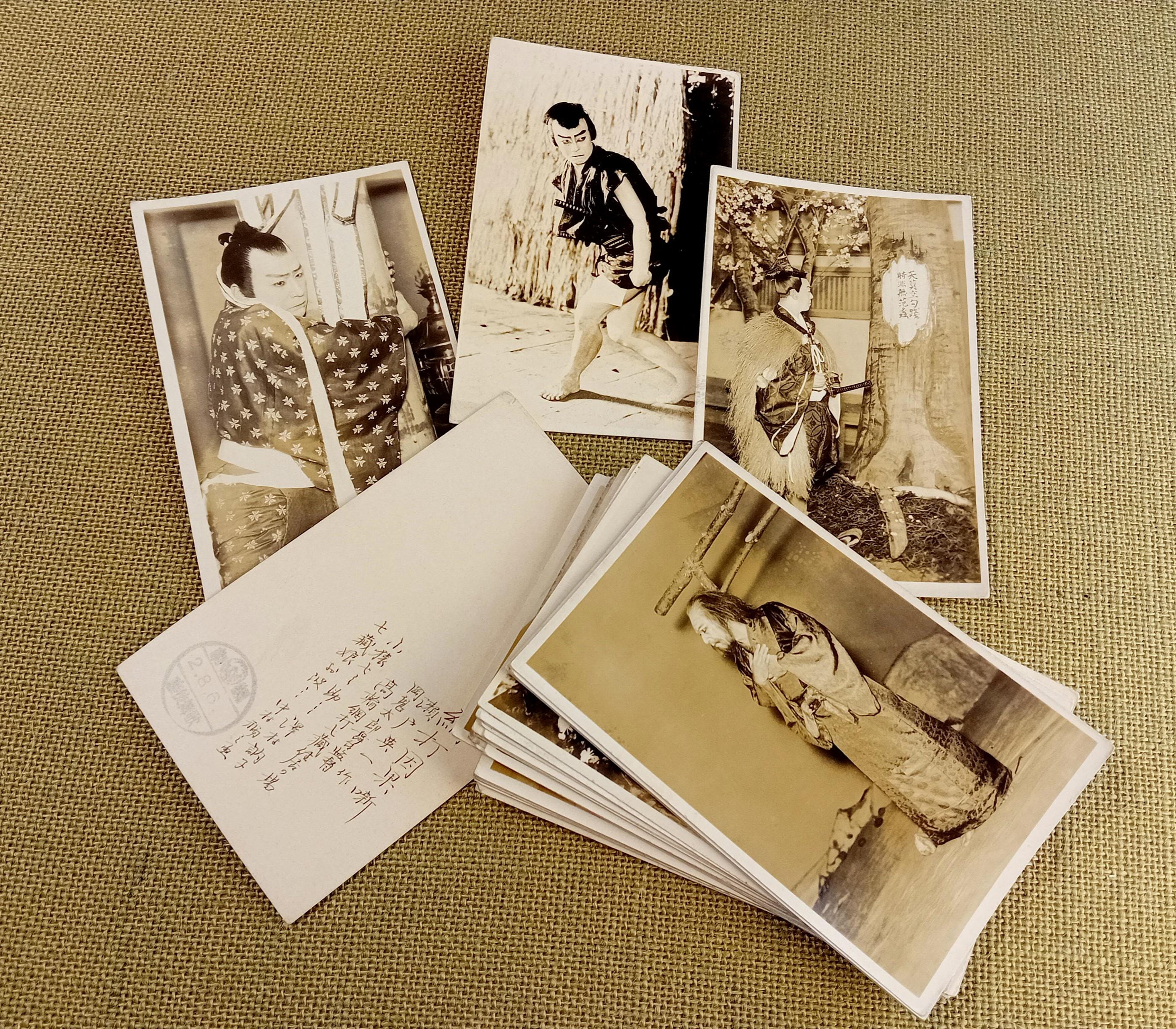 The photographs show actors in full costume, including warrior roles, formal male roles, onnagata performance types and stage scenes with props such as cherry blossoms, straw cloaks, and period interiors. Several cards carry production notes or identification stamps on the reverse.
