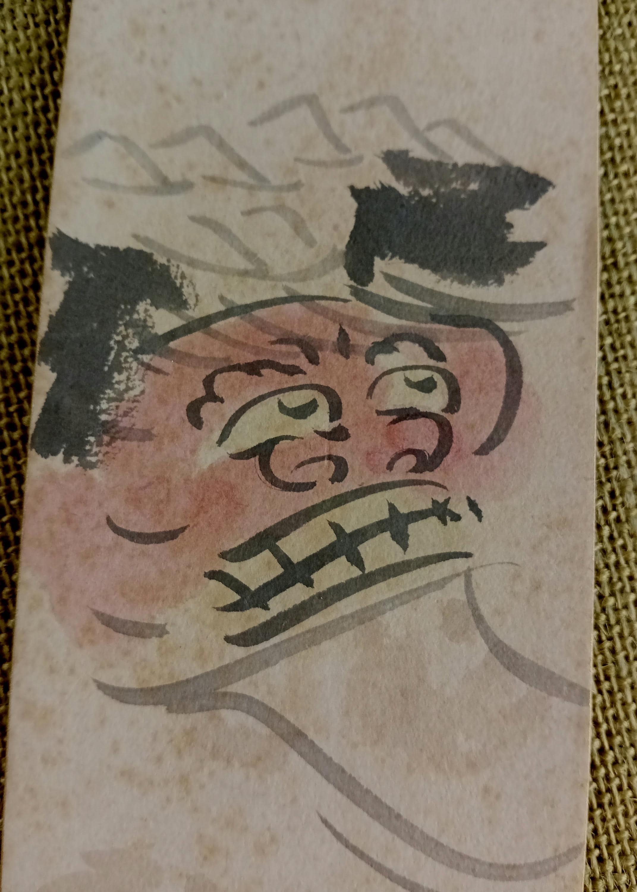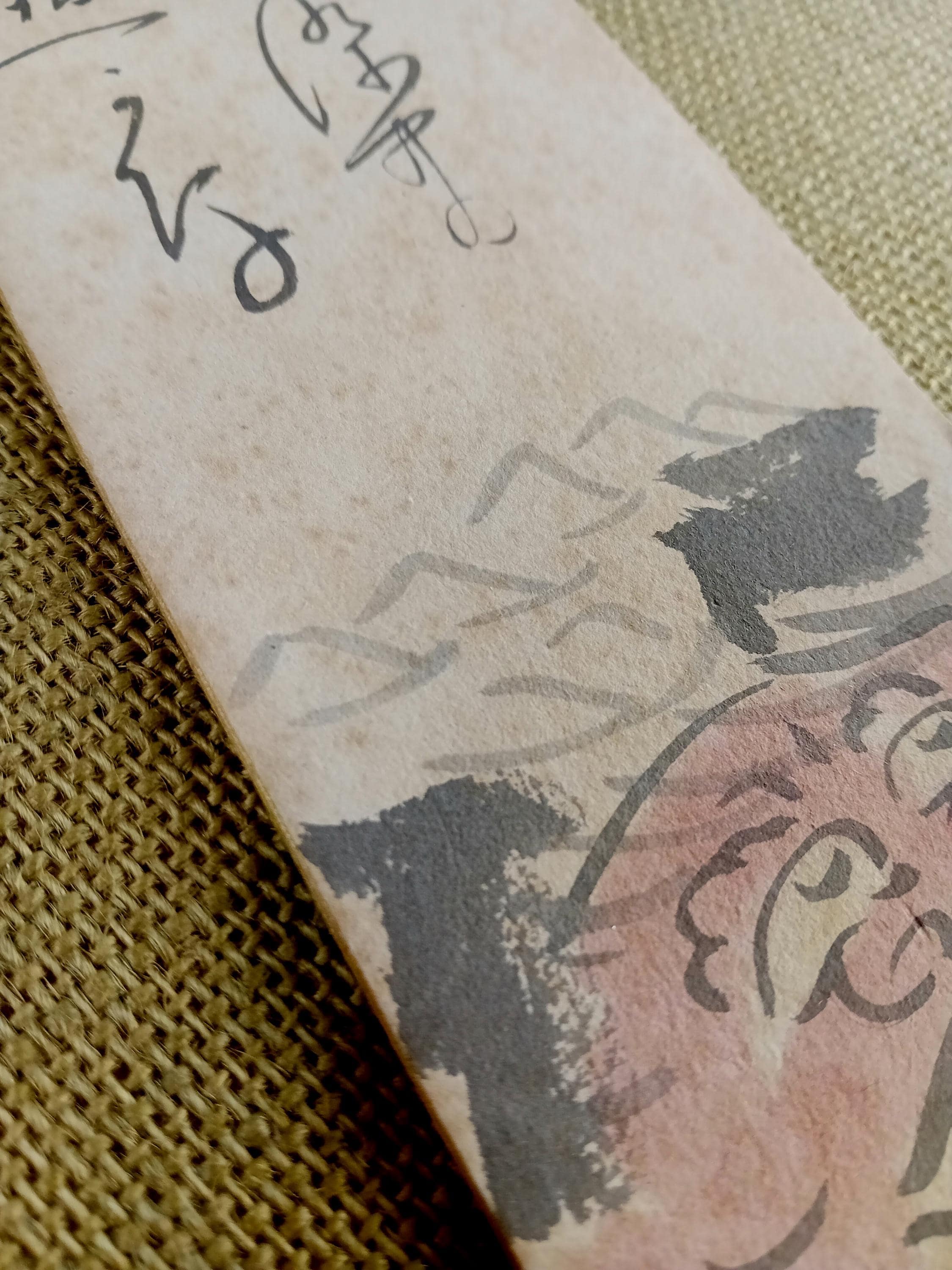 Original antique Japanese artwork in tanzaku format, executed on paper with ink and pigments. The composition depicts a stylized human figure with a face, shown in a fragmentary manner with emphasis on facial features and elements of clothing. The work bears a vertical inscription, a signature, and a red artist’s seal.