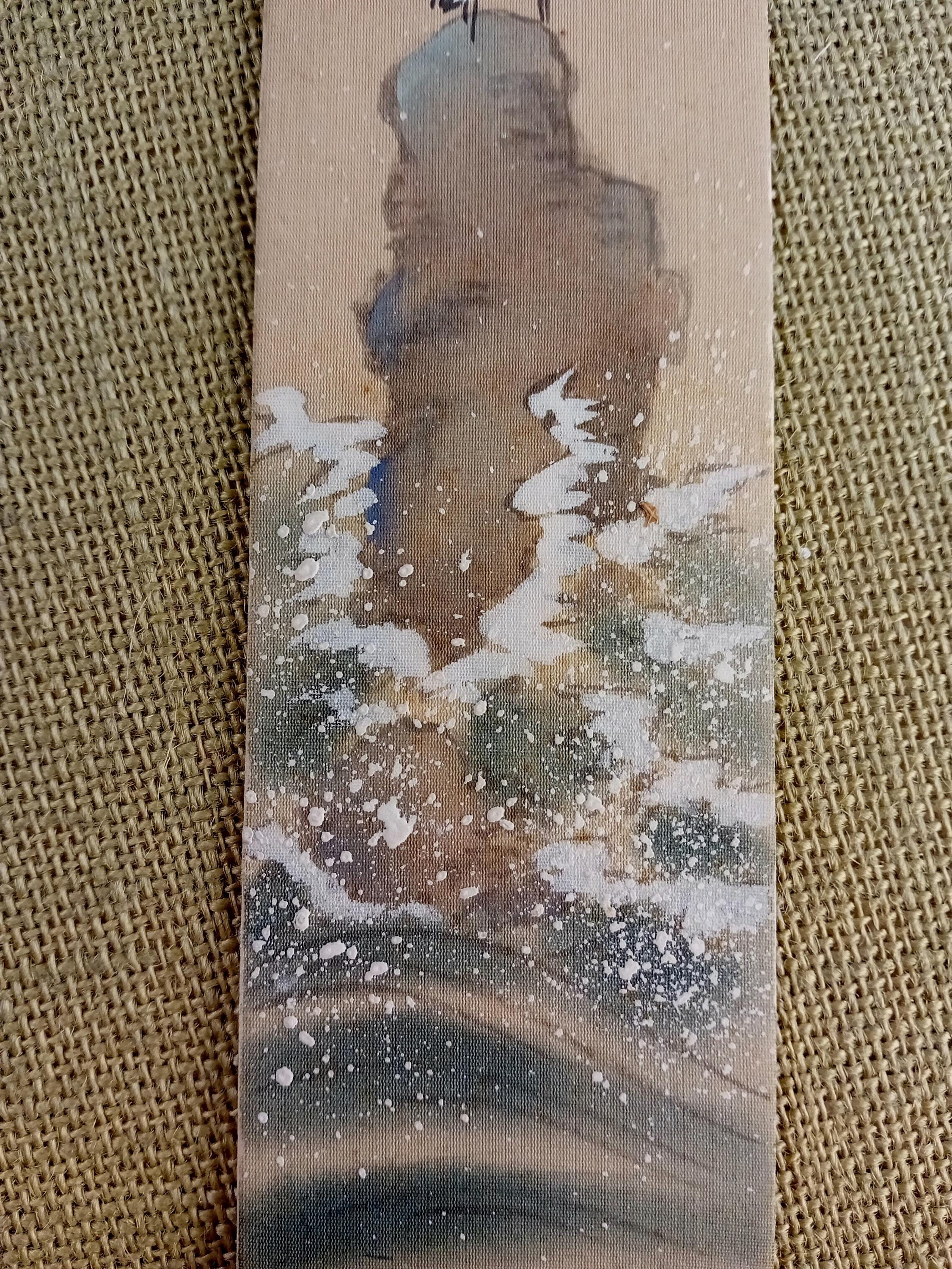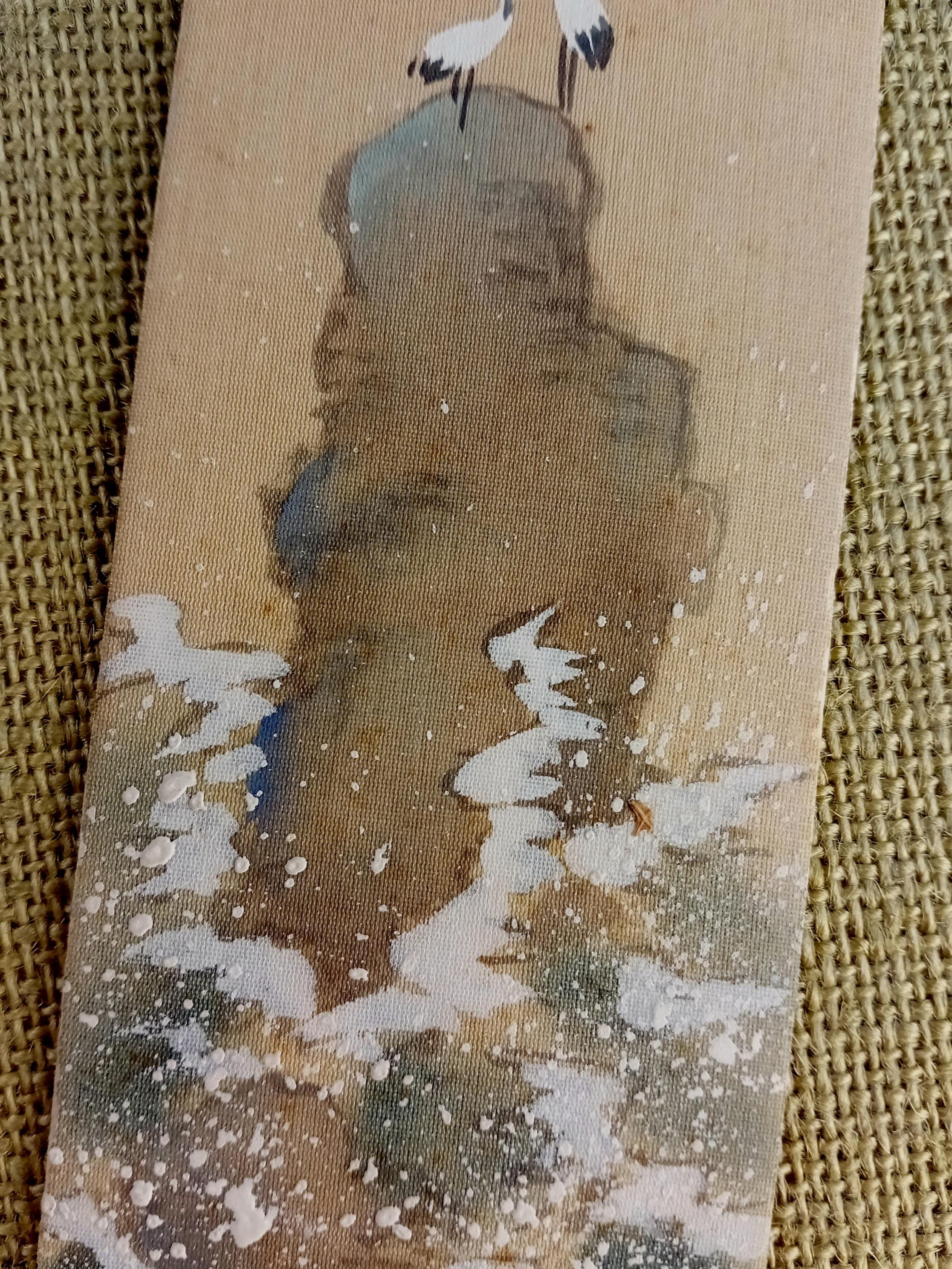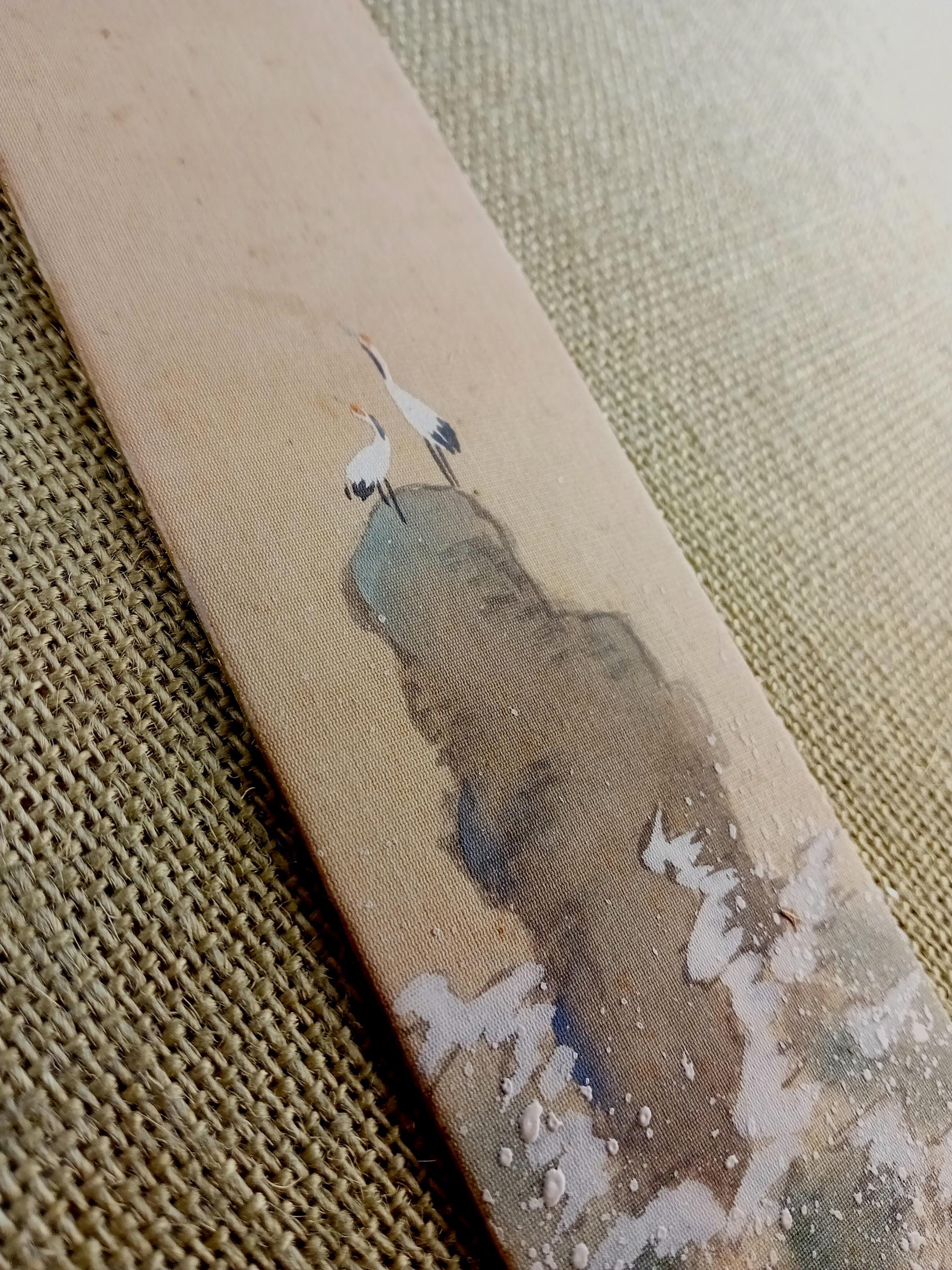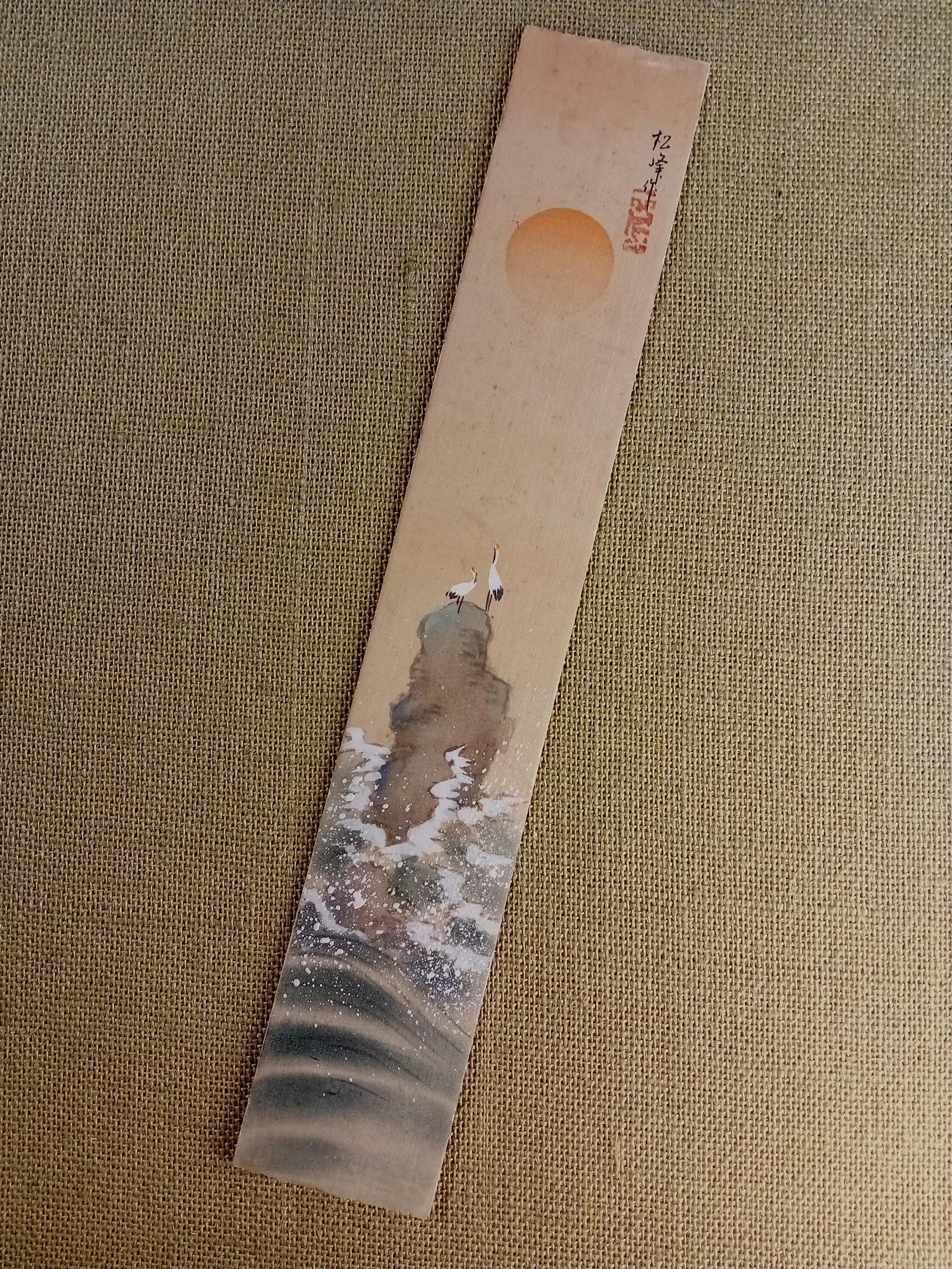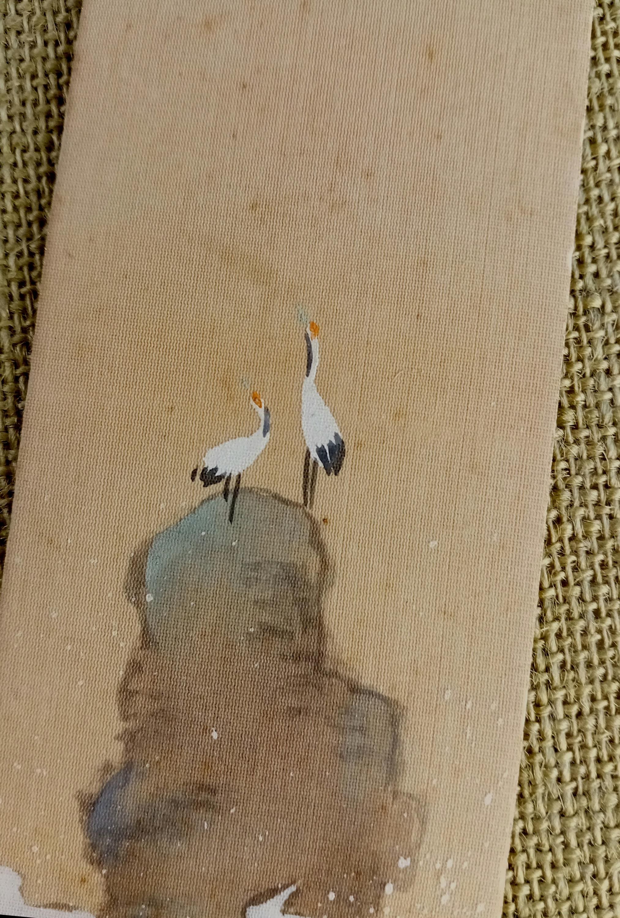 Original Japanese artwork in tanzaku format, painted on silk. The composition depicts two cranes standing on a rocky formation. A circular sun is placed in the upper section of the sheet, while the lower part is occupied by stylized water. The work bears a calligraphic inscription and a red artist’s seal.