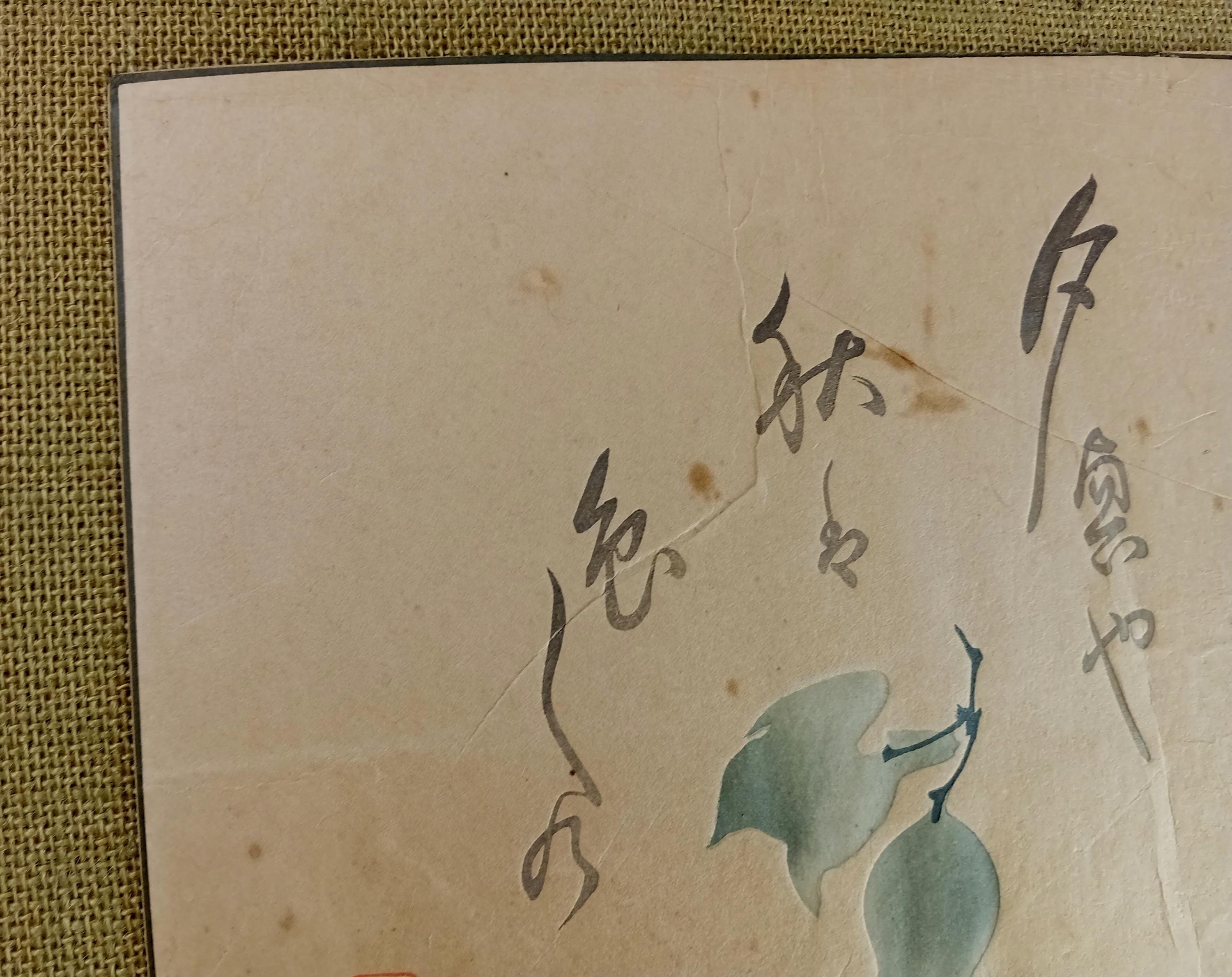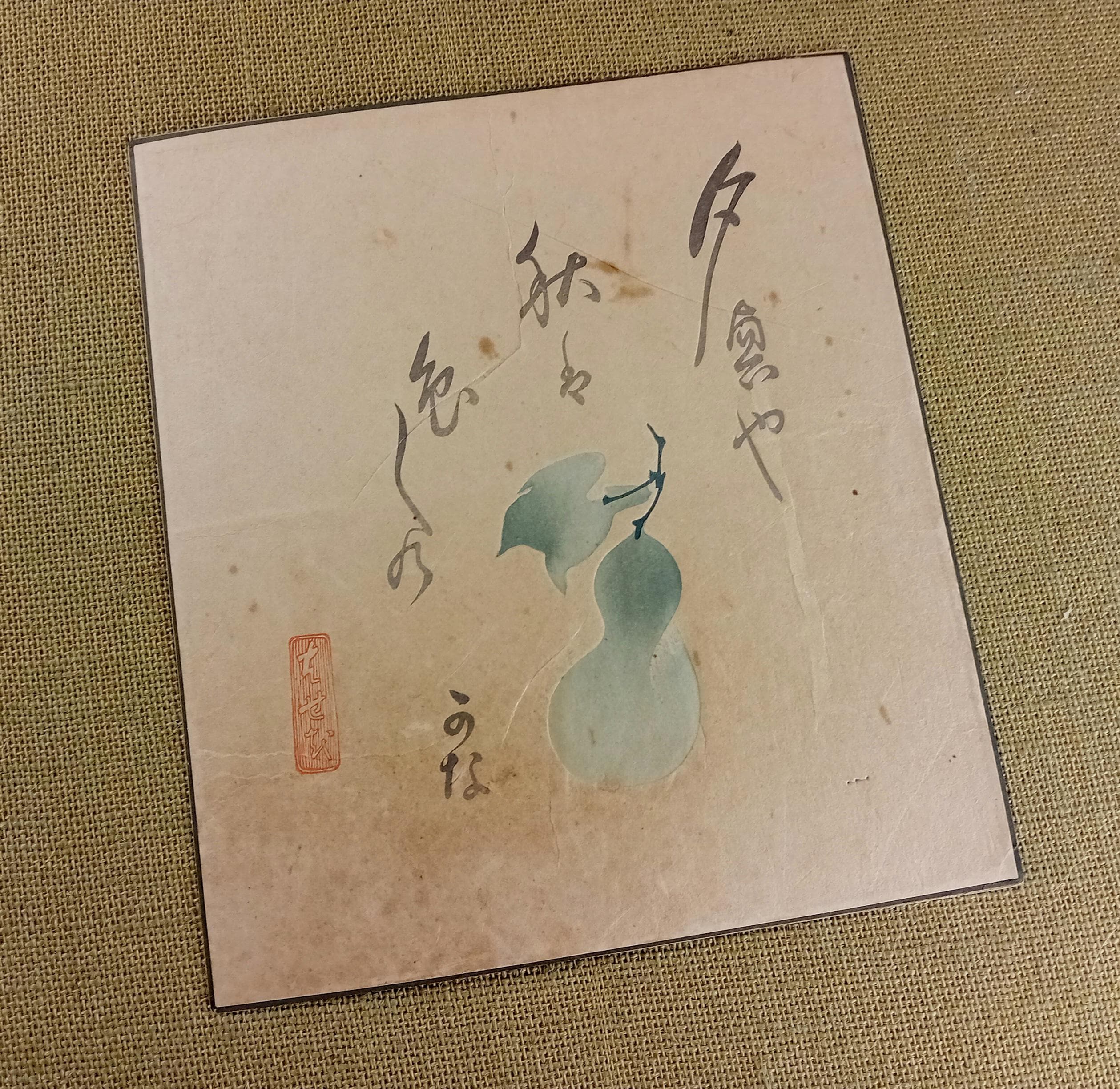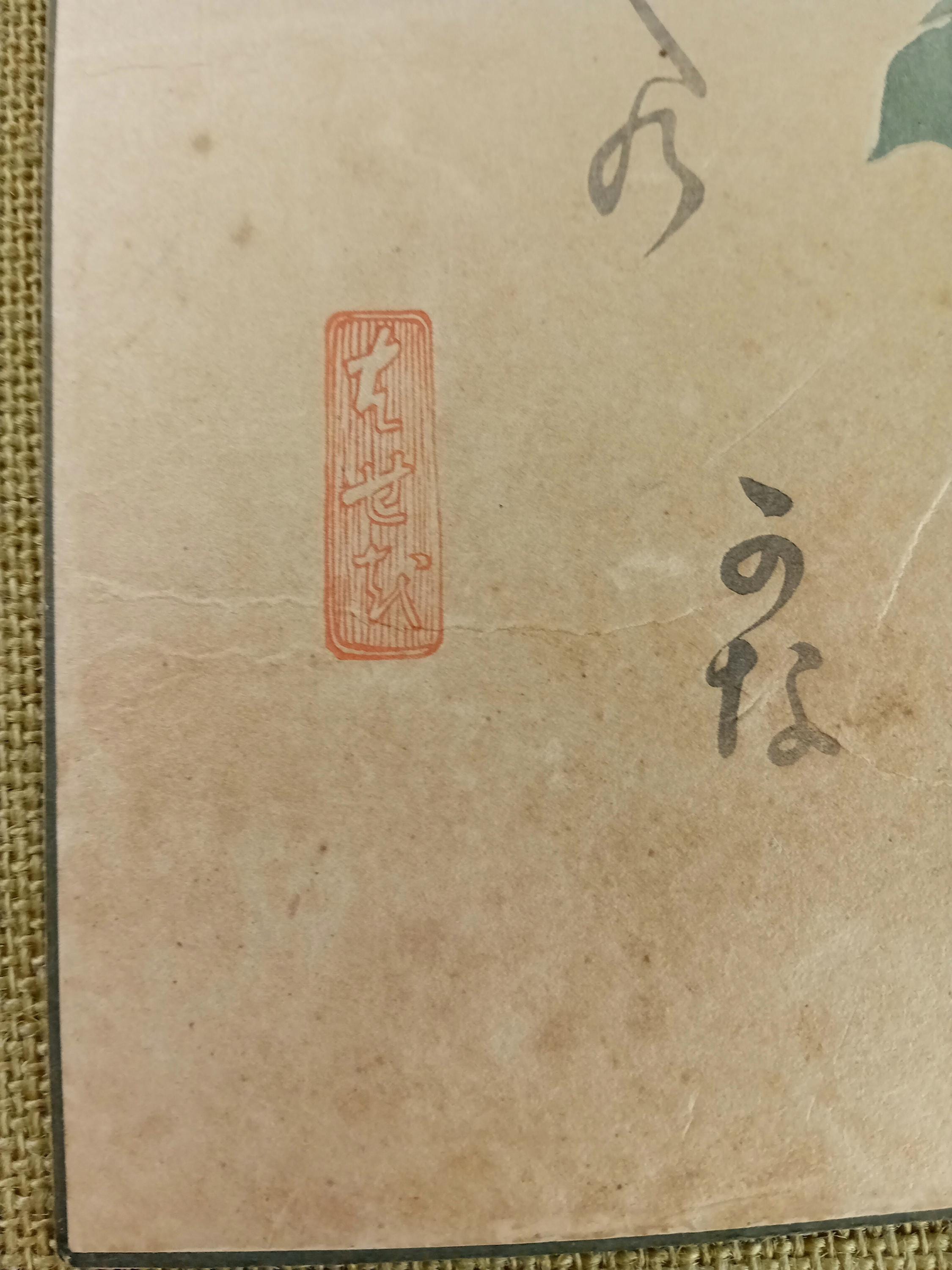 The character of the printed lines and the restrained colour passages indicate traditional woodblock printing. The later mounting on thin board follows a common preservation practice for small graphic sheets. The spontaneous quality of the calligraphy and the concise composition correspond to the surimono tradition, where visual balance and poetic suggestion were central.