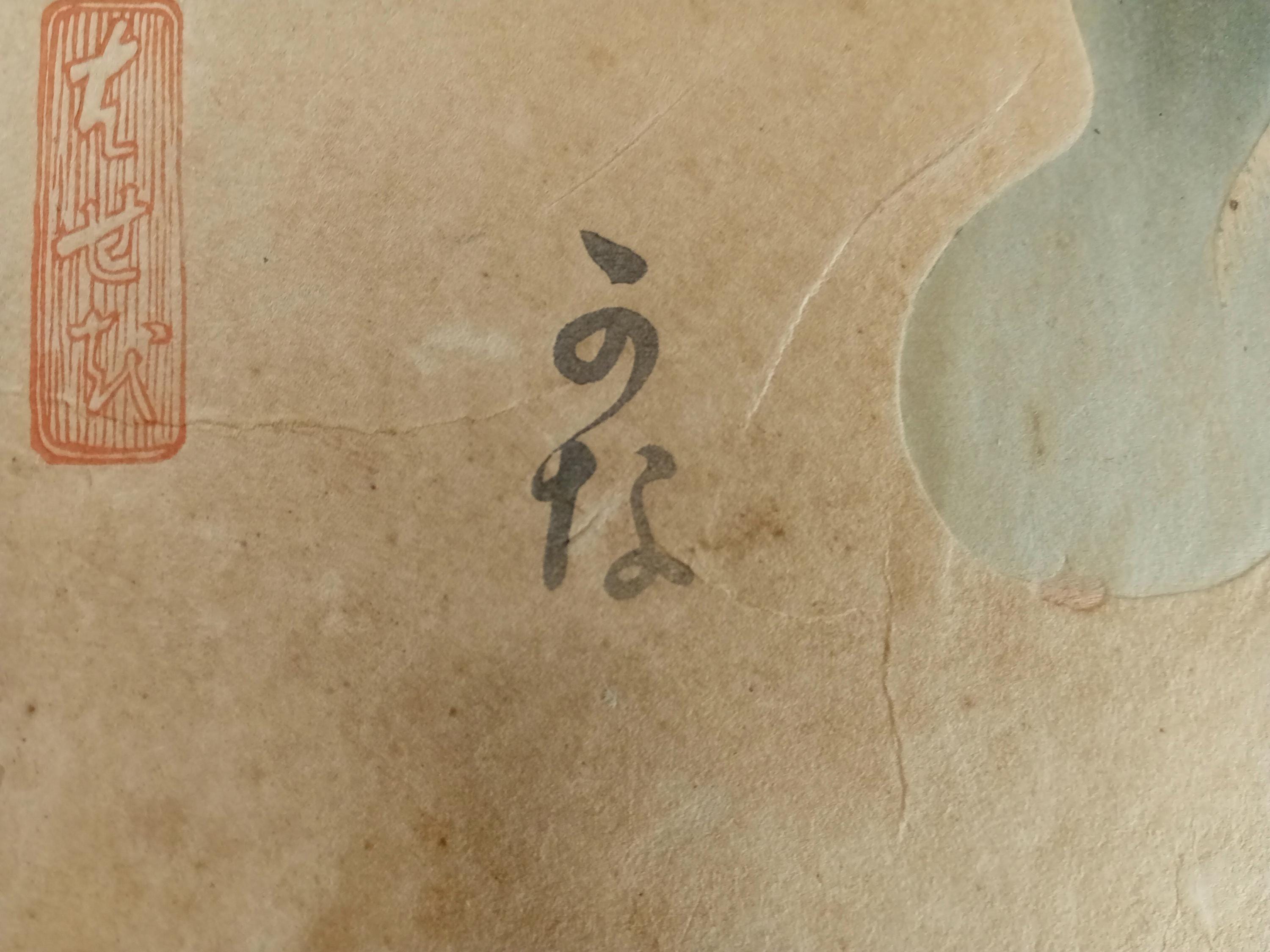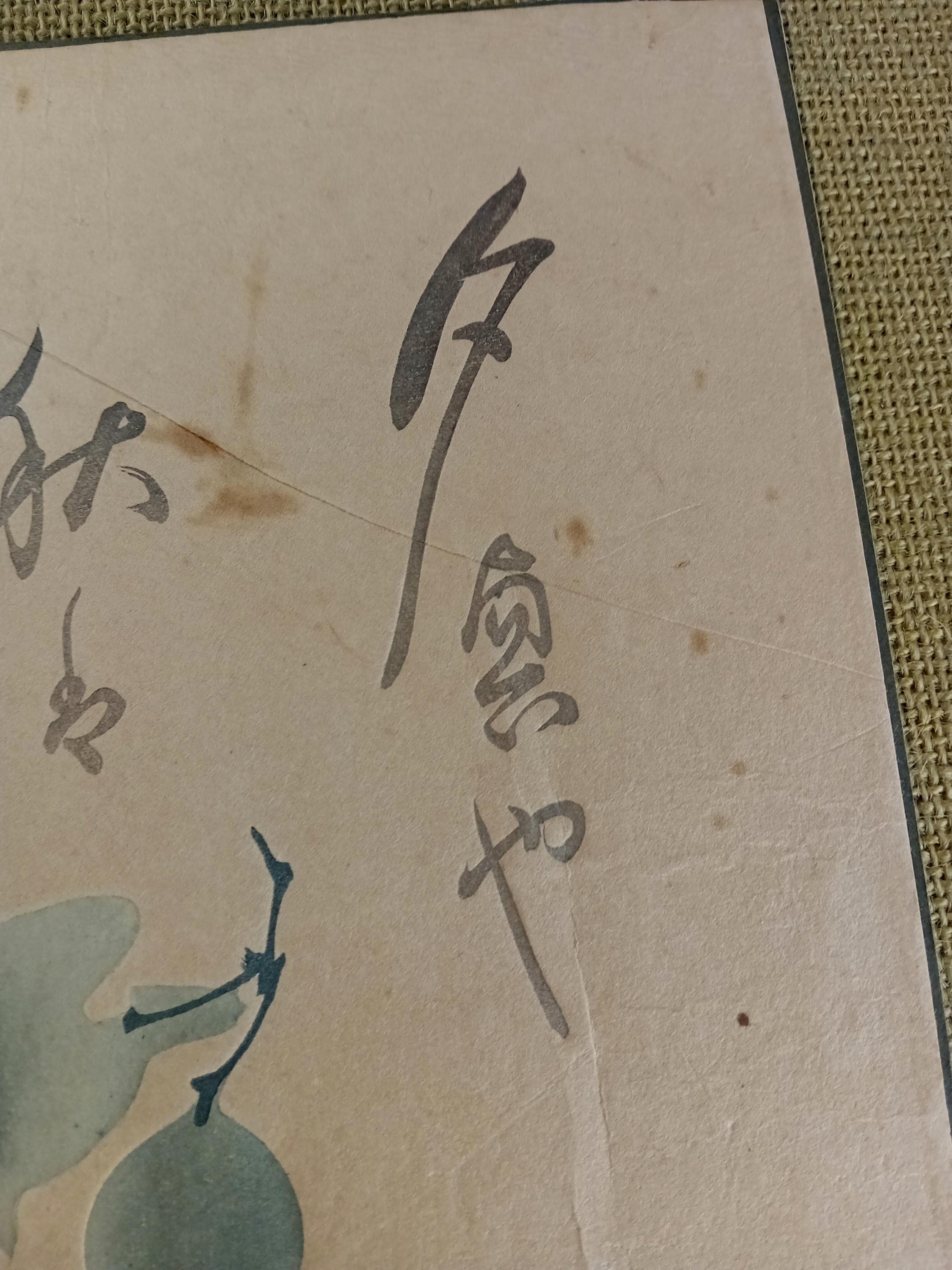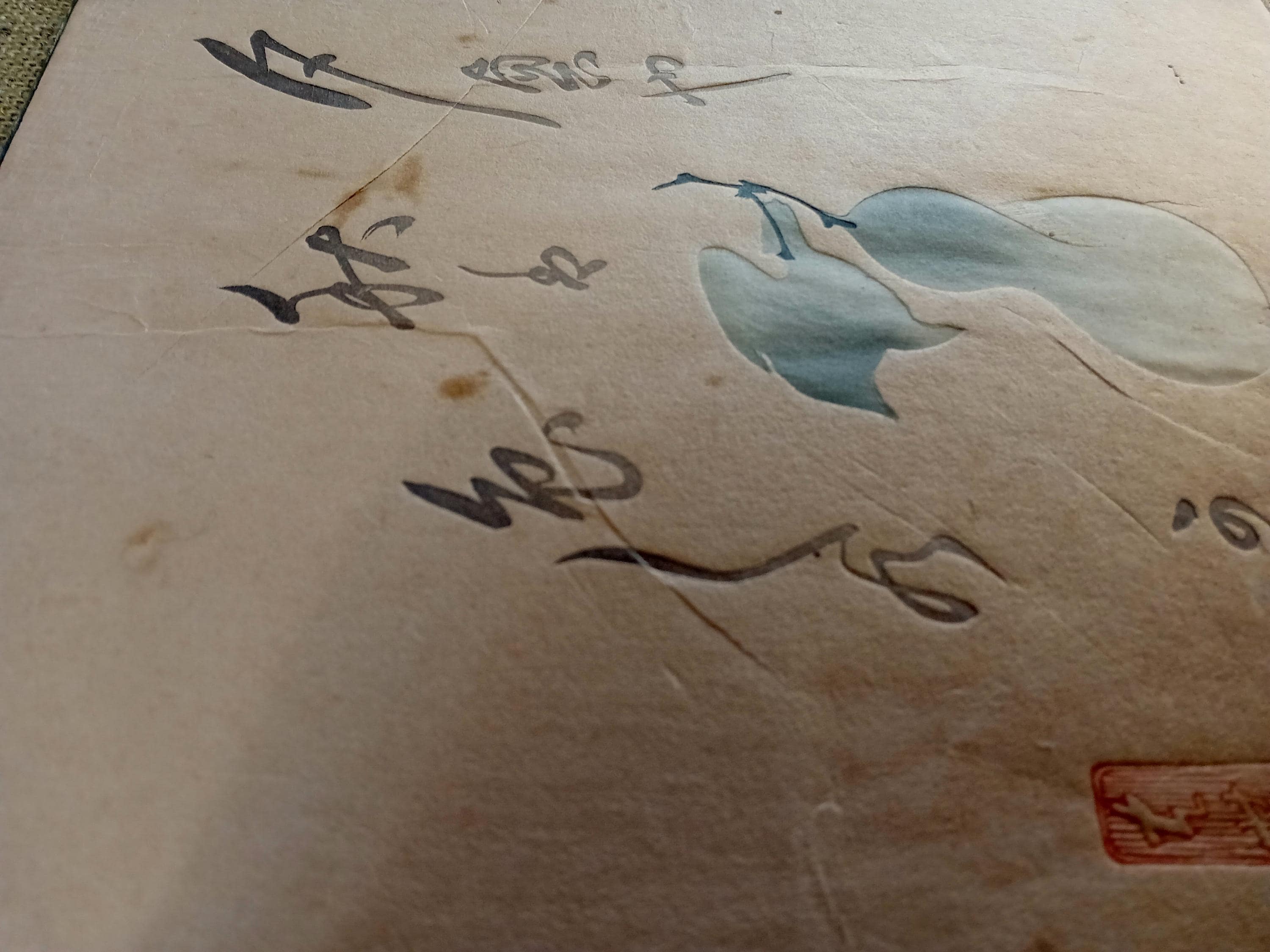 The character of the printed lines and the restrained colour passages indicate traditional woodblock printing. The later mounting on thin board follows a common preservation practice for small graphic sheets. The spontaneous quality of the calligraphy and the concise composition correspond to the surimono tradition, where visual balance and poetic suggestion were central.