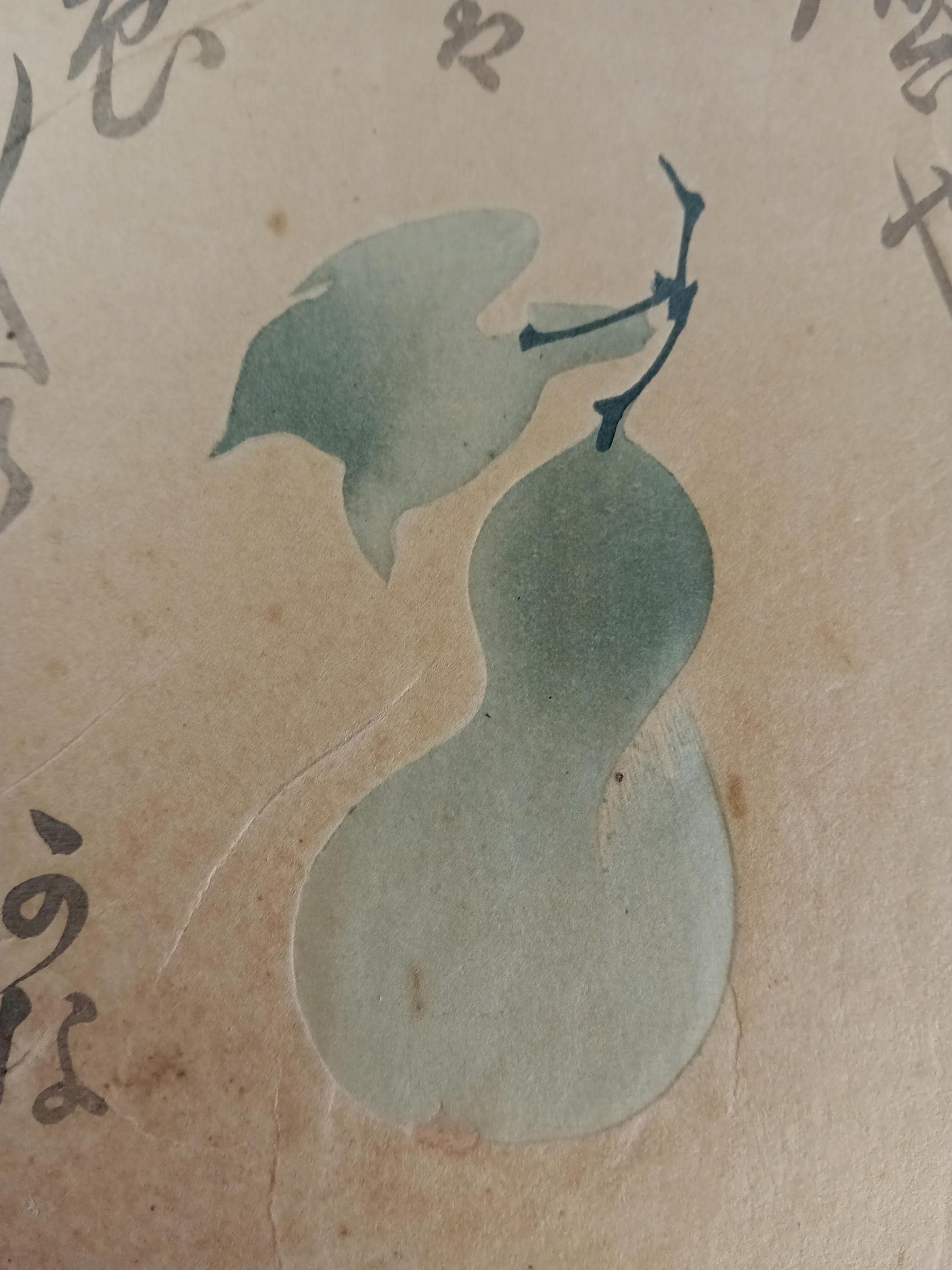 The composition depicts a bottle gourd with a leaf, accompanied by a short calligraphic inscription written in a free semi-cursive manner. Such prints combined image and text and circulated as private gifts, seasonal exchanges, or personal artistic expressions rather than commercial publications.