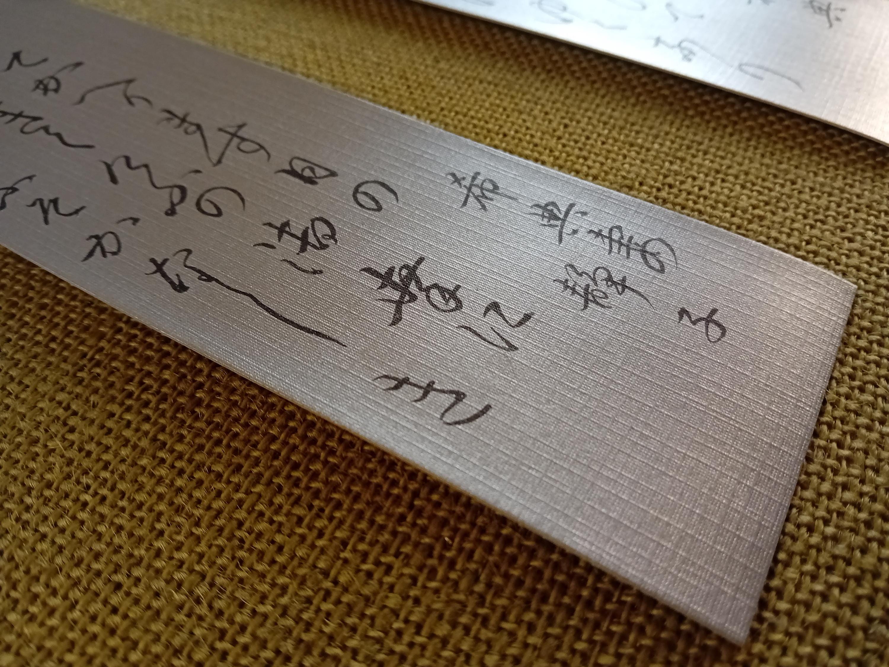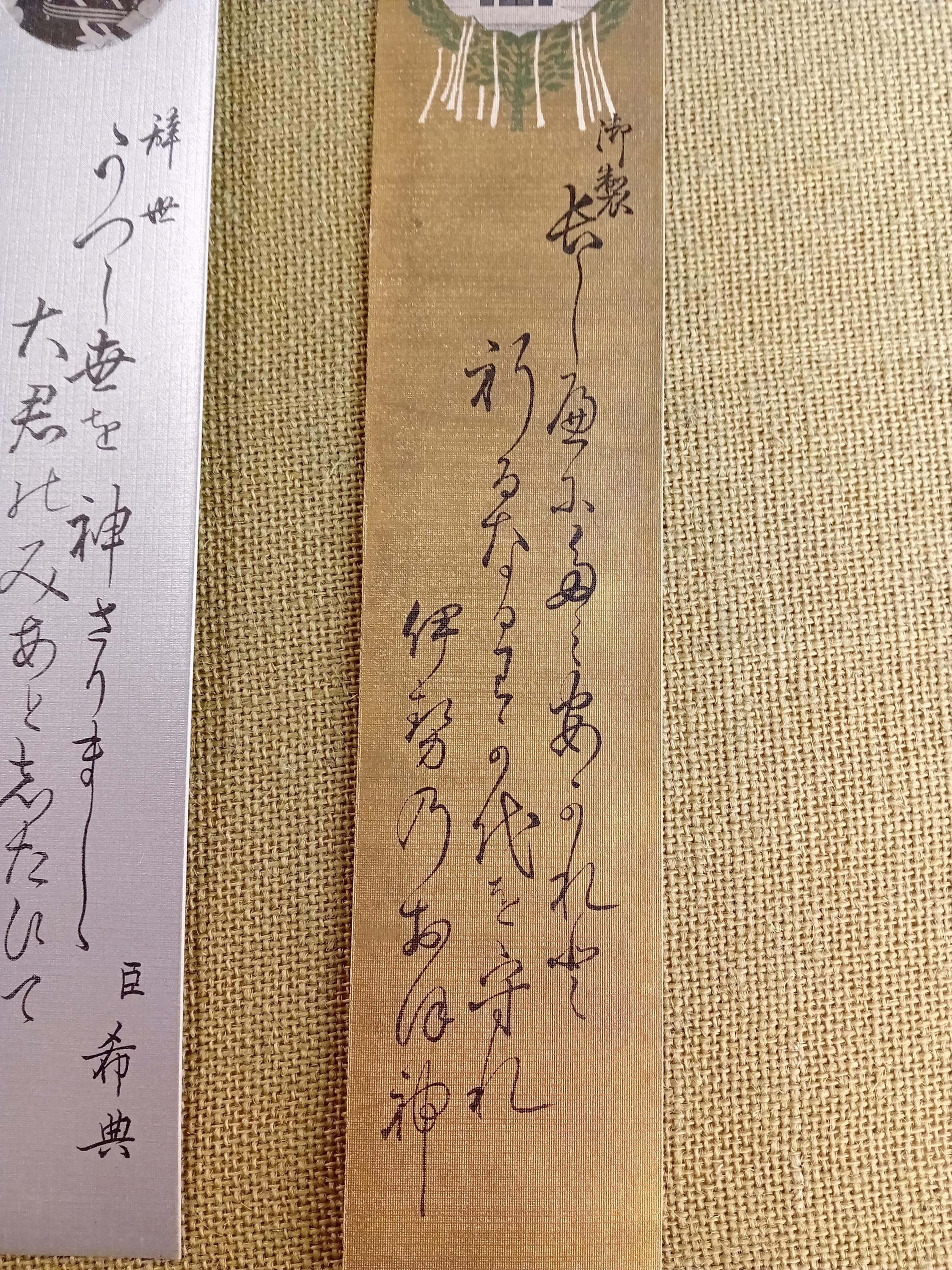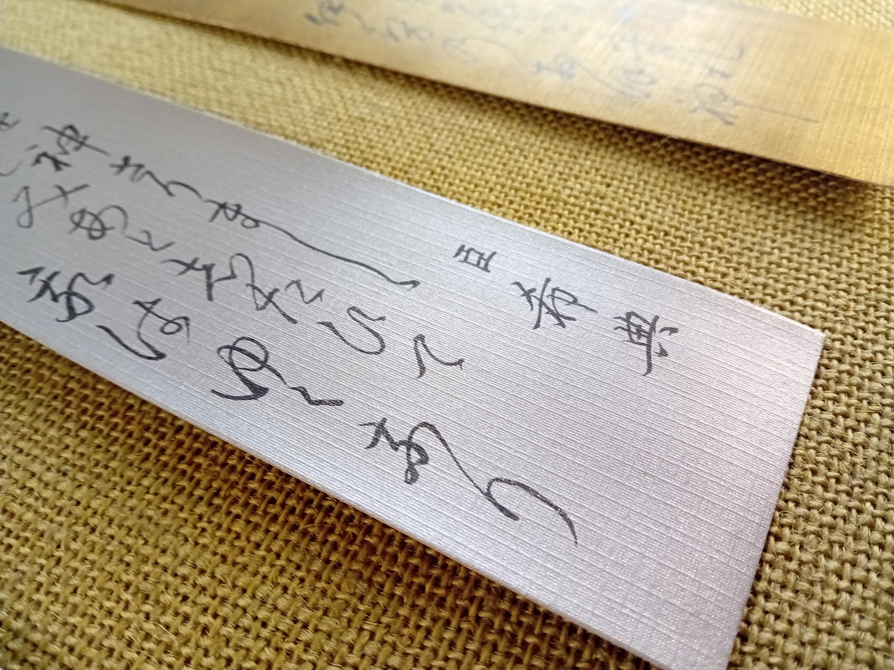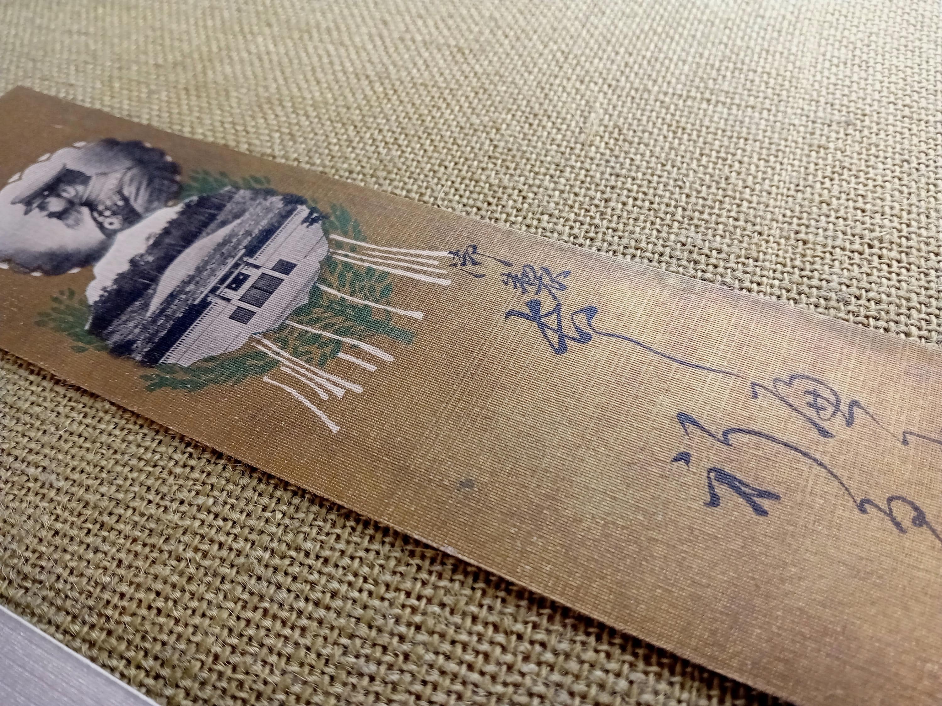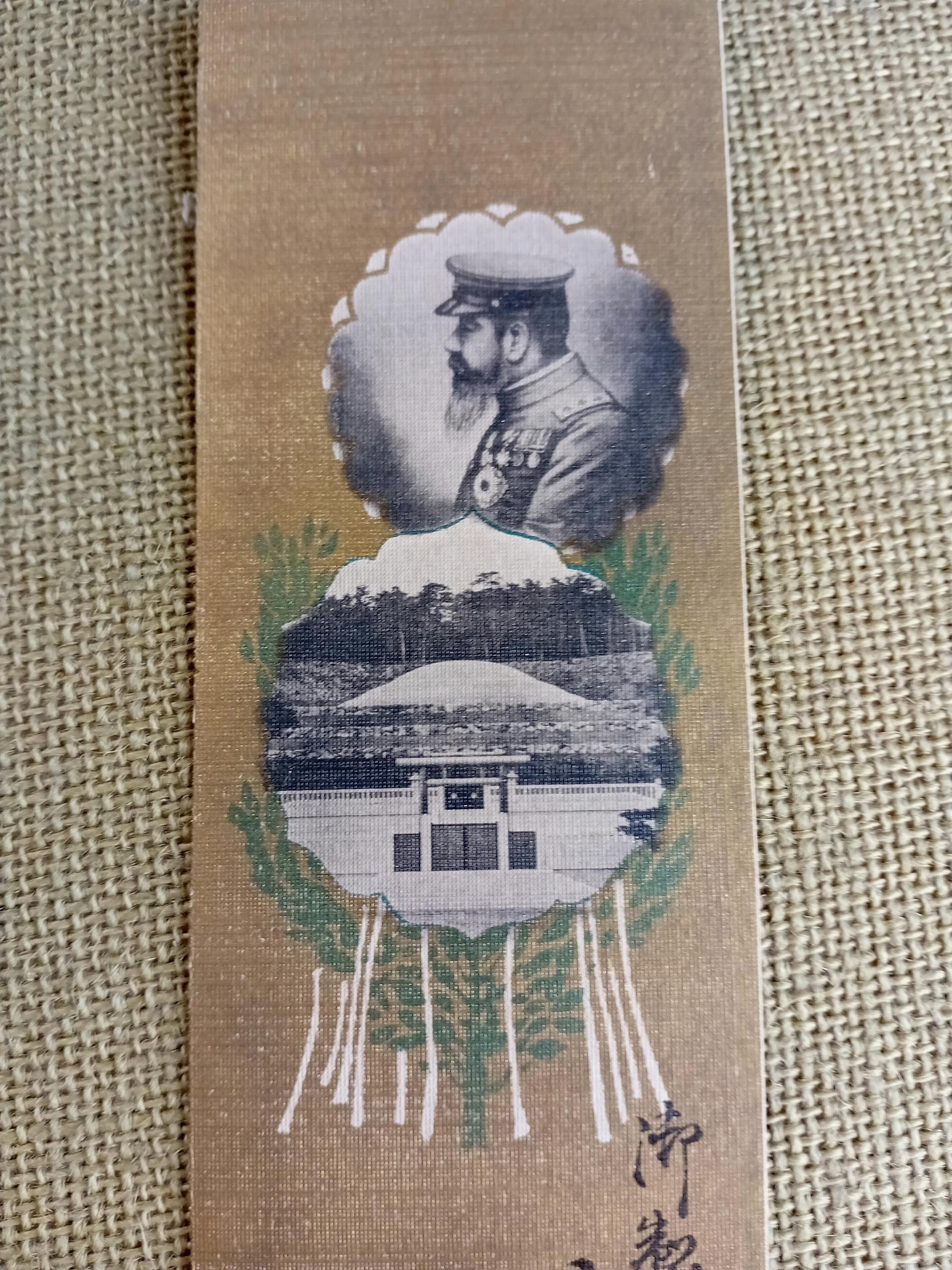 • Emperor Meiji (Mutsuhito, 明治天皇 / 睦仁) — gold-toned tanzaku with a printed portrait based on well-known official images of the Meiji Emperor.