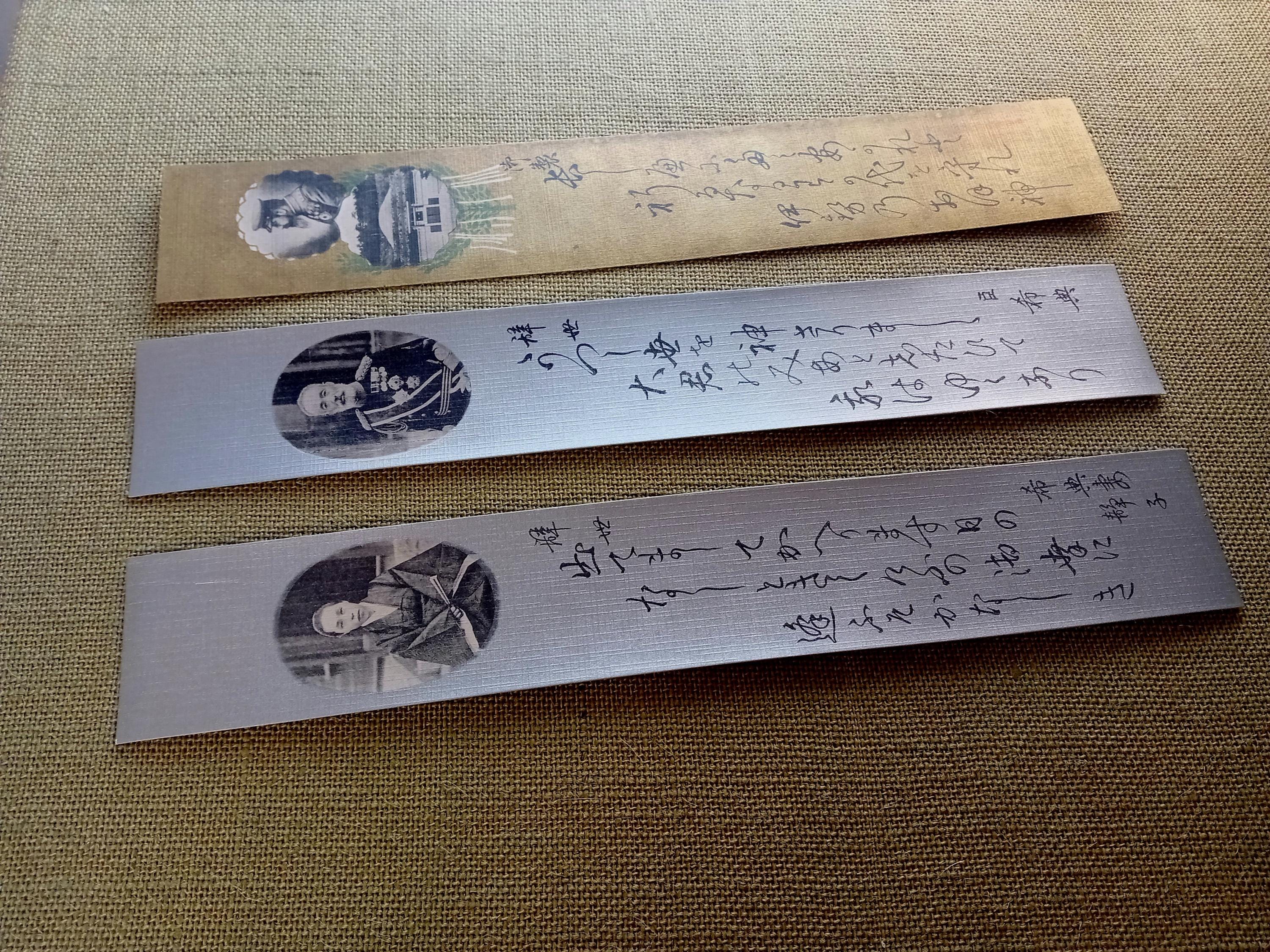 This group consists of three narrow printed memorial cards in traditional tanzaku format, made on decorative metallic paper (silver and gold tones). The set presents three historically documented figures closely associated with the moral and cultural memory of modern Japan: