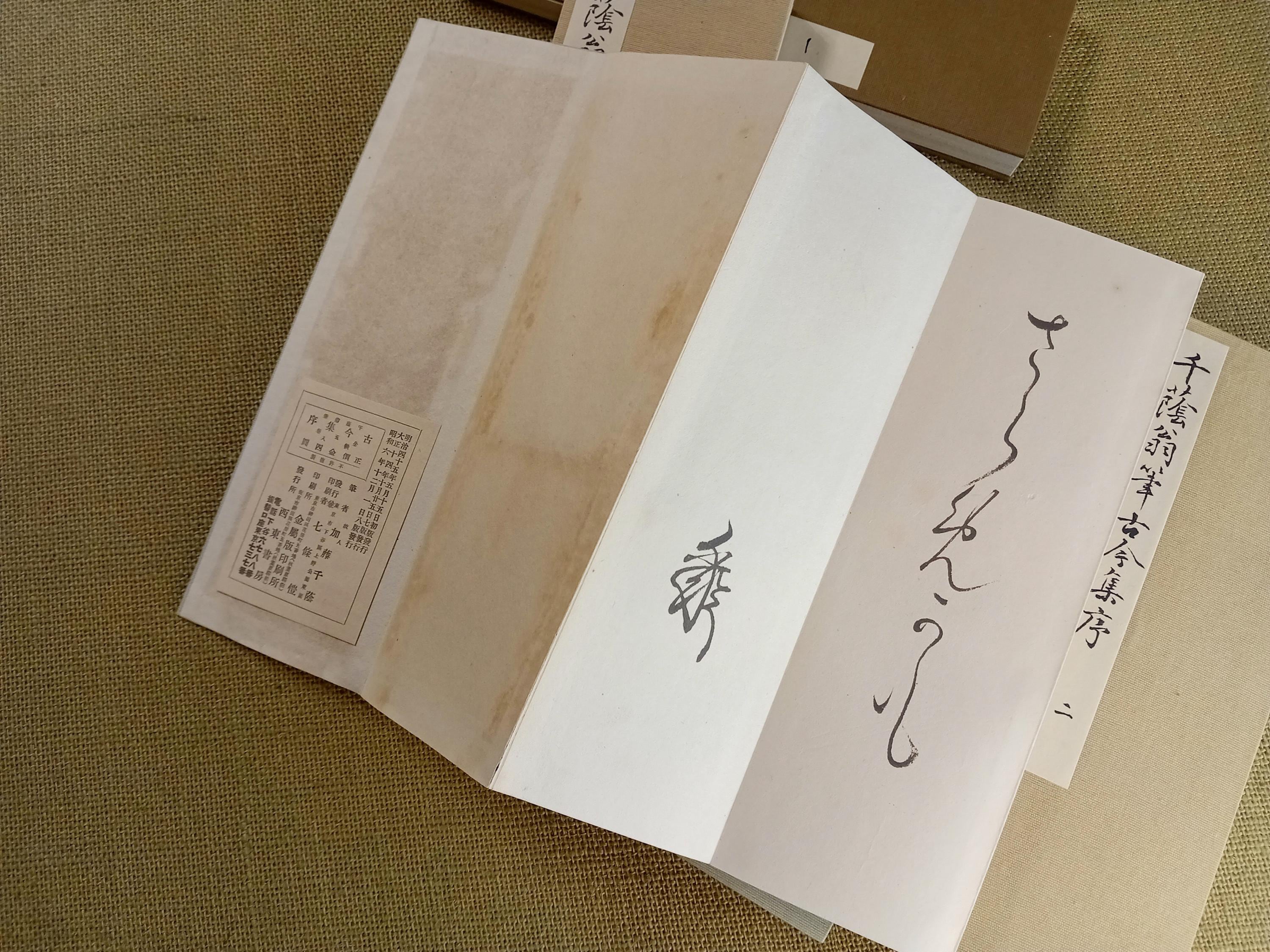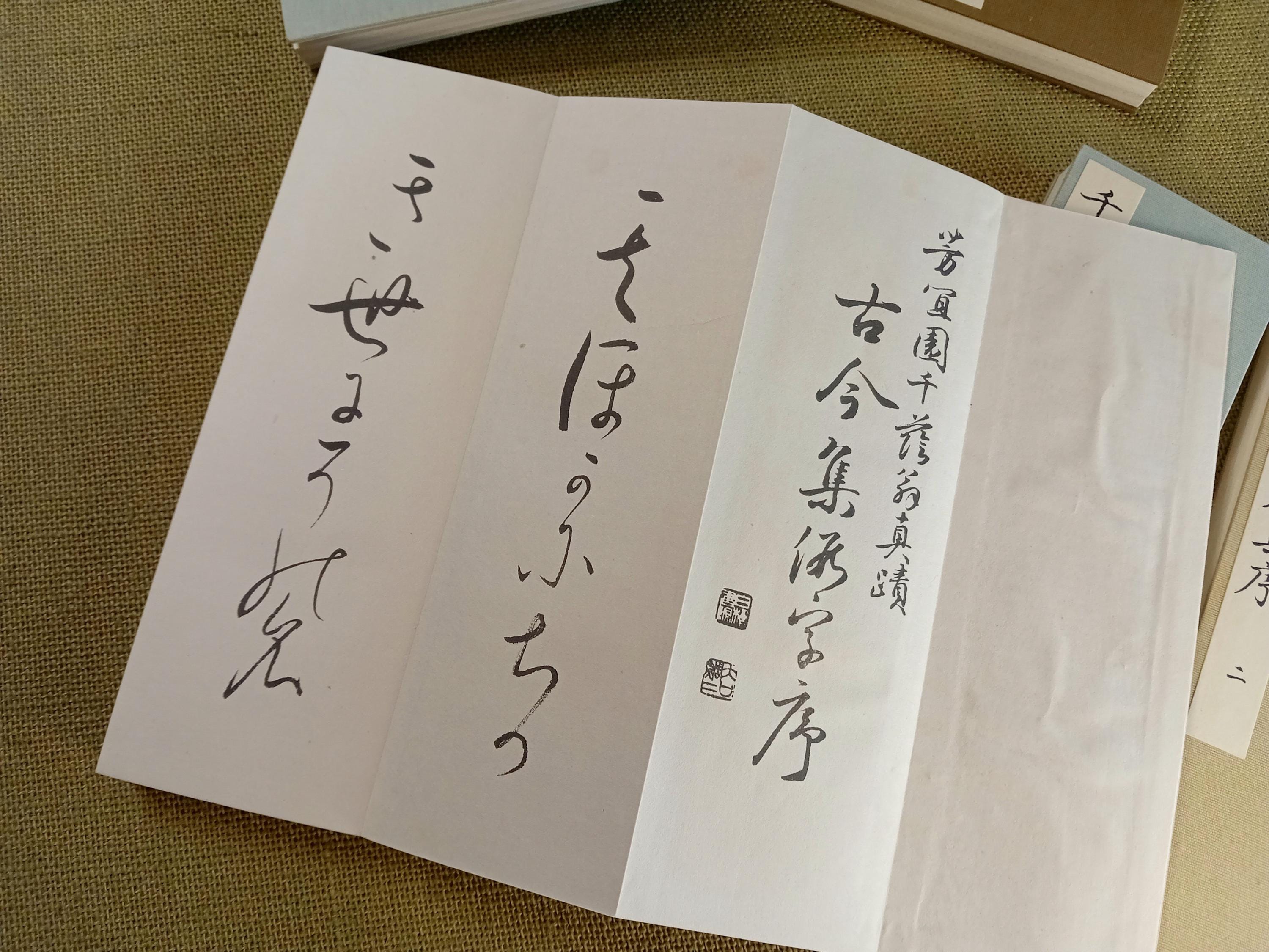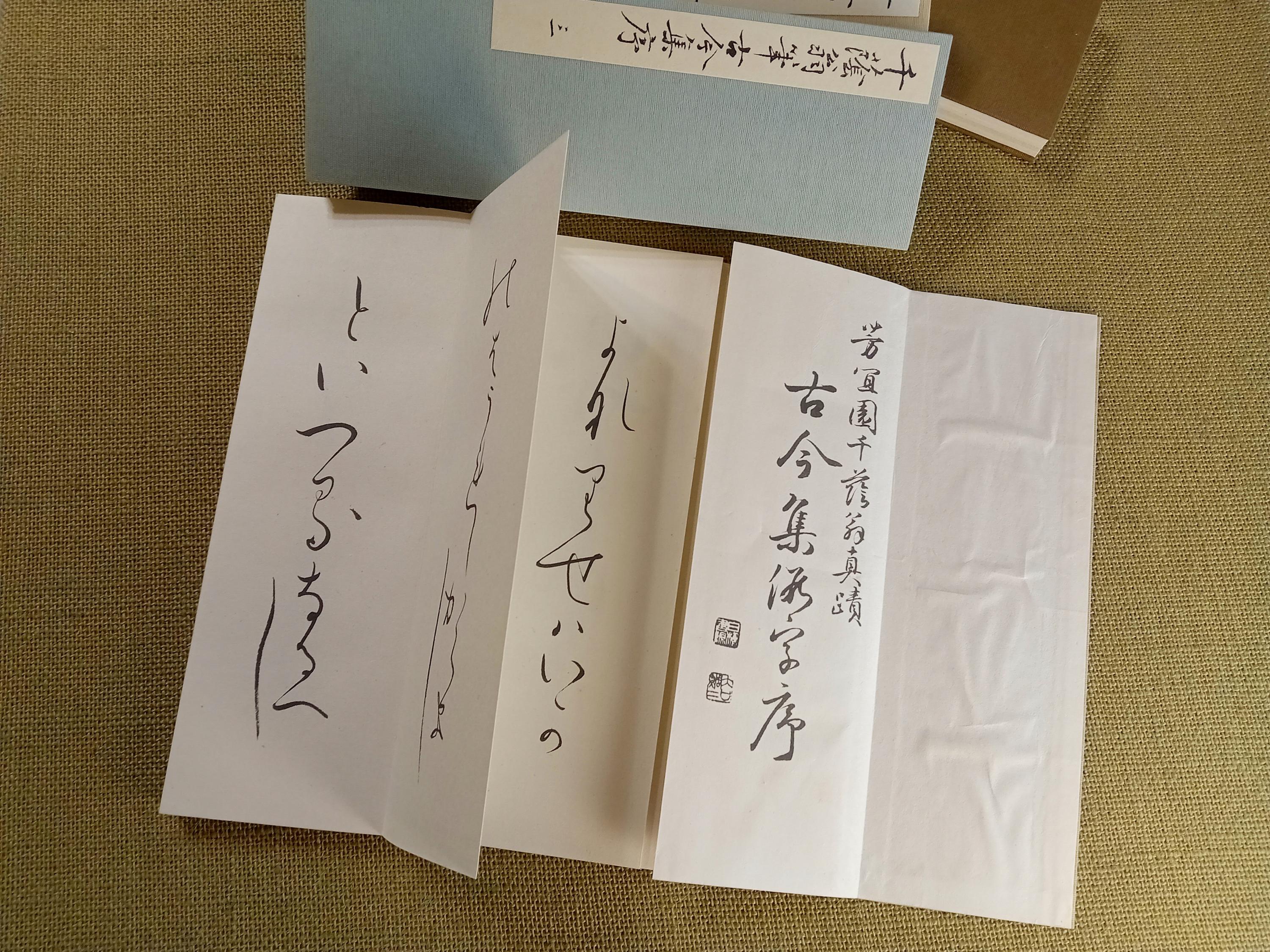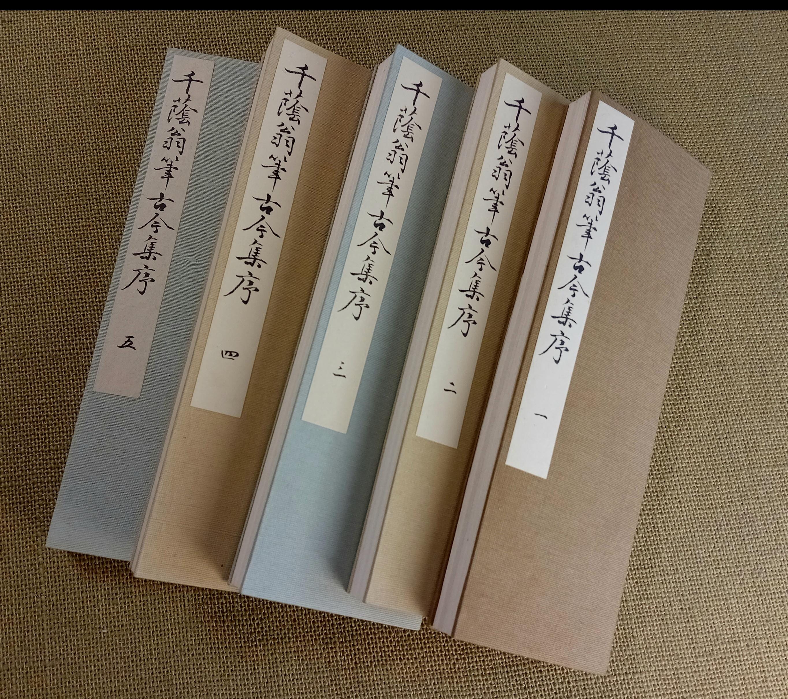 This five-volume set represents a classical calligraphy model of the kana preface to Kokin Wakashū, traditionally used for the study and transmission of Japanese kana script.