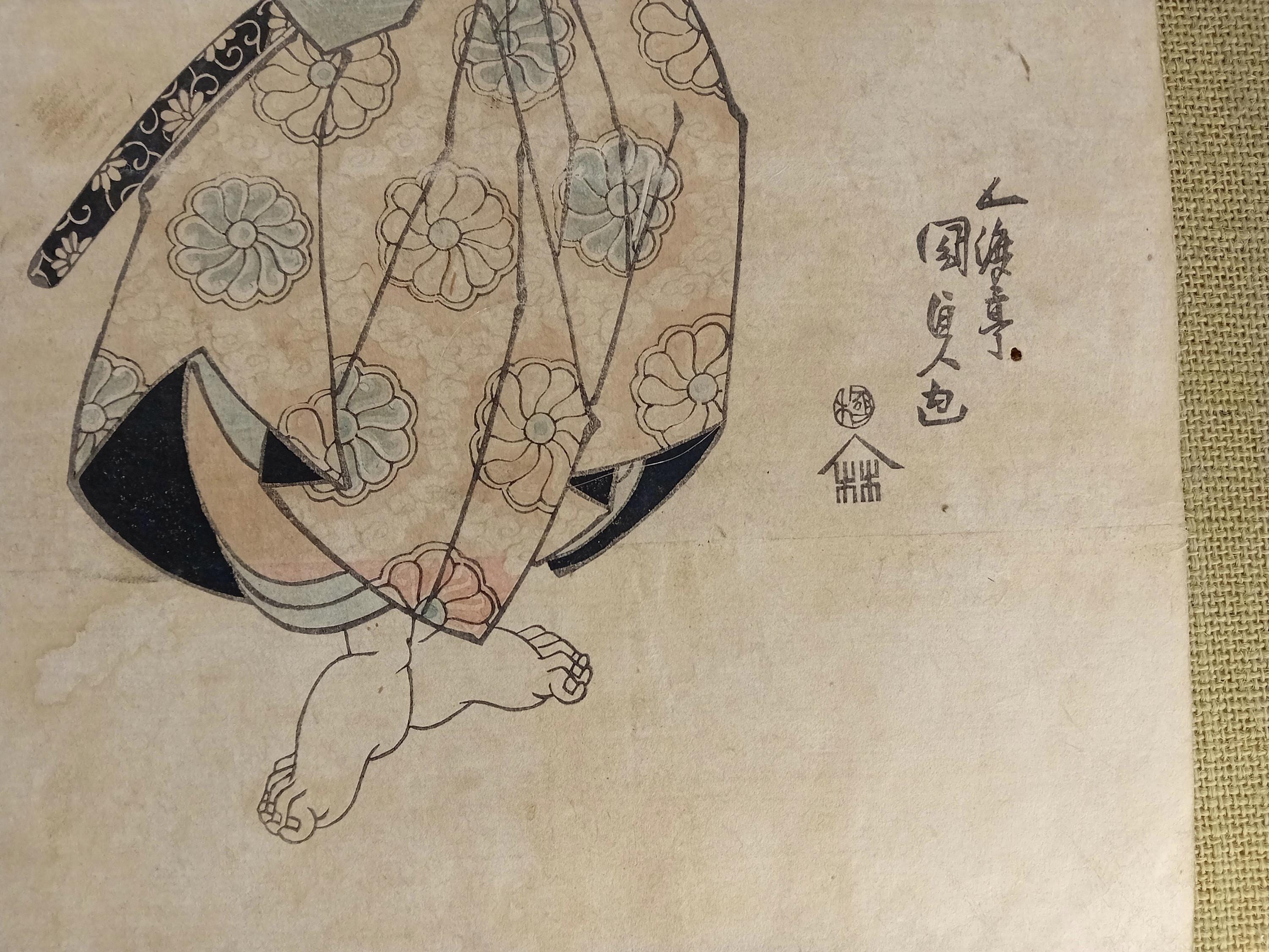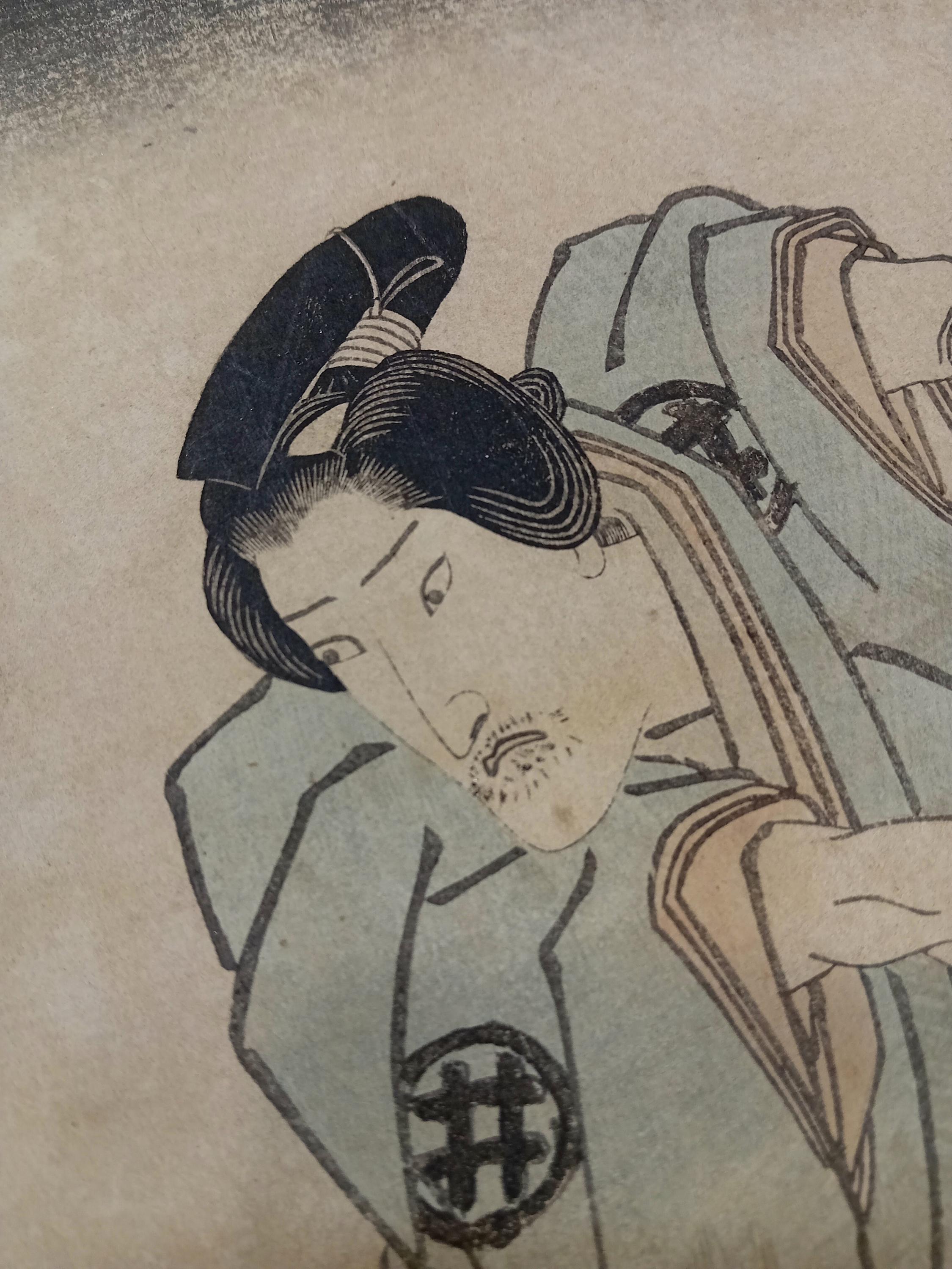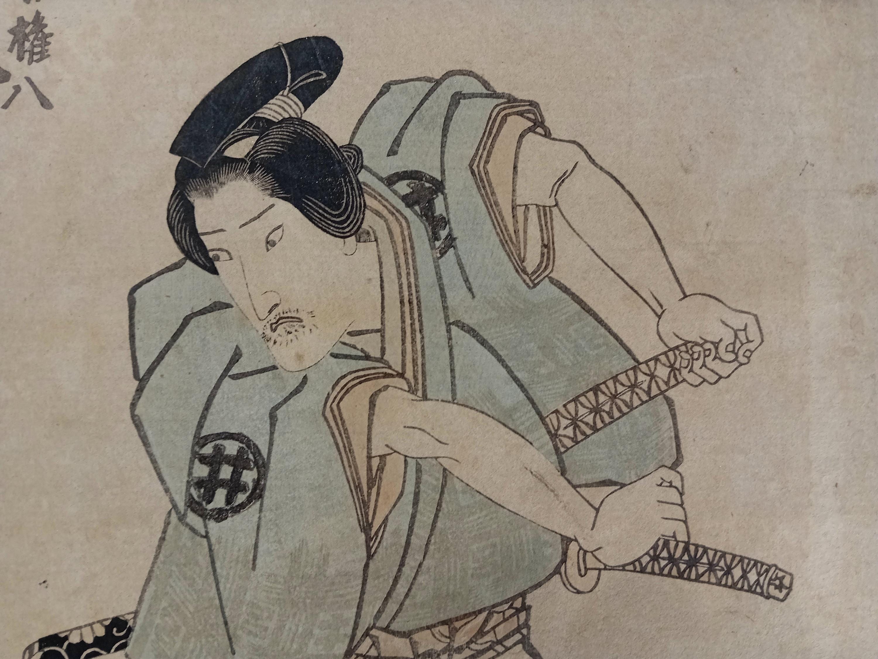 Antique Japanese woodblock print depicting a samurai in a dynamic theatrical pose.