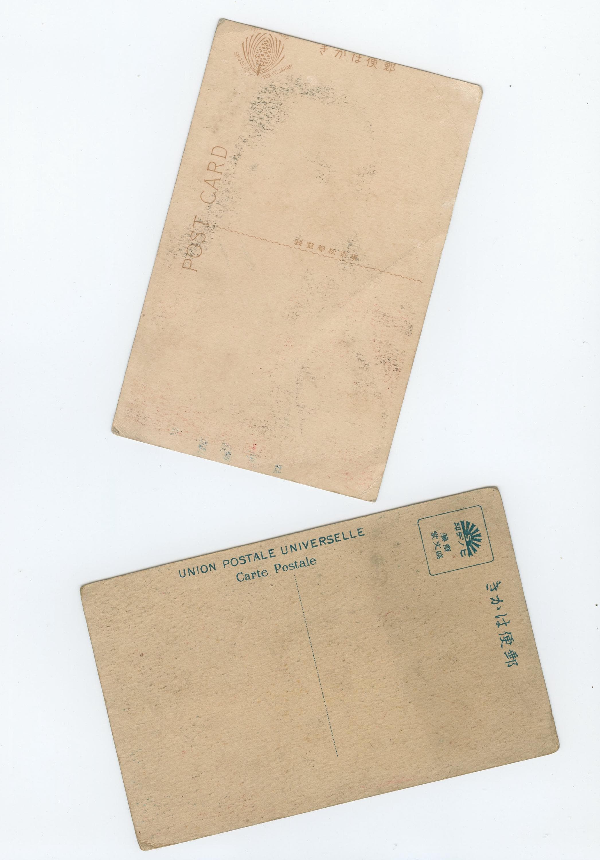 Both postcards were printed in Japan for domestic and international postal use and feature bilingual postcard backs.