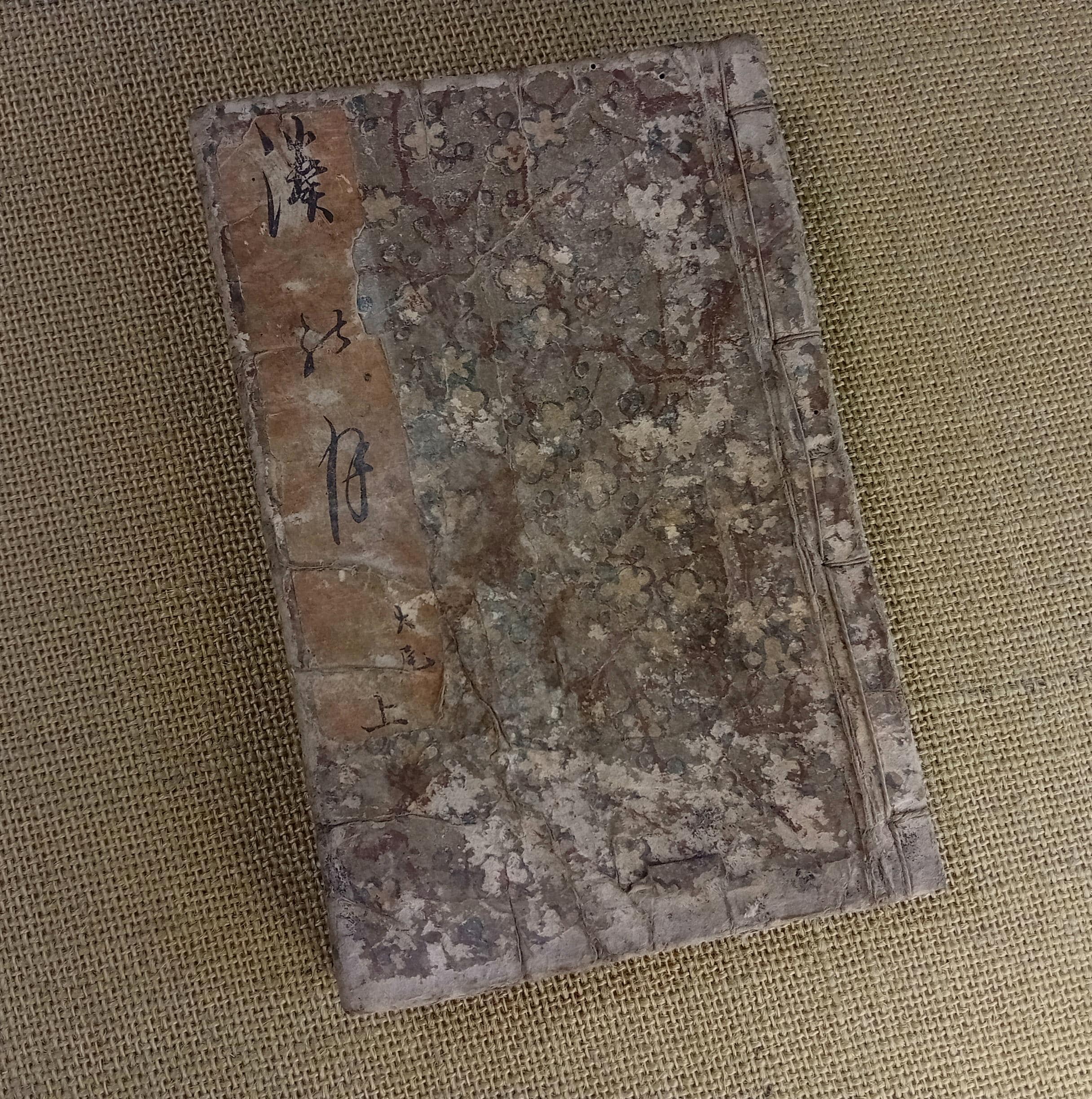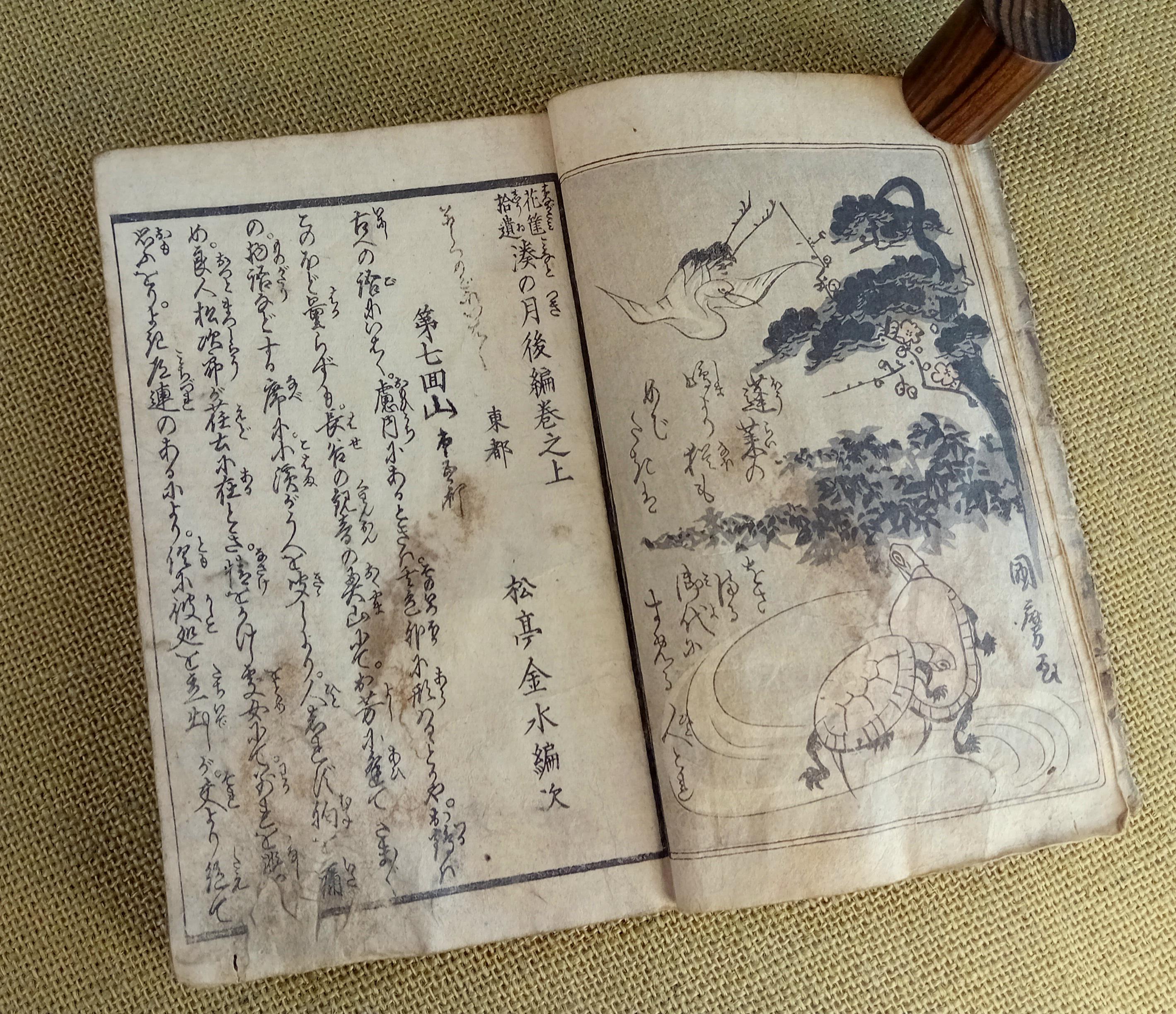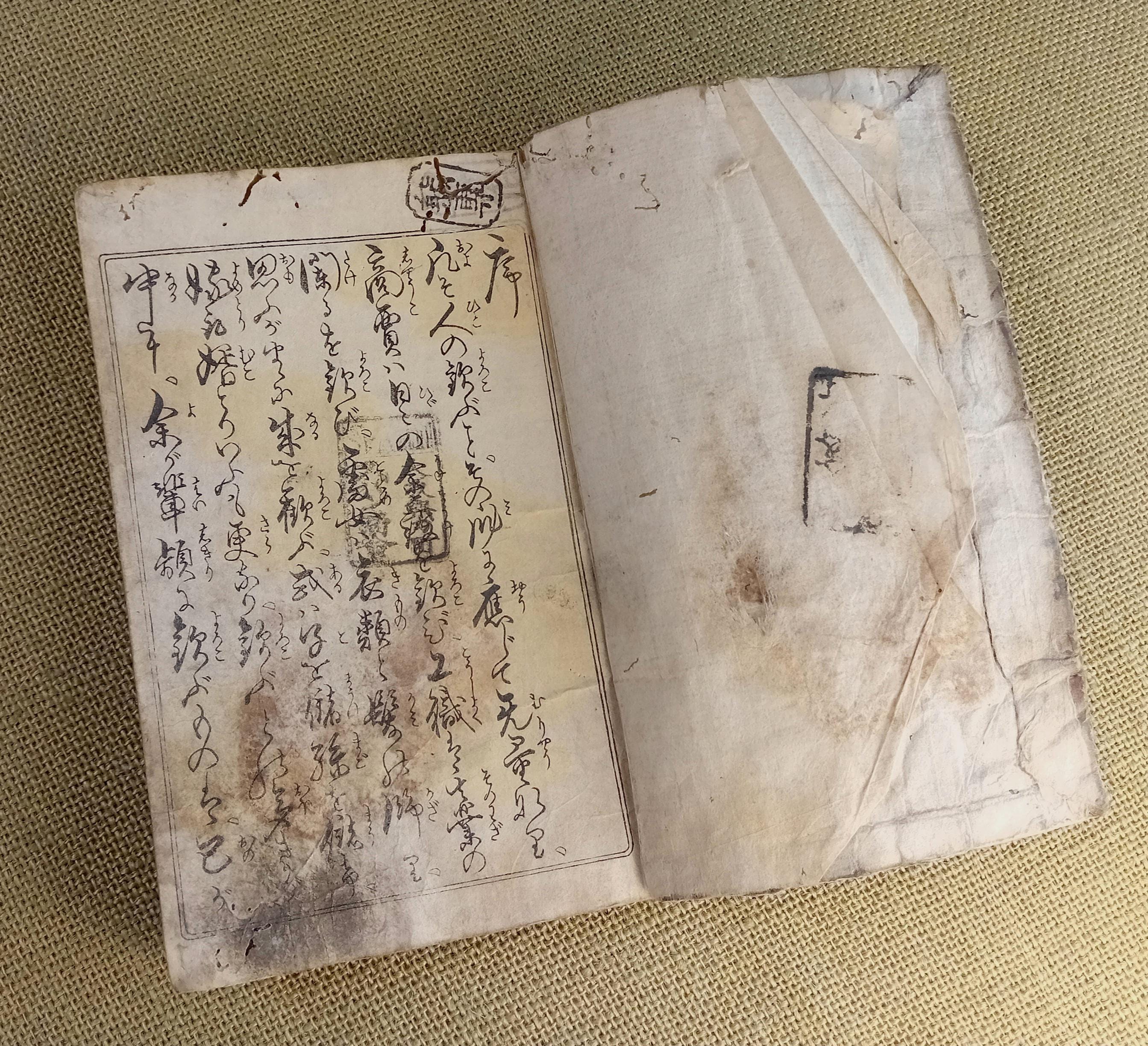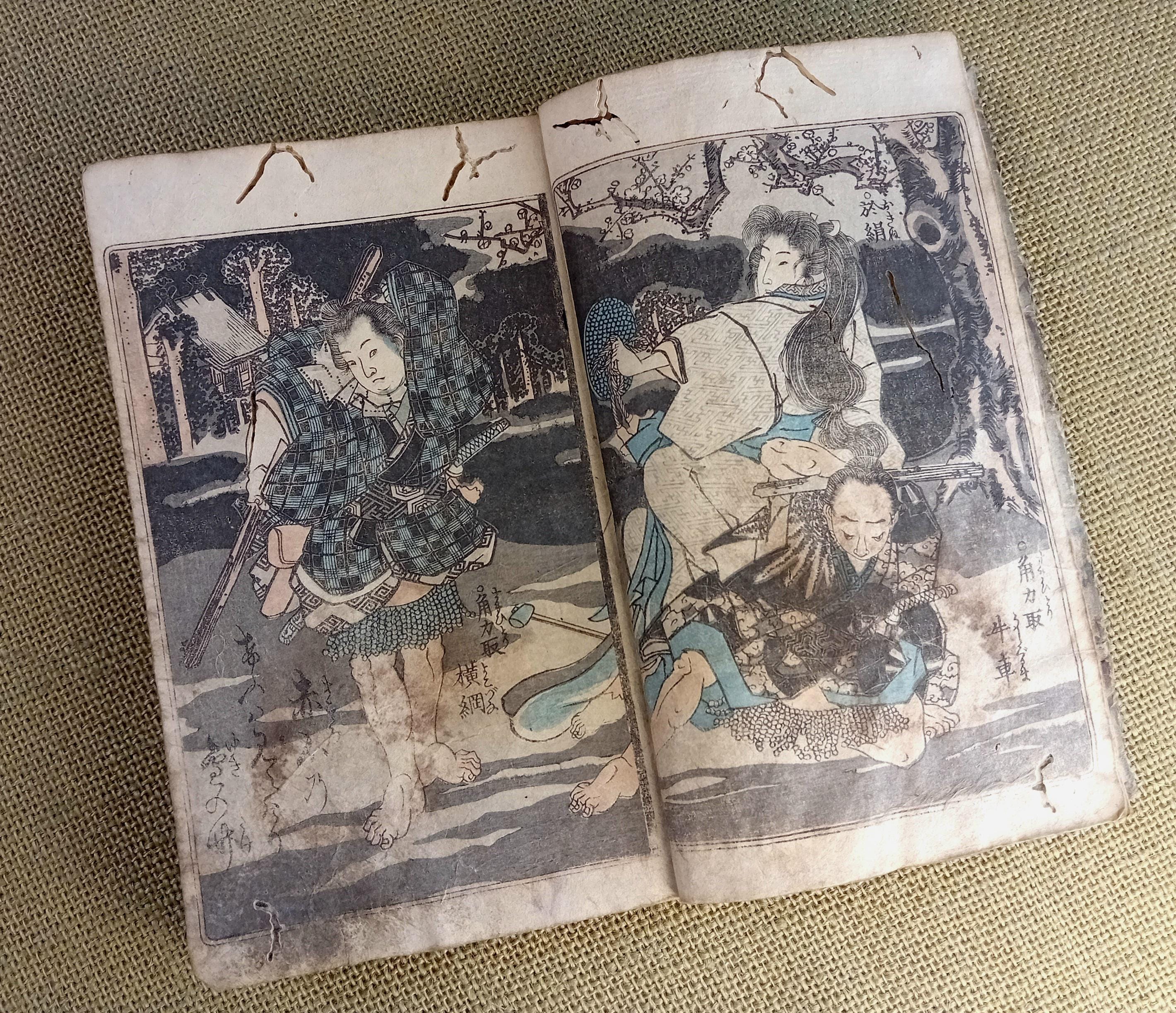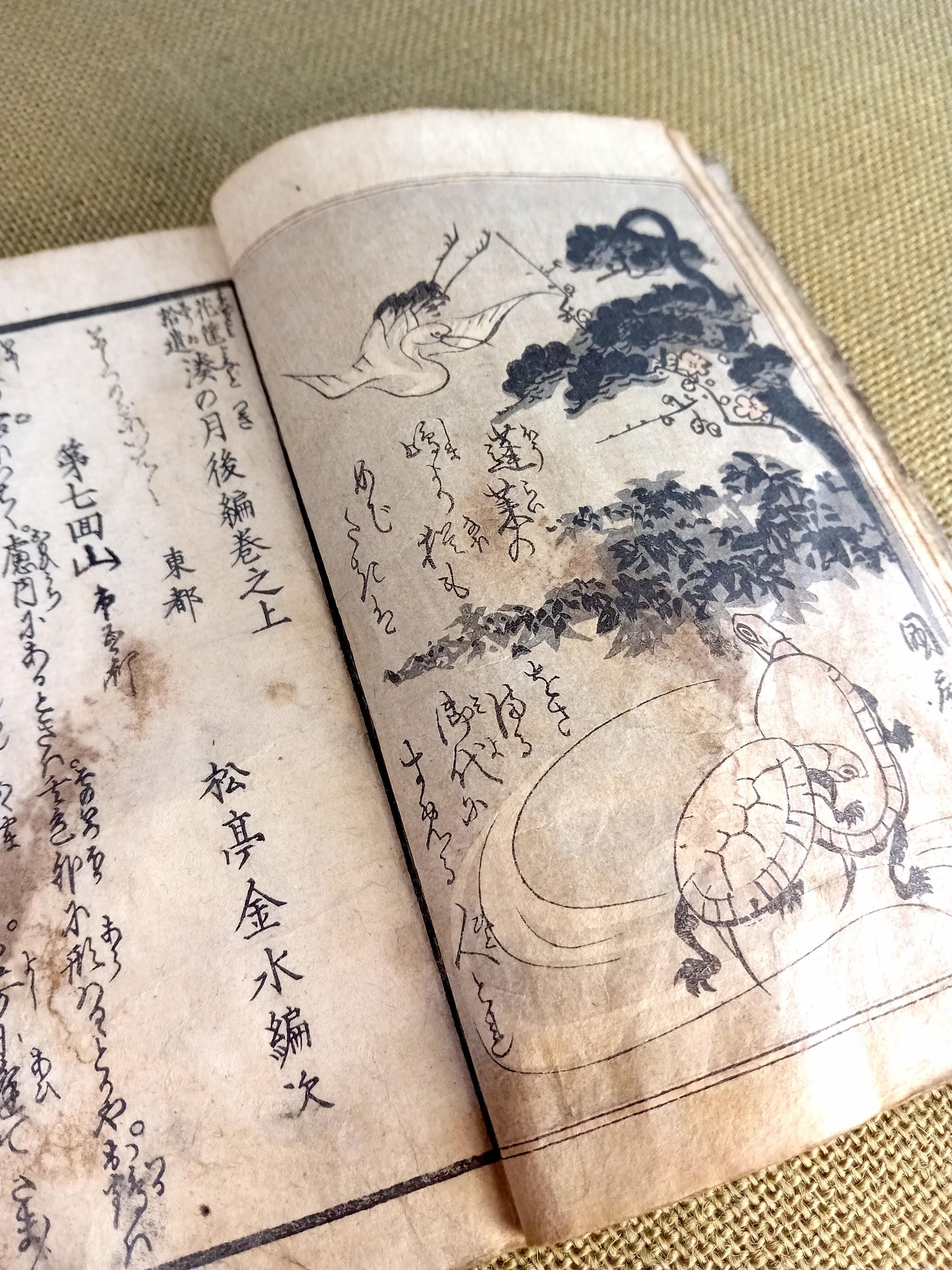 Antique condition. The book shows natural signs of age, including overall toning of the paper, localized traces of moisture exposure, damage to individual pages, and evidence of insect activity, consistent with the historical life of an authentic Edo-period woodblock-printed book.