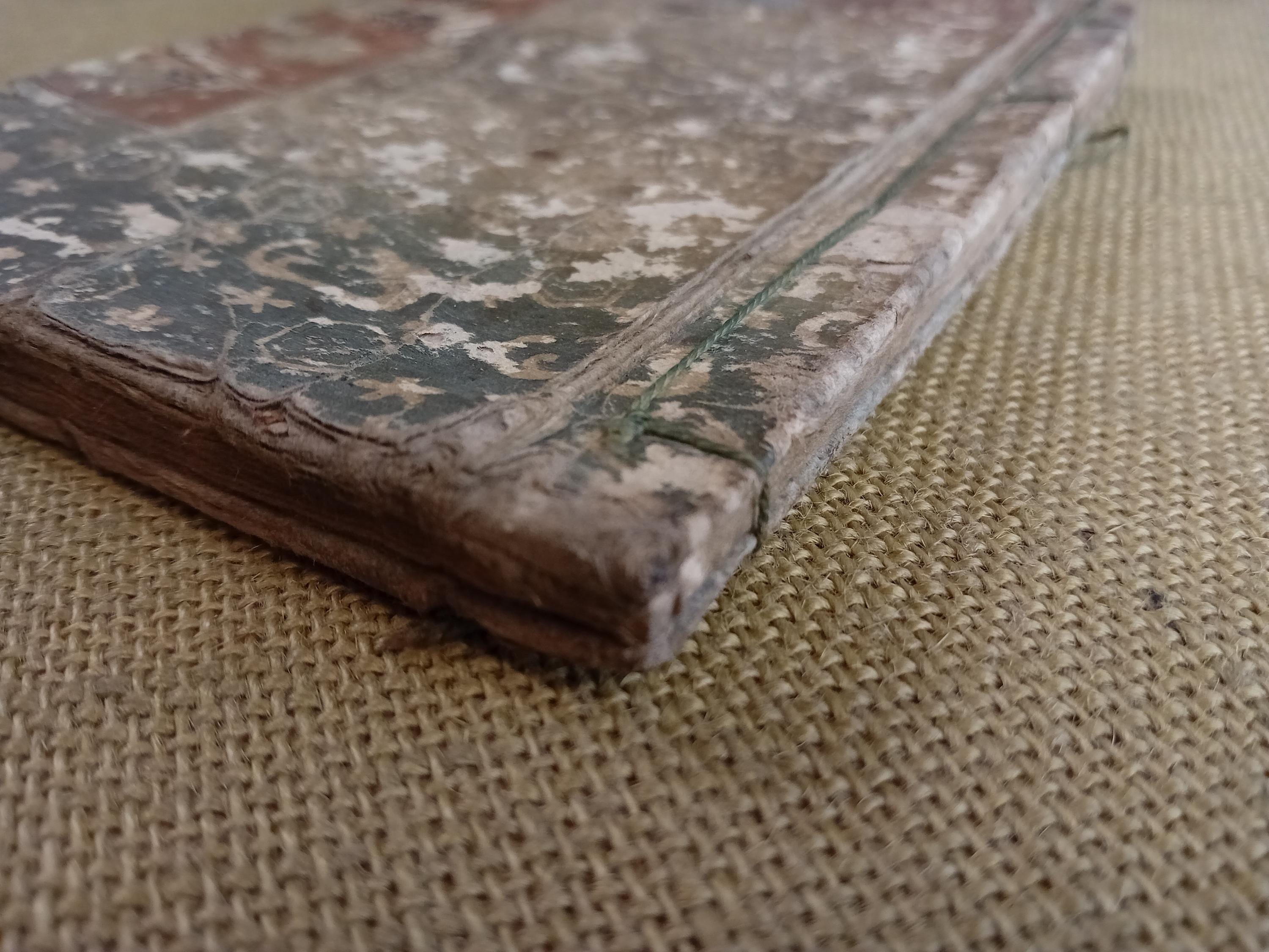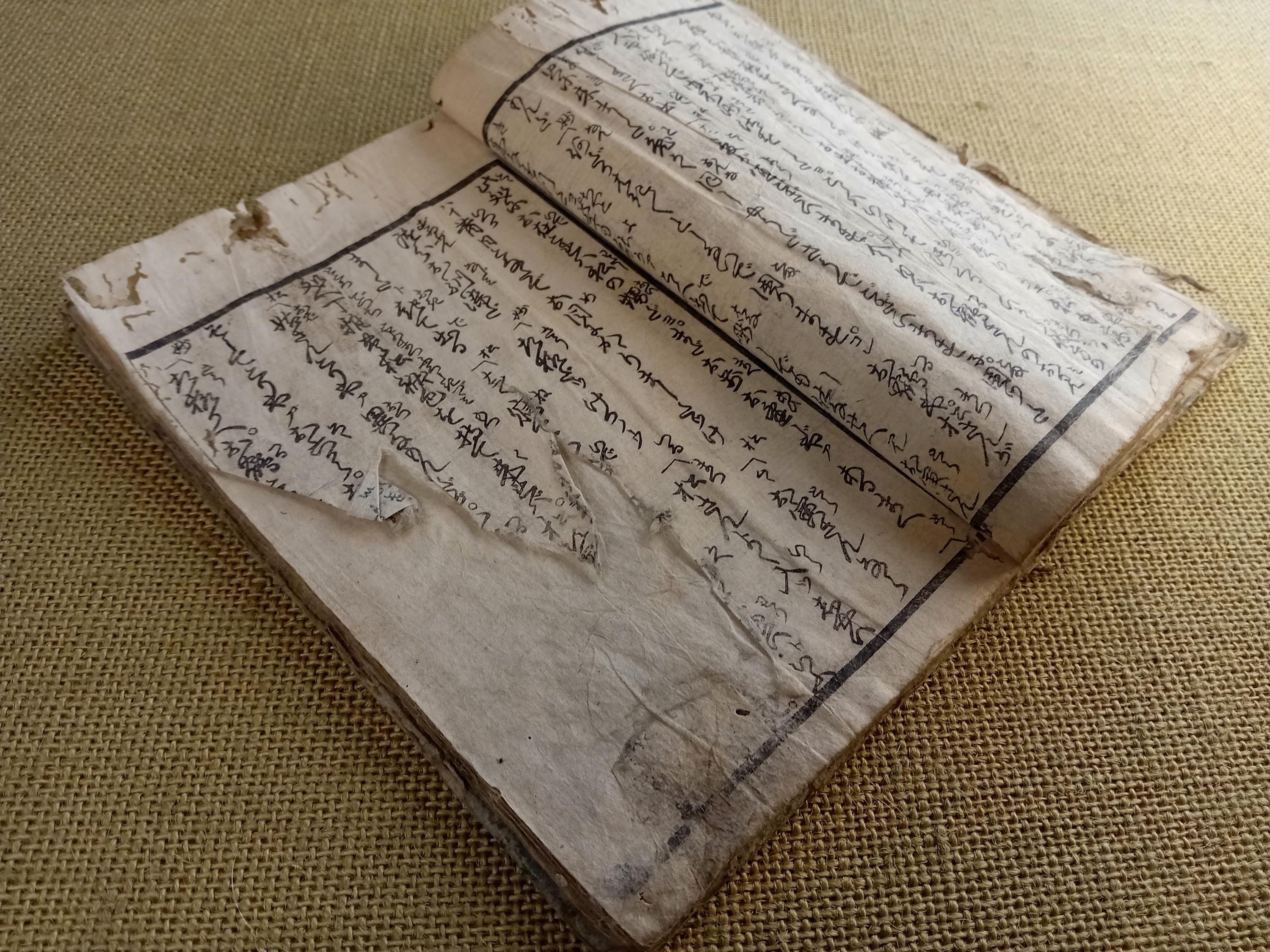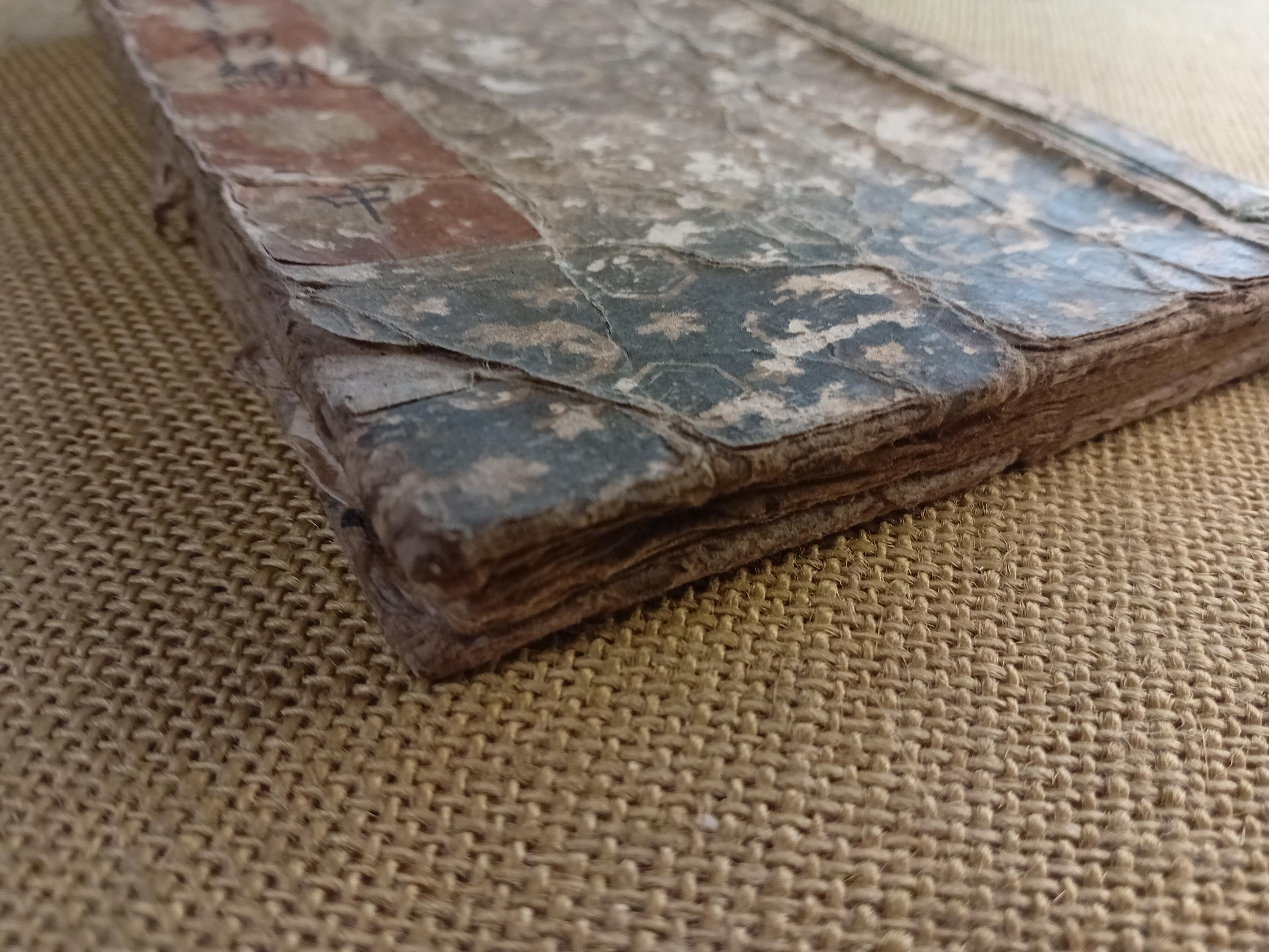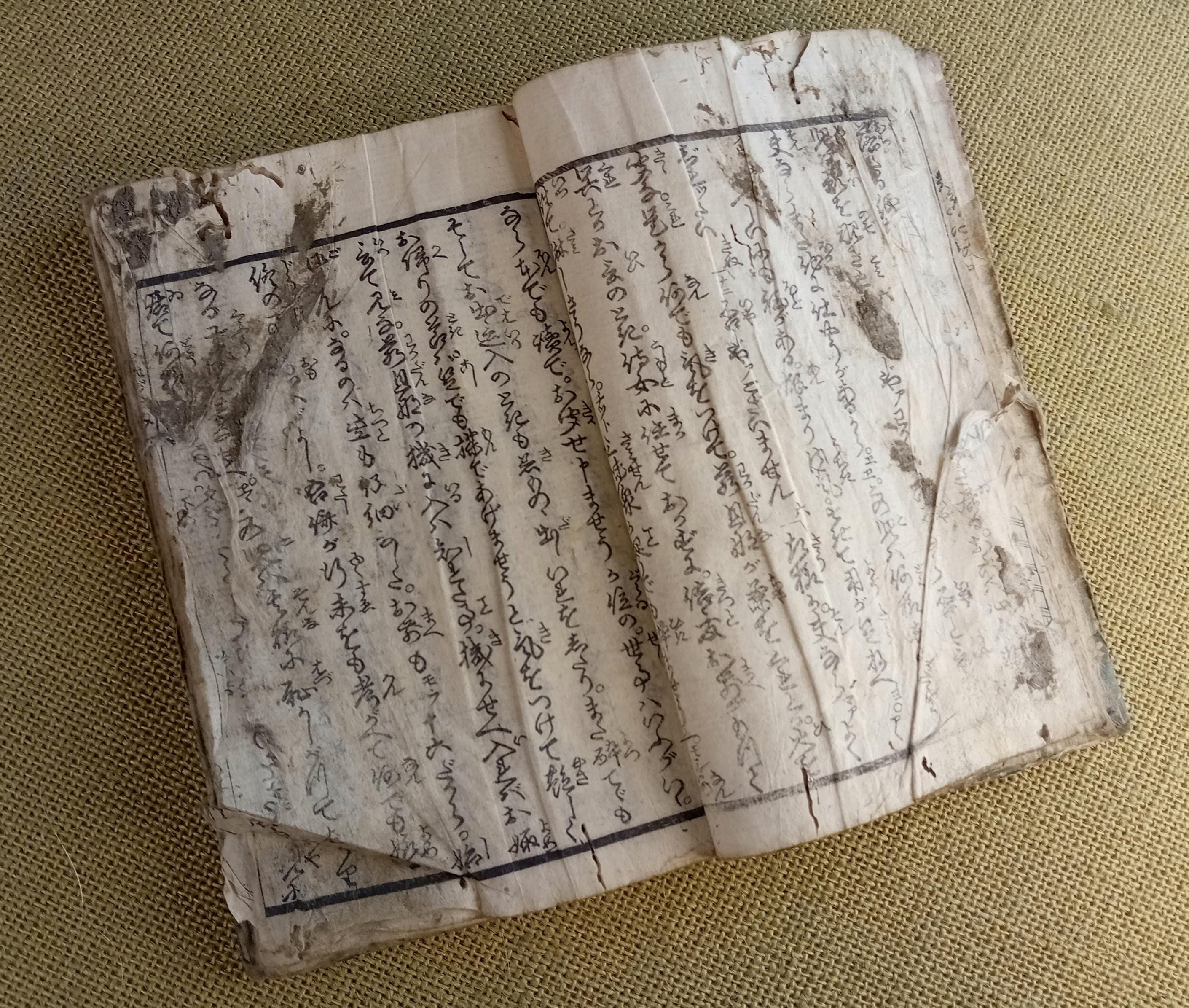 Antique condition. Natural signs of age are present, including paper toning, localized traces of moisture, damage to individual pages, and traces of insect activity, consistent with the historical use of an authentic Edo-period woodblock-printed book.