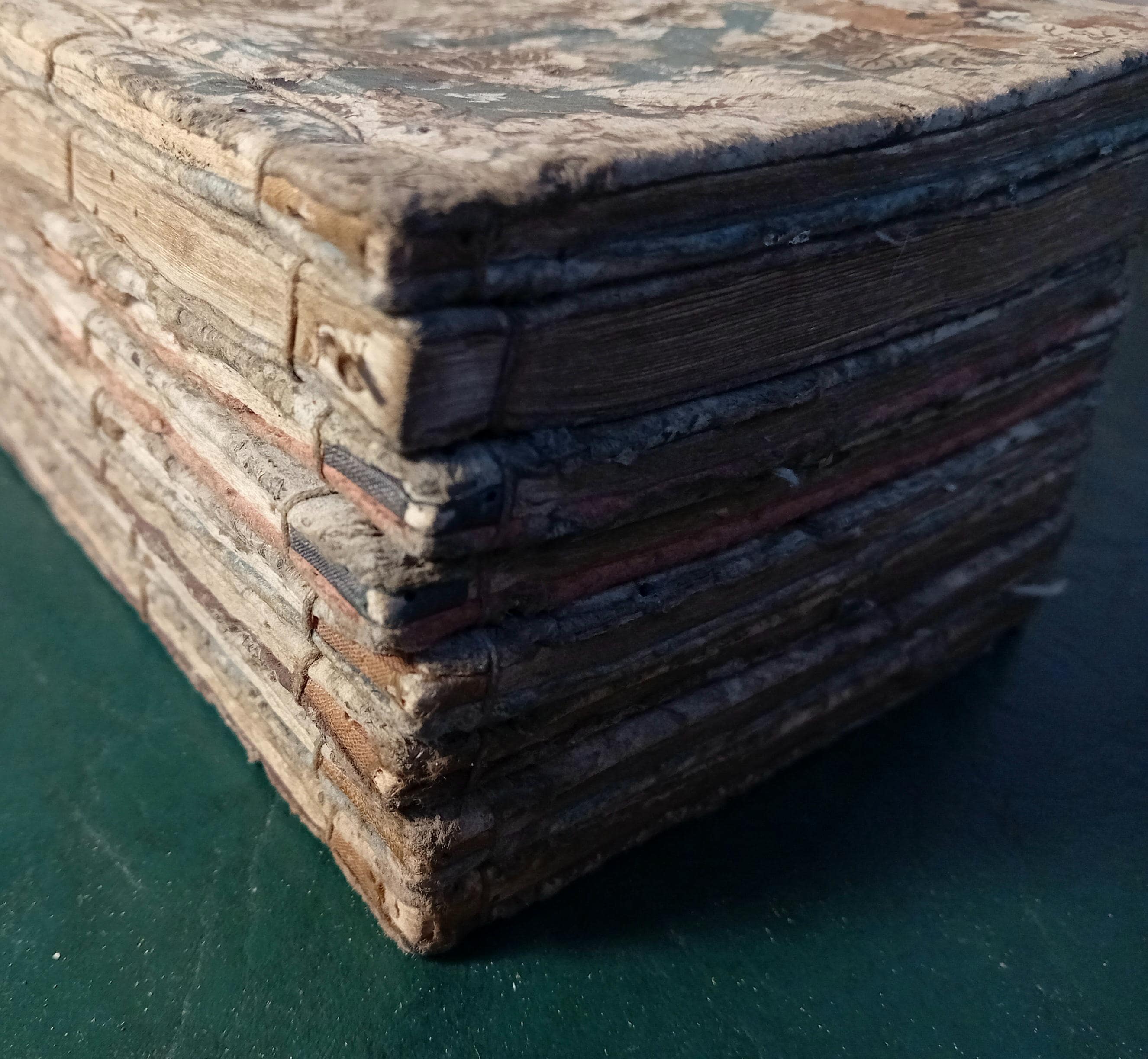 Condition: antique condition. The volumes show natural signs of age, including paper toning, surface wear, localized staining, damage to individual pages, and traces of insect activity. No modern restoration is observed.