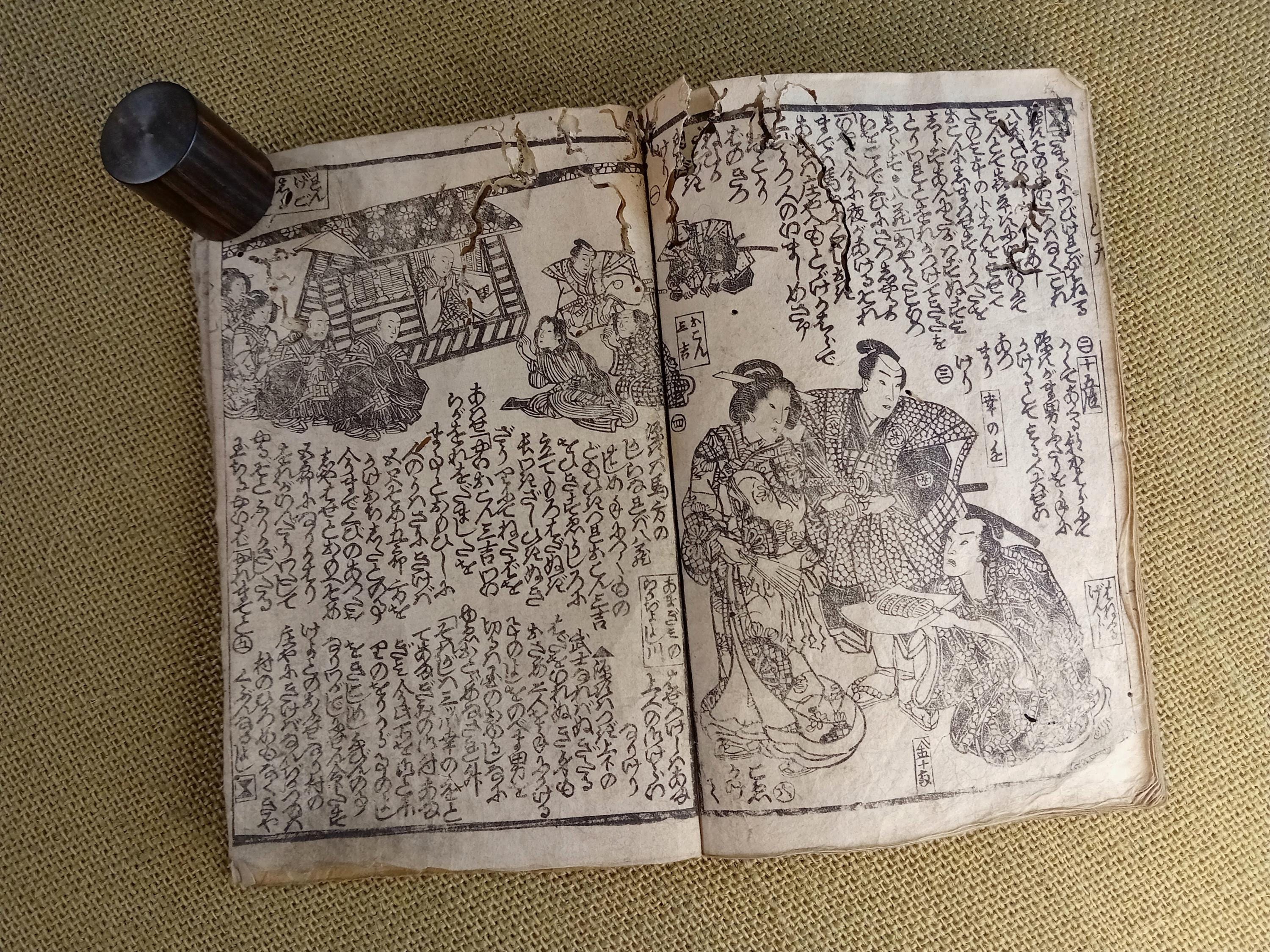 Antique Japanese illustrated woodblock book, Edo period, ninjobon, 1848–1854, Santō Kyōden, Toyokuni, Utagawa Kunisada, single volume