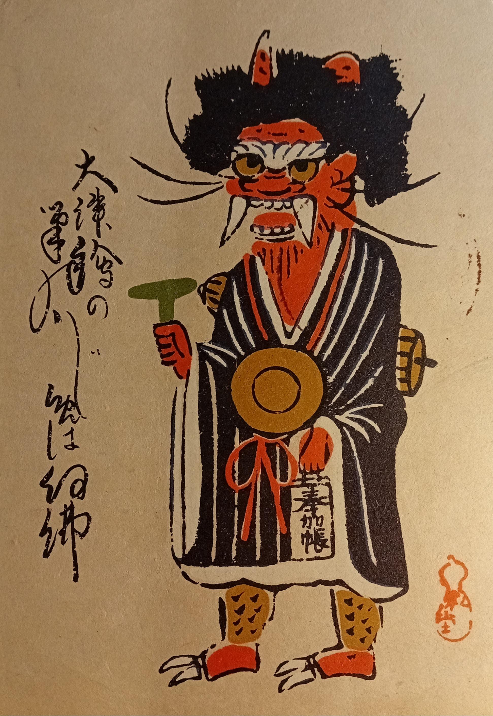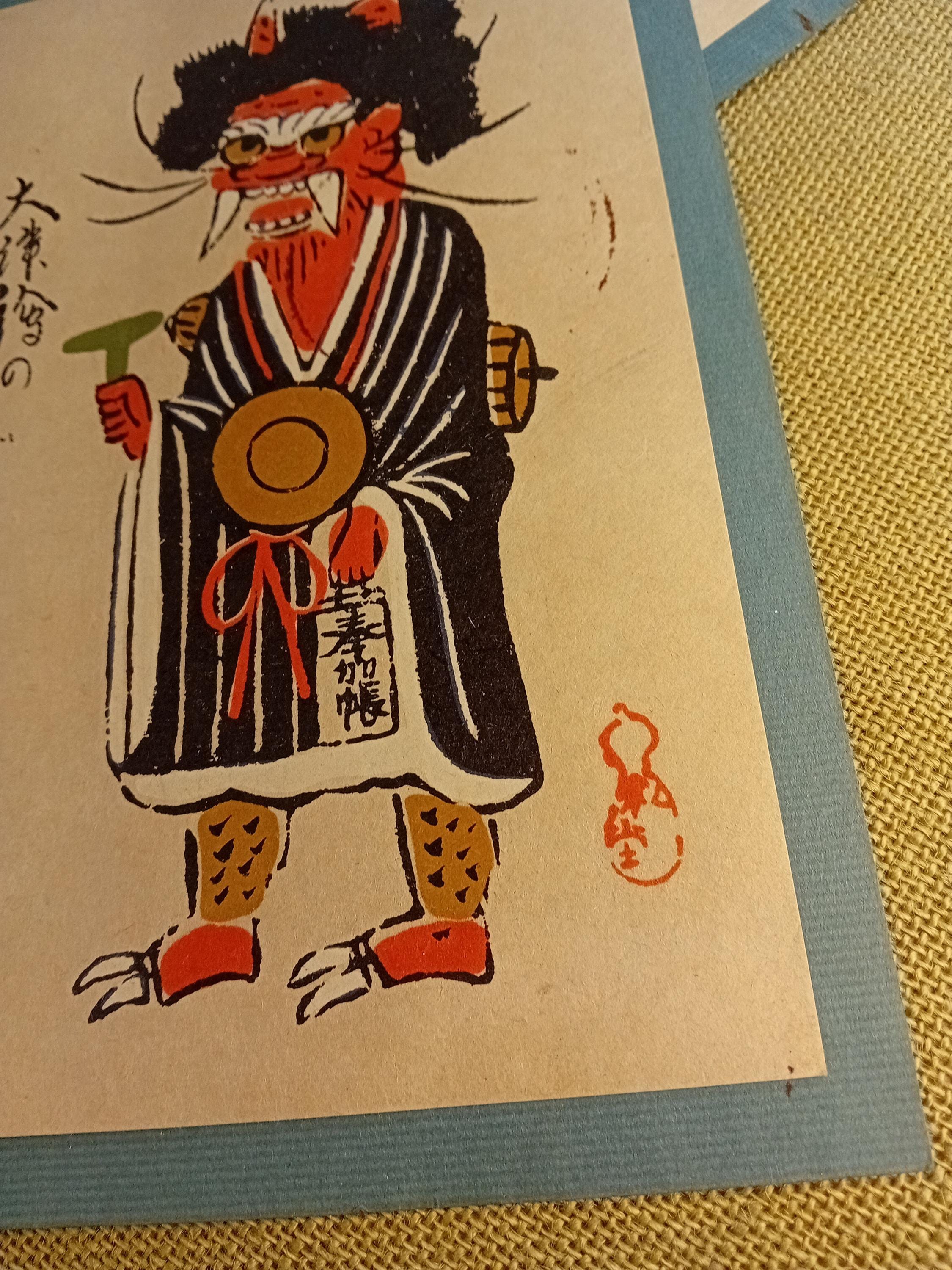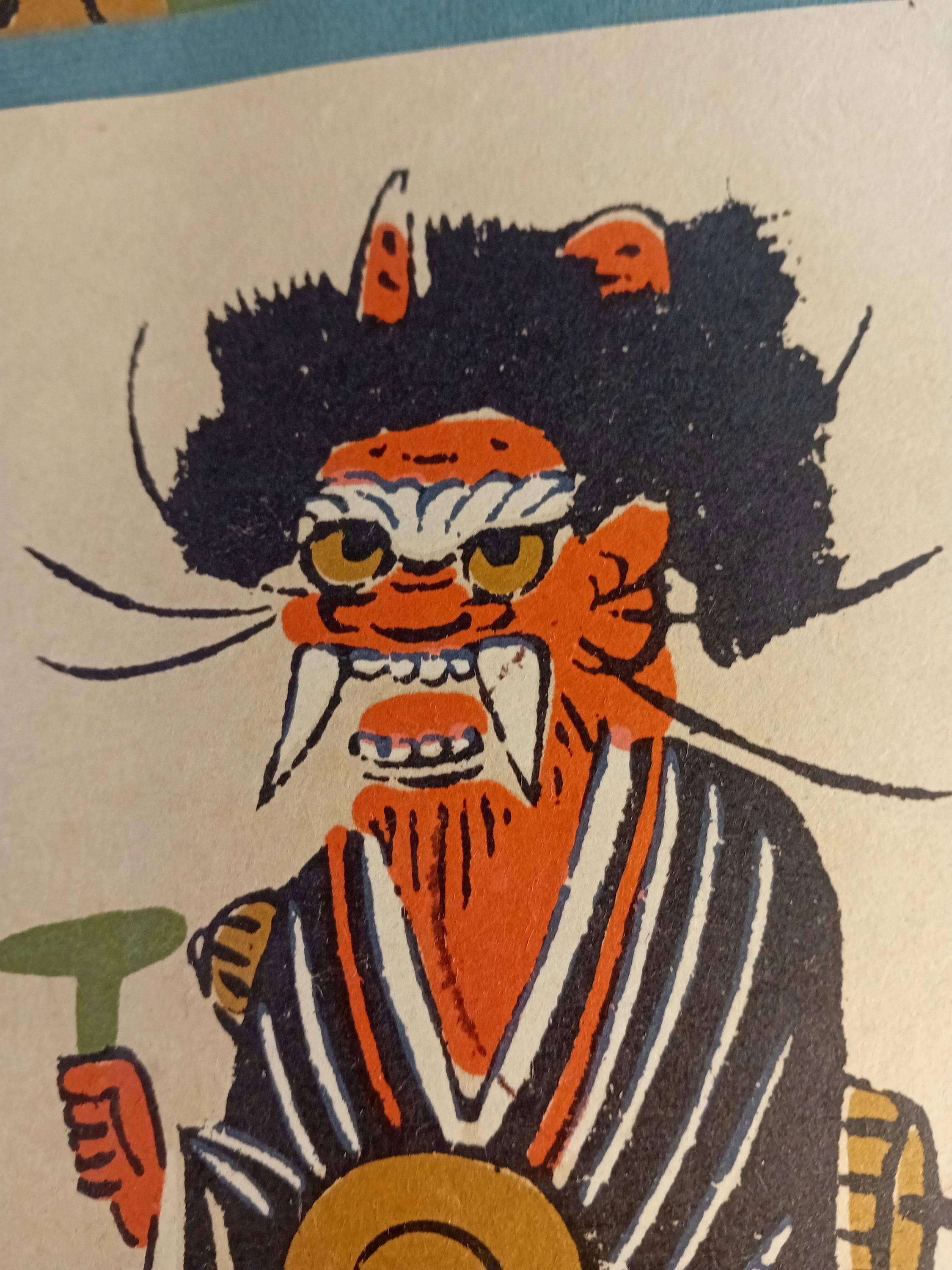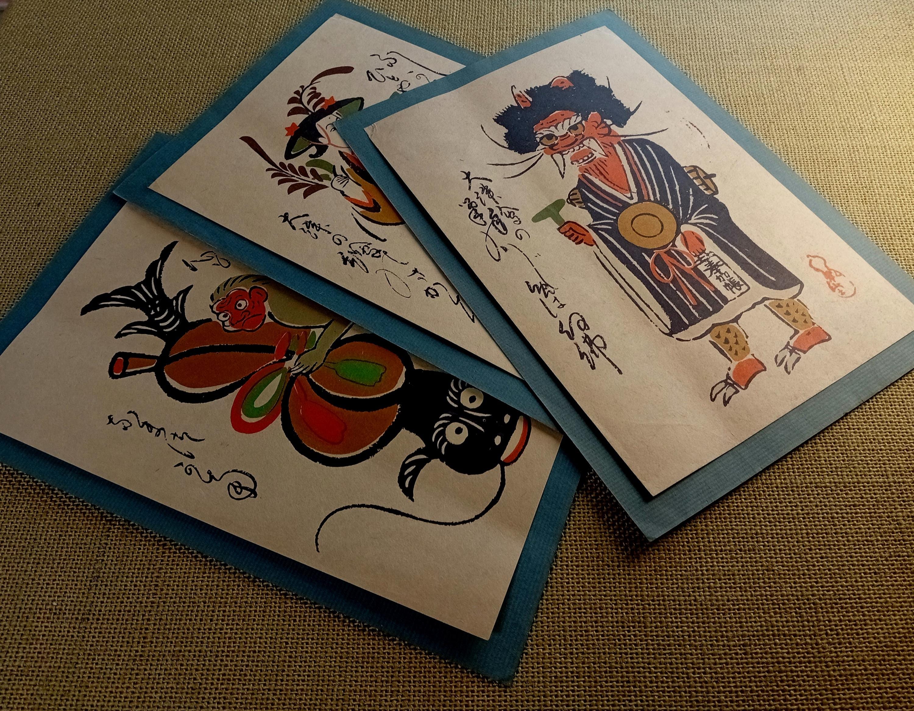 The set presents a unified series of folk grotesque character motifs: an oni figure, theatrical stylized characters, and mask-like creatures.