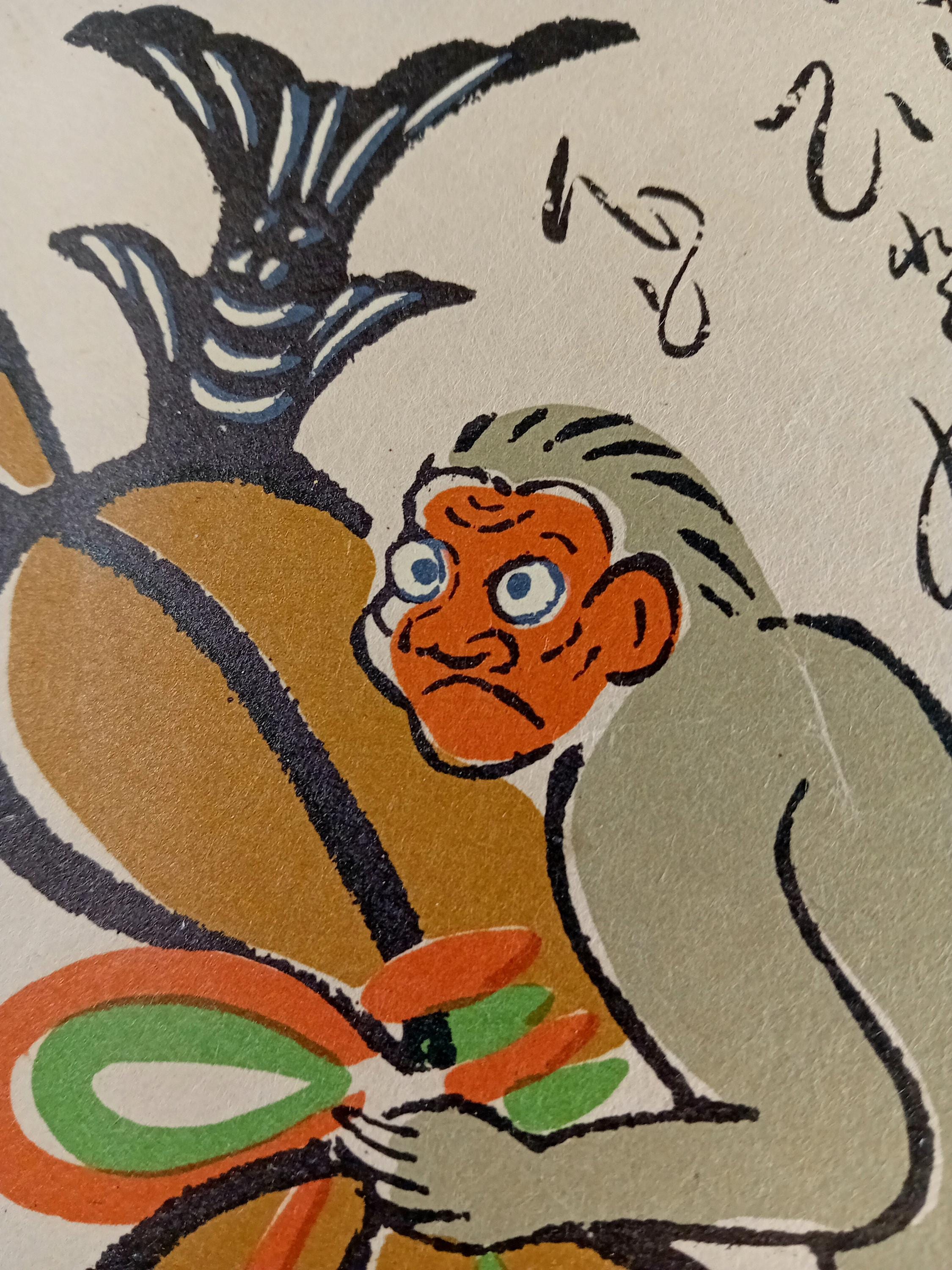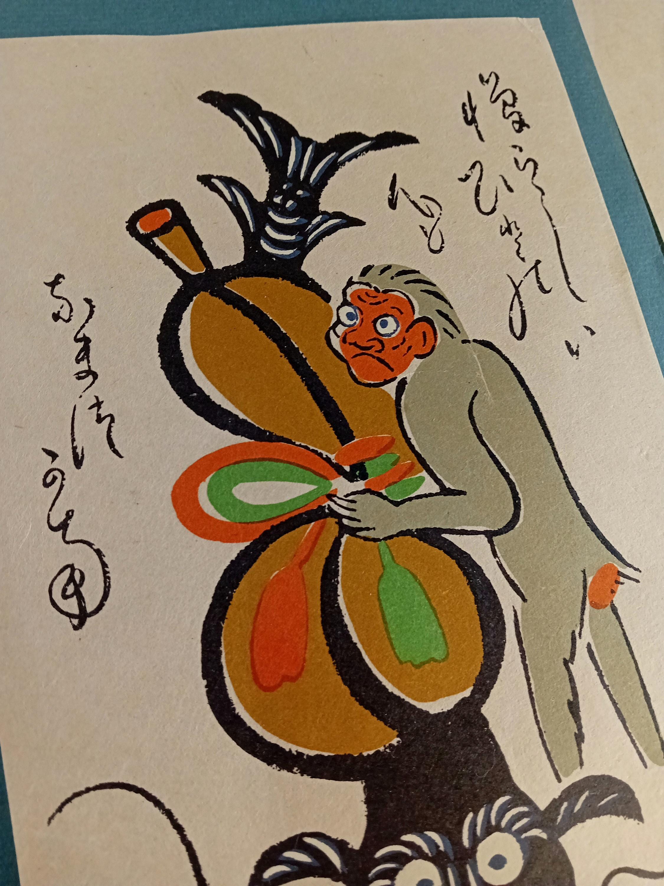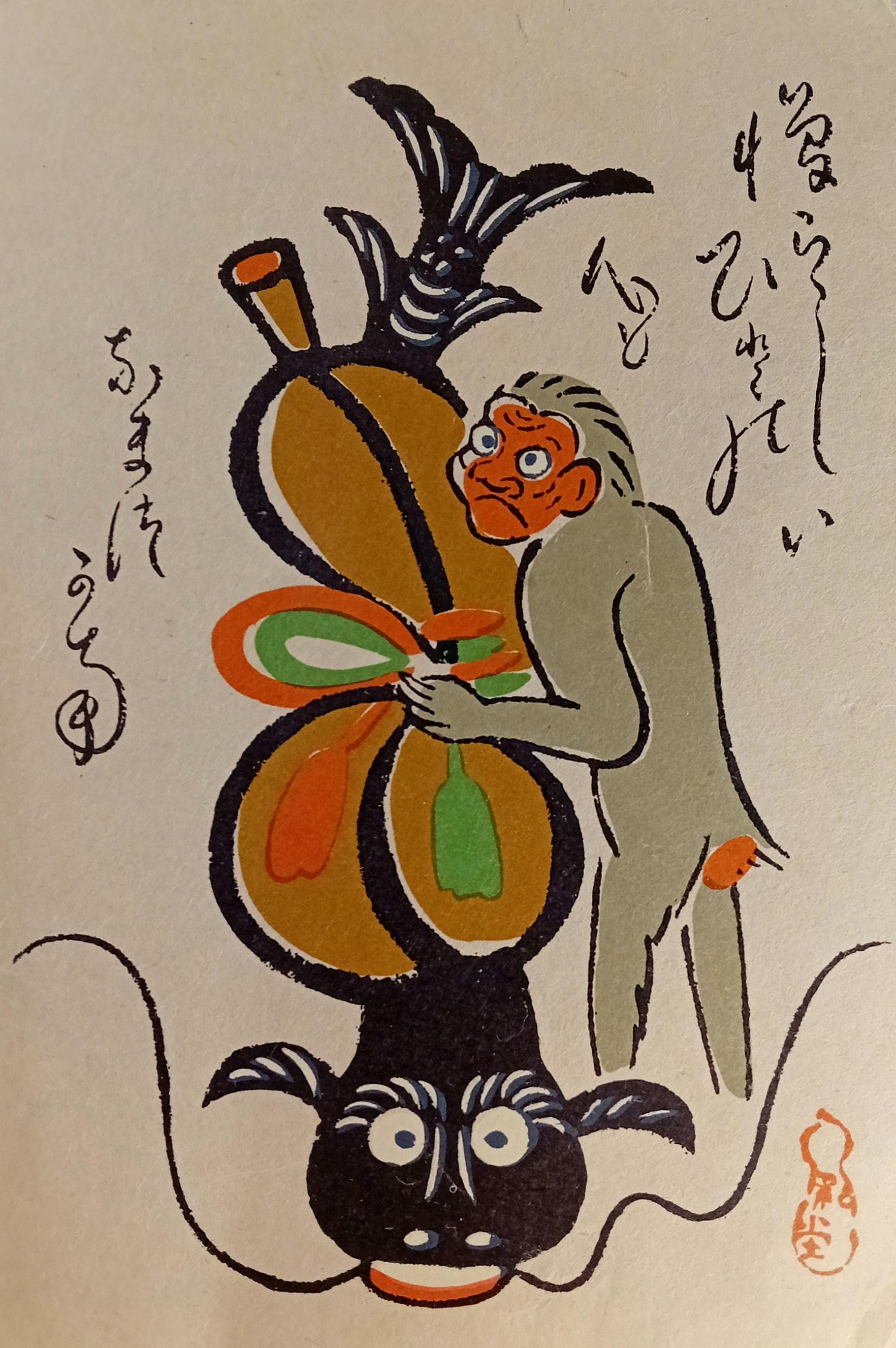 The visual language is flat-color, bold-outline, and folk-inspired, with an Ōtsu-e-like association (stylistic reference only).