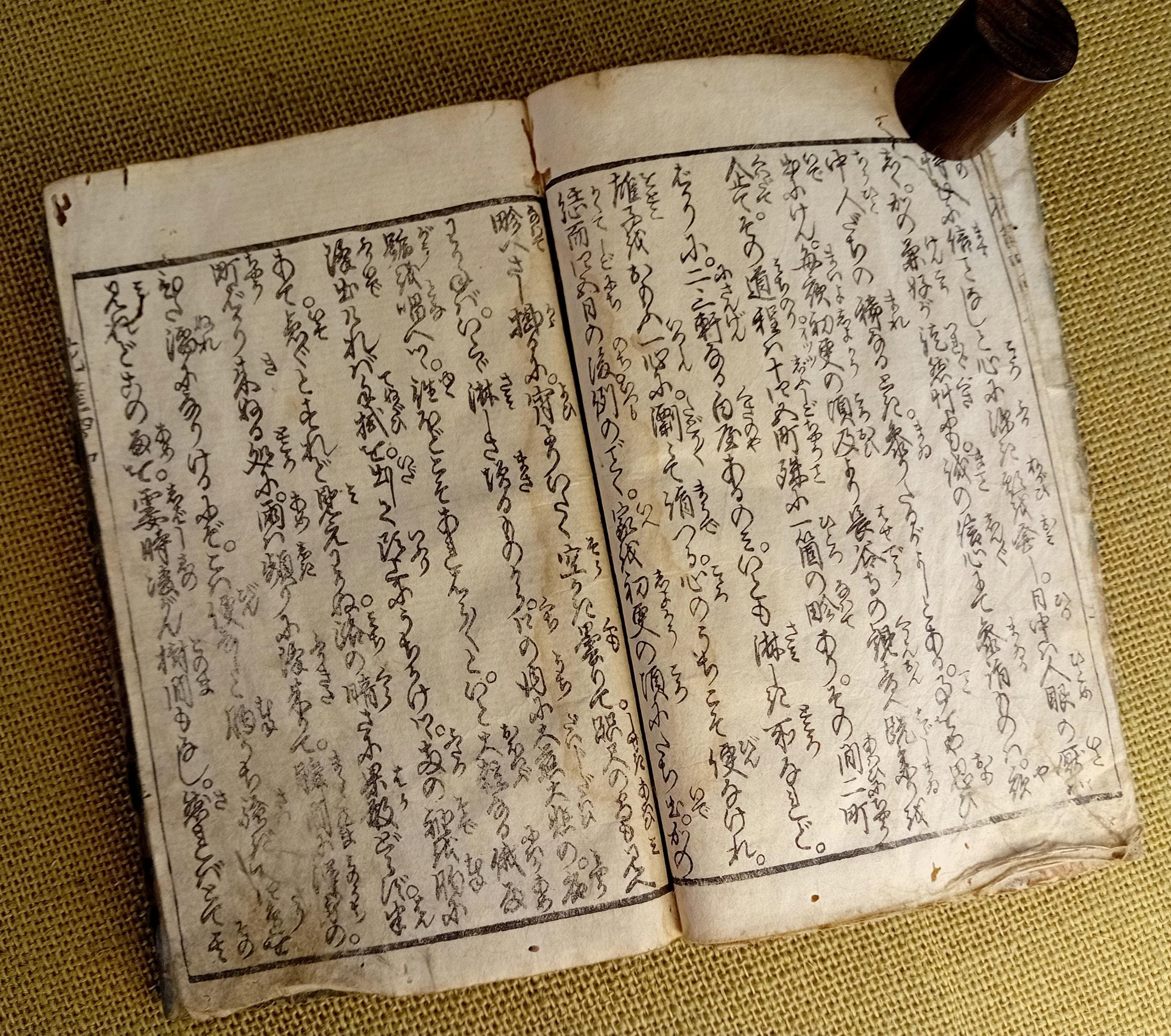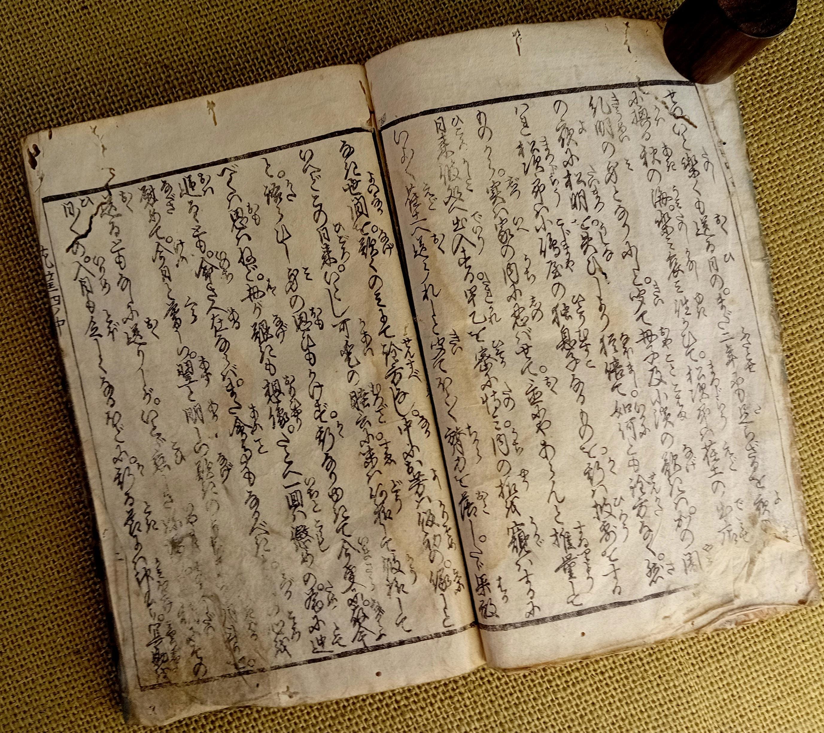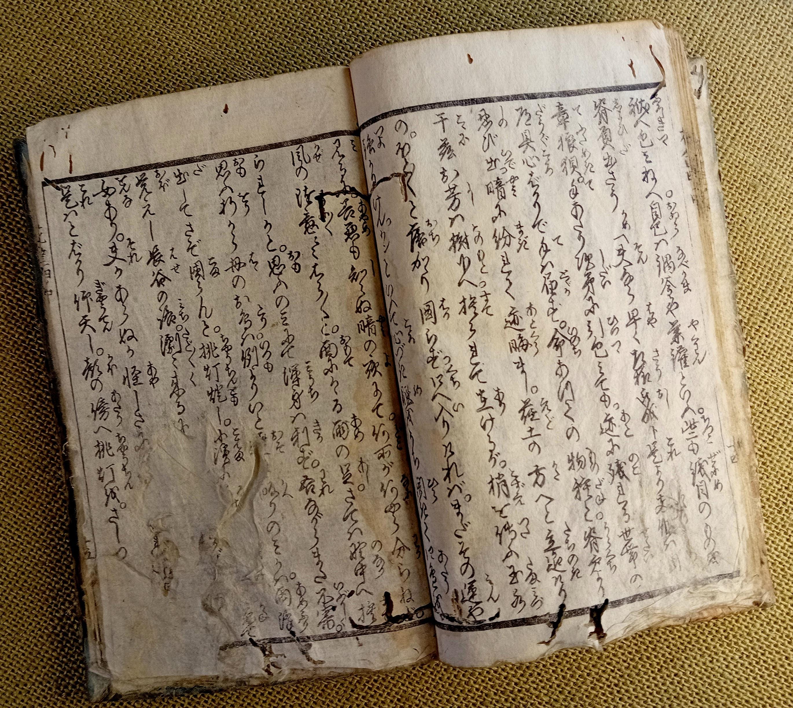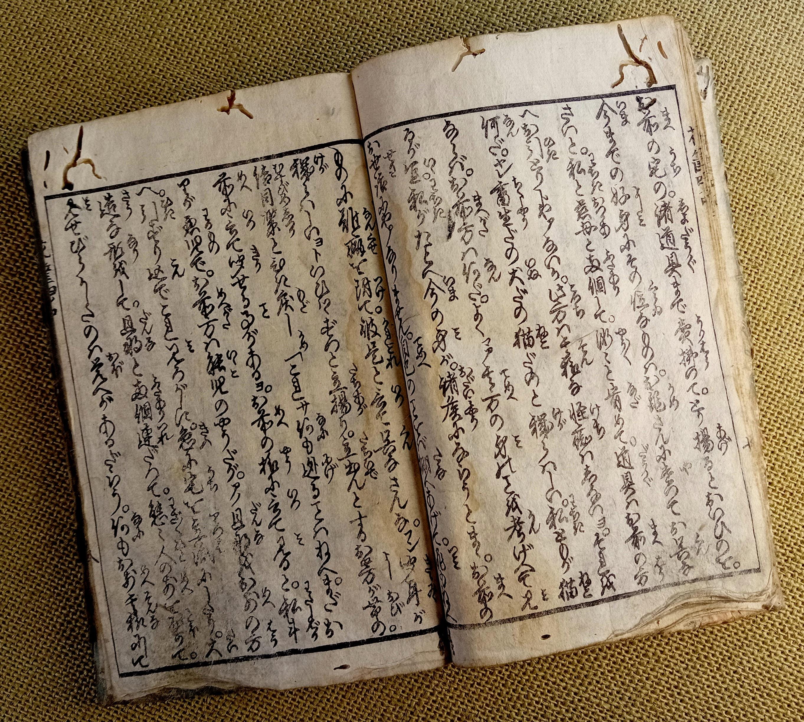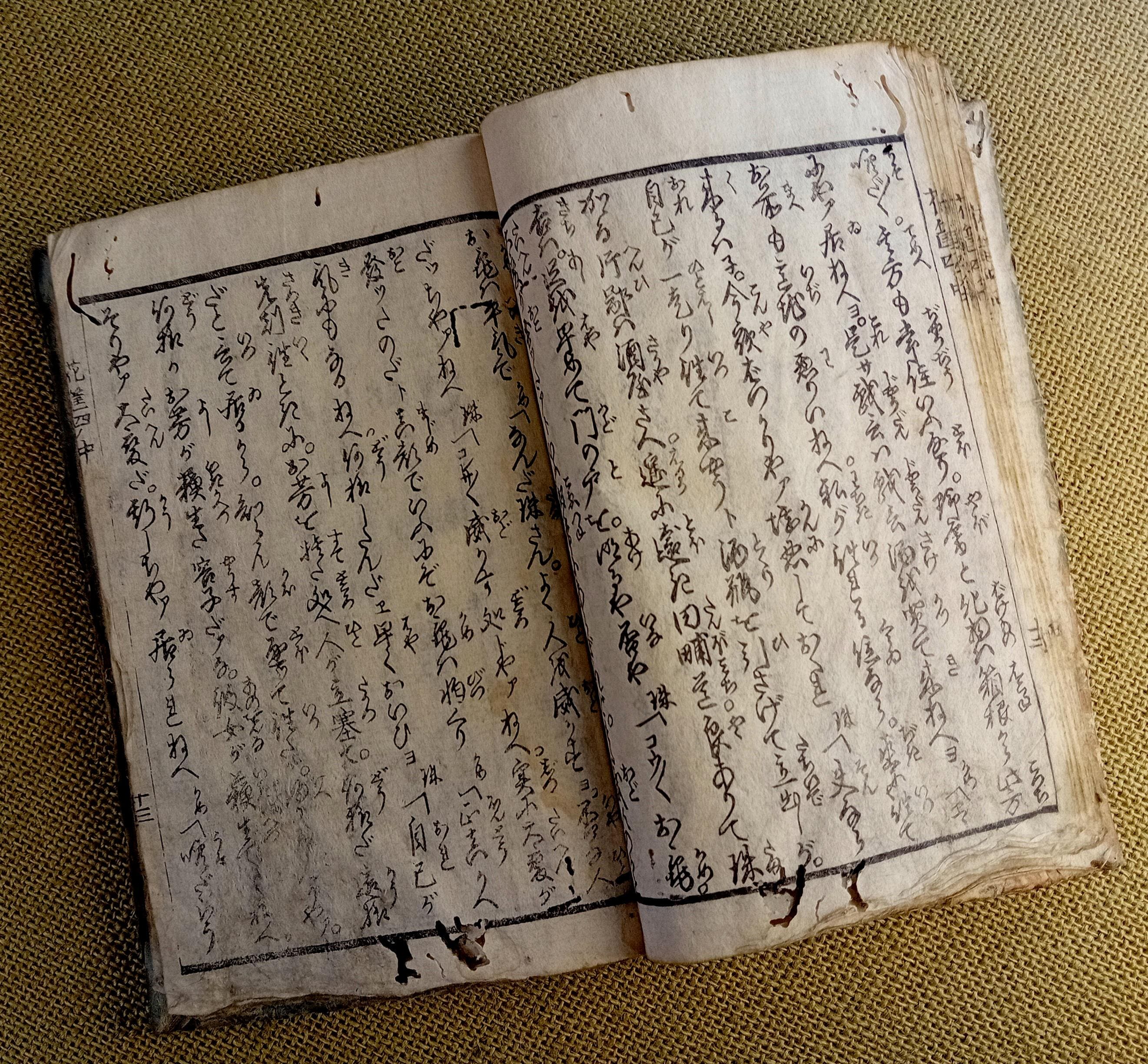 Antique condition. Natural signs of age are present, including paper toning, localized traces of moisture, damage to individual pages, and traces of insect activity, consistent with the historical use of an authentic Edo-period woodblock-printed book.