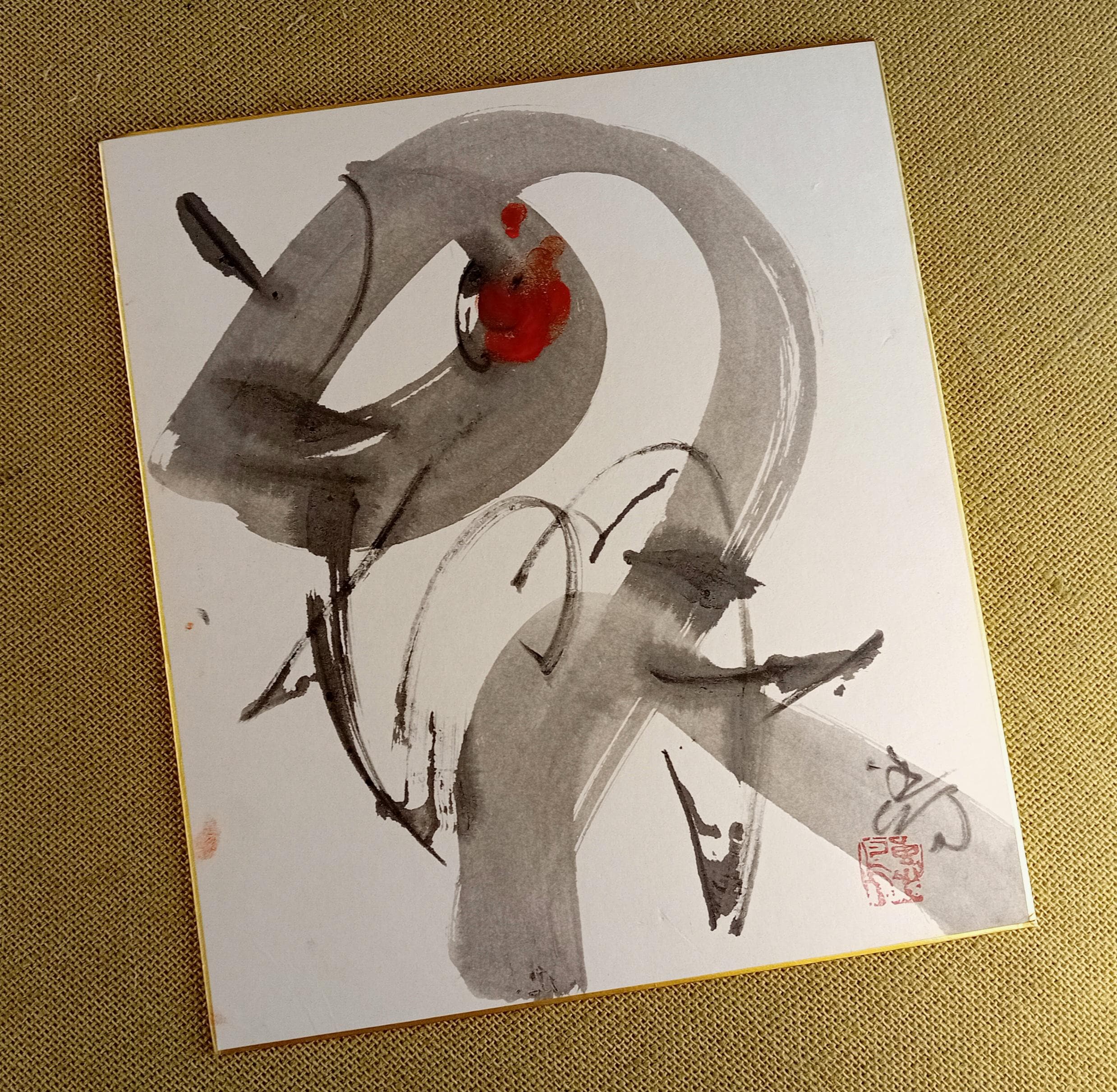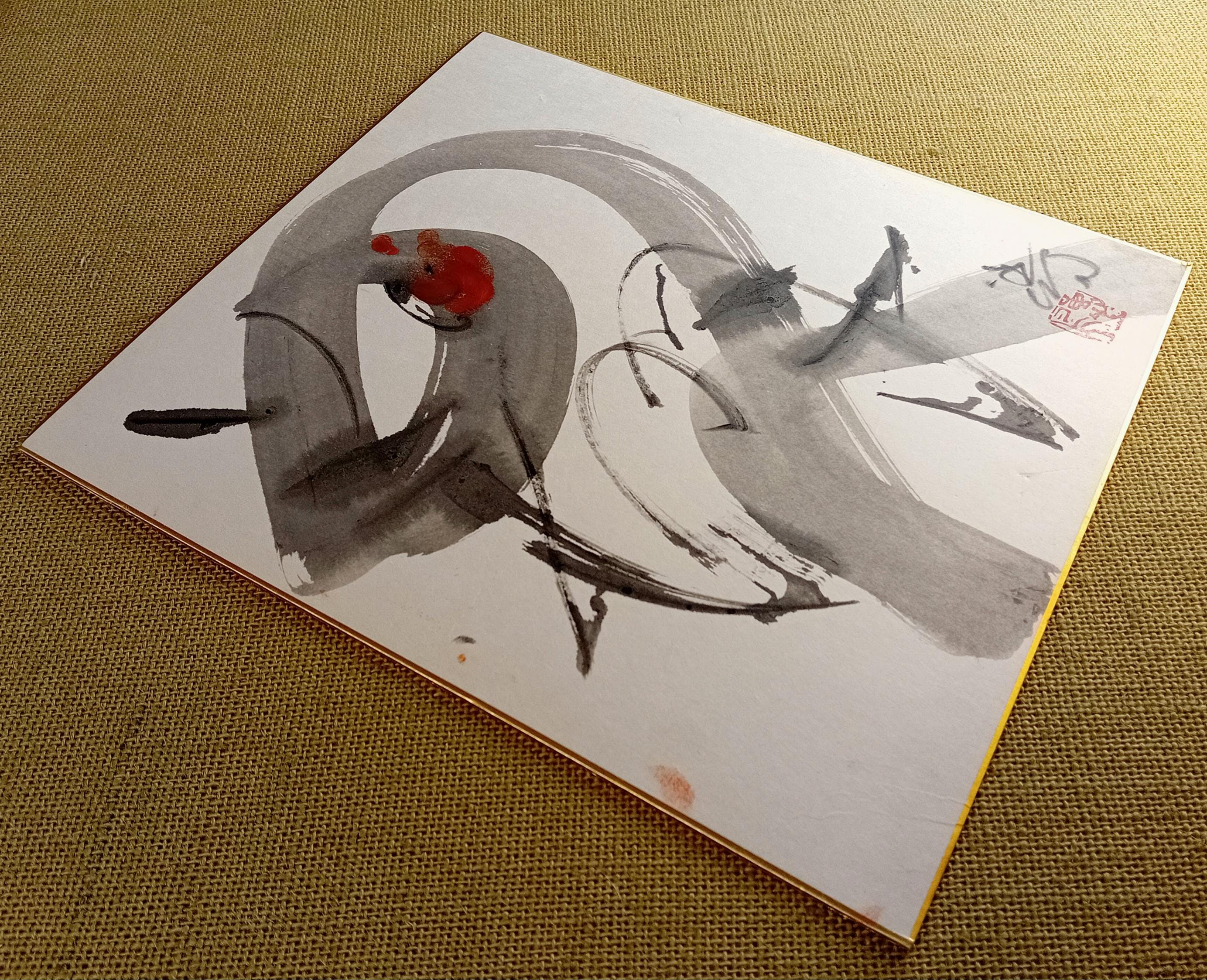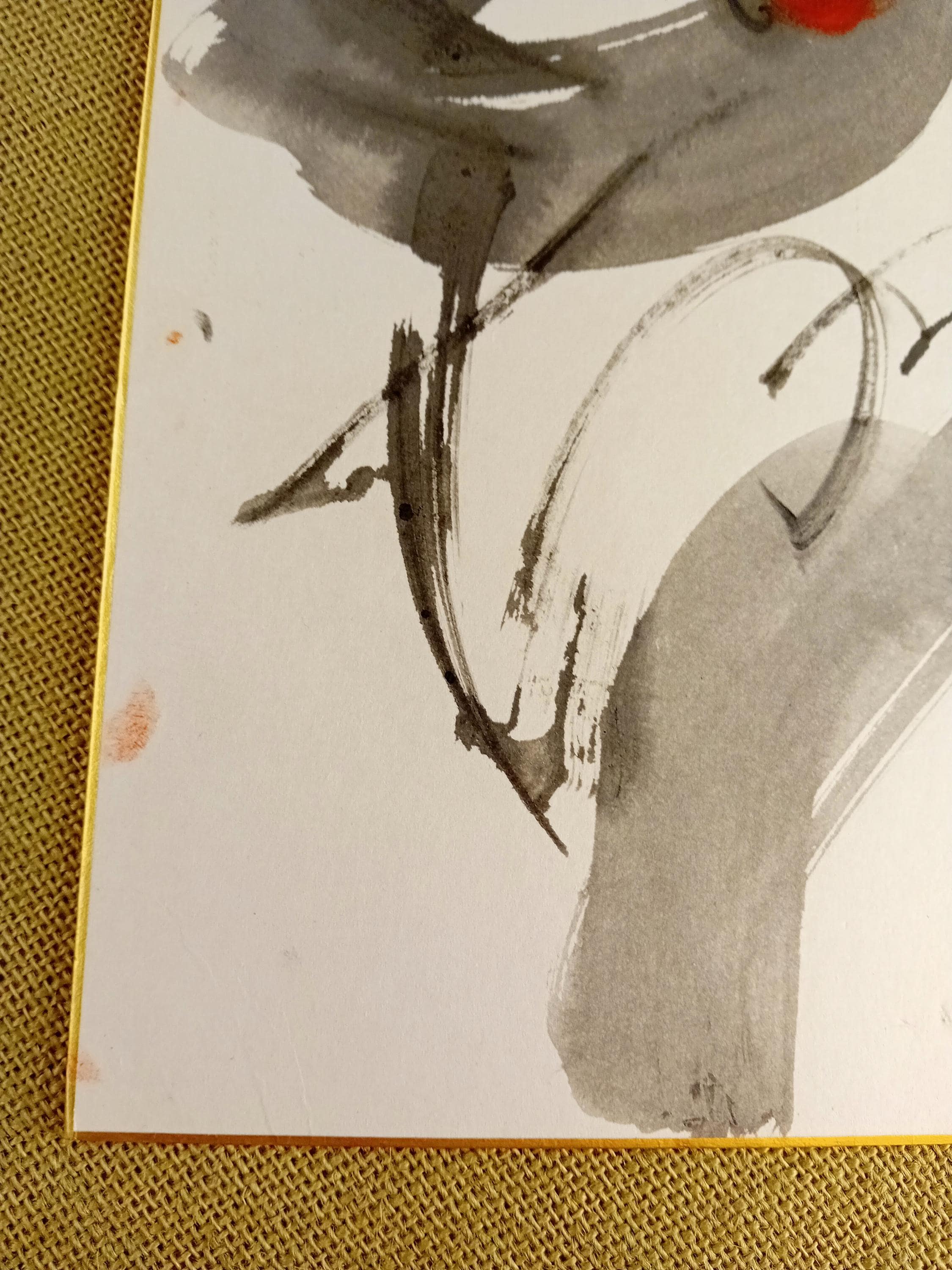 Japanese shikishi executed in ink, late Shōwa period. The composition is built around a single large calligraphic character in a Zen manner. A signature and red seal are present in the lower right corner. Attributed to a Japanese artist of the second half of the 20th century.