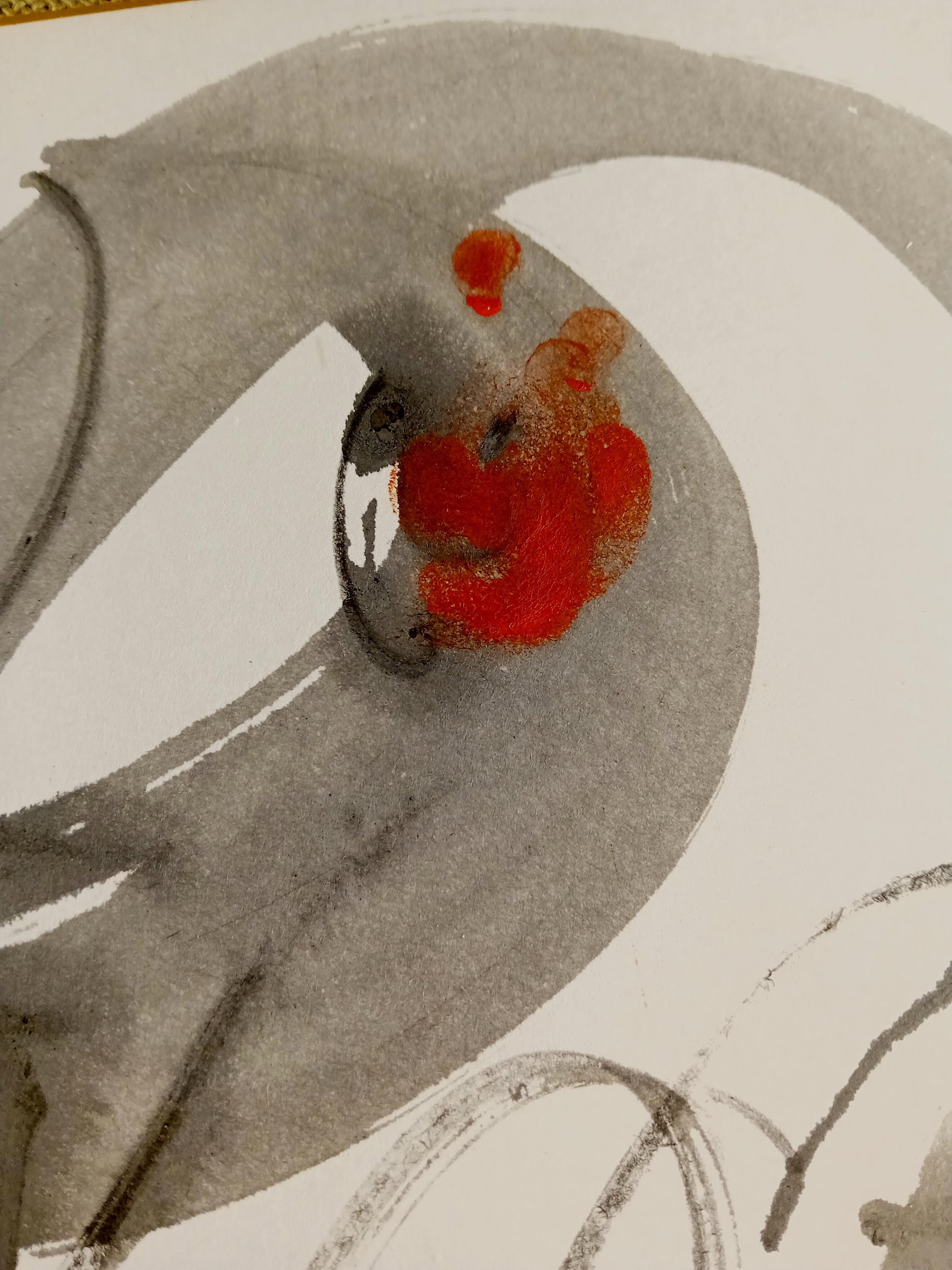 Free Zen calligraphy, semi-cursive (gyōsho), focused on a large brush gesture.