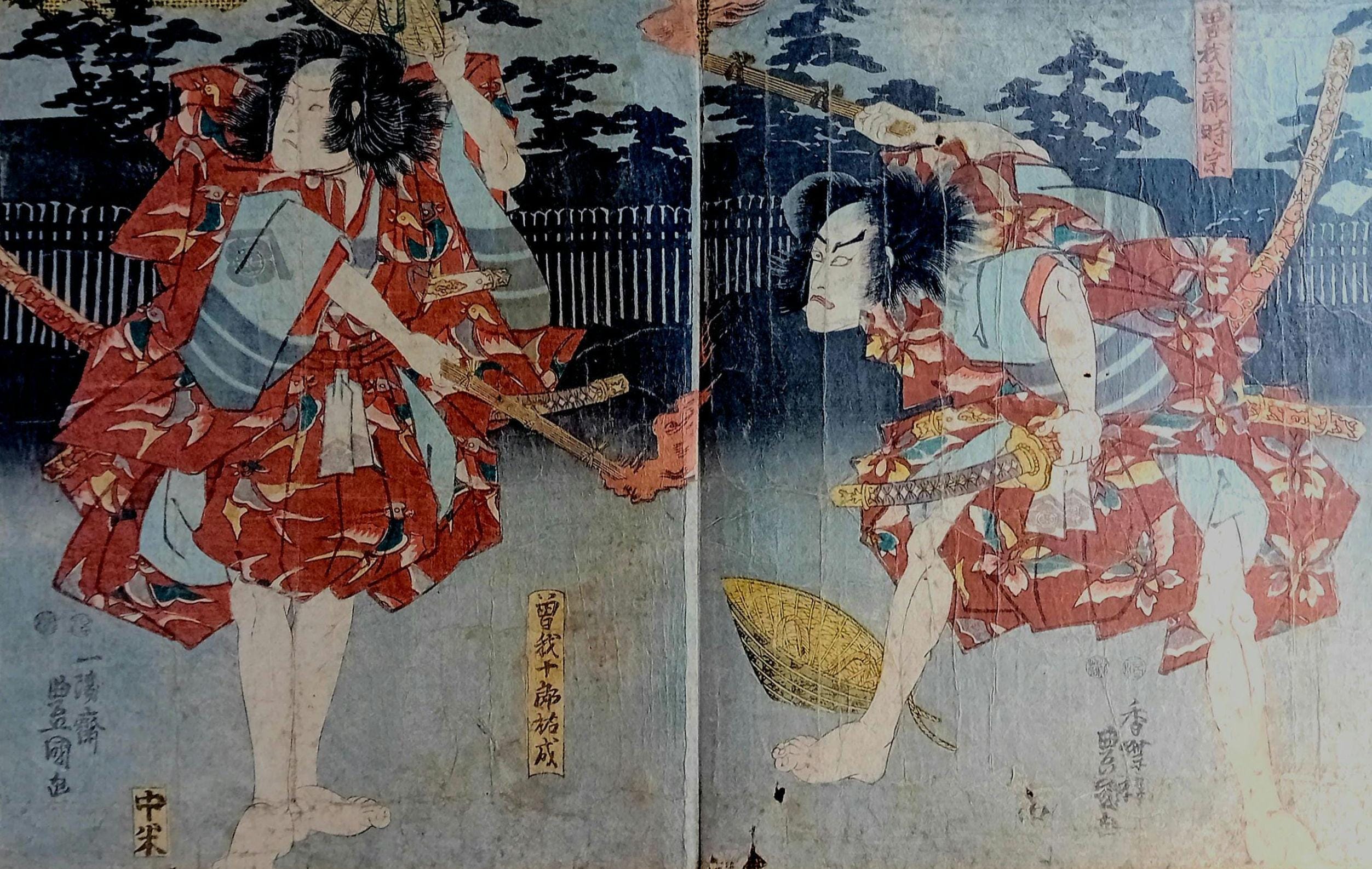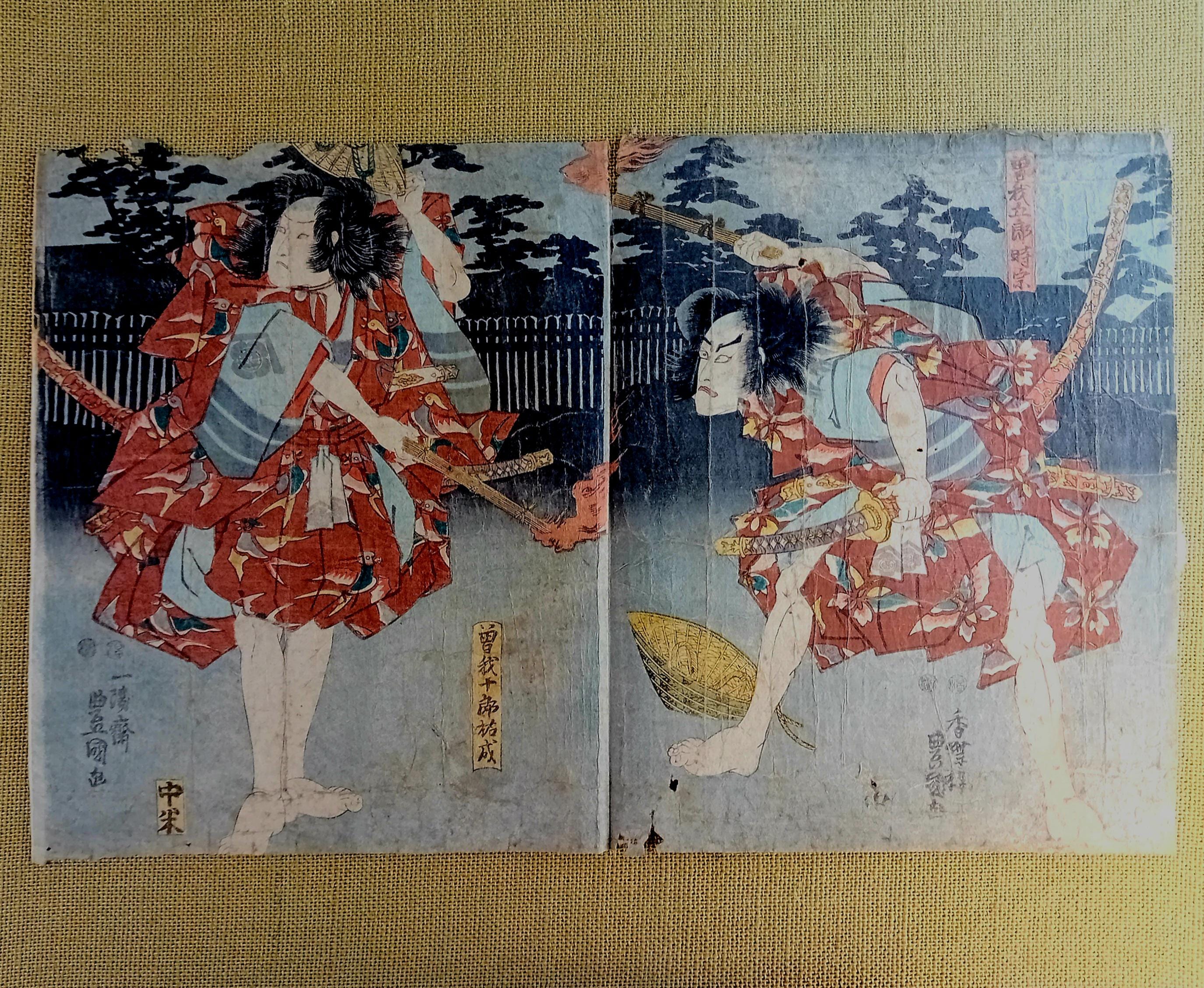 Two-sheet diptych (nishiki-e) in the kabuki-e genre depicting a samurai theatrical scene.