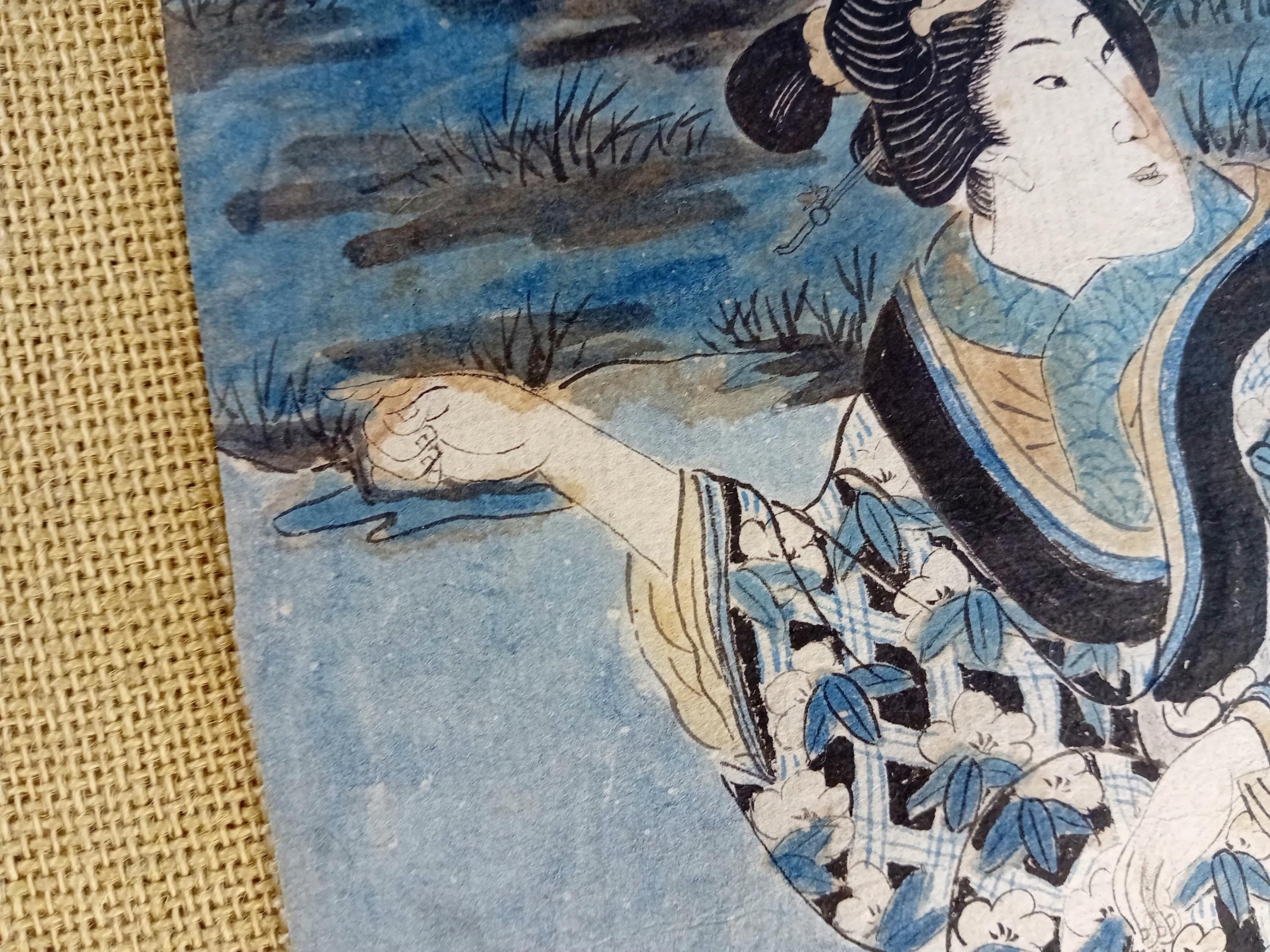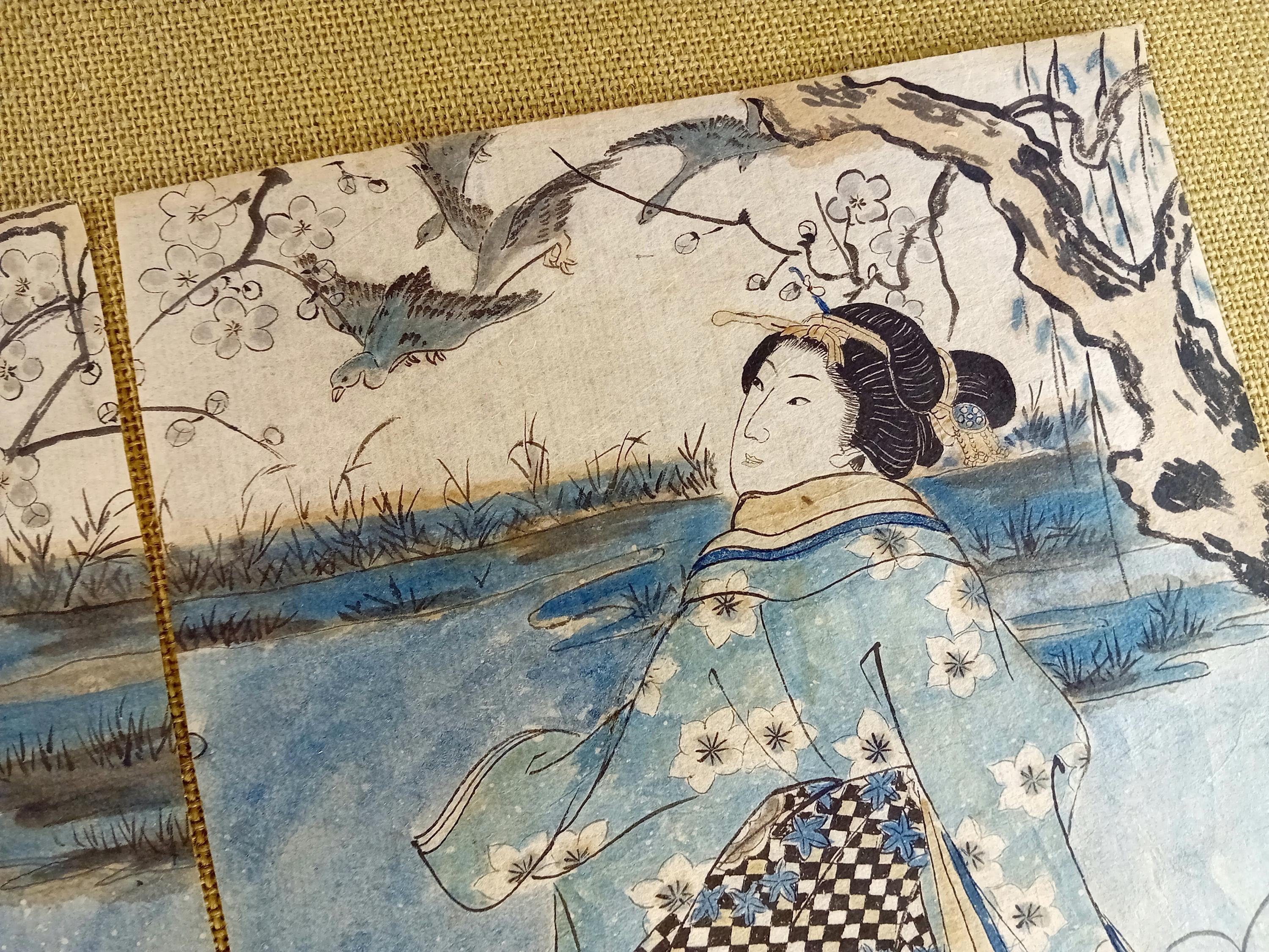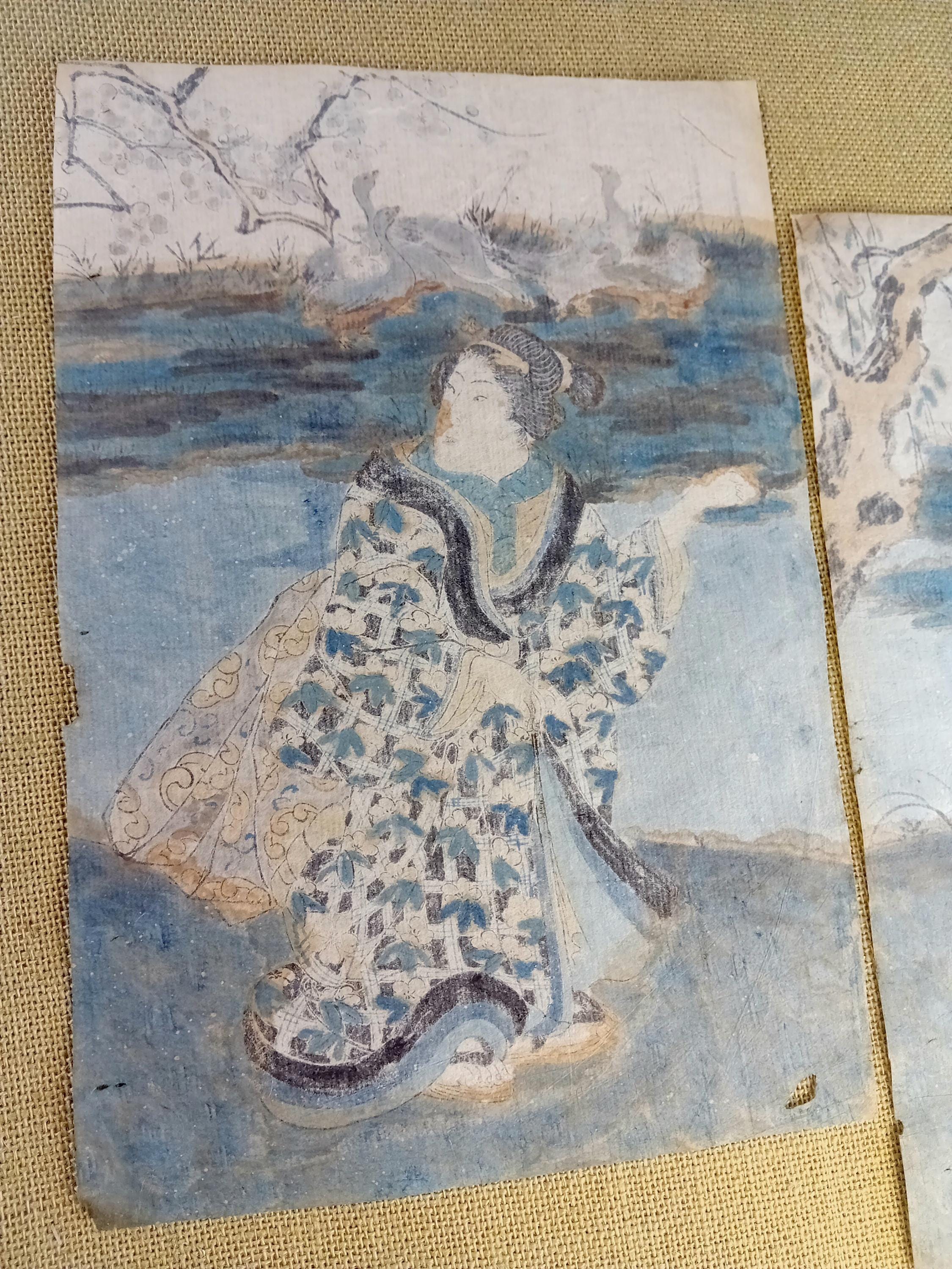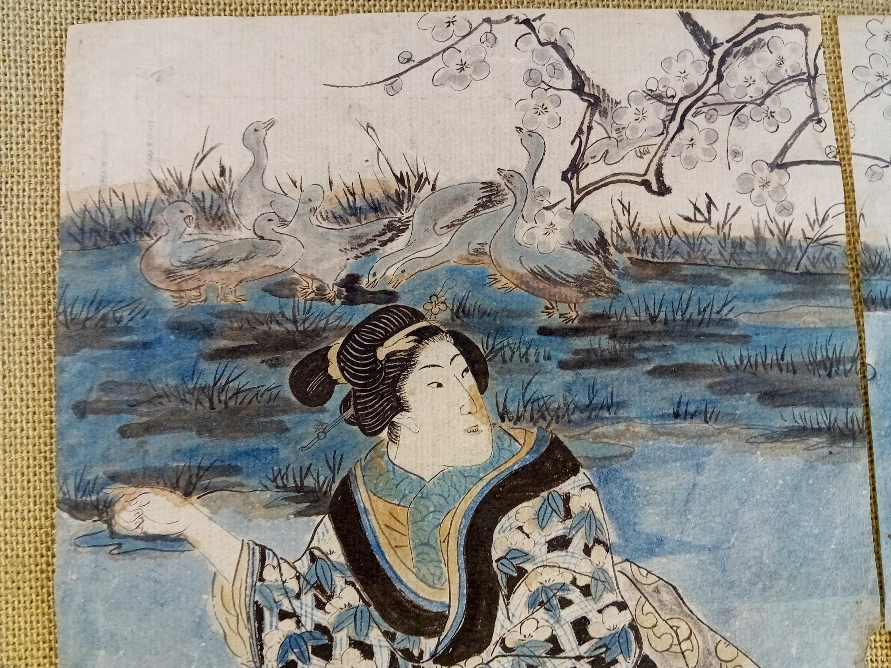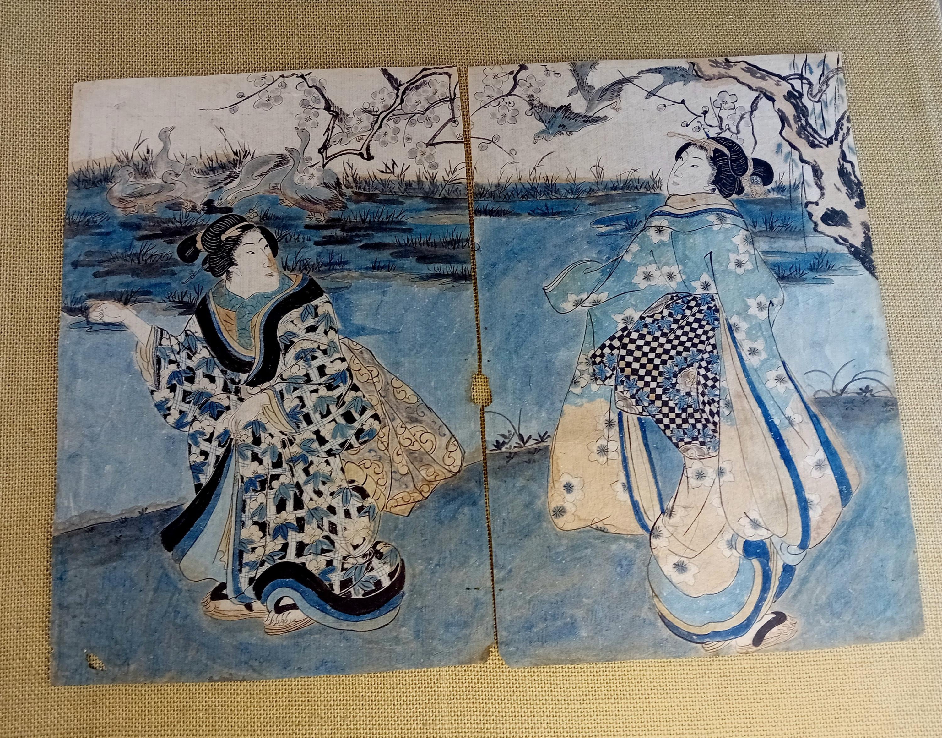Japanese woodblock print diptych with hand-applied color. The composition depicts two female figures in a landscape setting typical of bijinga. Color is applied manually over the printed line, indicating an early hand-coloring practice.