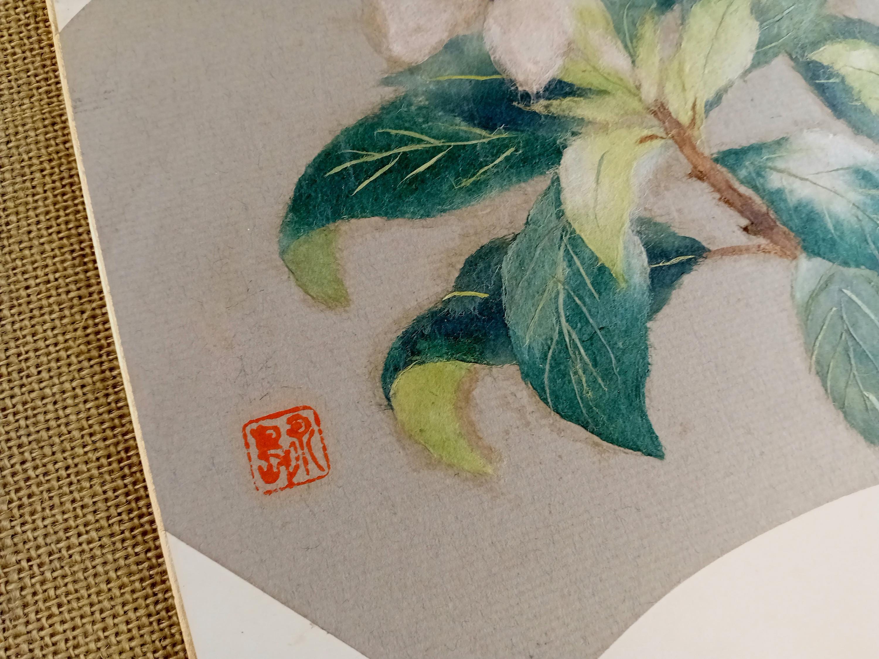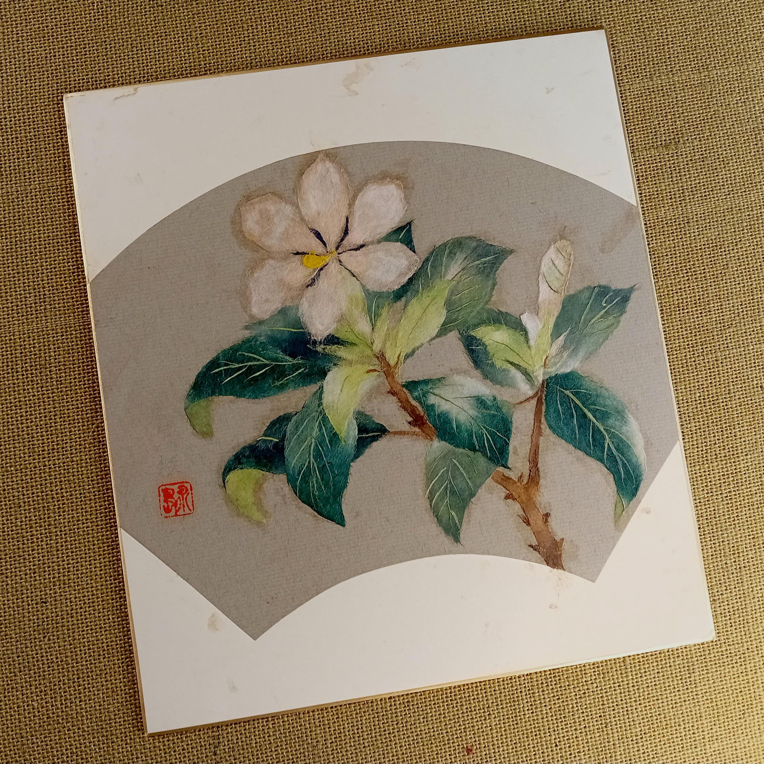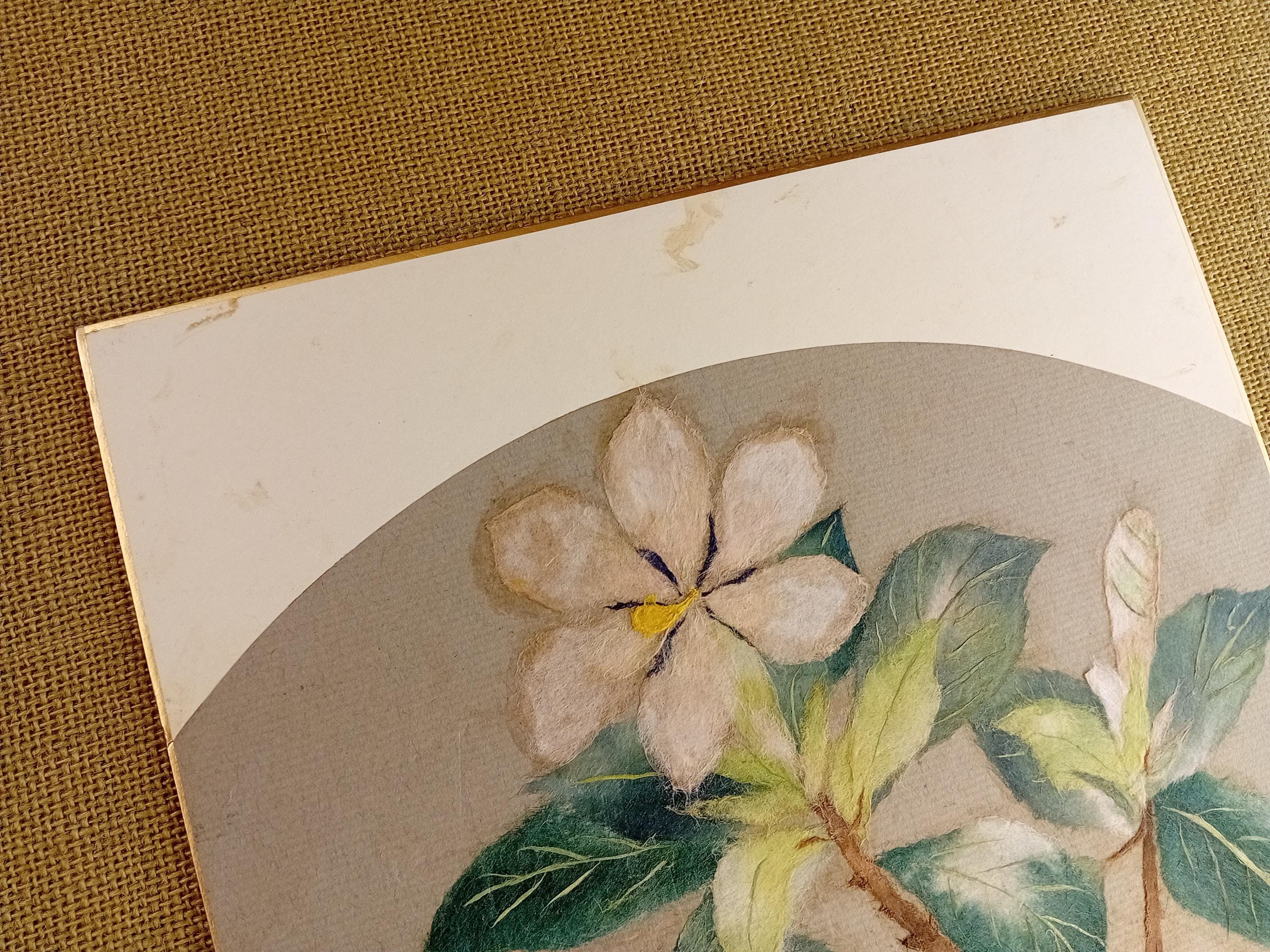 A vintage Japanese shikishi from the Shōwa era, featuring a fan-shaped composition with a flowering branch.