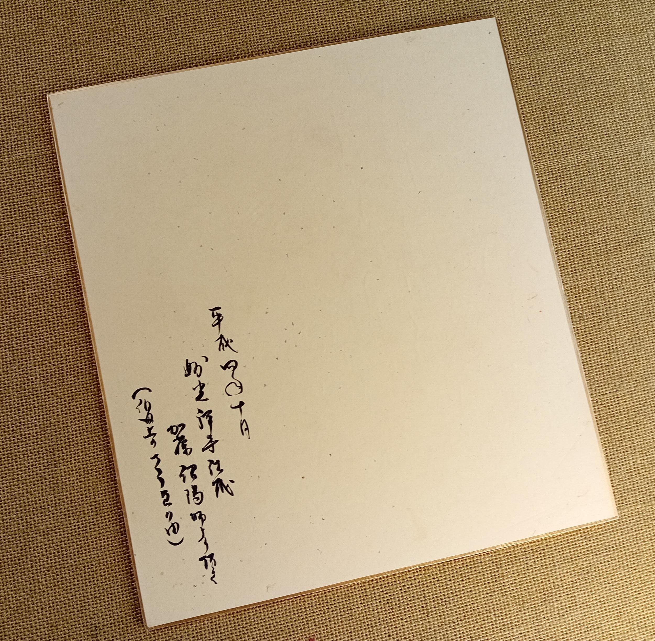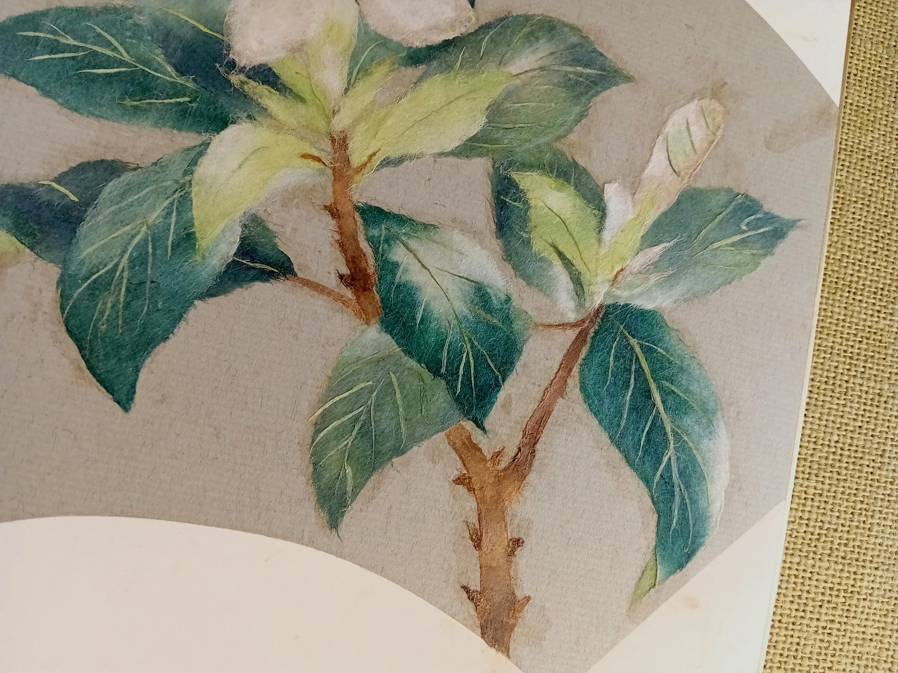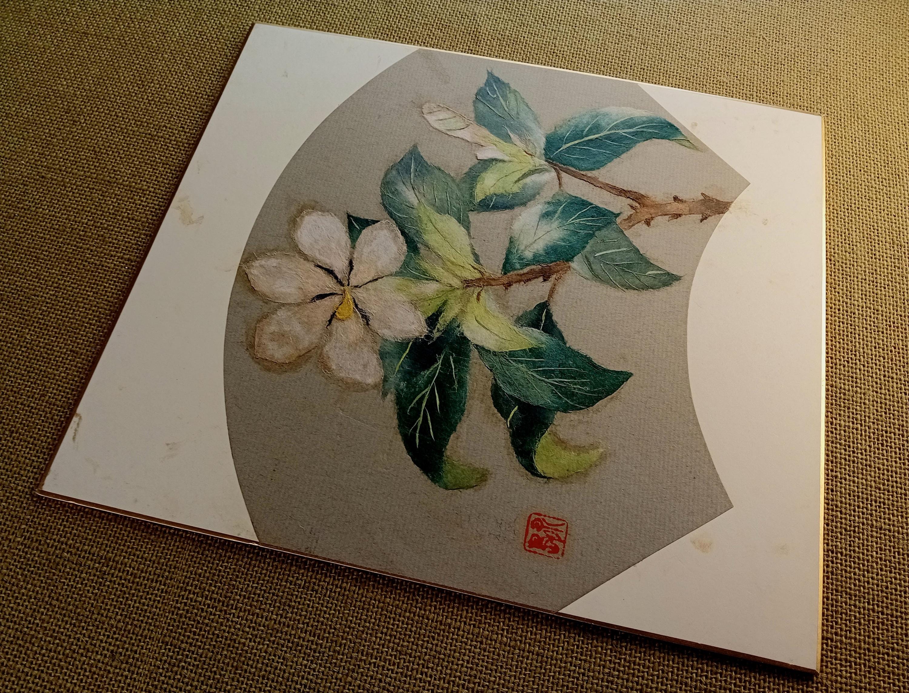 A vintage Japanese shikishi from the Shōwa era, featuring a fan-shaped composition with a flowering branch.