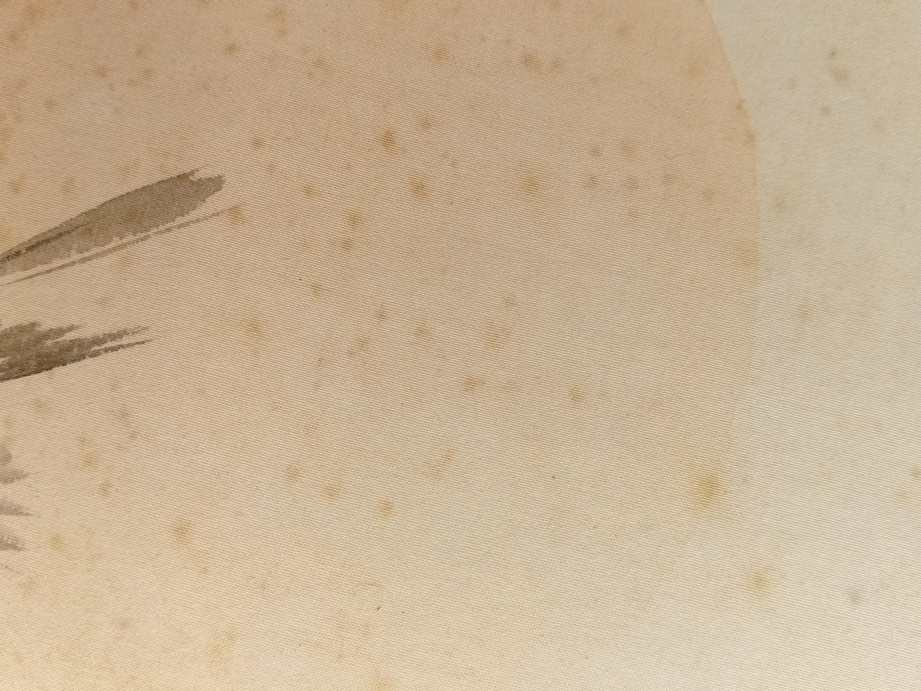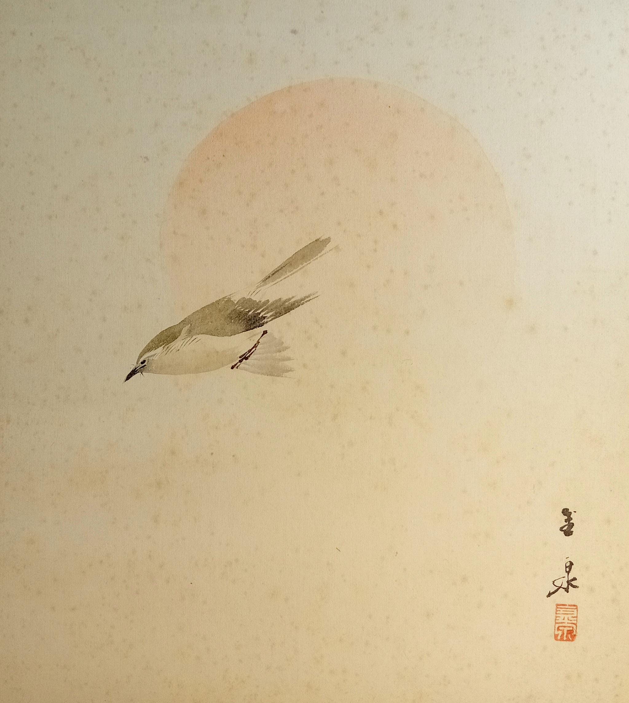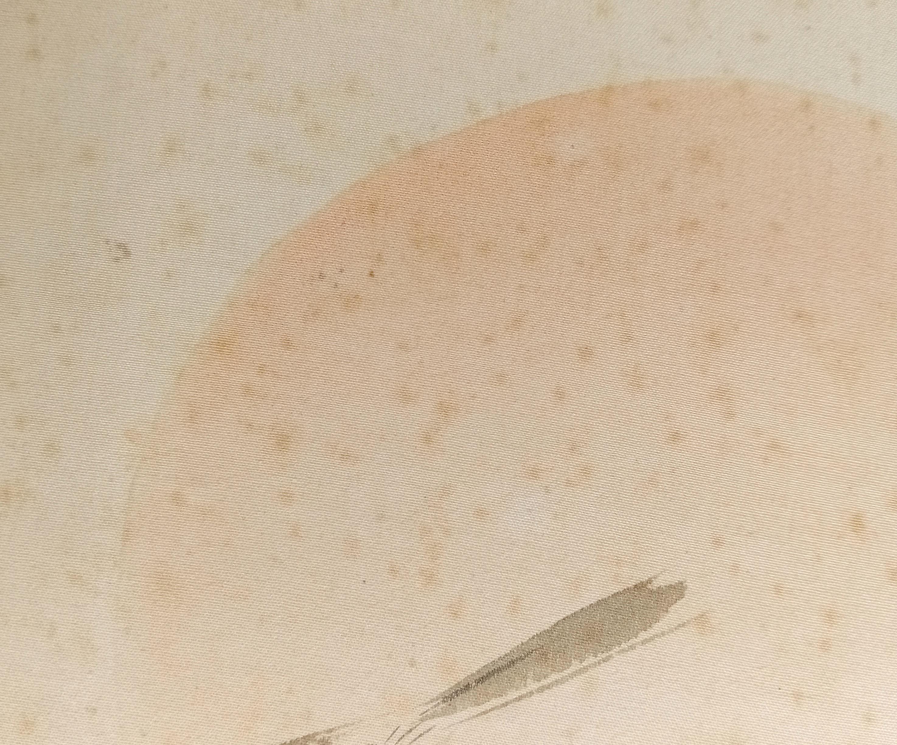 The composition is structured around a sun disc and a minimal pictorial accent; the circular form creates a visual reference to the ensō tradition and the Zen aesthetic of balanced empty space.