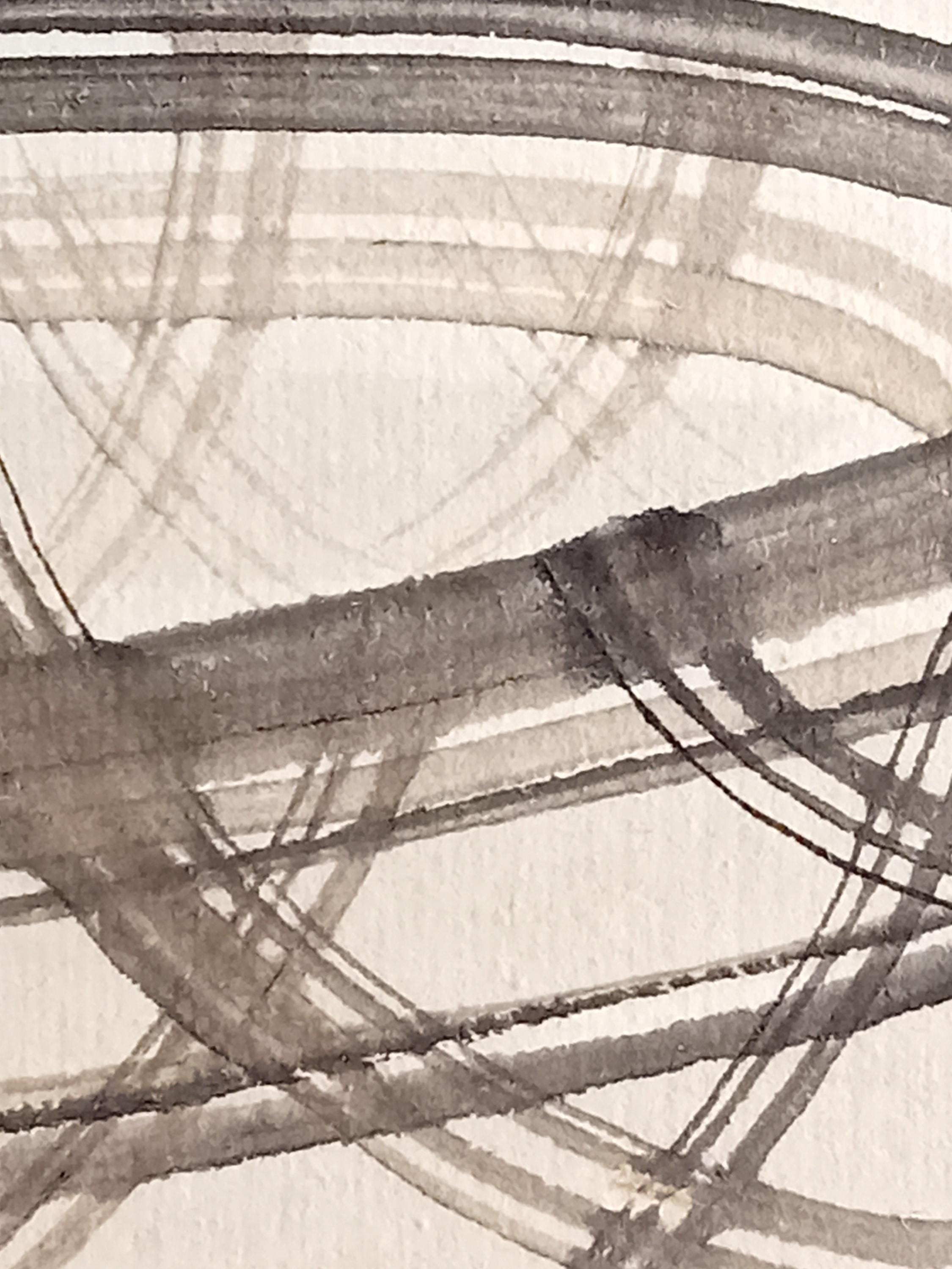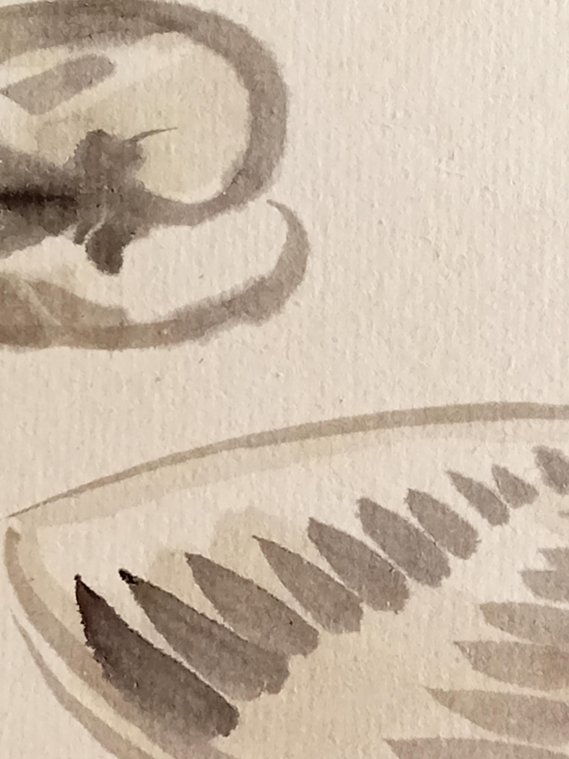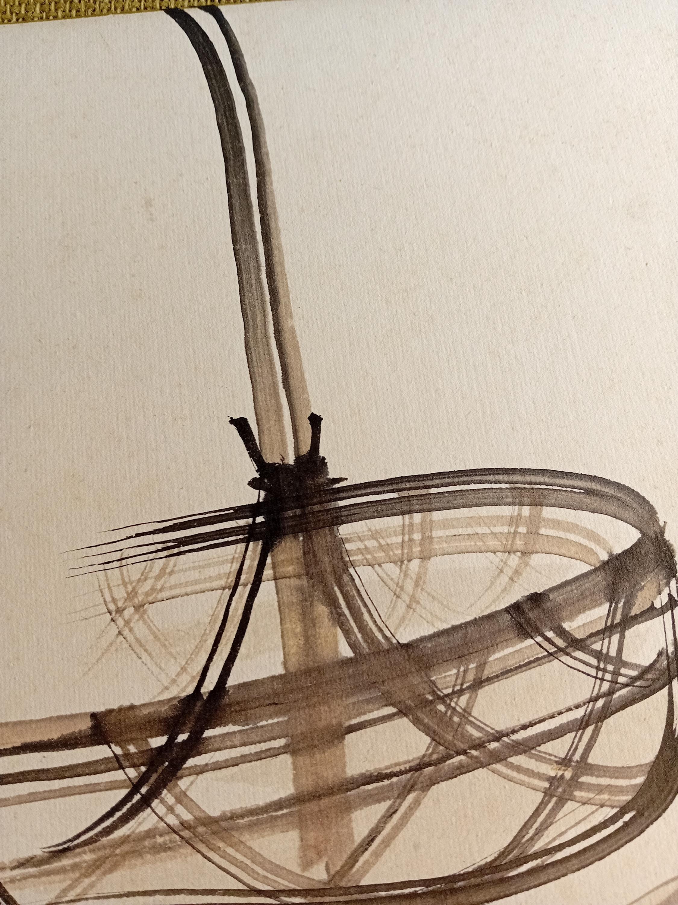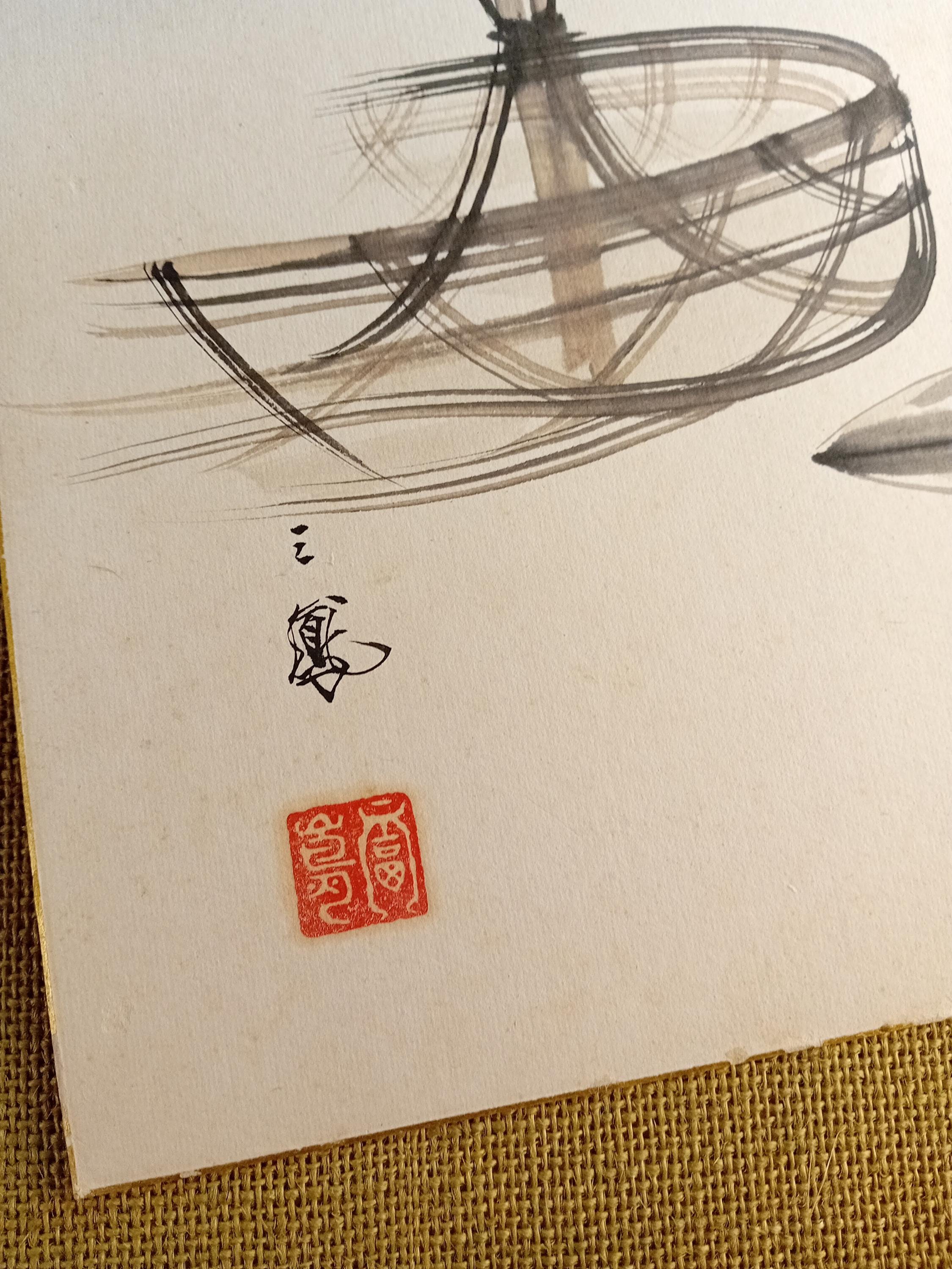 The painting is built on a calligraphic line and a restrained ink manner, echoing Zen aesthetics and the visual language of tea culture.