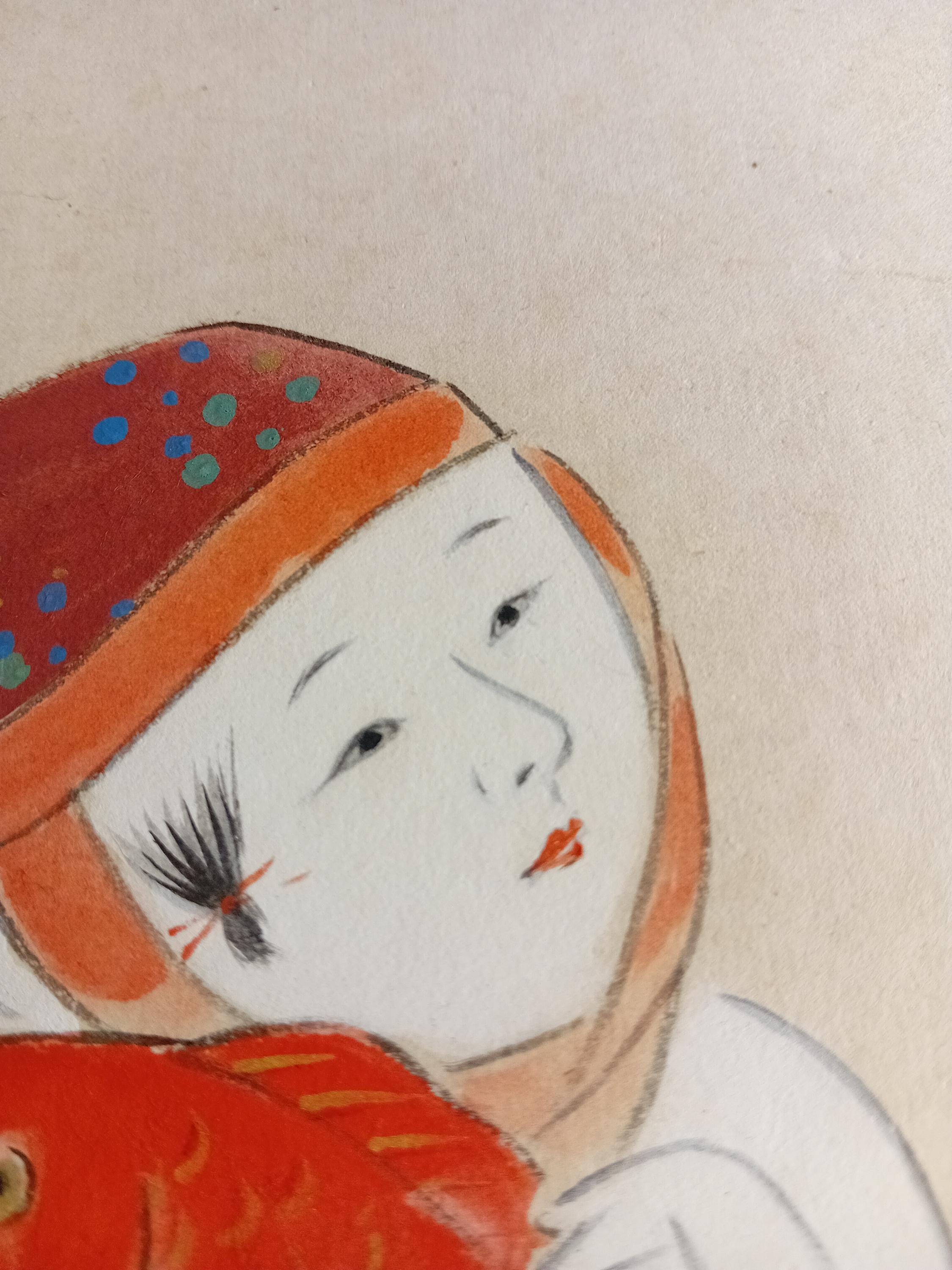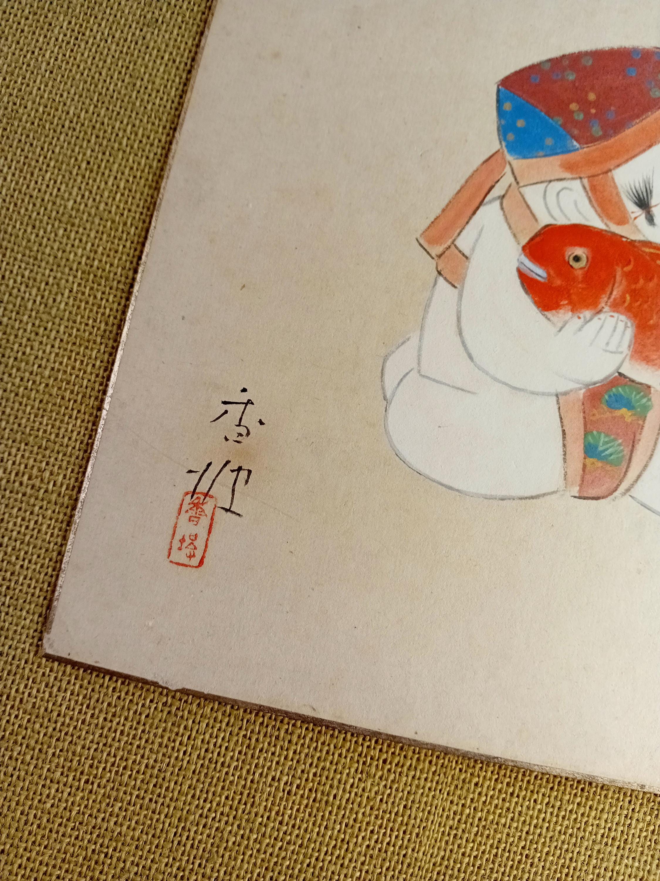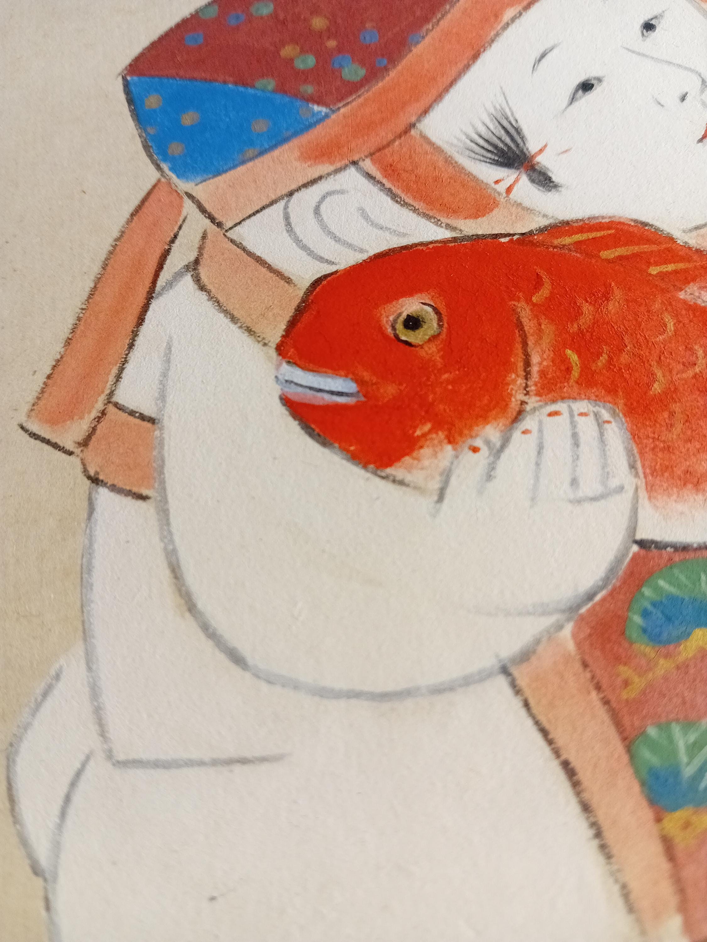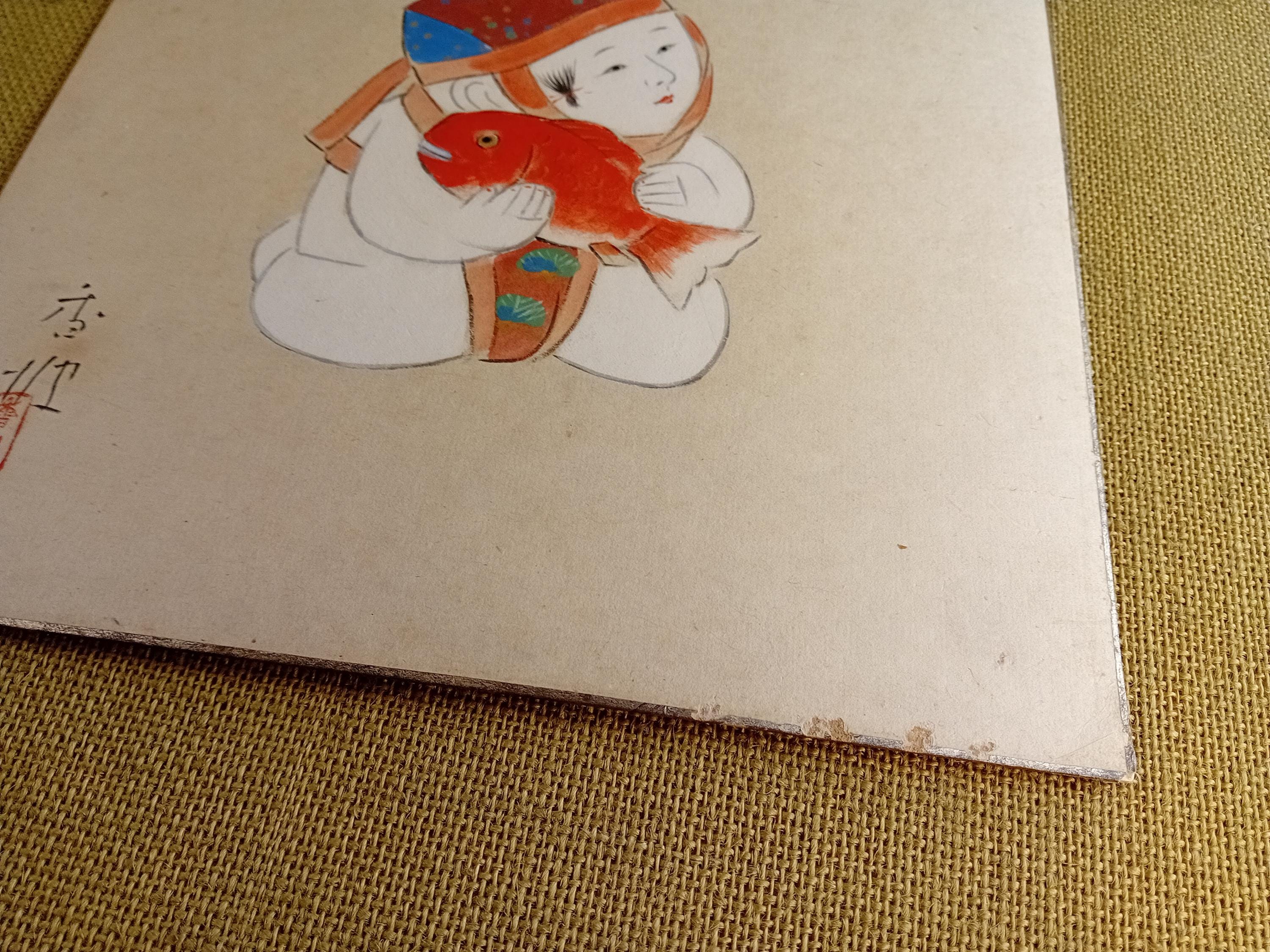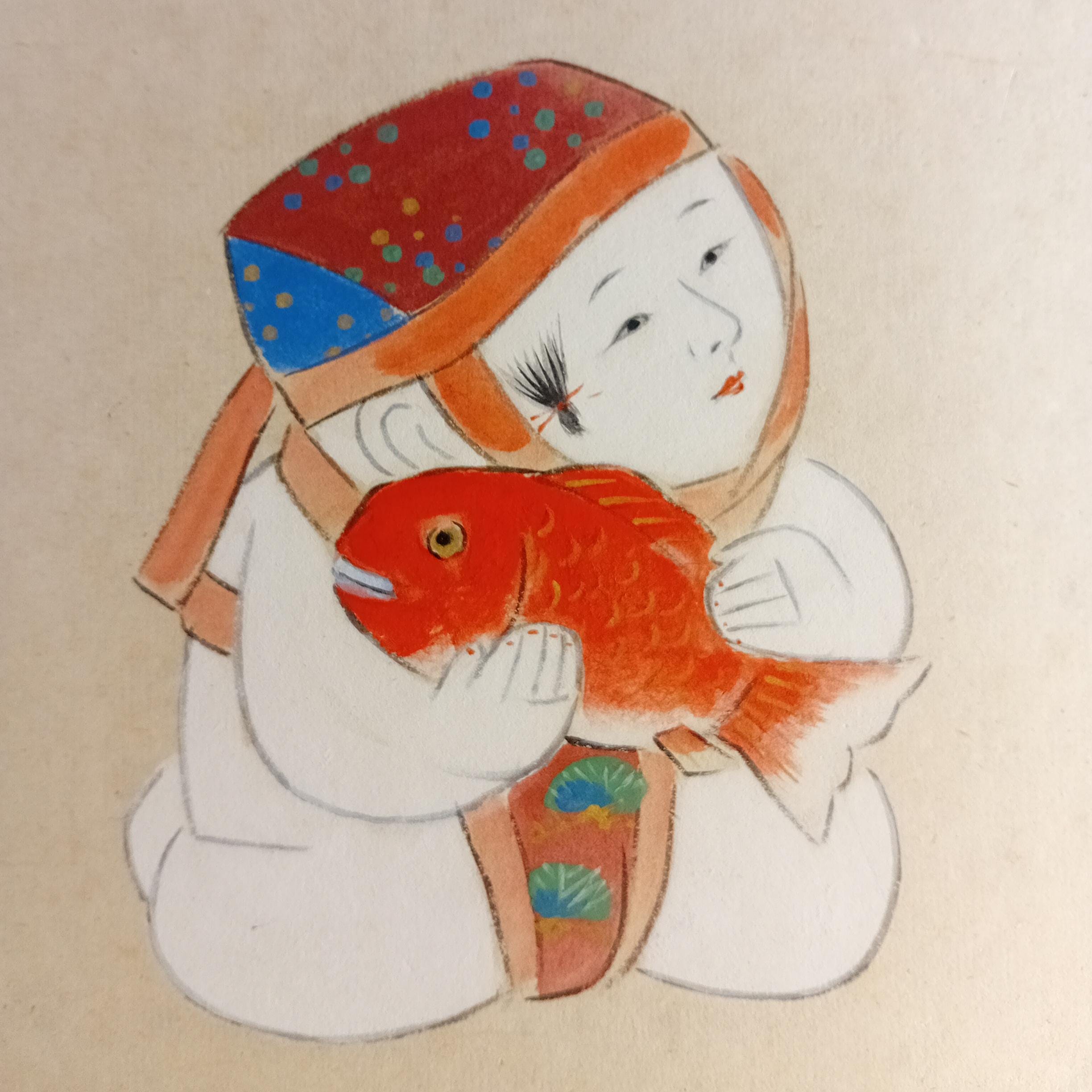 The composition depicts a stylized warabe child holding a red tai fish, a traditional symbol of good fortune and celebration in Japanese culture.