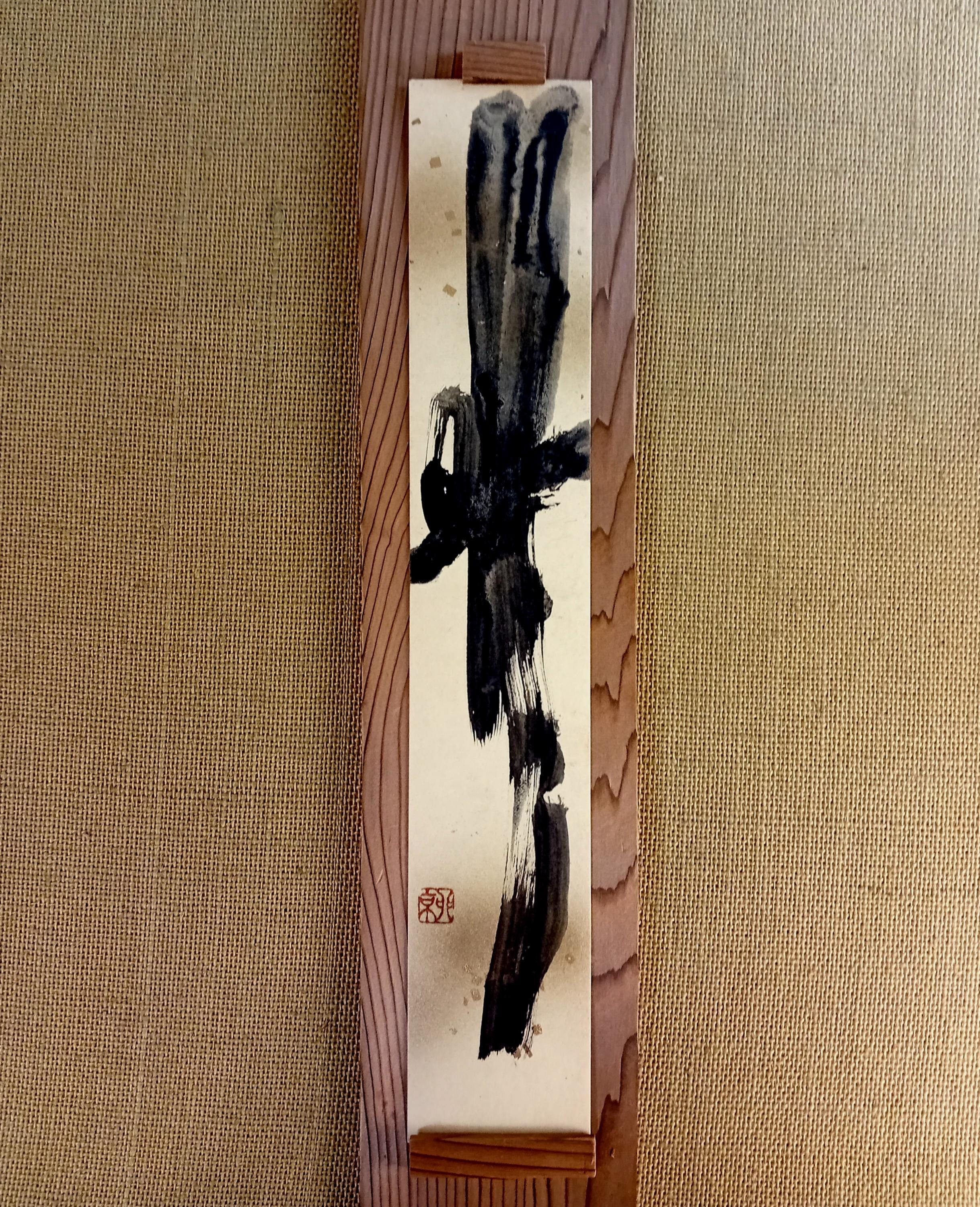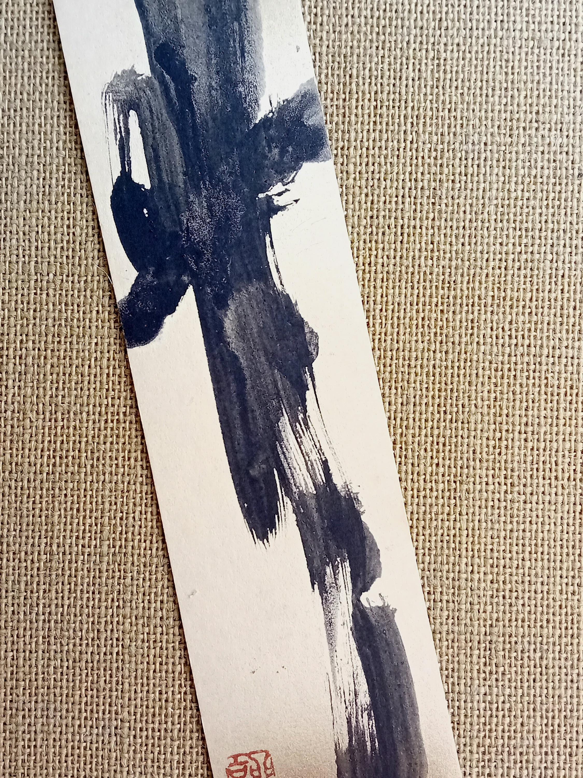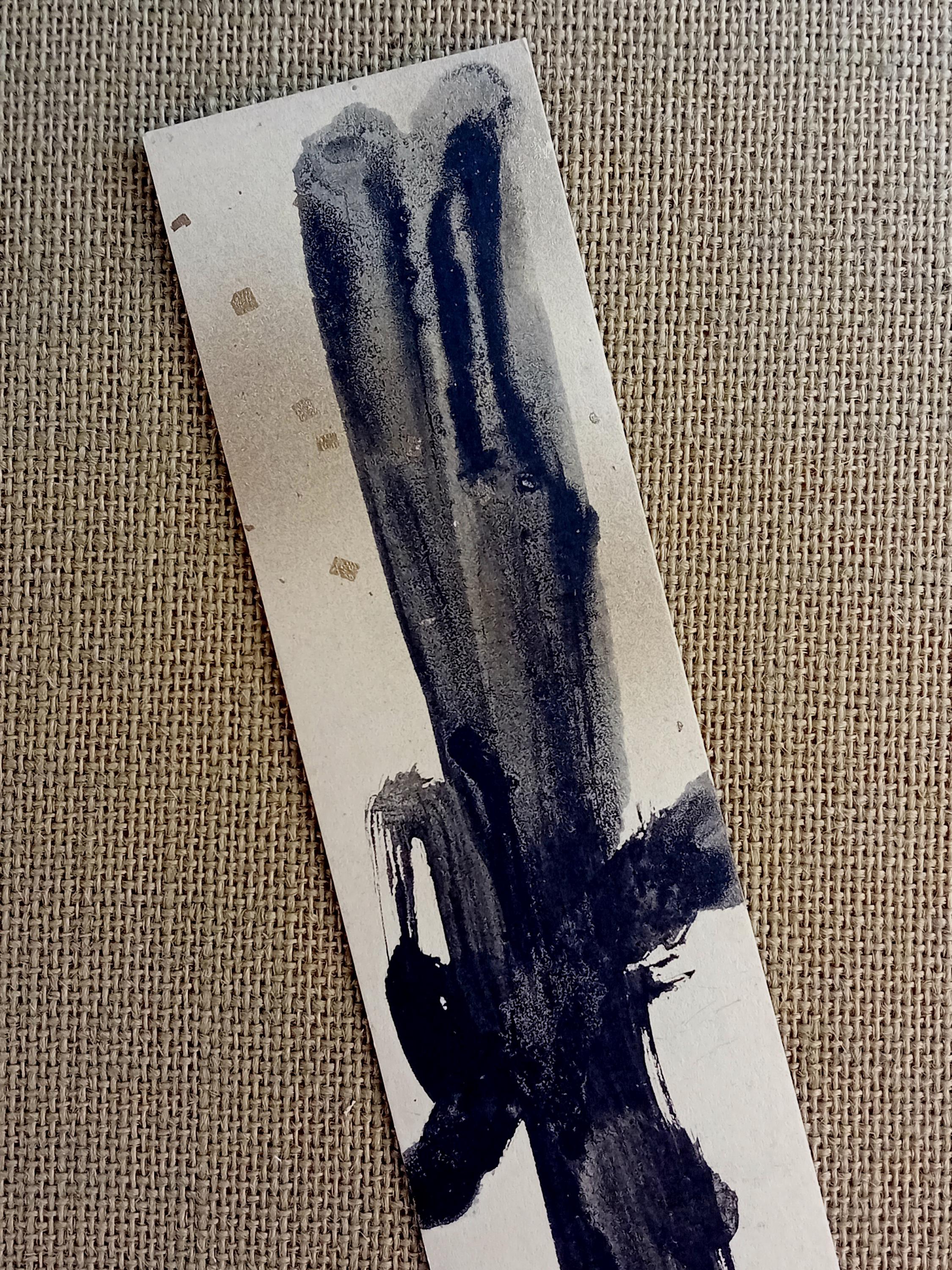 Vintage Japanese tanzaku from the Shōwa period. A vertical calligraphic composition executed in ink with energetic brushwork. The work is created on a thin decorative art board with gold flecks and sparkling inclusions typical of Japanese artistic supports of the Shōwa period. A large calligraphic character is rendered in bold brush strokes. An artist’s seal is present.