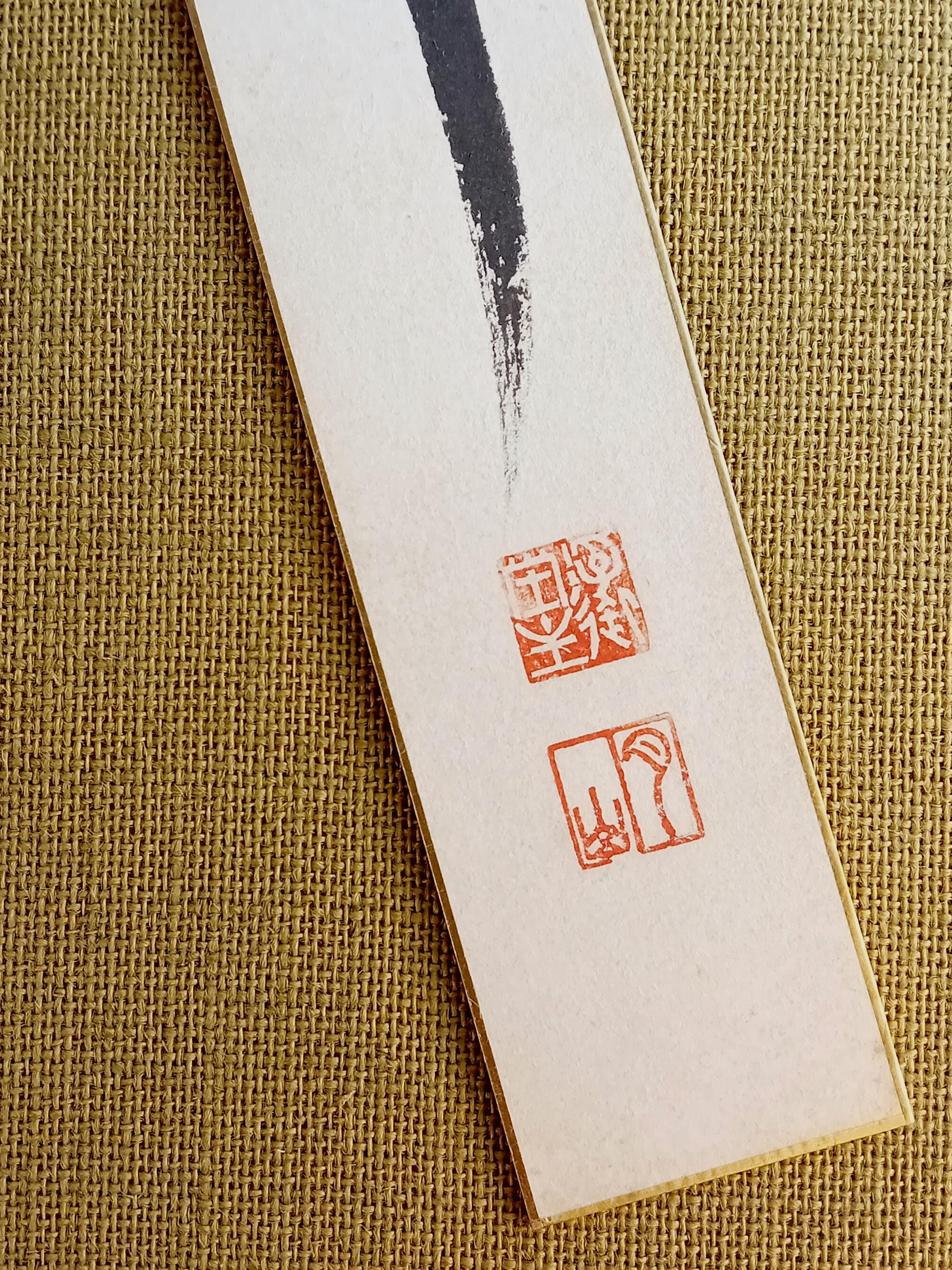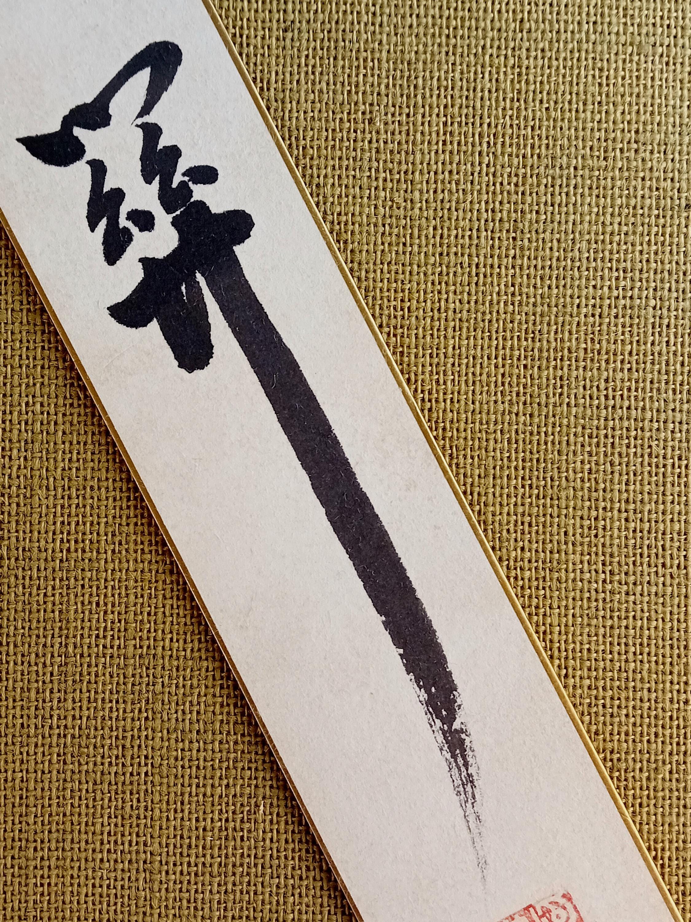 Vintage Japanese tanzaku from the Shōwa period. A vertical calligraphic composition executed in ink with free brushwork. Red artist’s seals are present.