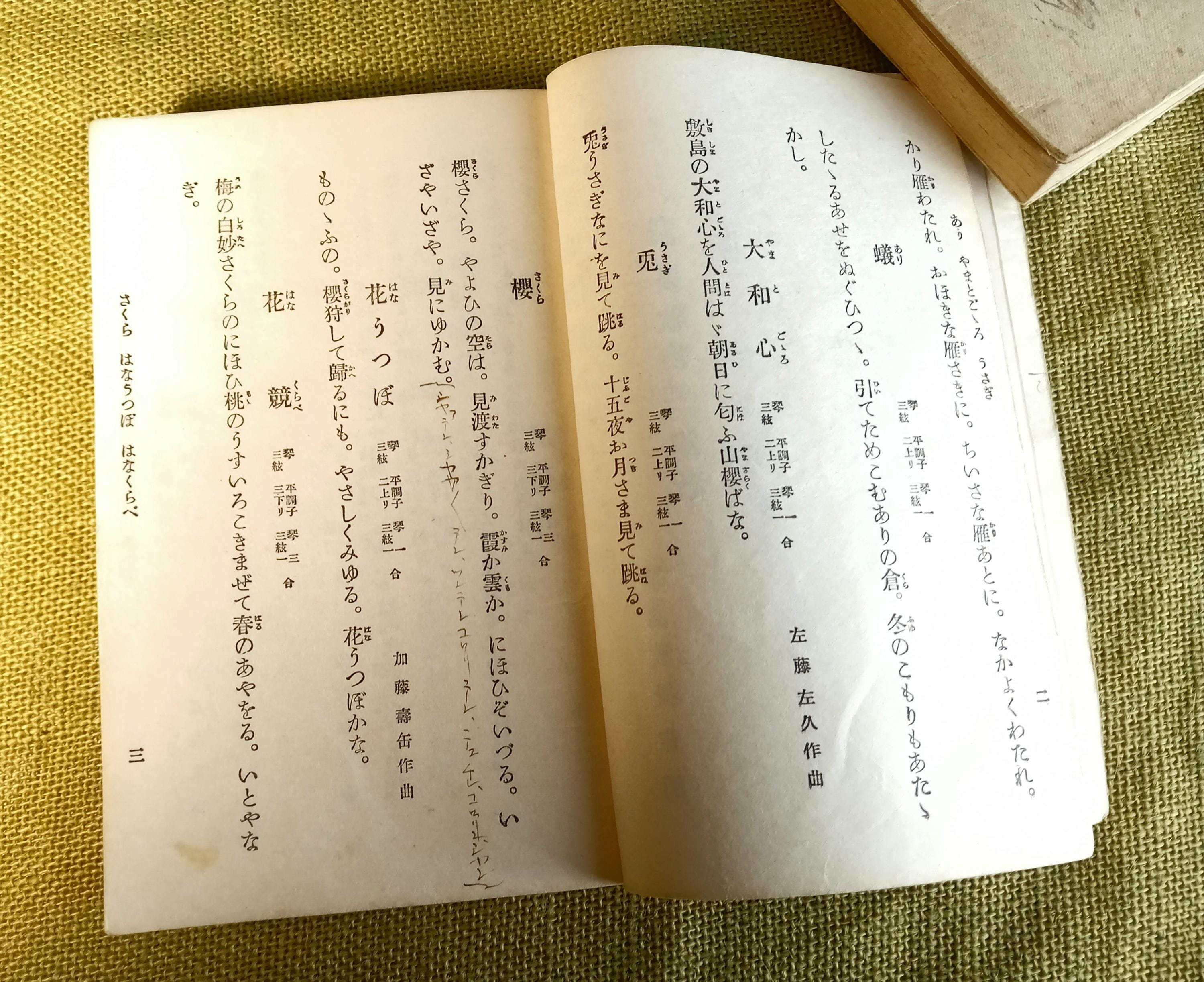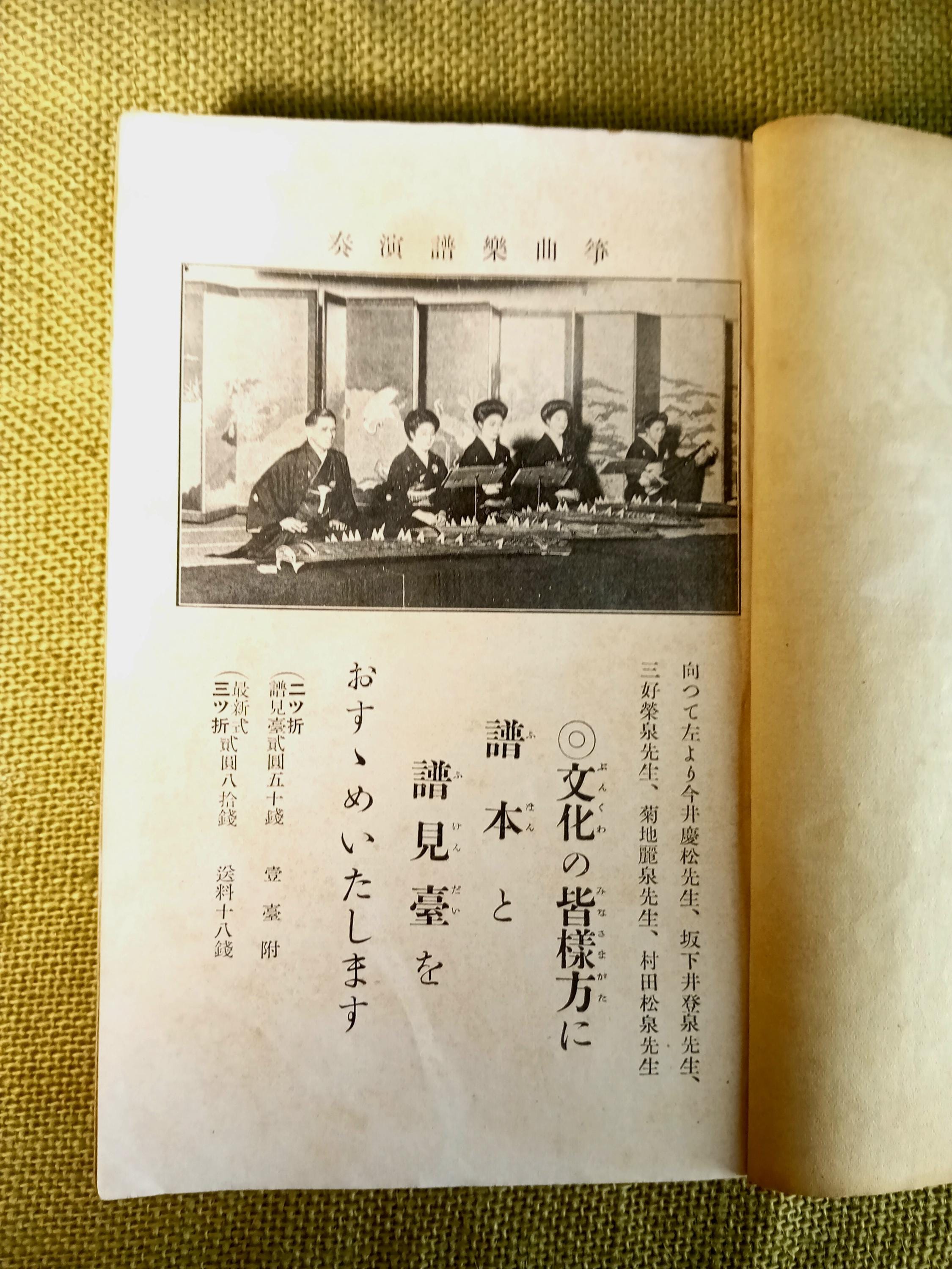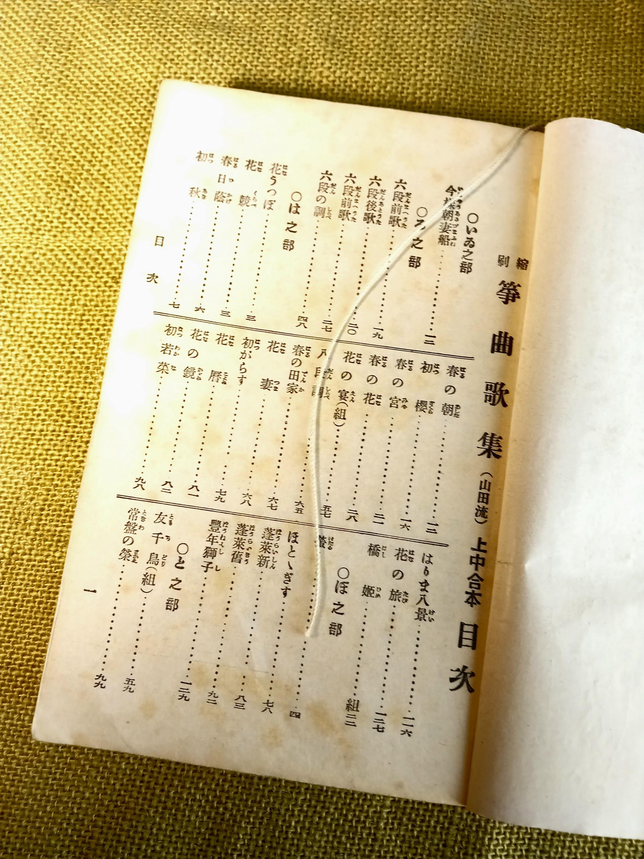 Inside are song texts, musical notations, tuning references, and repertoire sections for practice and home study. Prepared by a koto teaching society.