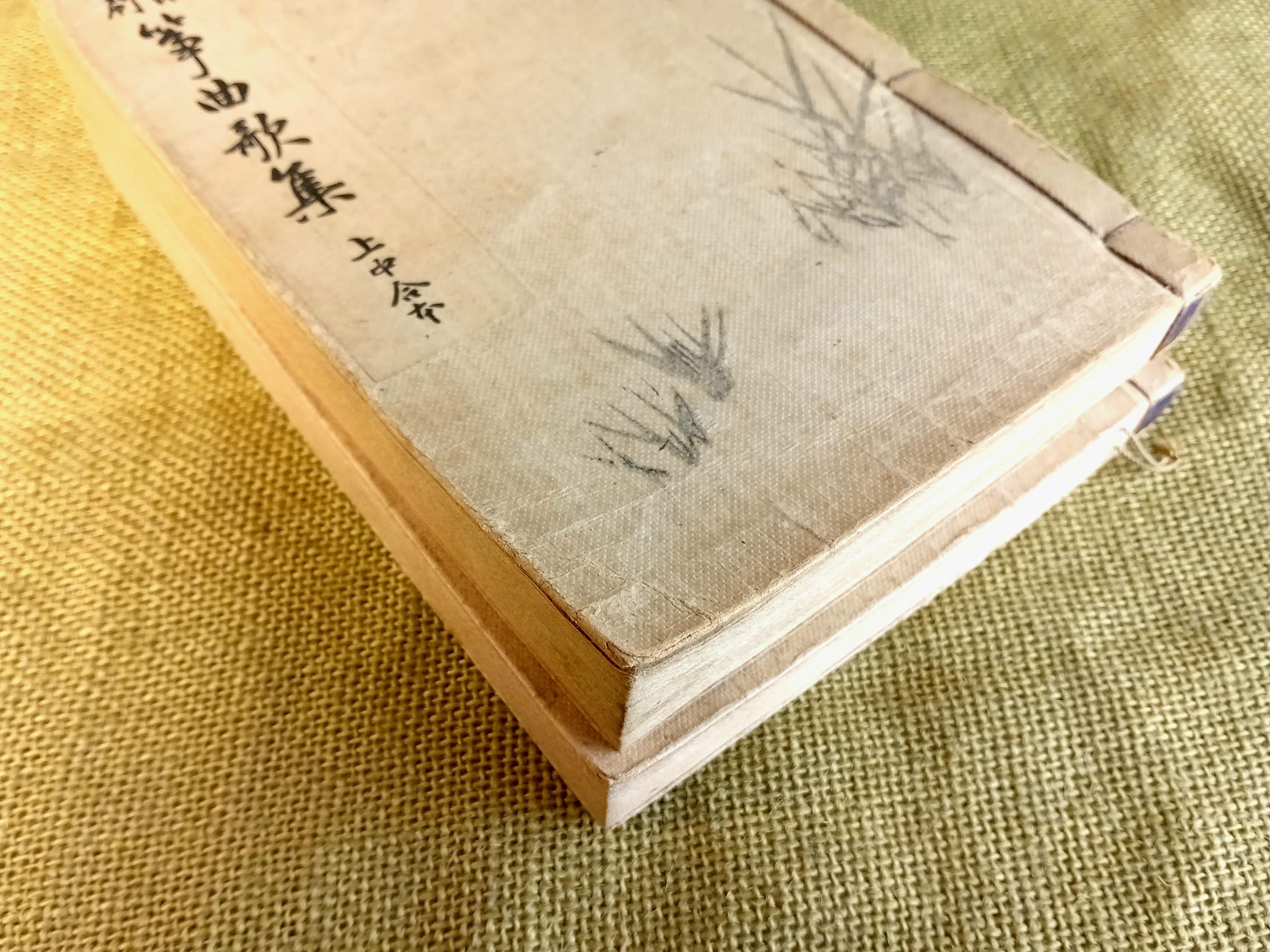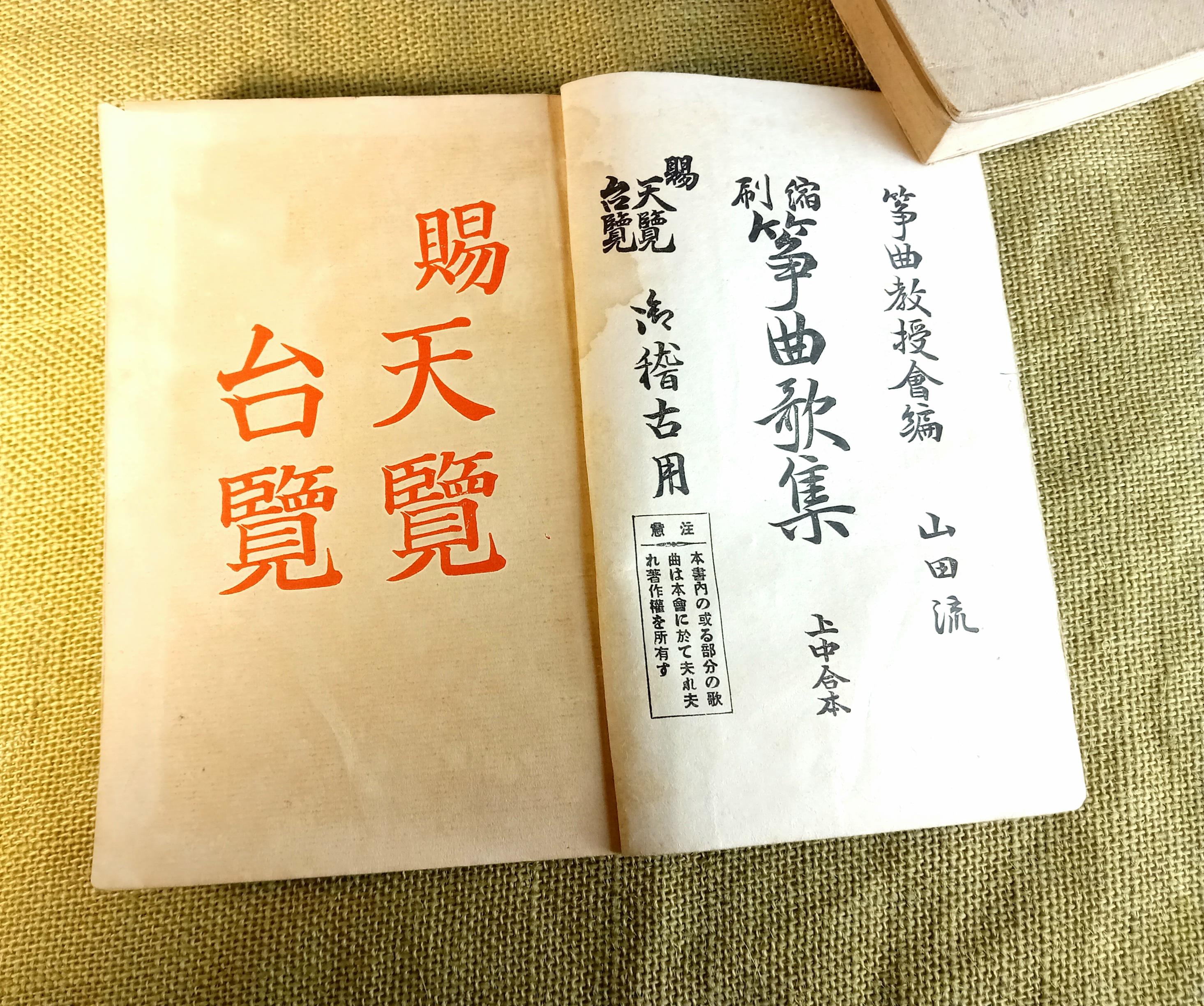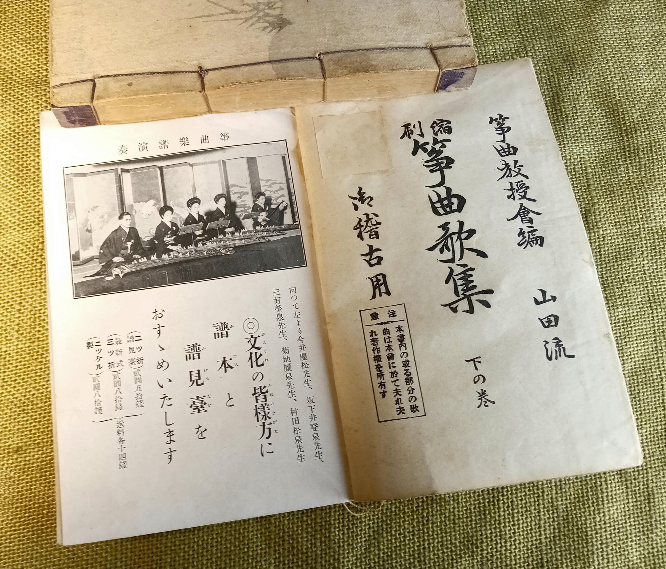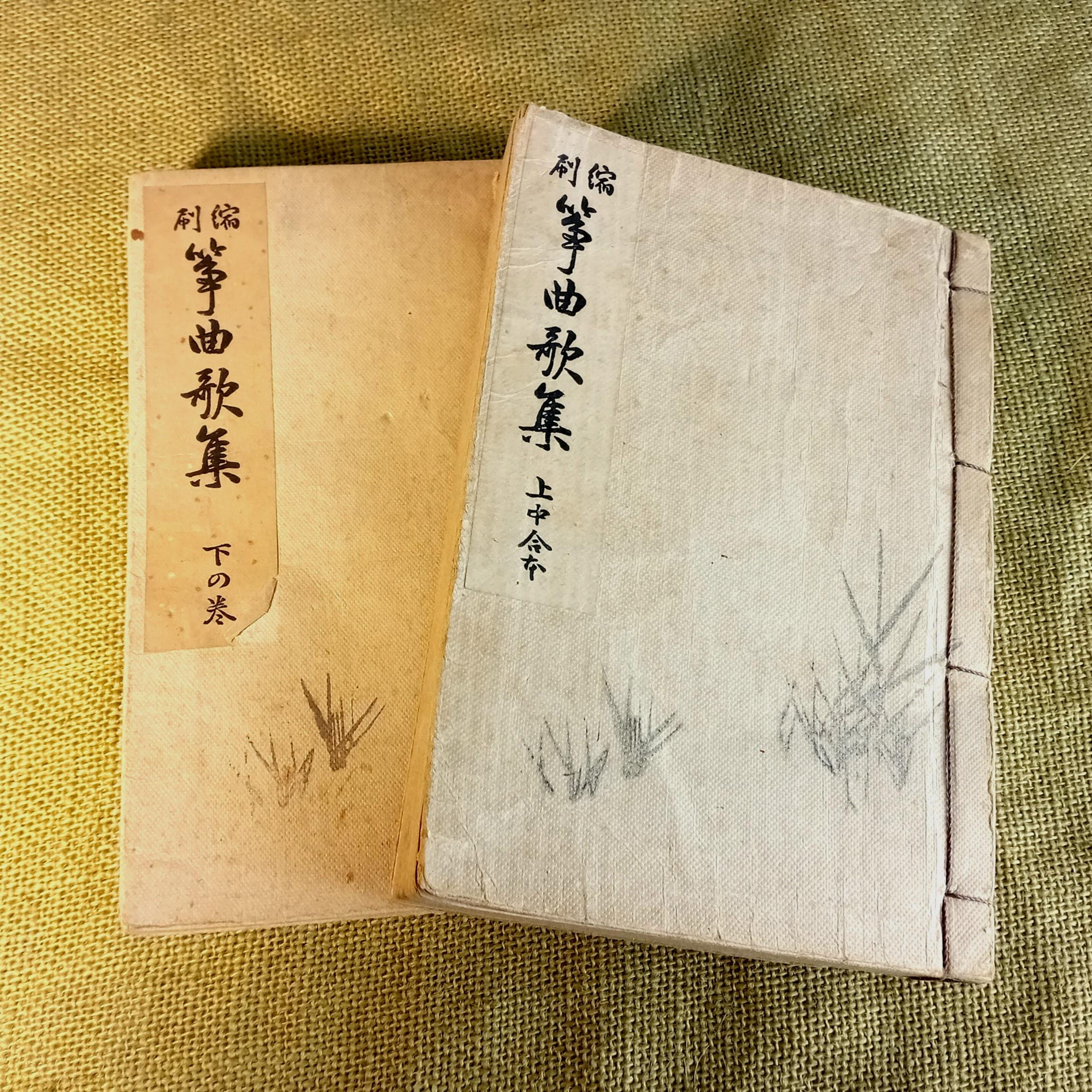 Original set of two Japanese music and song books for study and performance in the Yamada school tradition. Complete set: combined upper and middle volume, plus lower volume. Printed study and repertoire edition from the Taisho-Shōwa period.