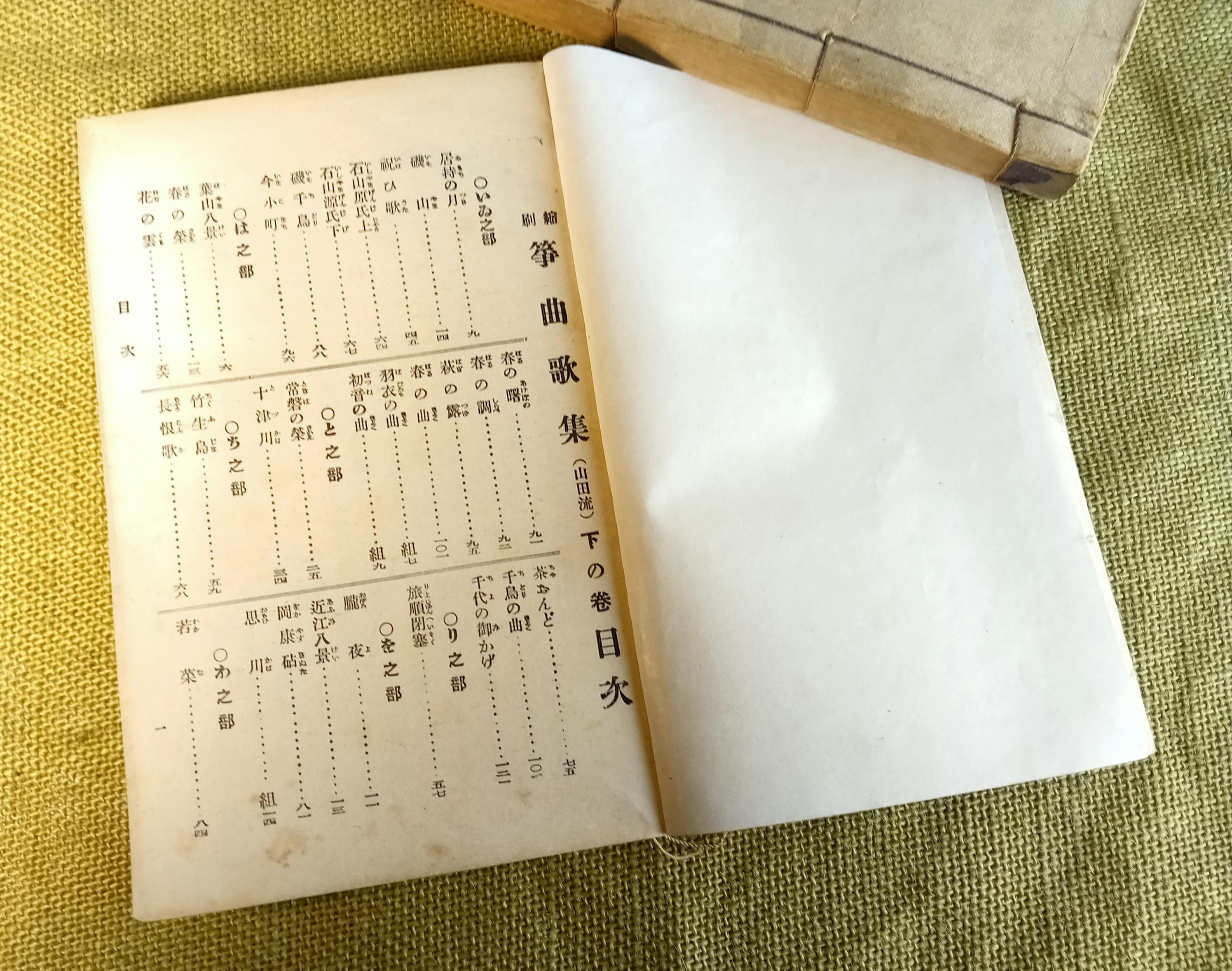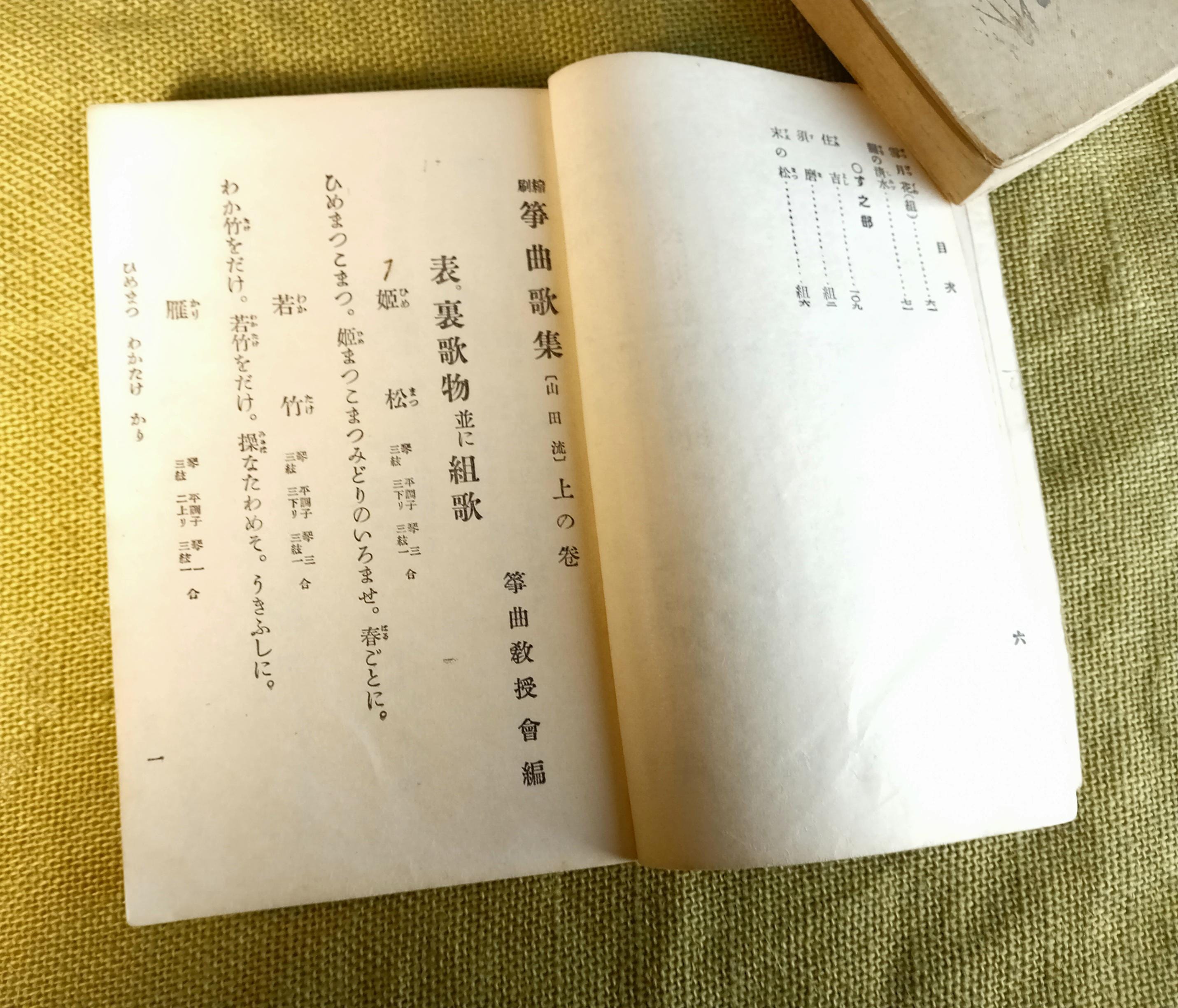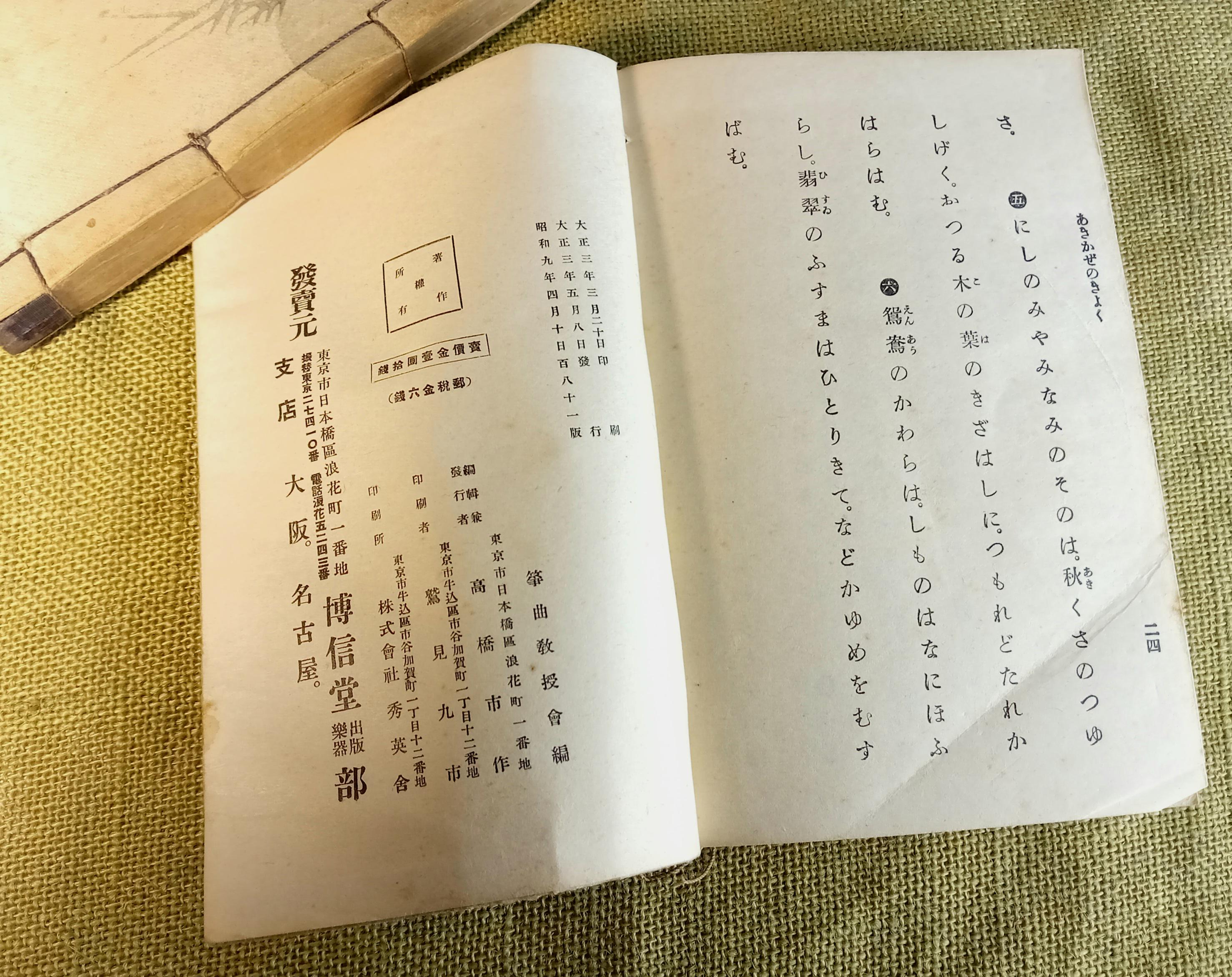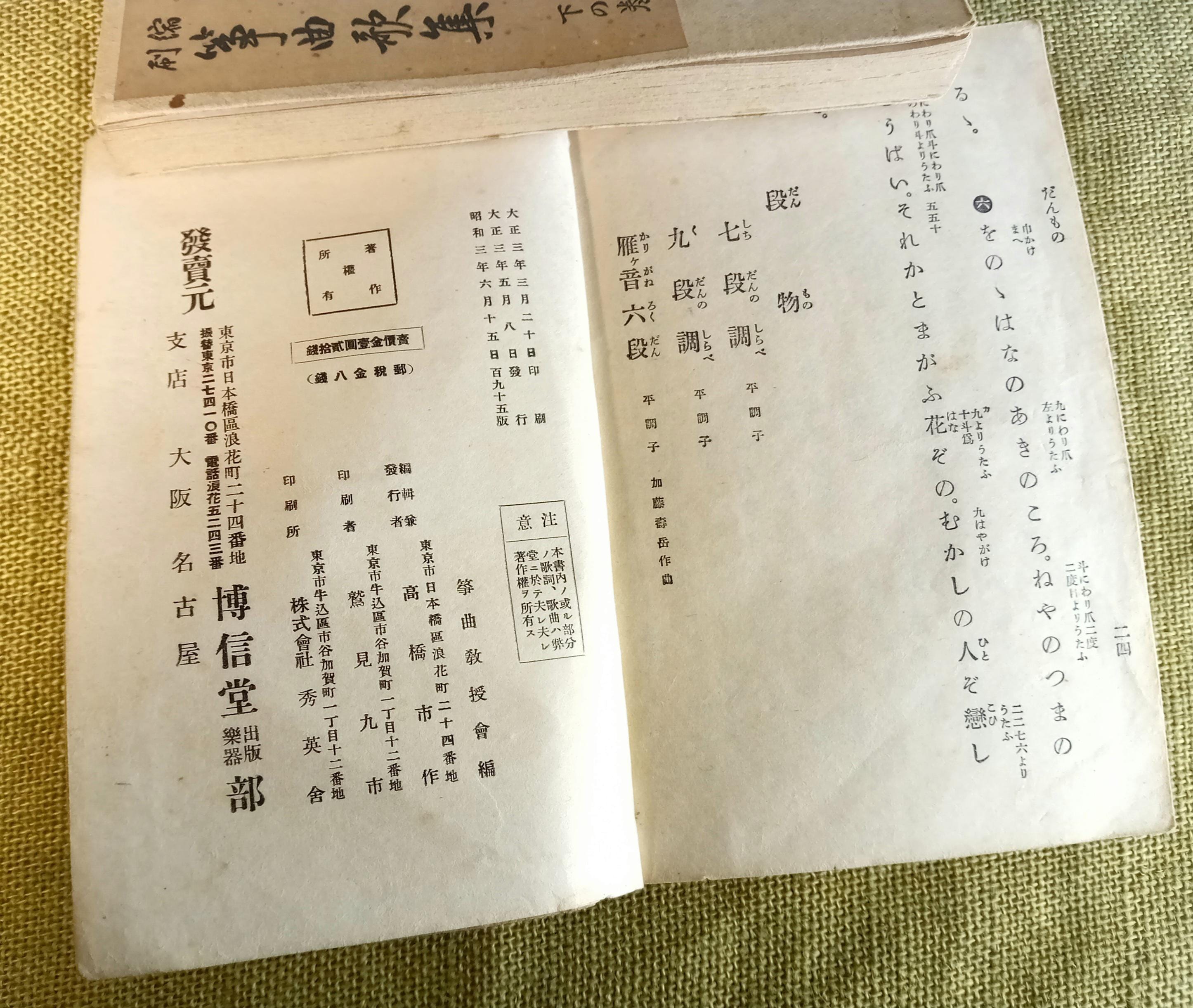 Original set of two Japanese music and song books for study and performance in the Yamada school tradition. Complete set: combined upper and middle volume, plus lower volume. Printed study and repertoire edition from the Taisho-Shōwa period.