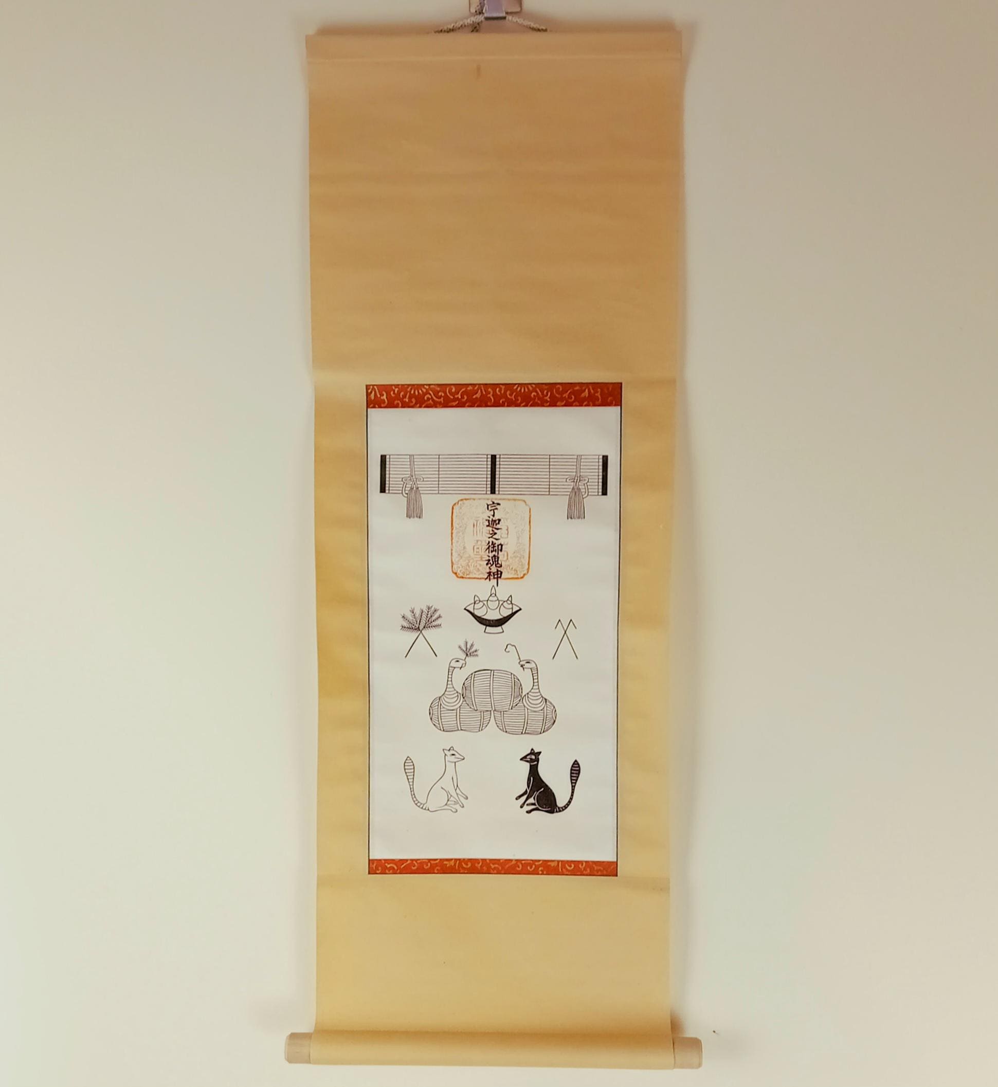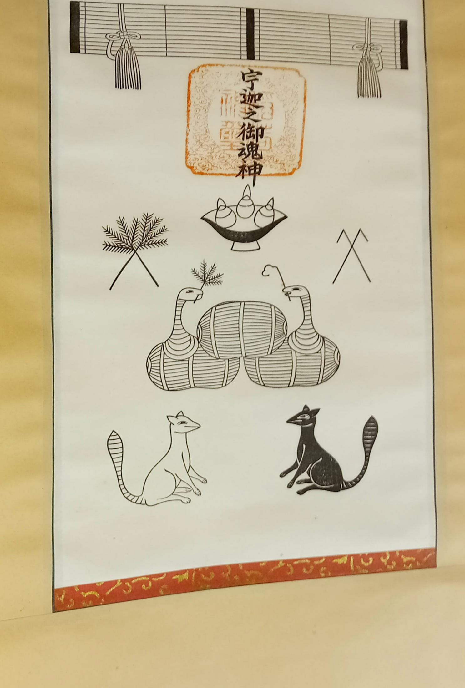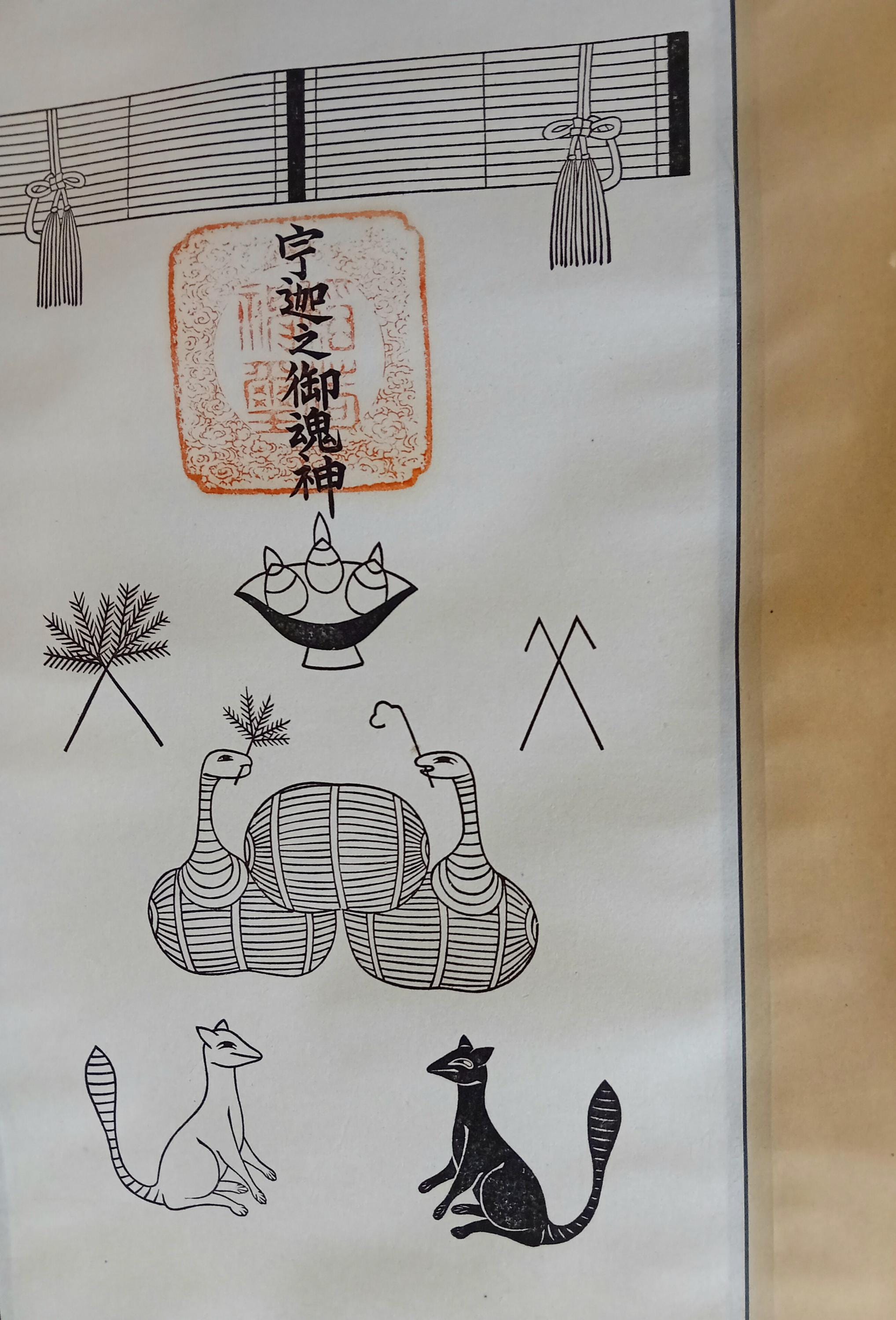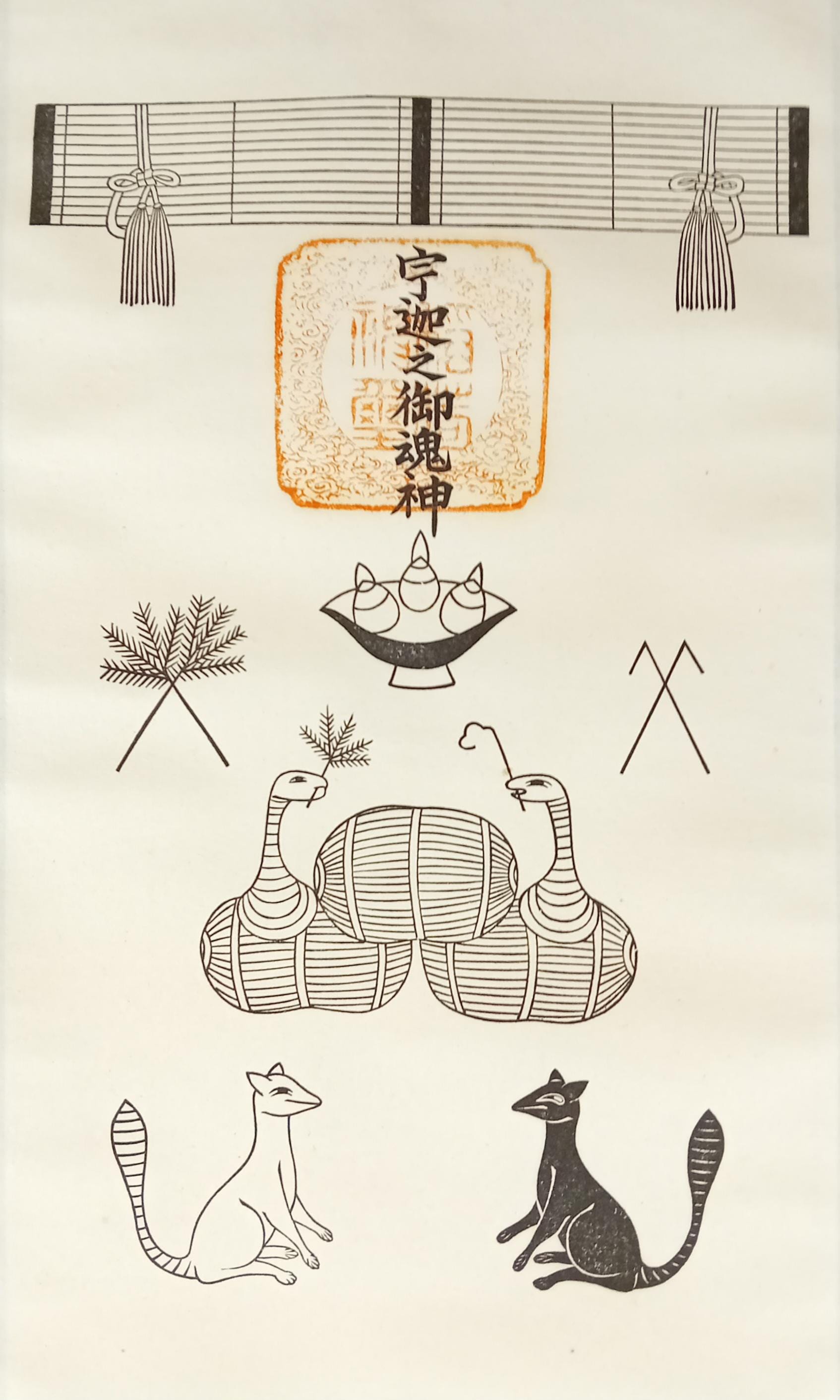 The image includes Inari foxes, rice bales, and the name of a Shinto deity.