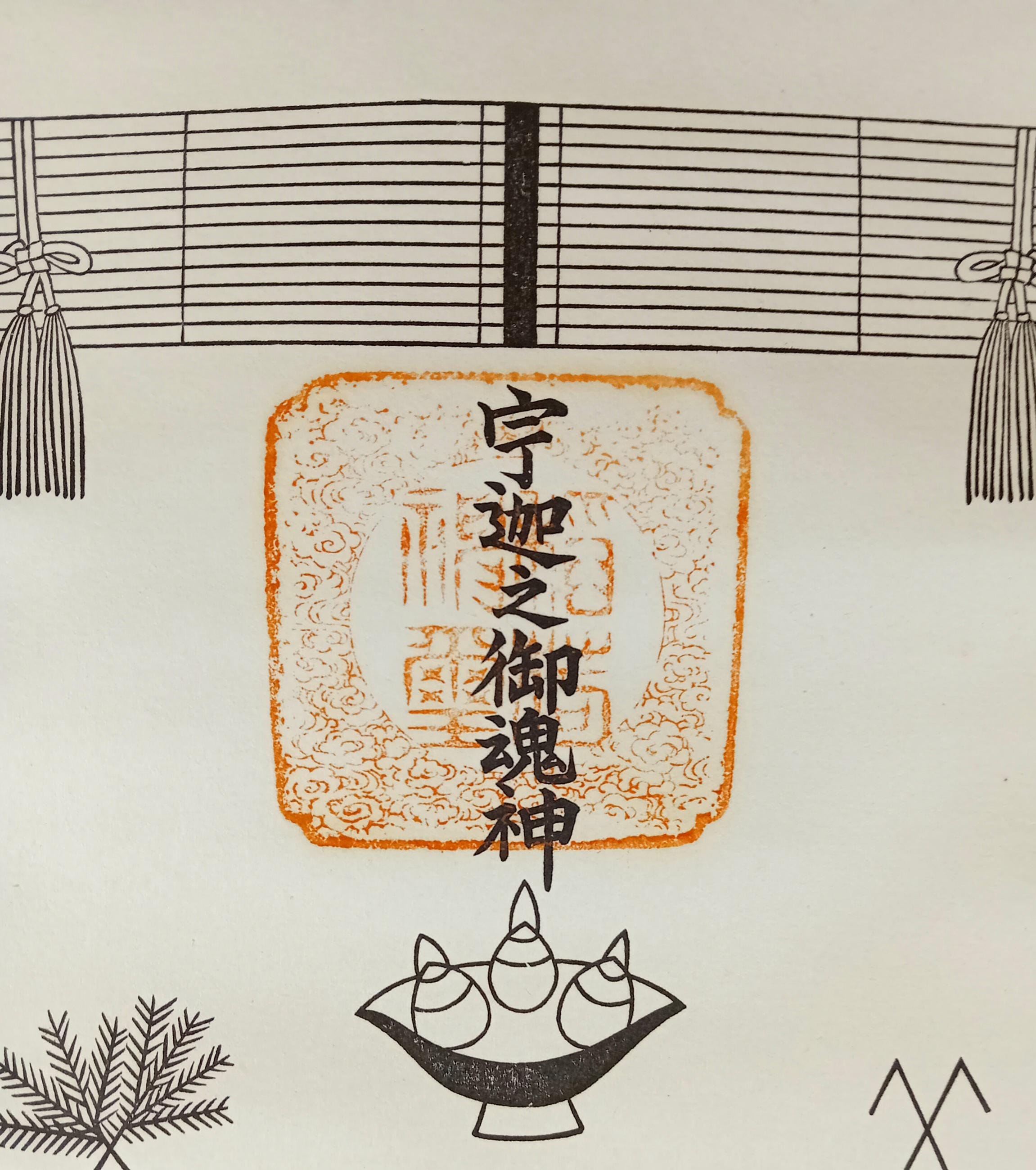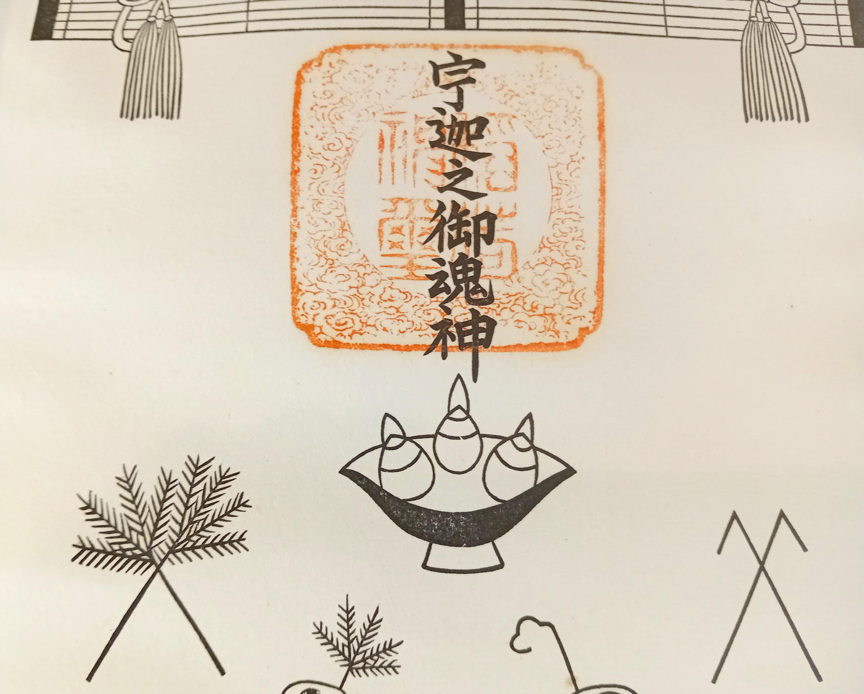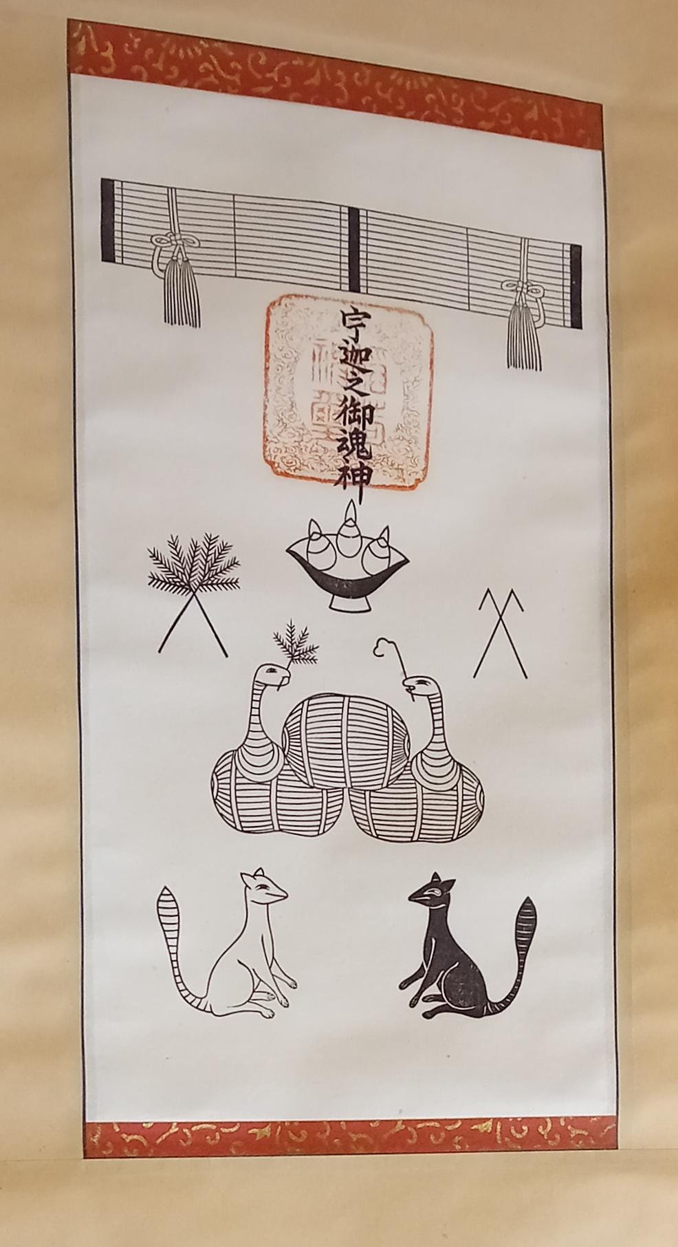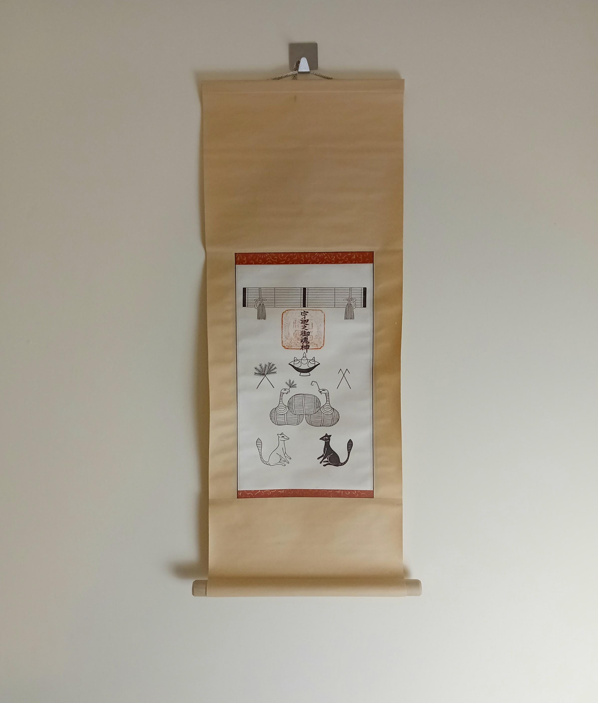 The image includes Inari foxes, rice bales, and the name of a Shinto deity.