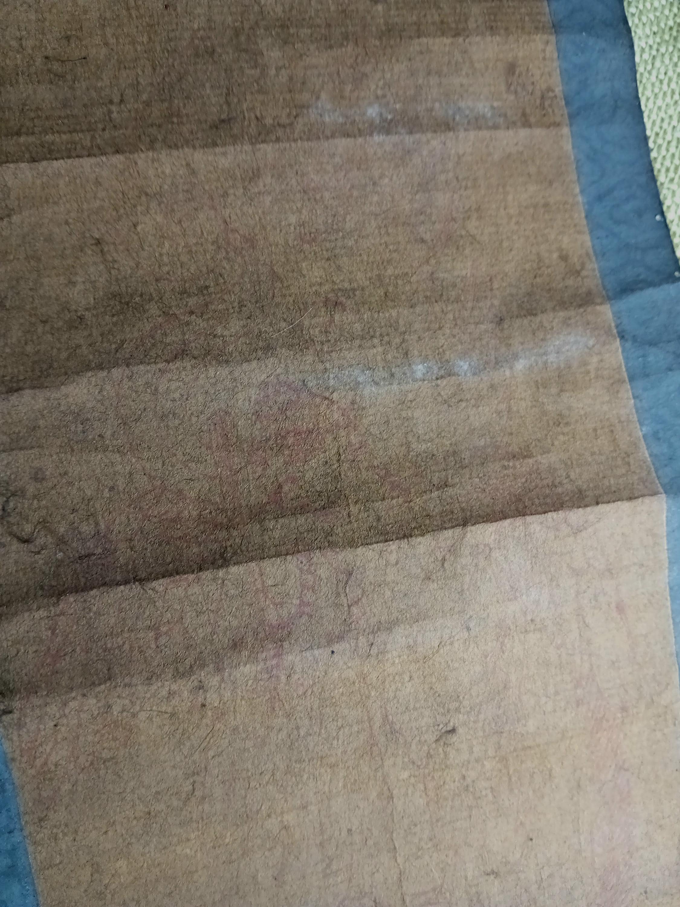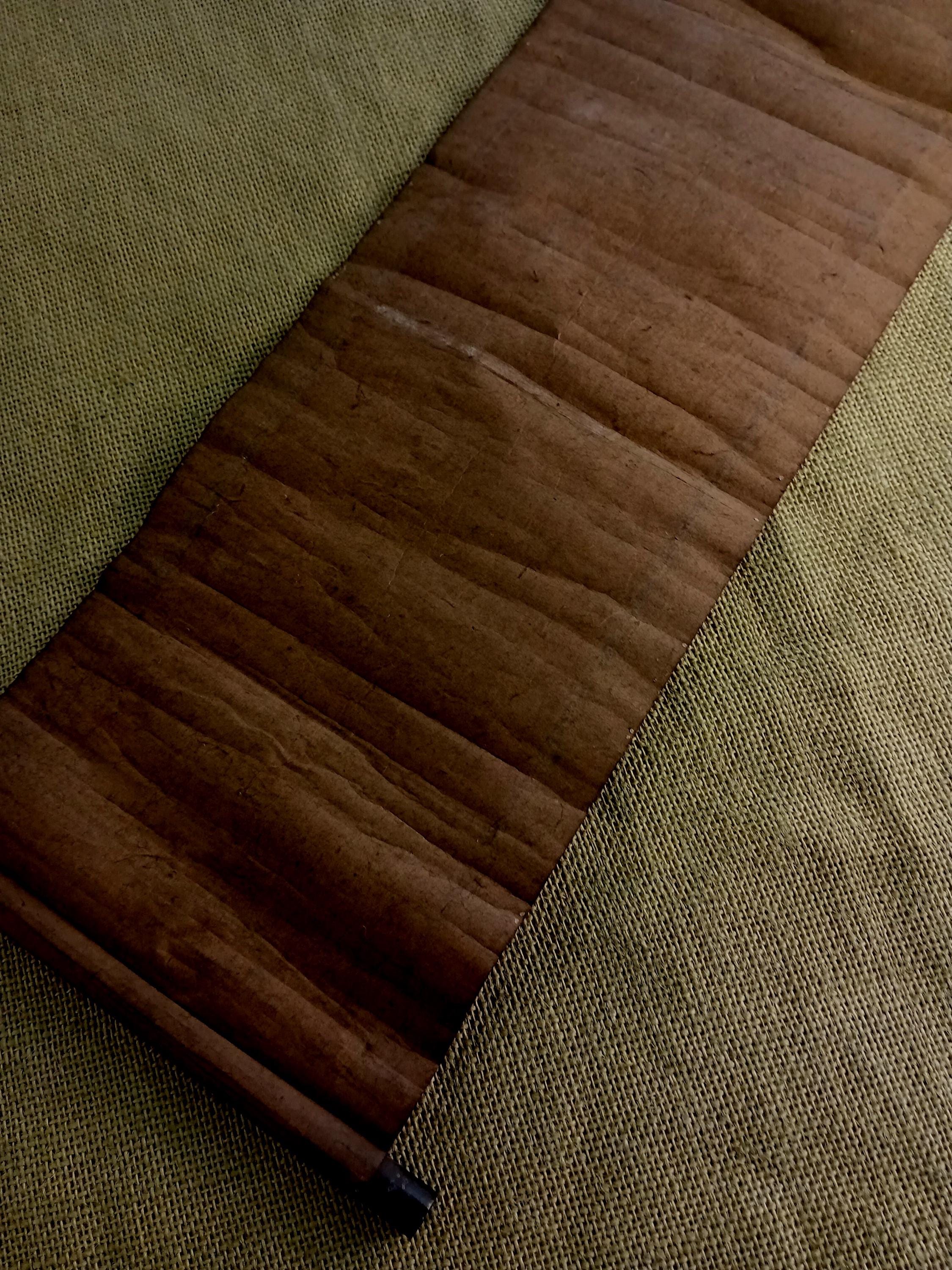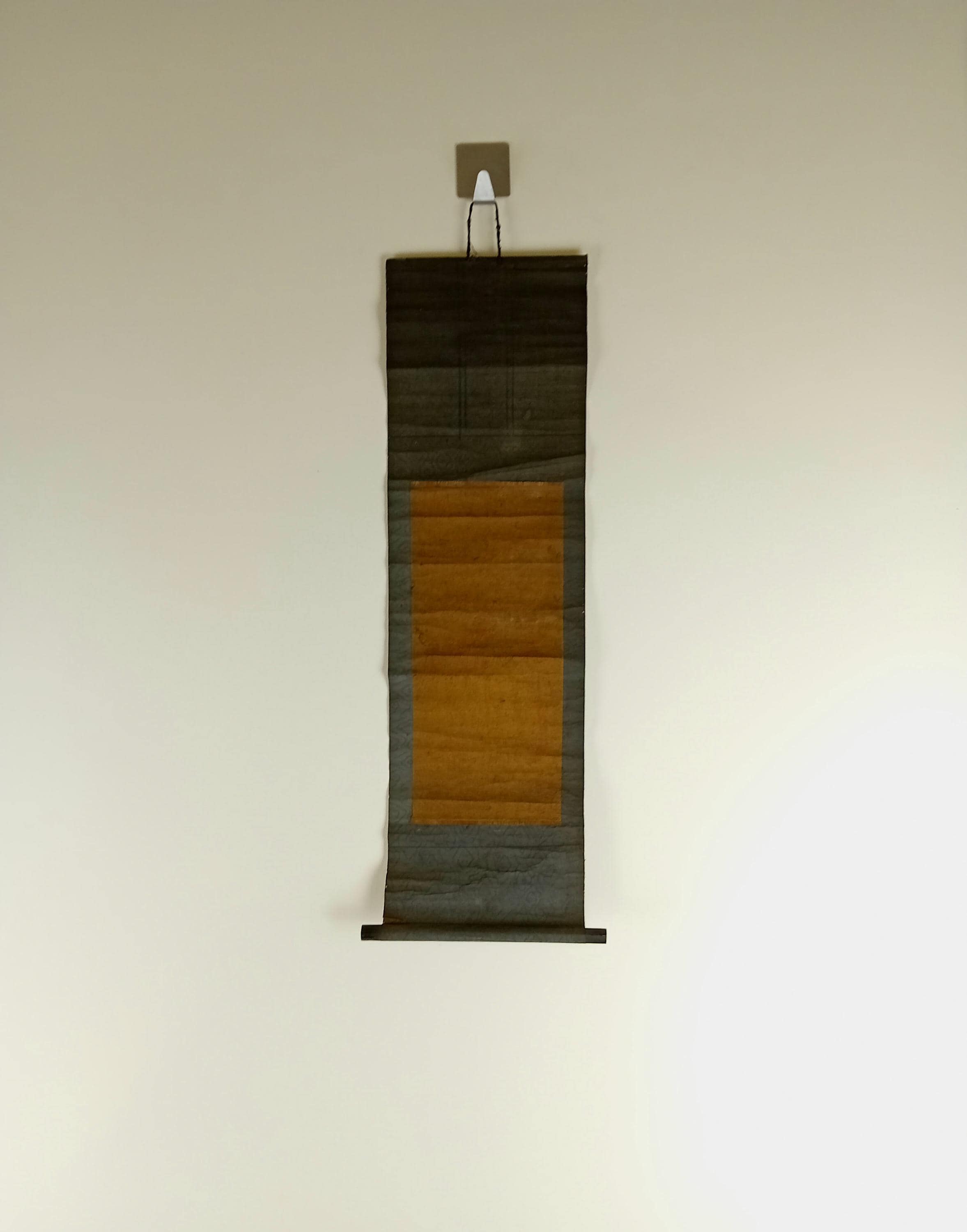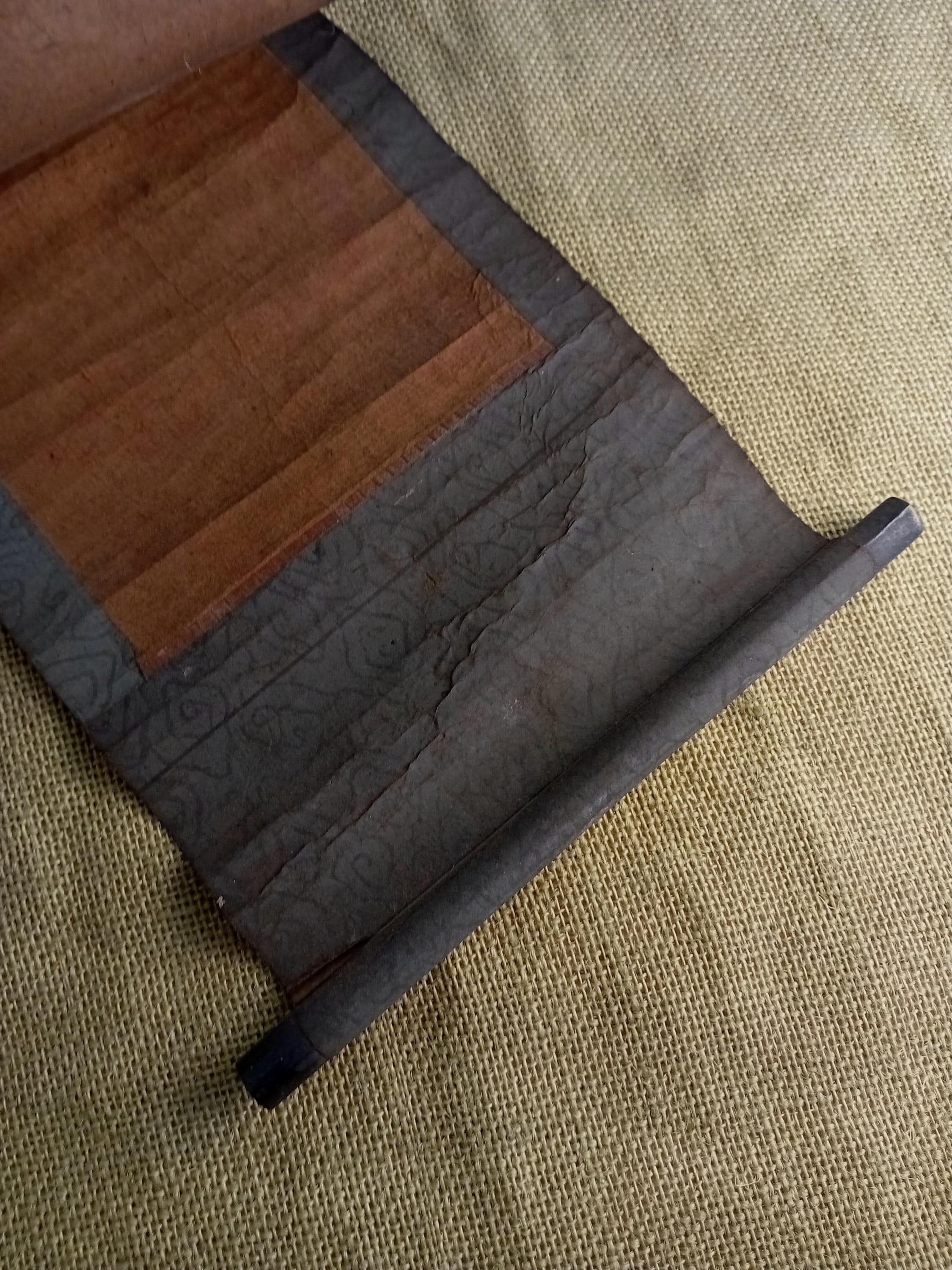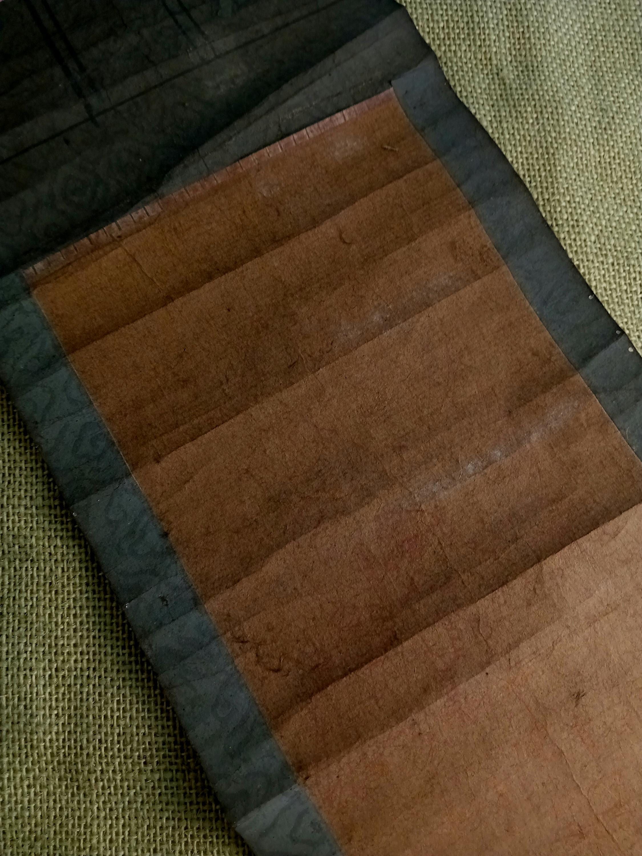 Japanese temple kakemono (kakejiku), Edo - Meiji period, in a rare ultra small format. The central image is now preserved only very faintly and reads as a residual silhouette. The work belongs to the Japanese tradition of small temple and domestic protective images.