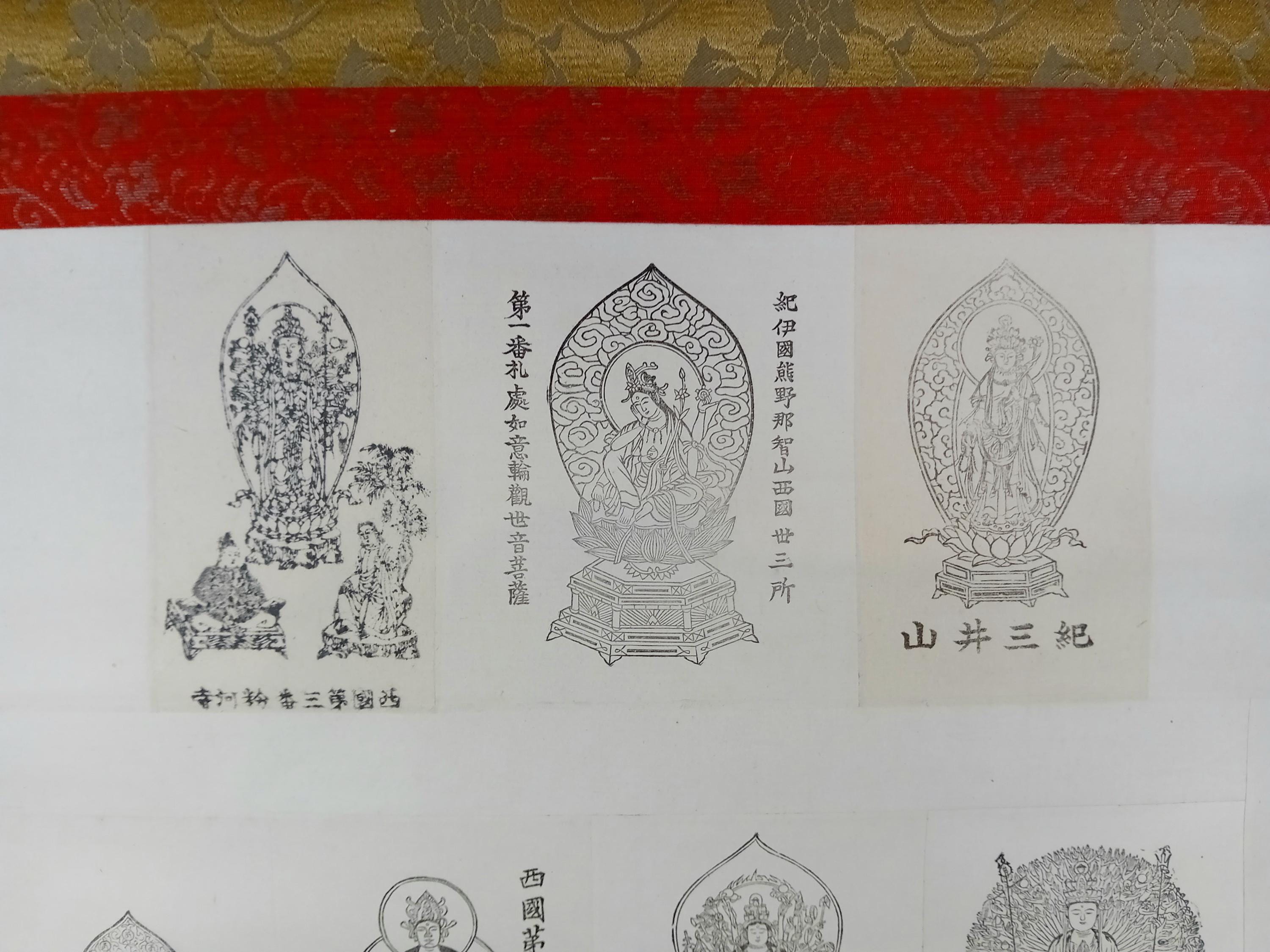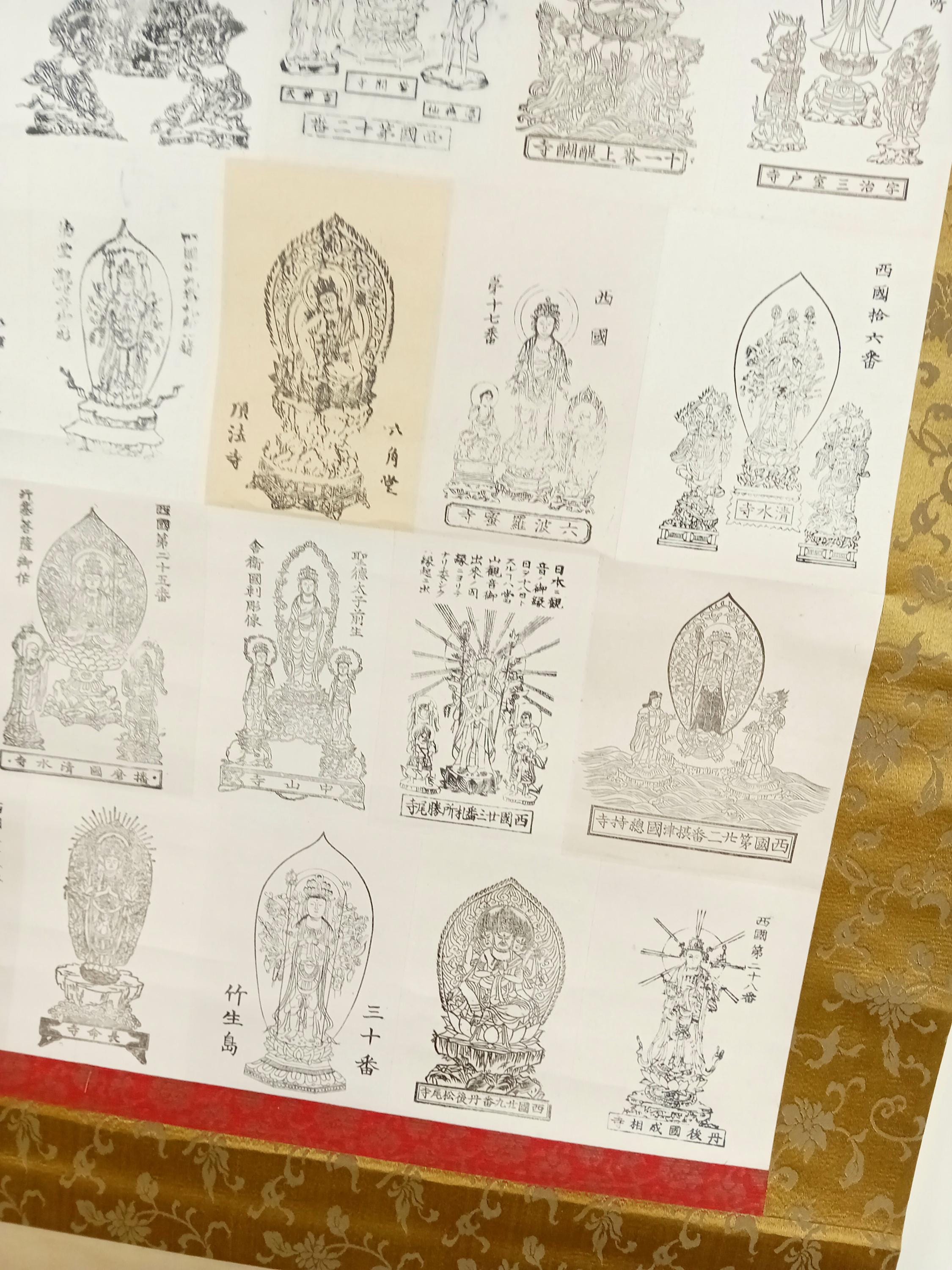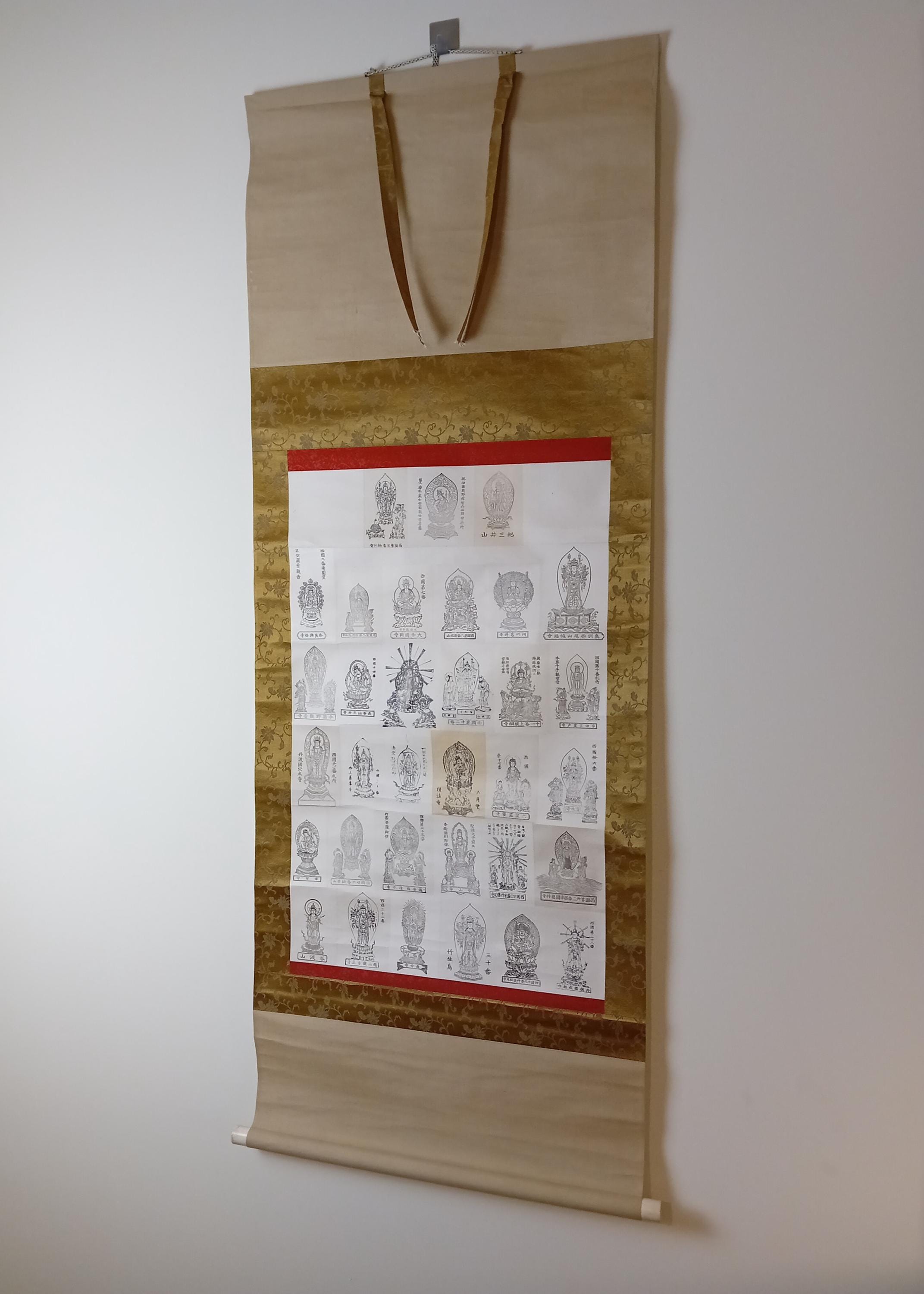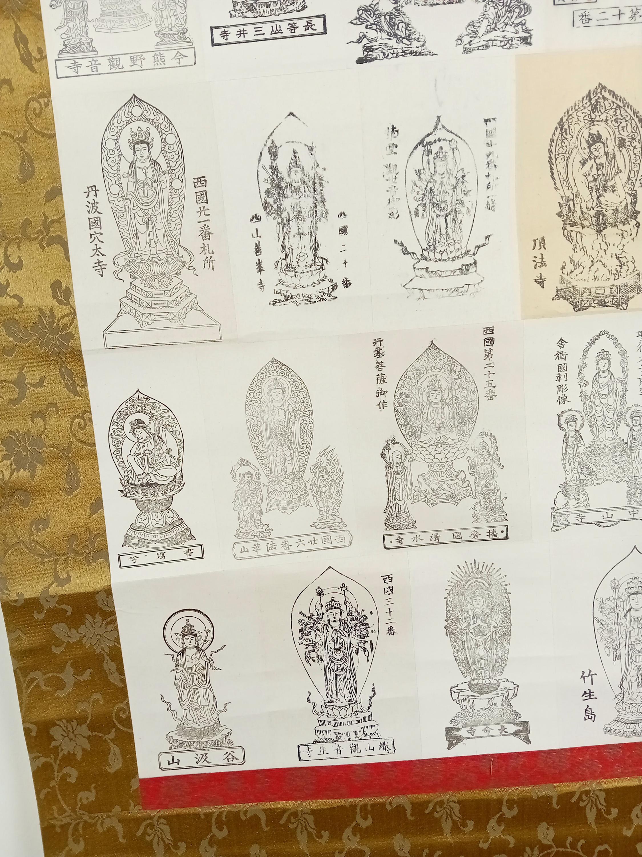 Japanese temple kakemono (kakejiku) from the Shōwa period with a central printed sheet composed of multiple small images of Buddhist figures with captions.