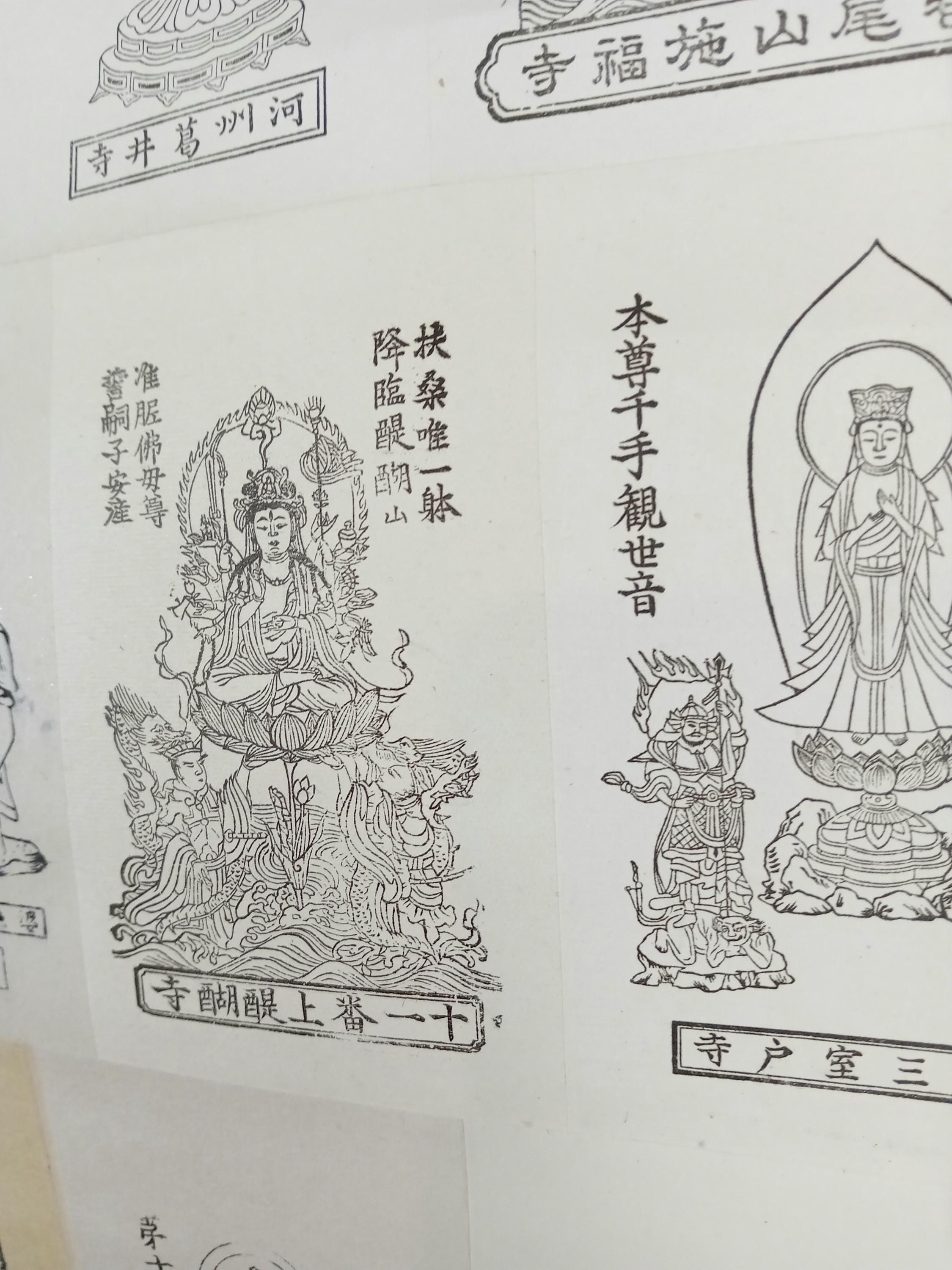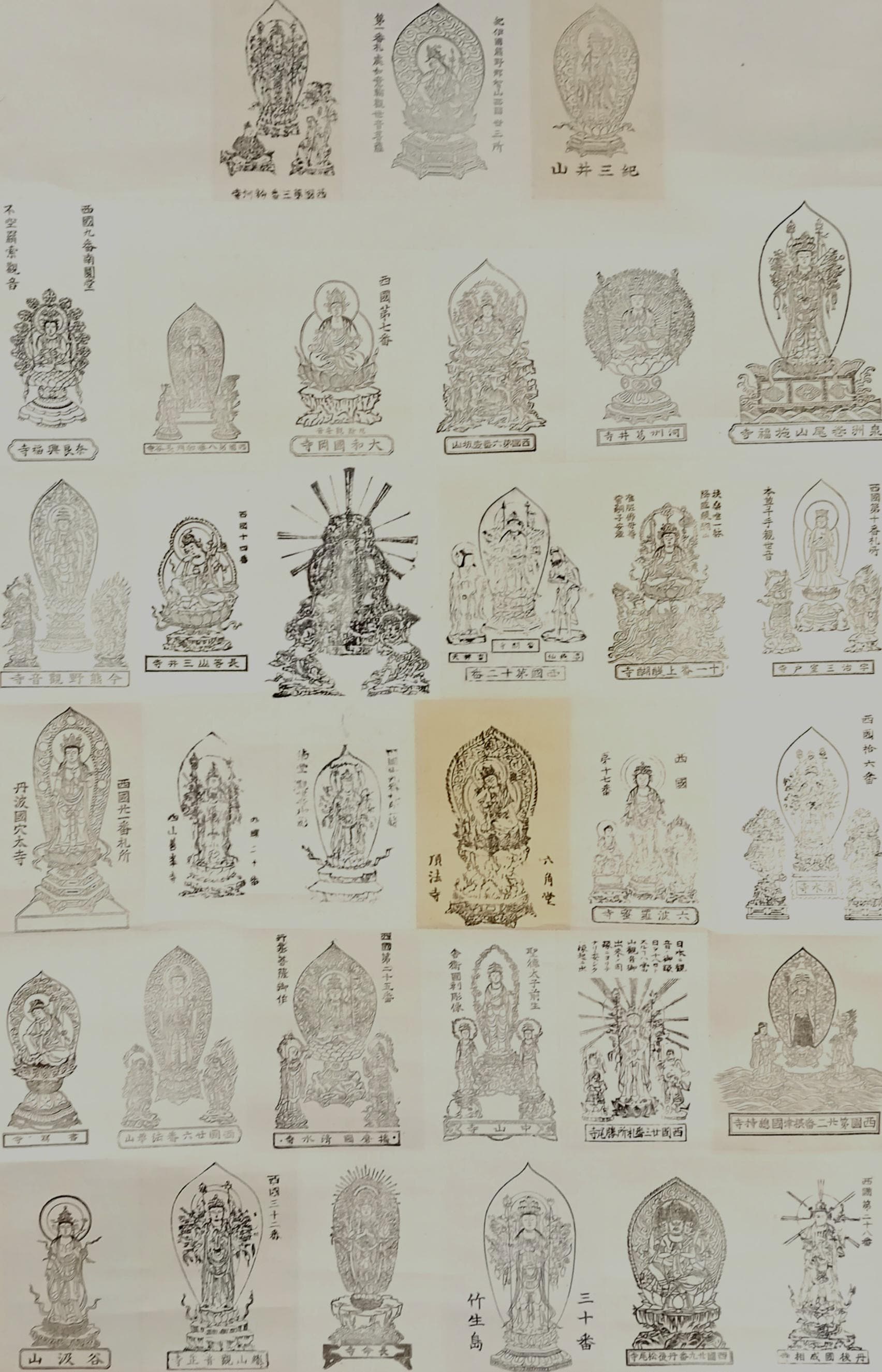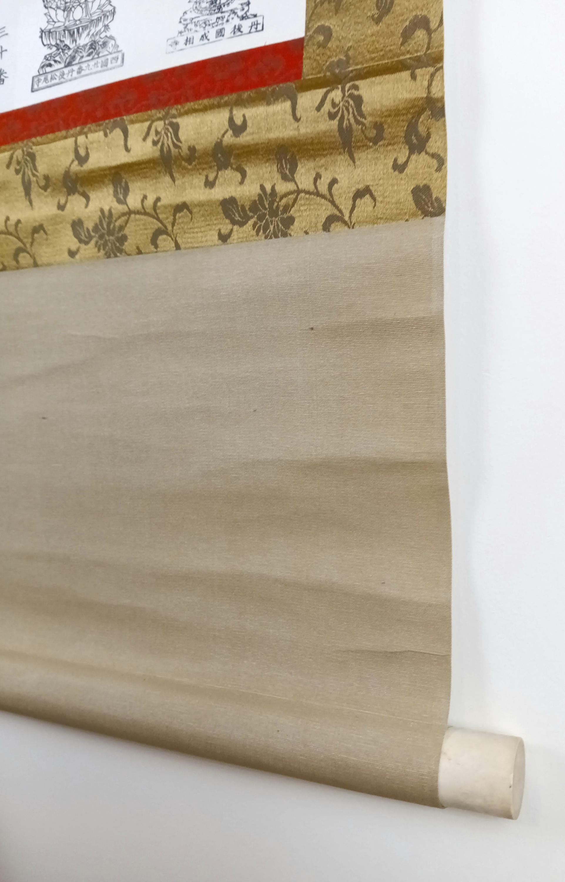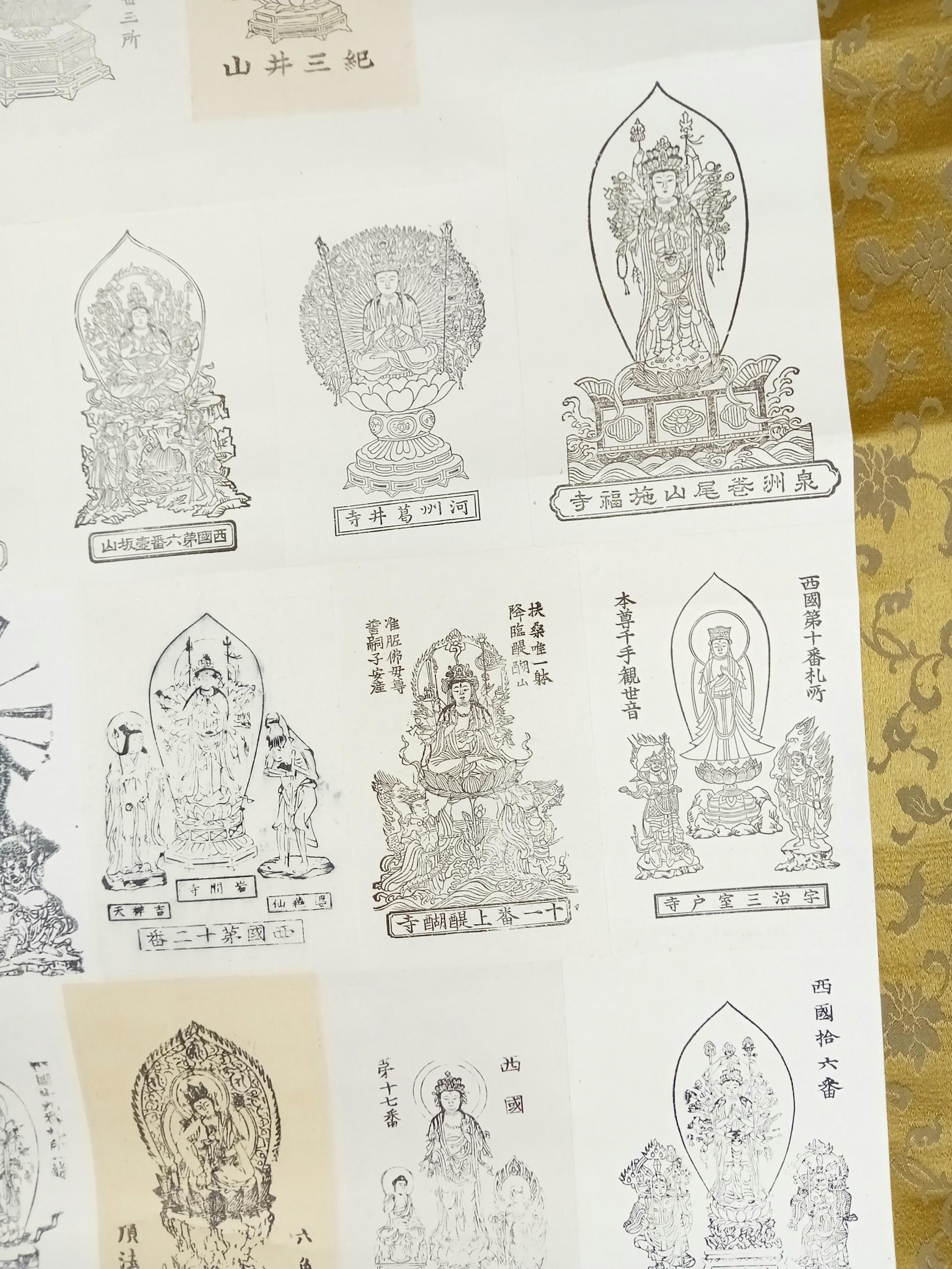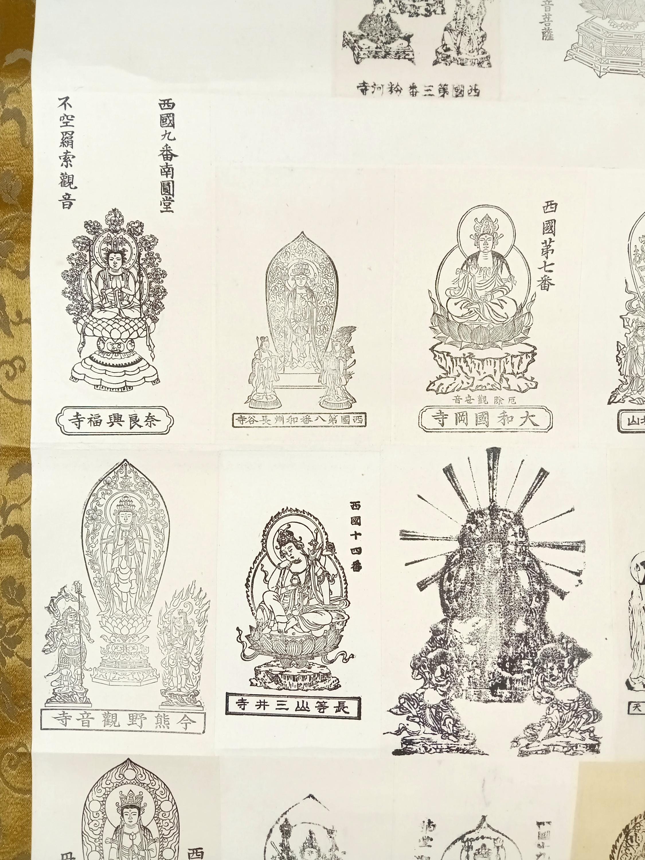 Japanese temple kakemono (kakejiku) from the Shōwa period with a central printed sheet composed of multiple small images of Buddhist figures with captions.