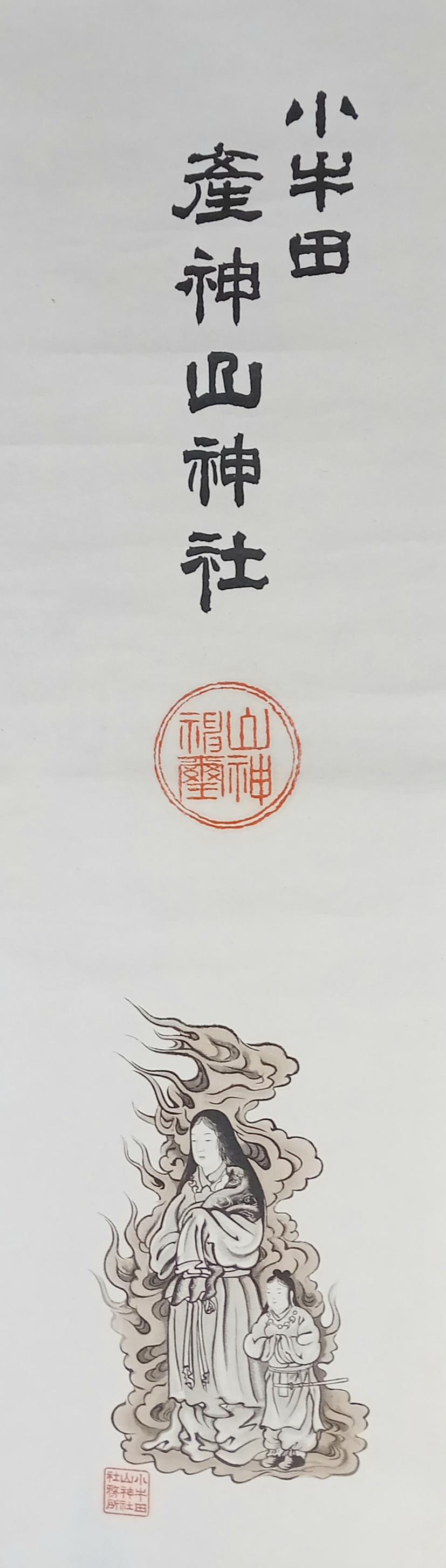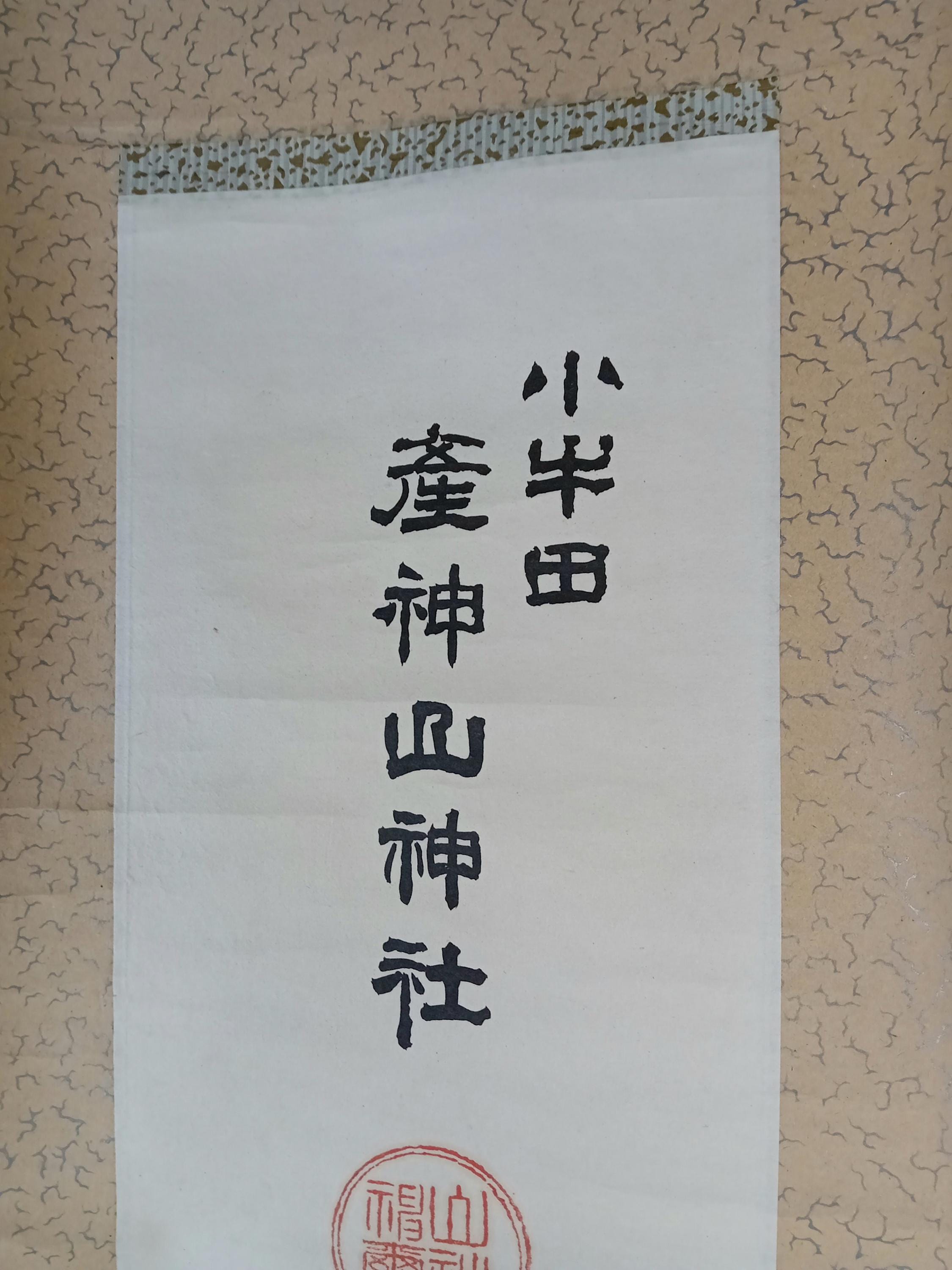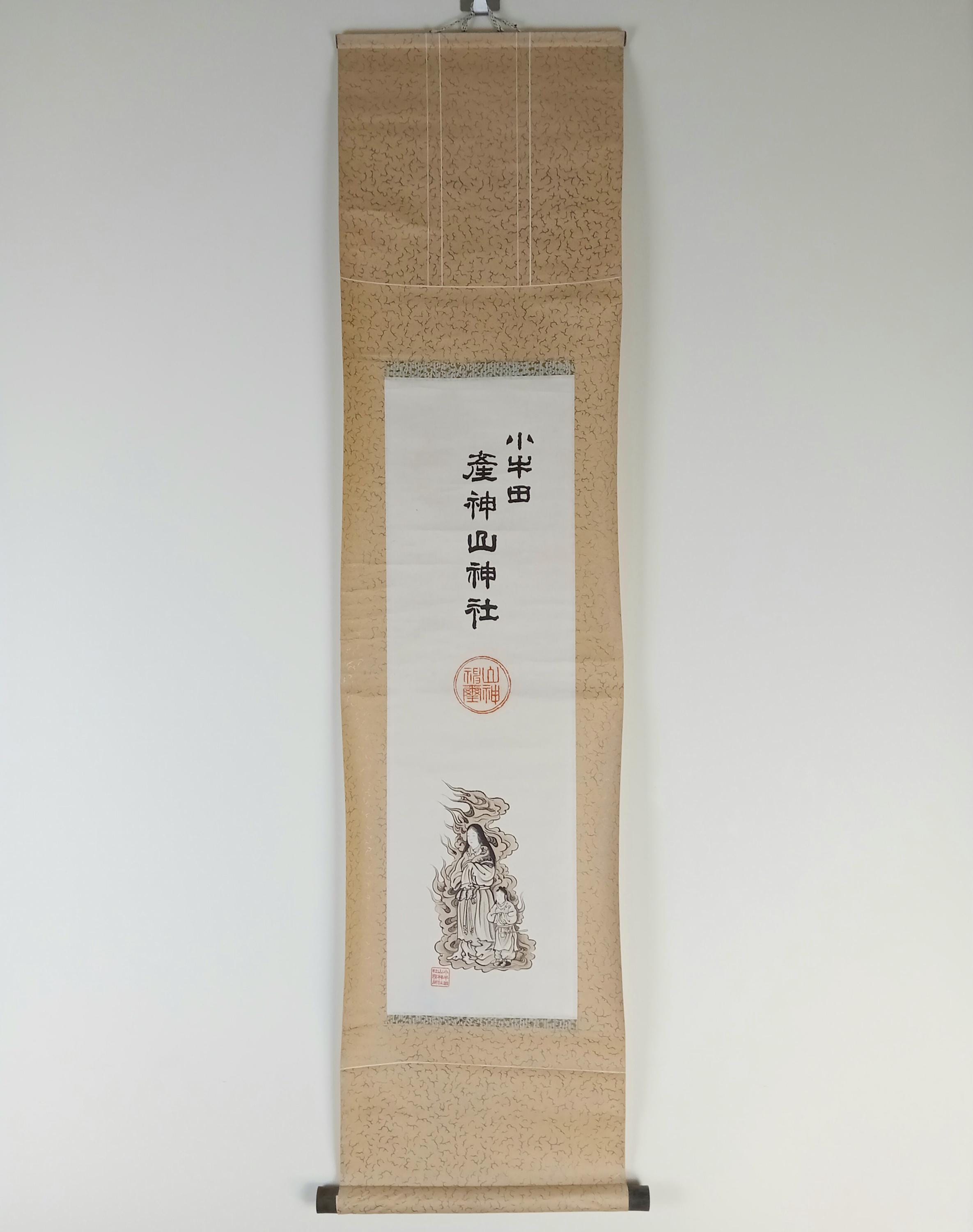 Japanese Shinto temple kakemono (kakejiku), Shōwa period. The scroll bears the name of a Shinto shrine and shows a sacred small-format devotional image.