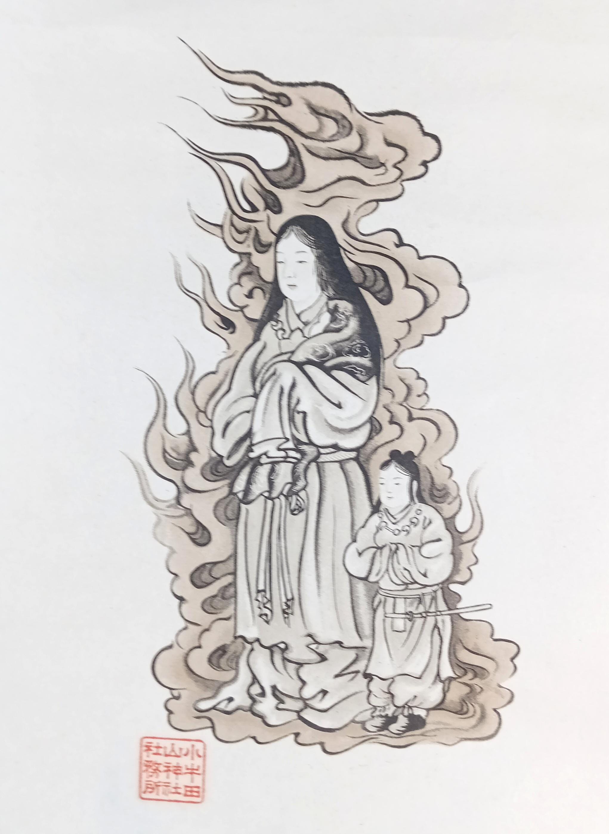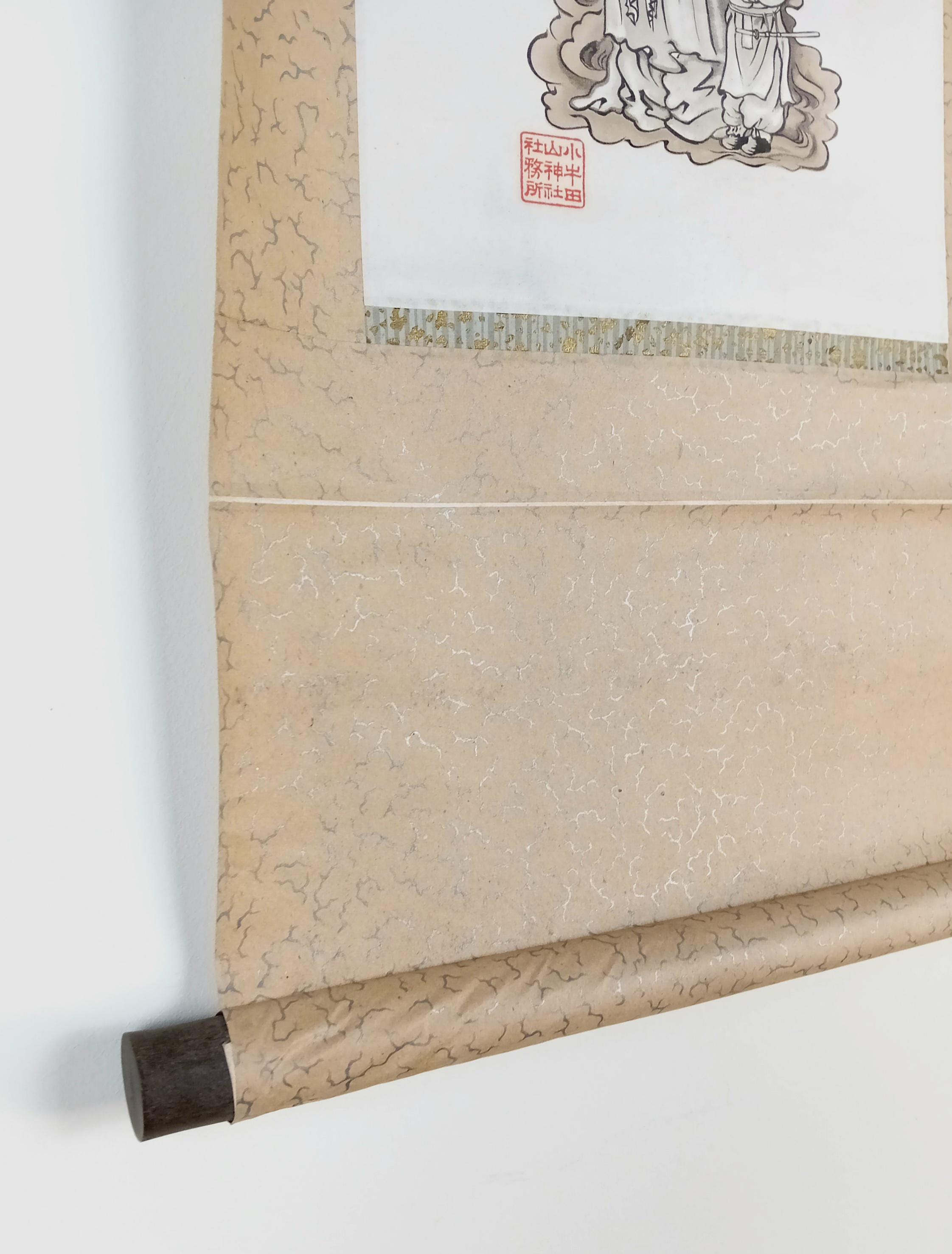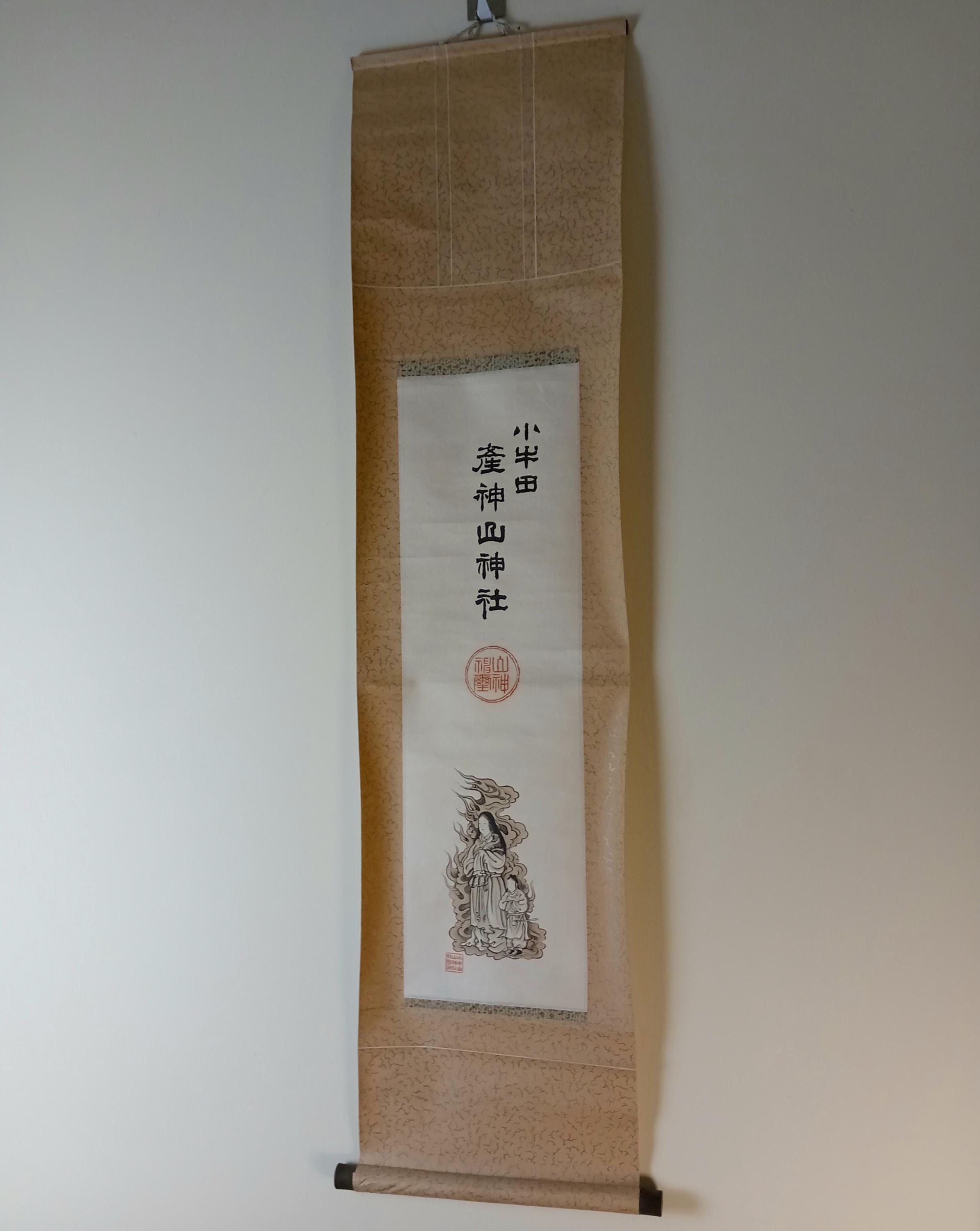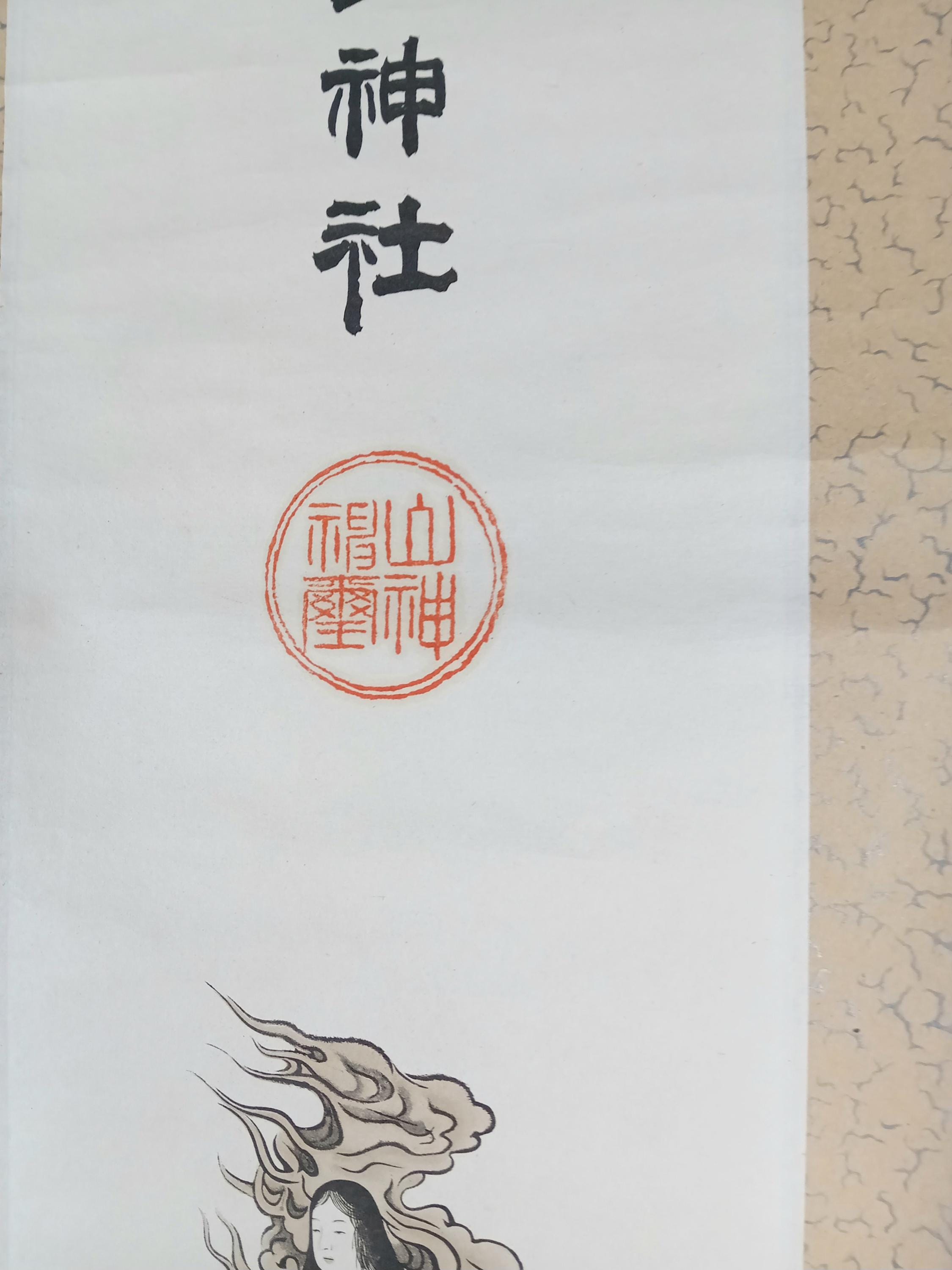 Japanese Shinto temple kakemono (kakejiku), Shōwa period. The scroll bears the name of a Shinto shrine and shows a sacred small-format devotional image.