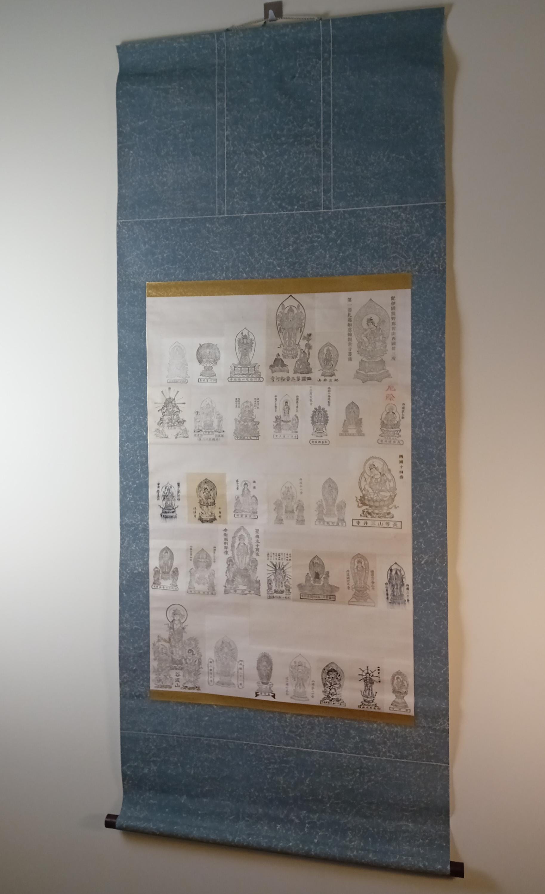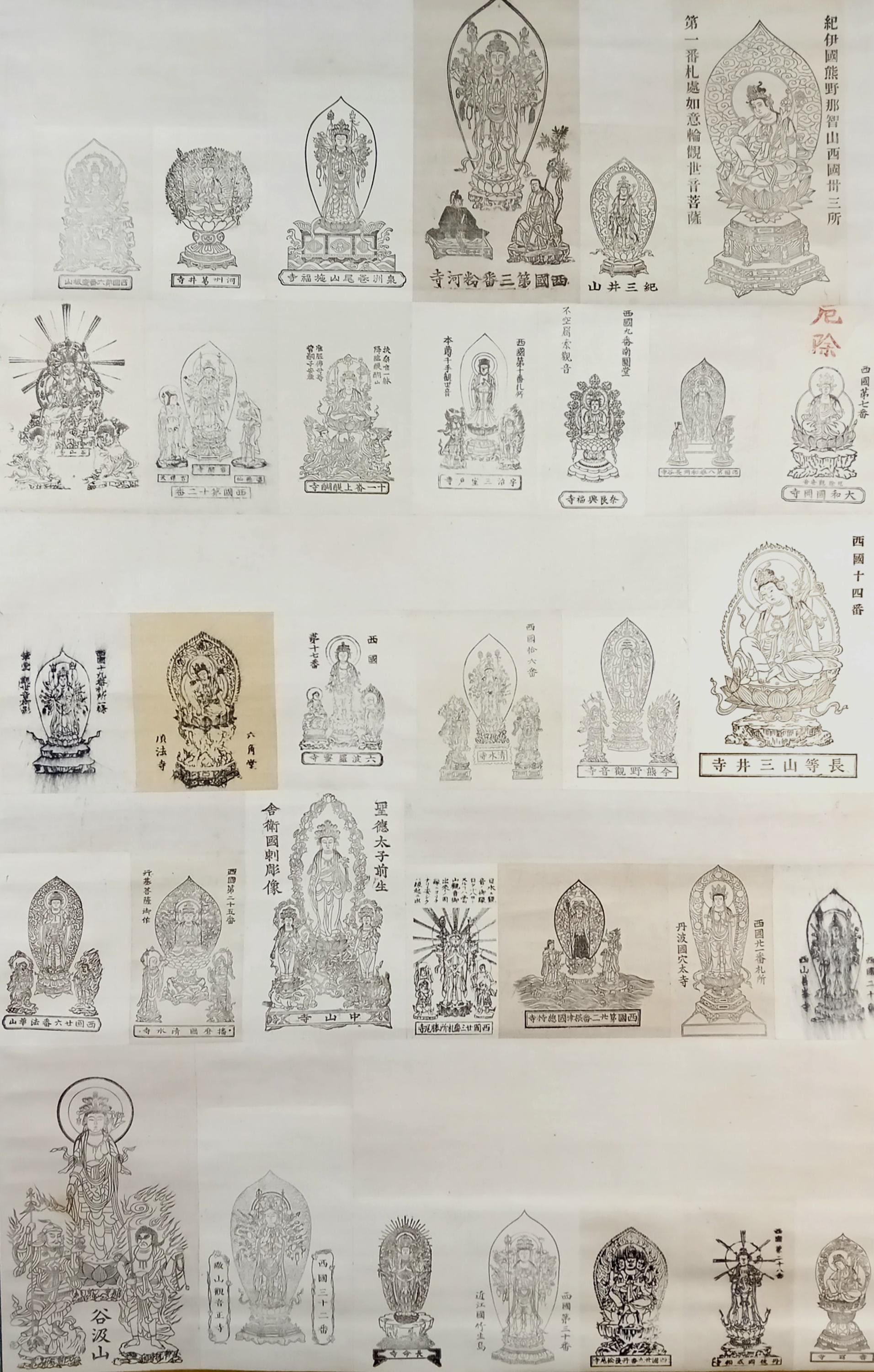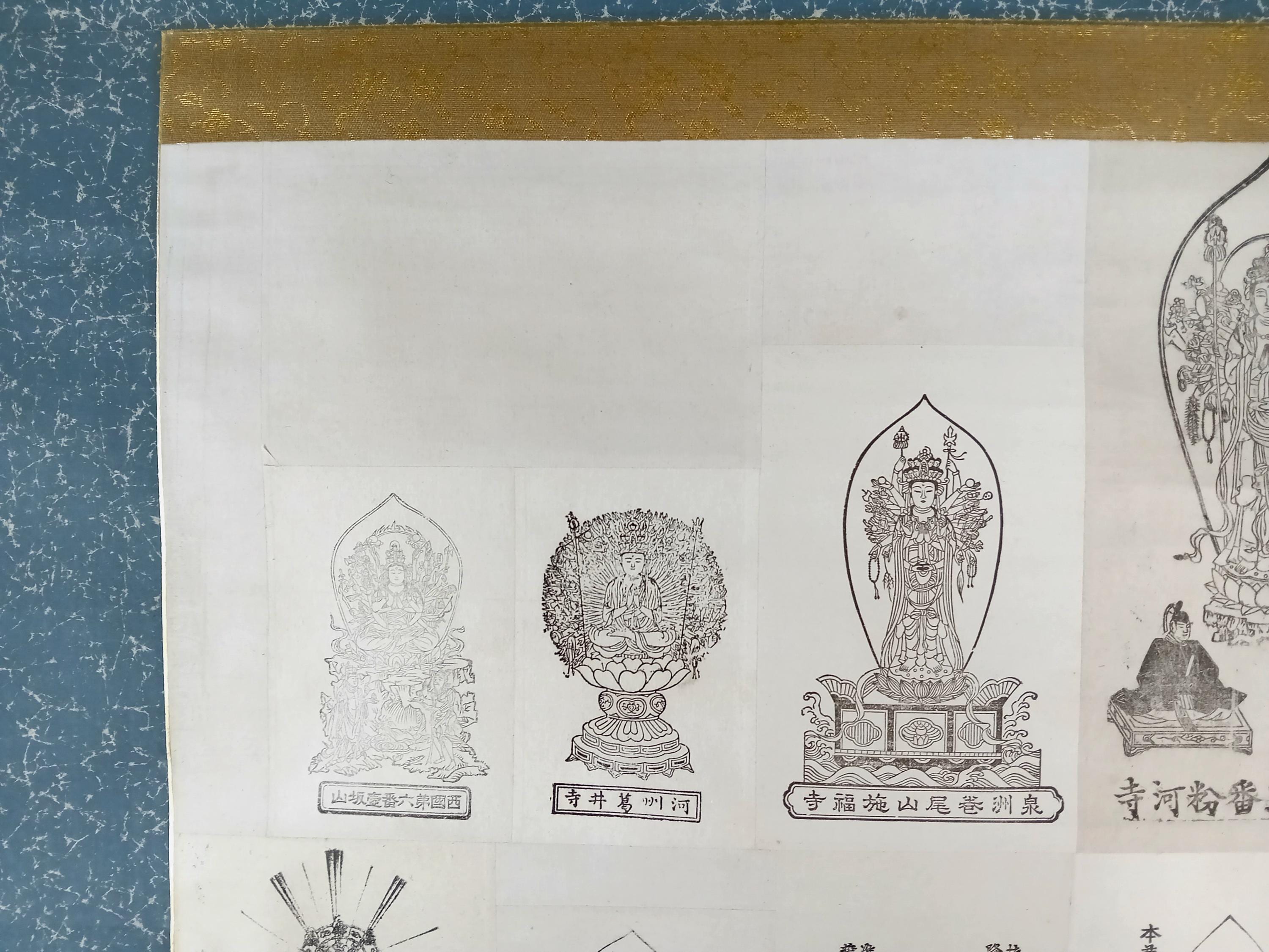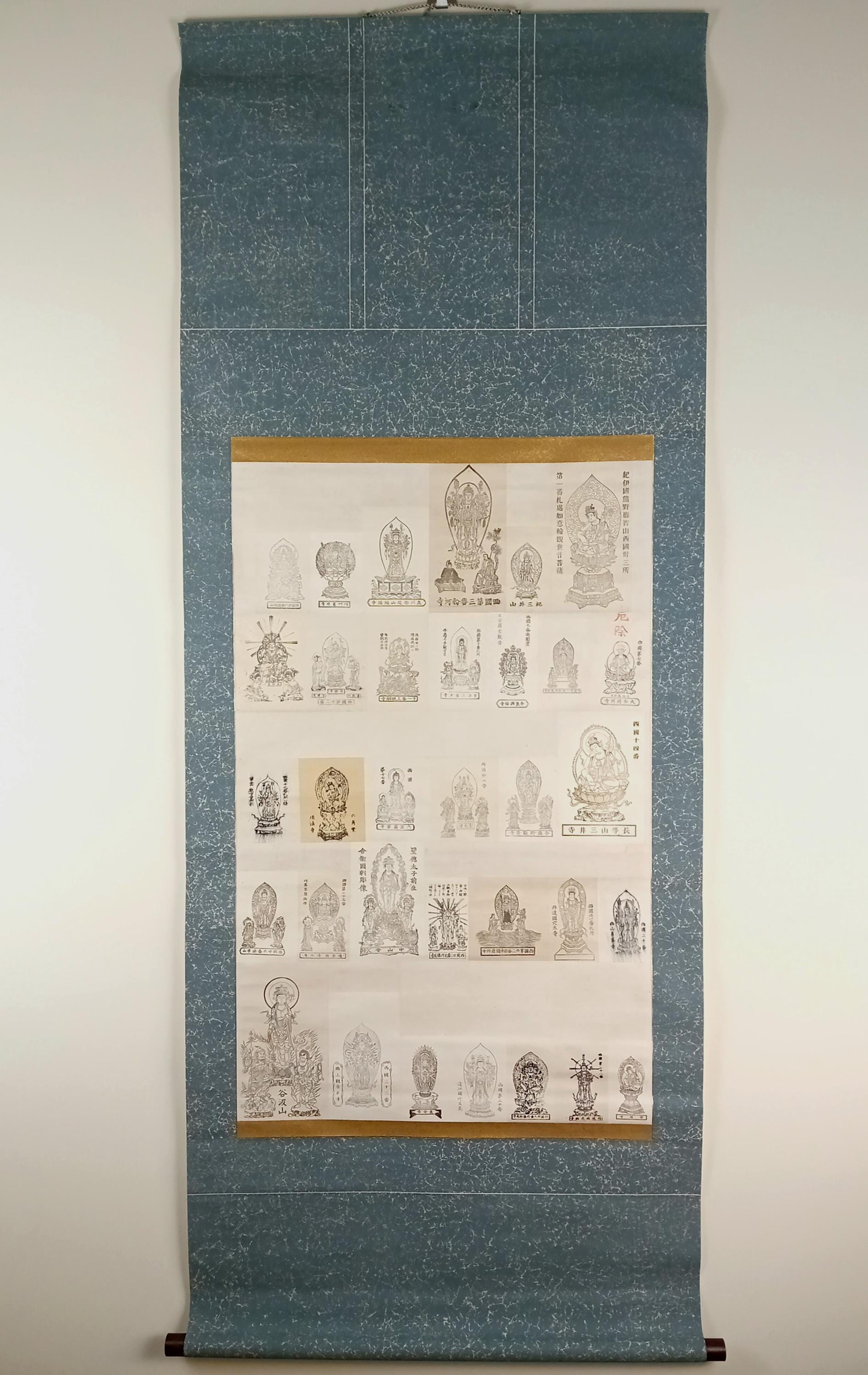 Vintage Japanese Buddhist temple kakemono (kakejiku) from the Shōwa period. The central printed sheet presents a compilation of Kannon images associated with the Saigoku 33 pilgrimage temples and is mounted as a large hanging scroll.