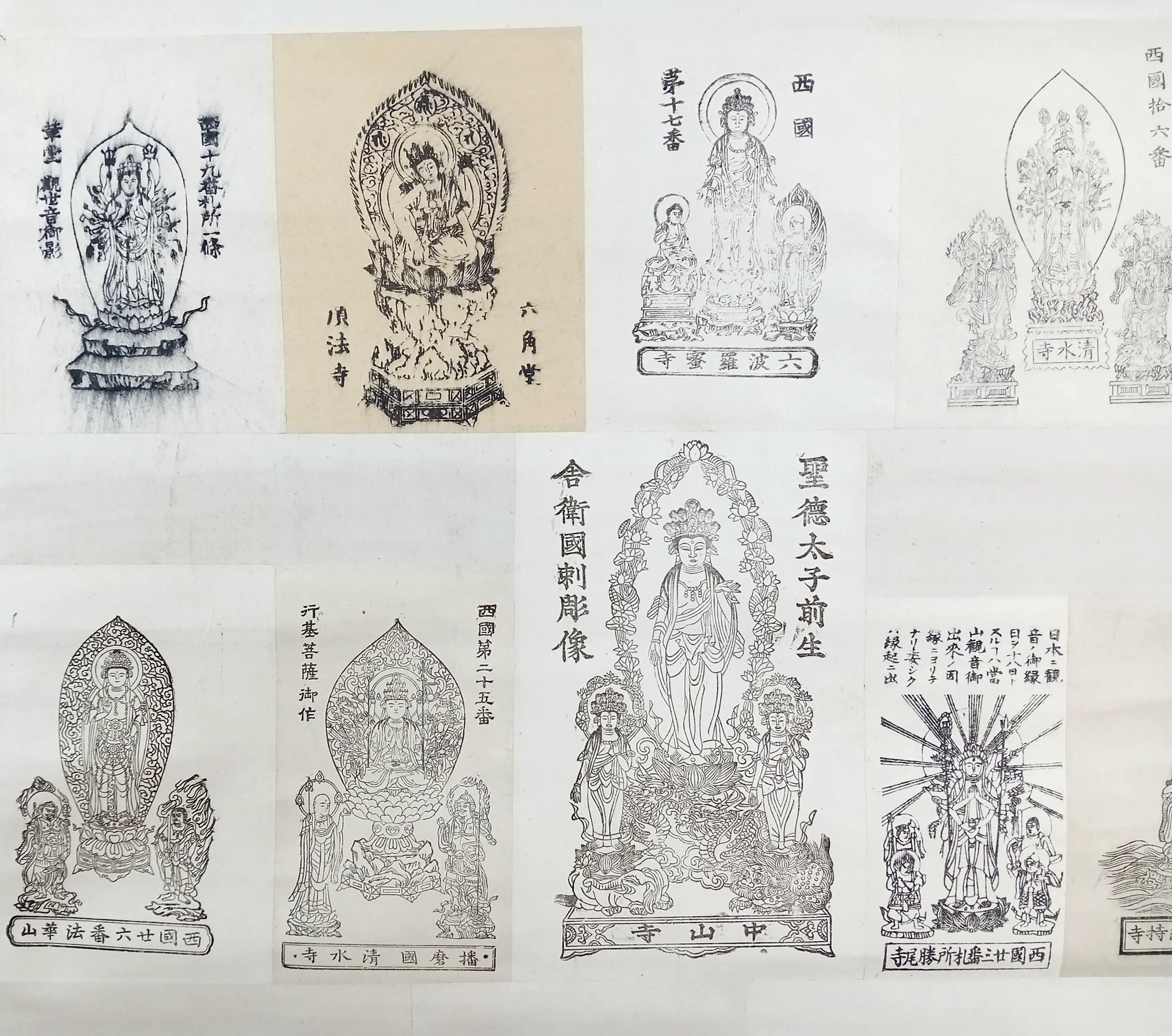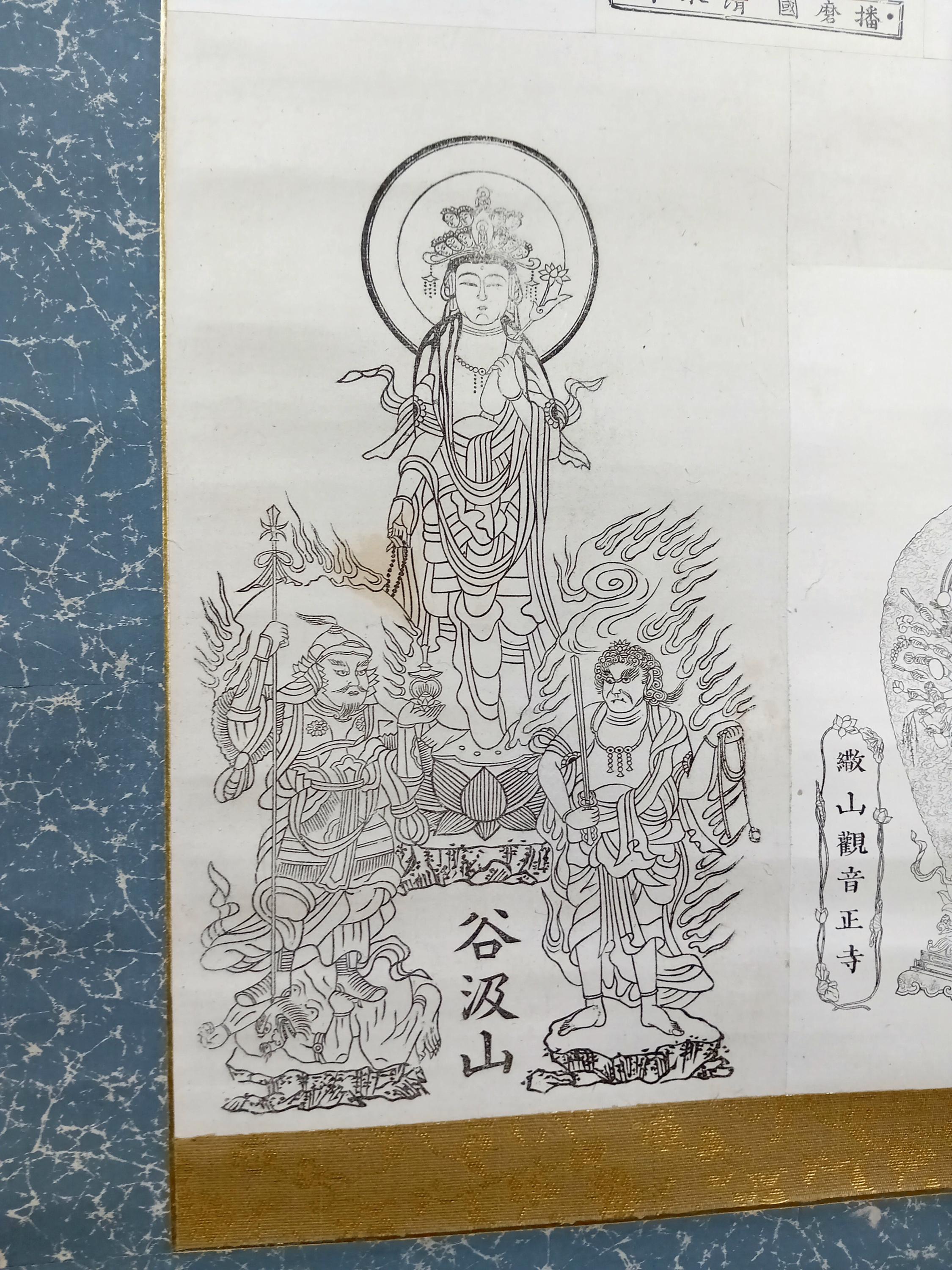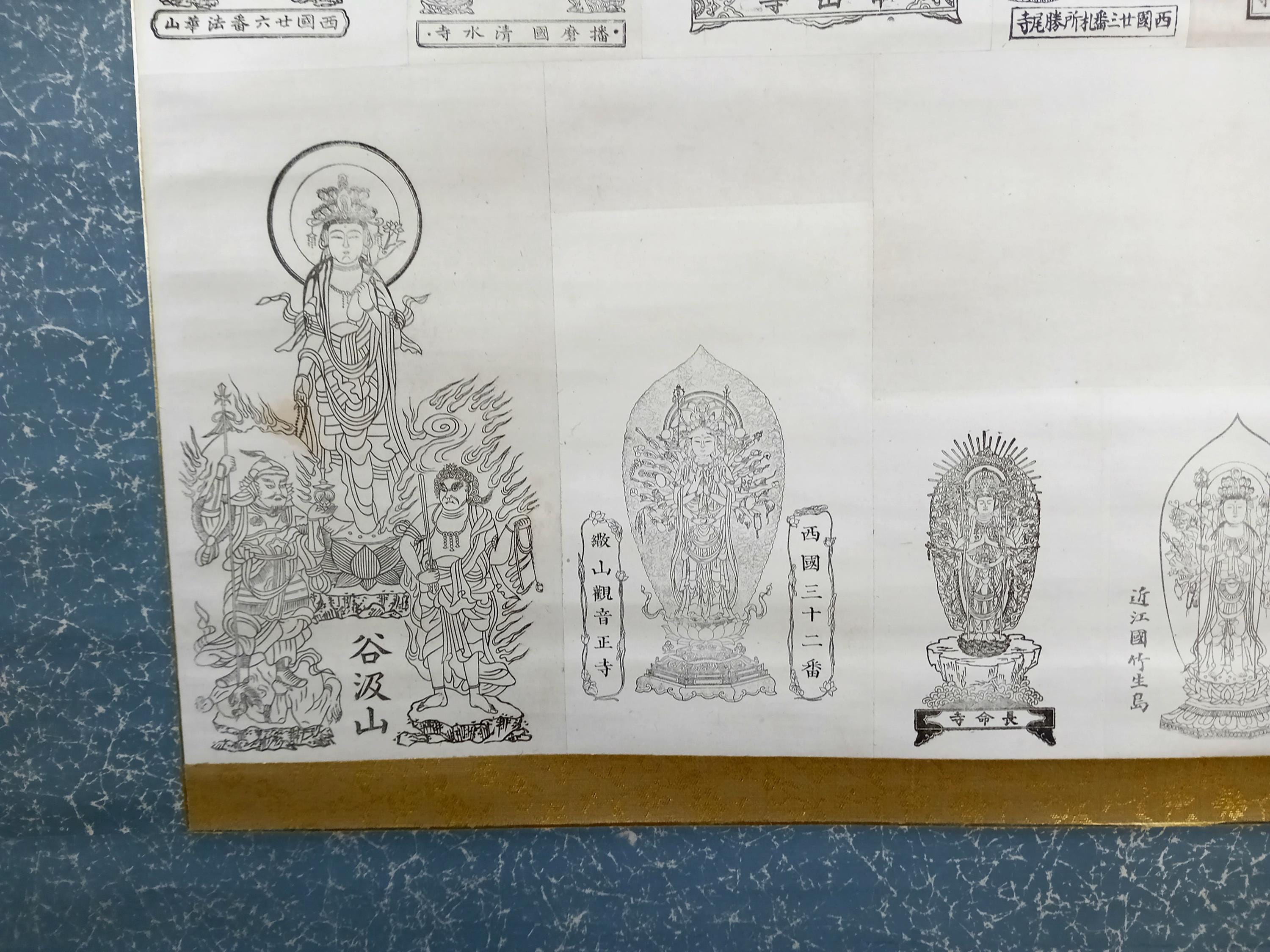 Vintage Japanese Buddhist temple kakemono (kakejiku) from the Shōwa period. The central printed sheet presents a compilation of Kannon images associated with the Saigoku 33 pilgrimage temples and is mounted as a large hanging scroll.