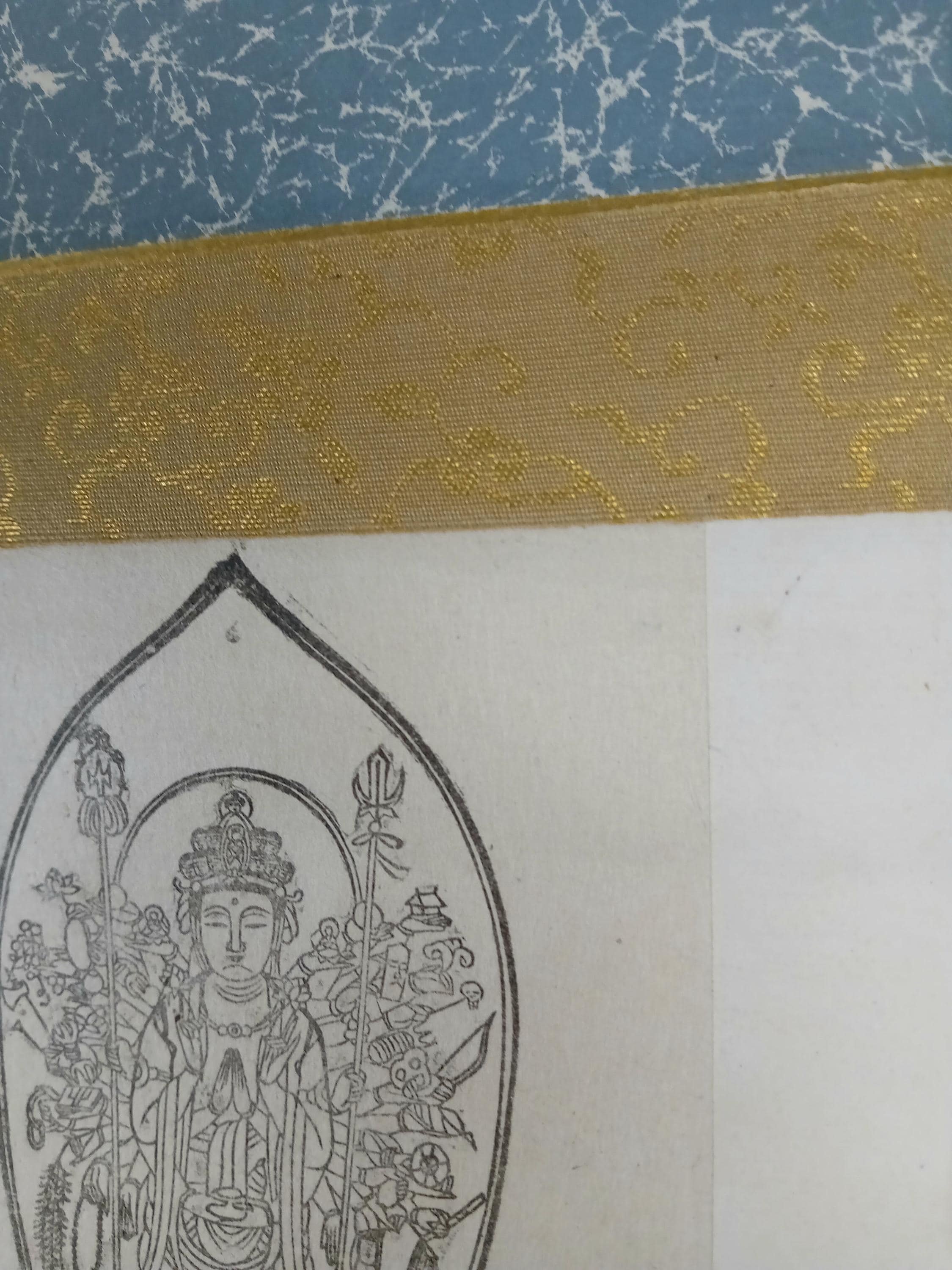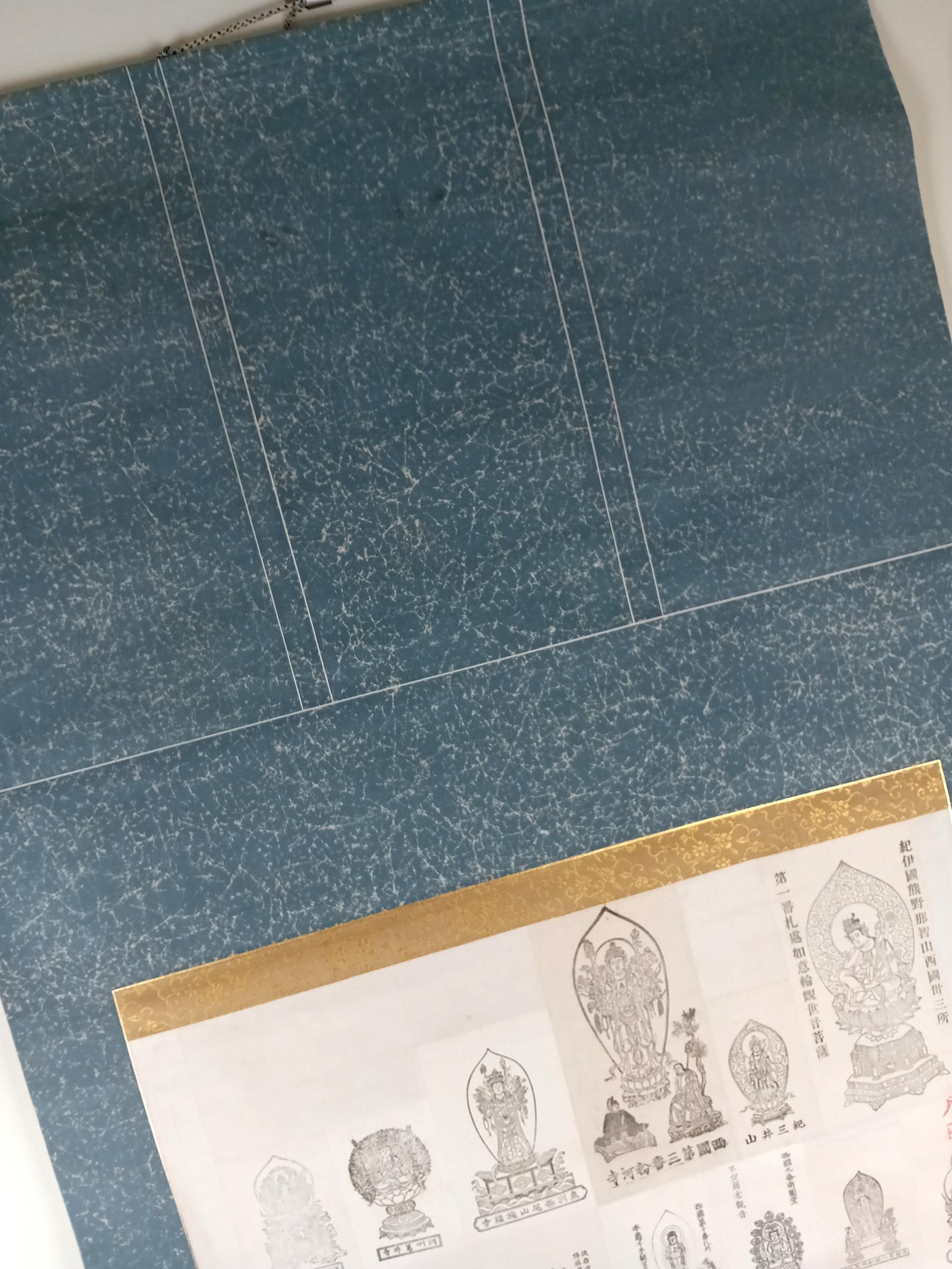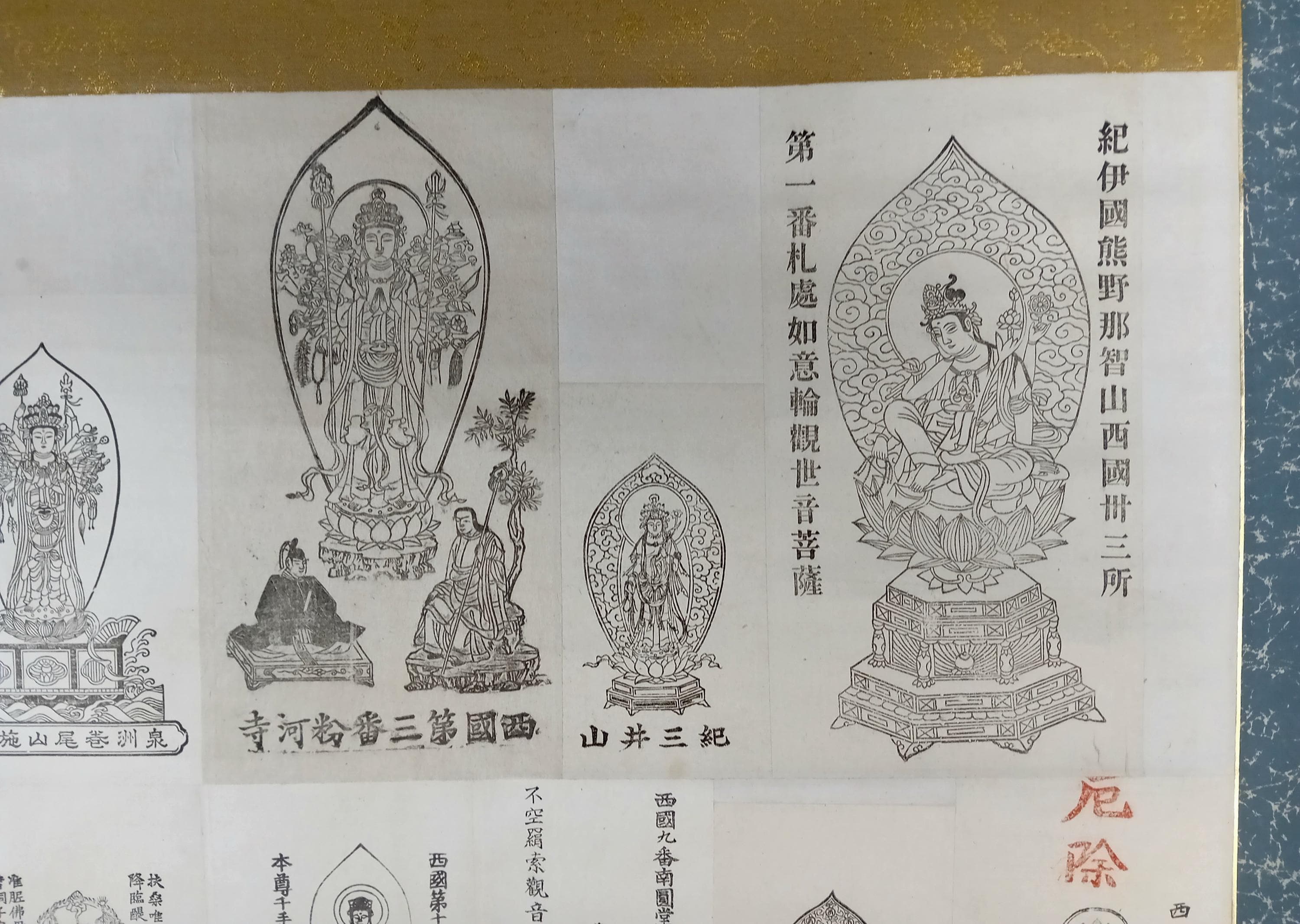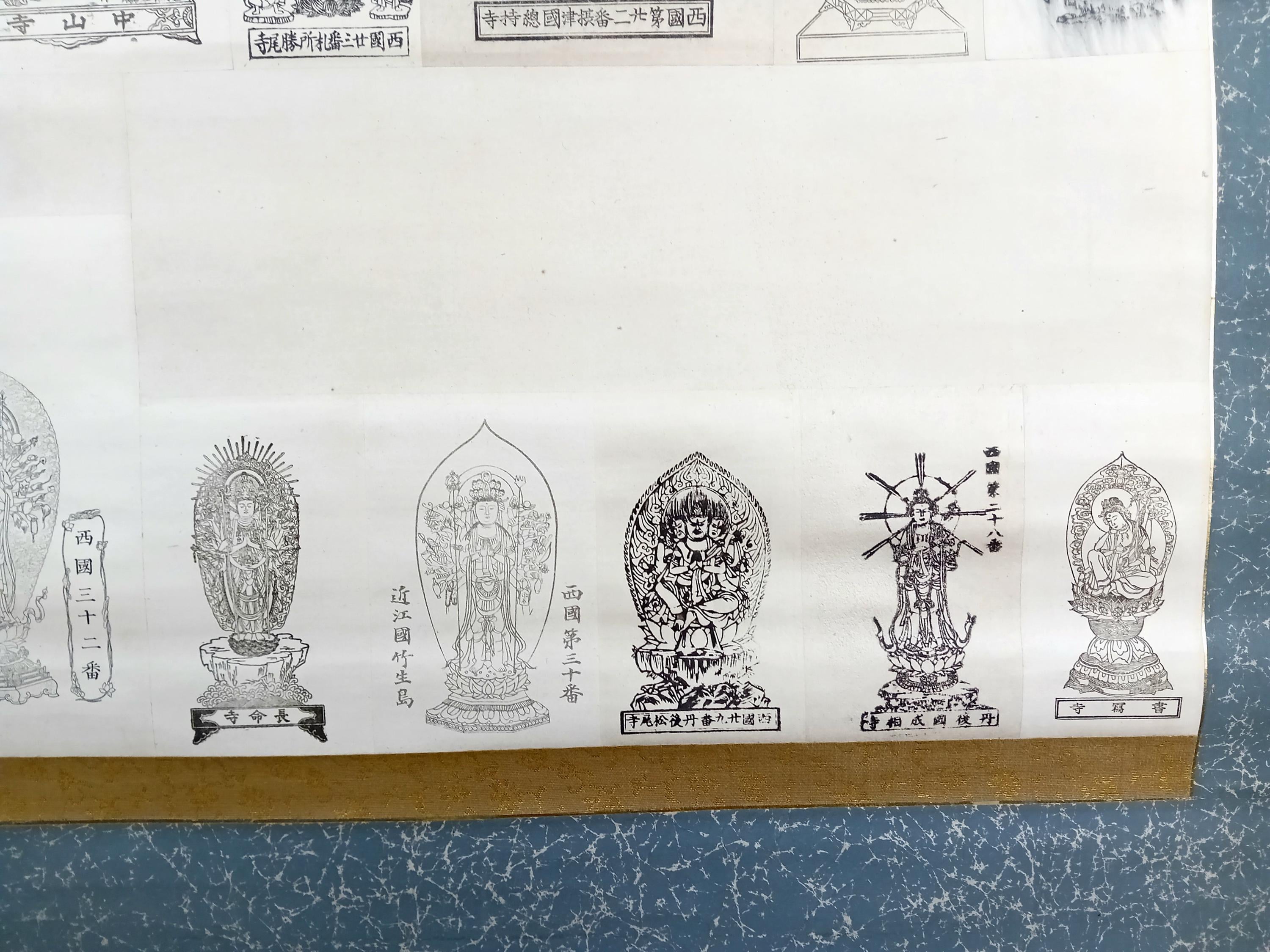 Vintage Japanese Buddhist temple kakemono (kakejiku) from the Shōwa period. The central printed sheet presents a compilation of Kannon images associated with the Saigoku 33 pilgrimage temples and is mounted as a large hanging scroll.